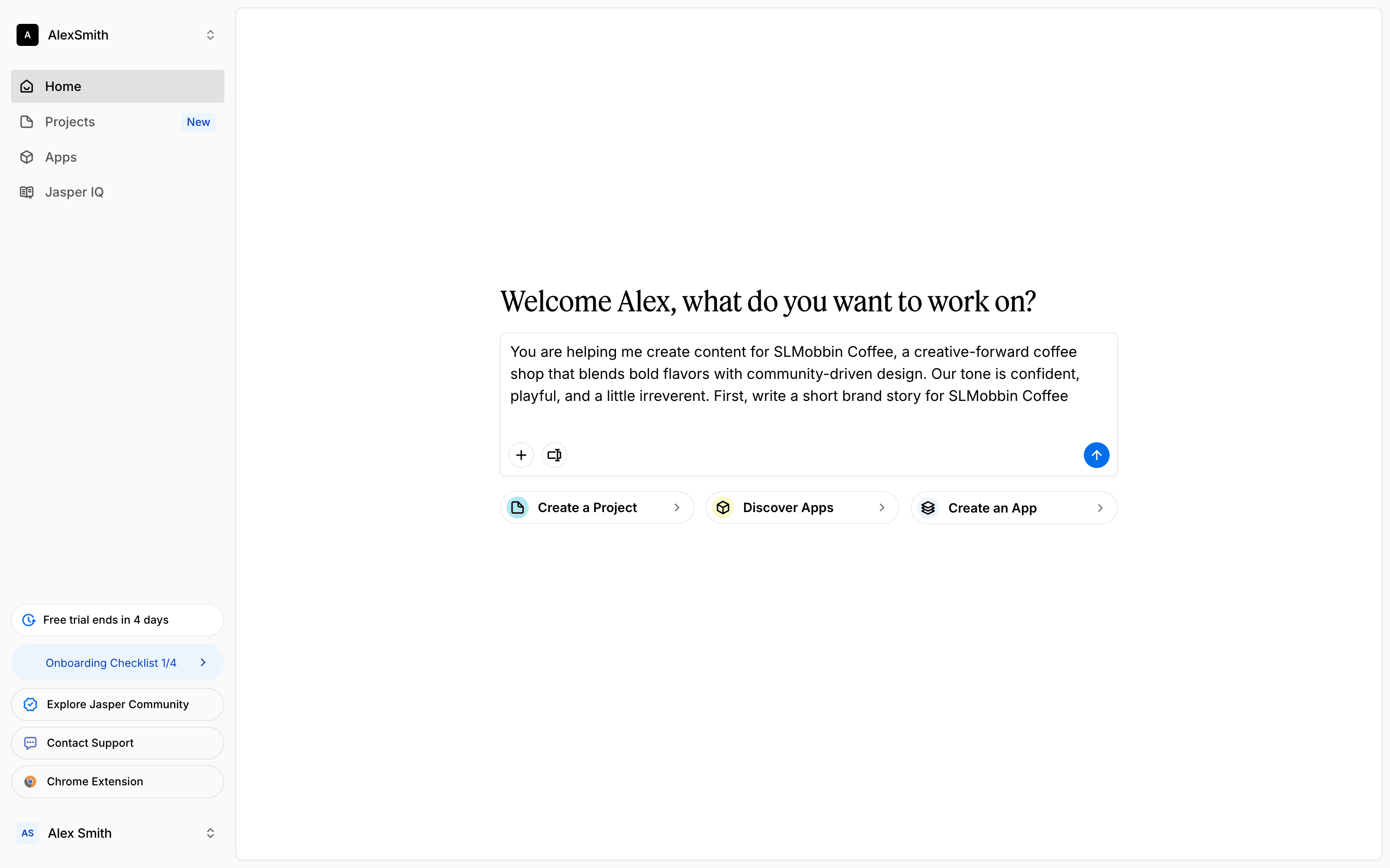 The user describes a project, then interacts with a bot to generate a draft and receive suggestions. The flow showcases project creation with AI assistance.
