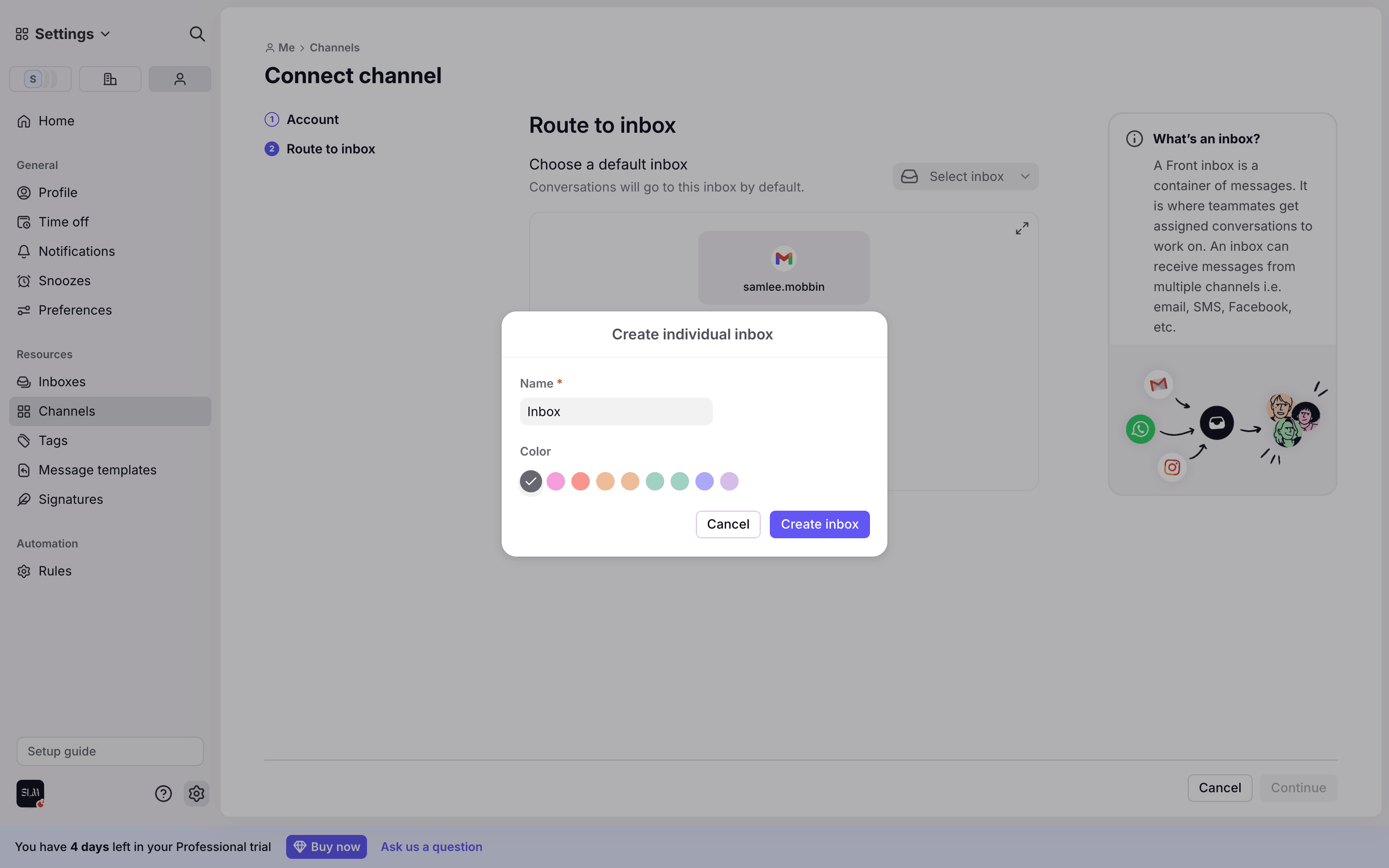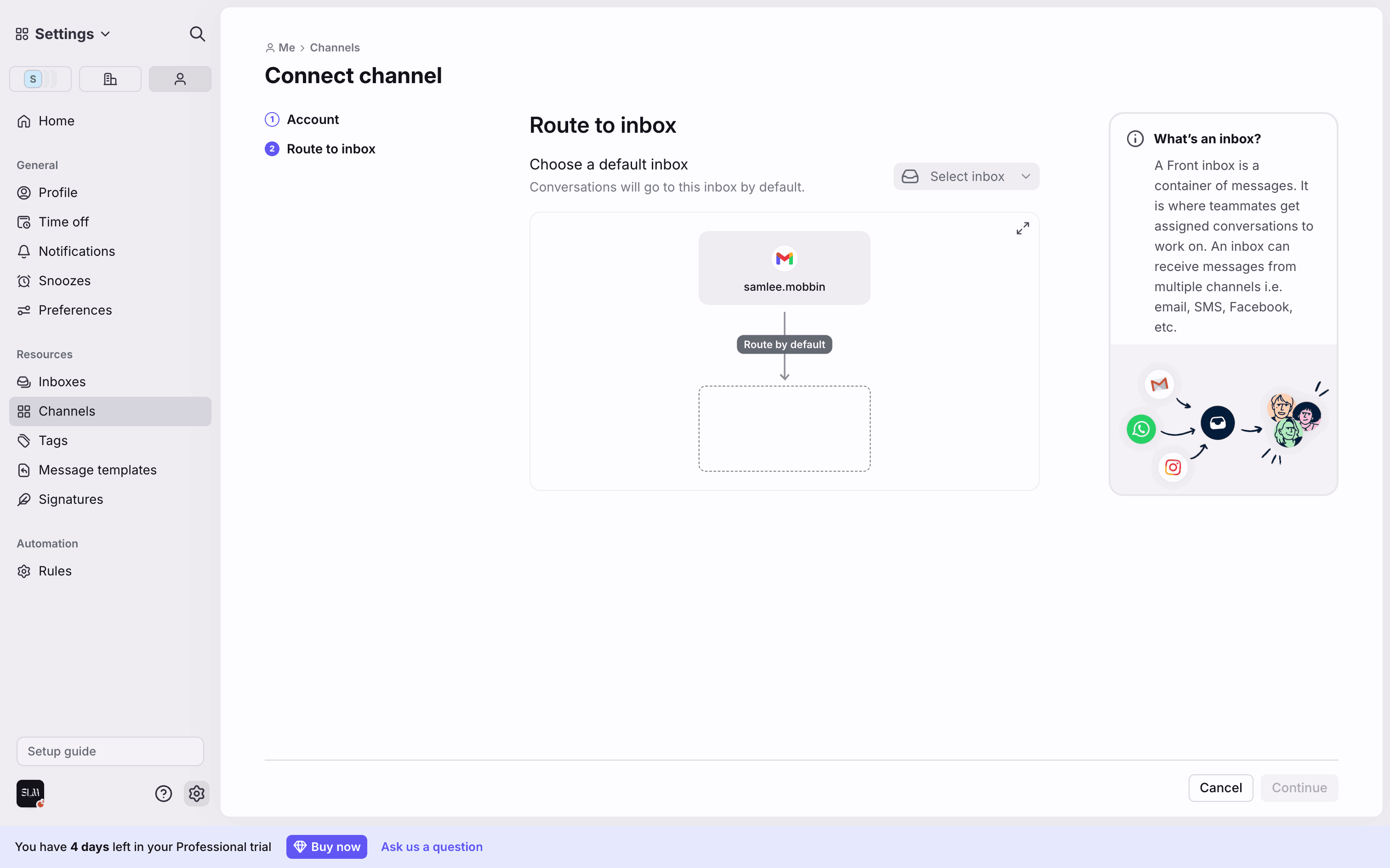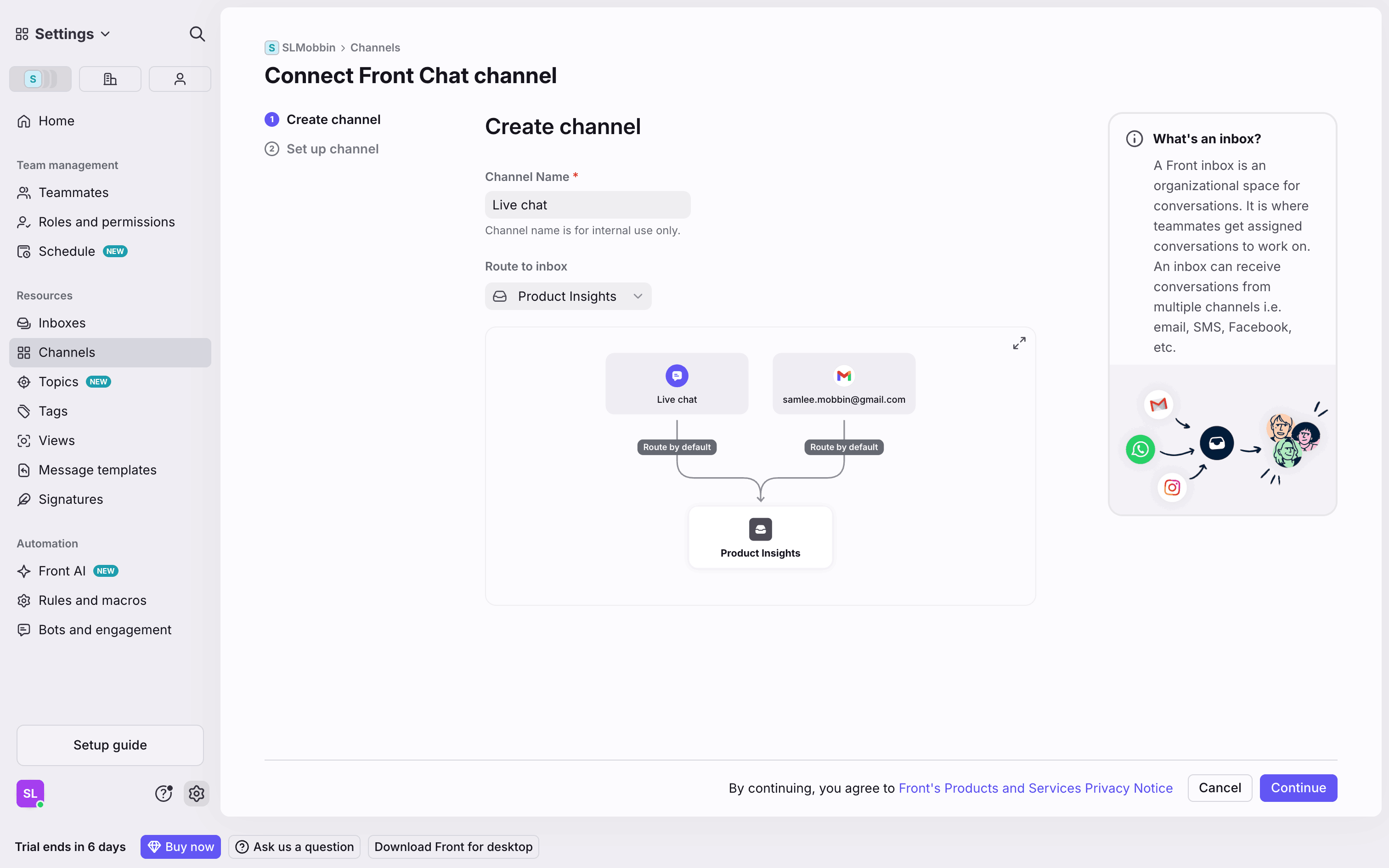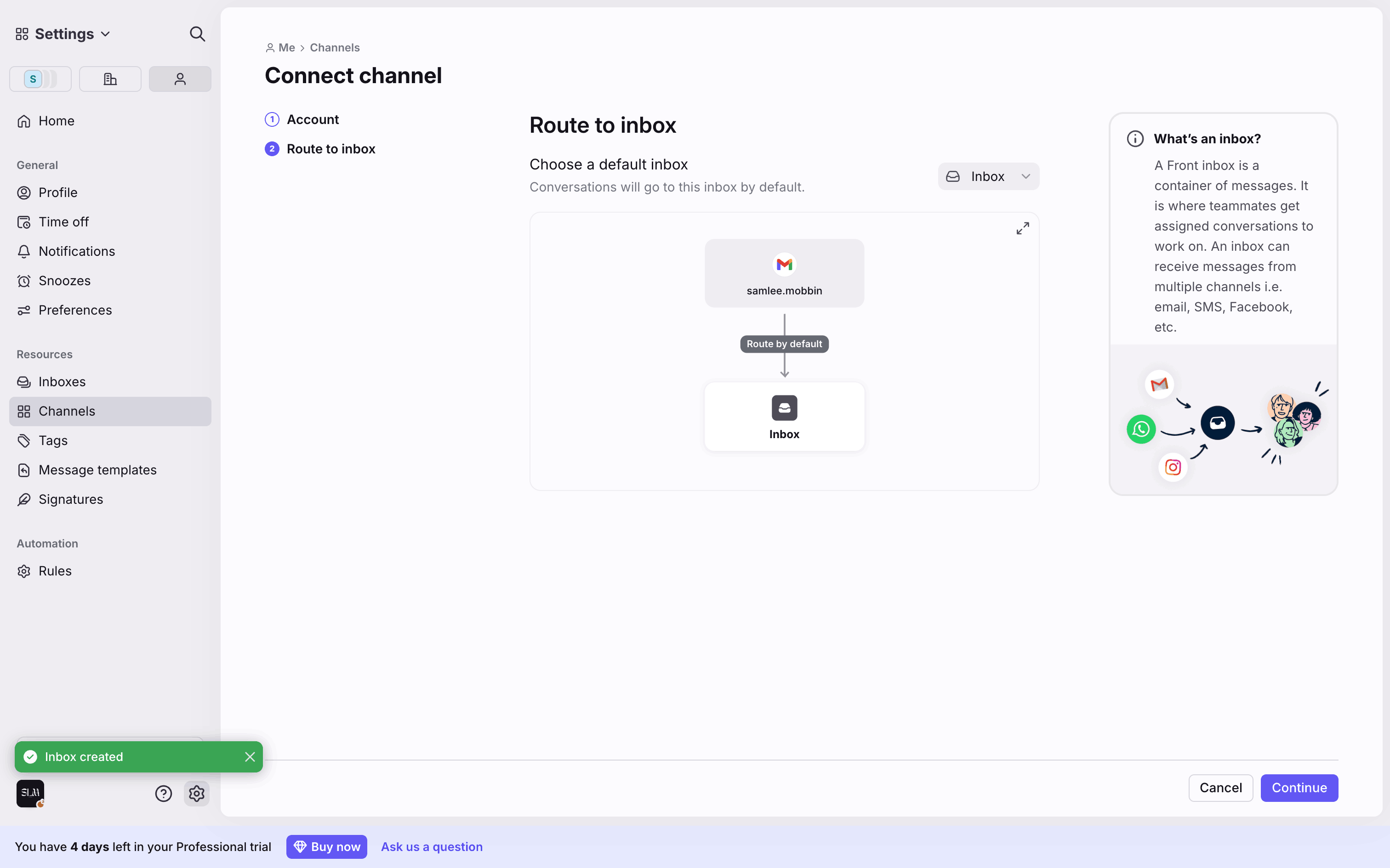 The user connects a new Gmail channel by granting permissions, configuring import settings, and routing it to a newly created inbox.