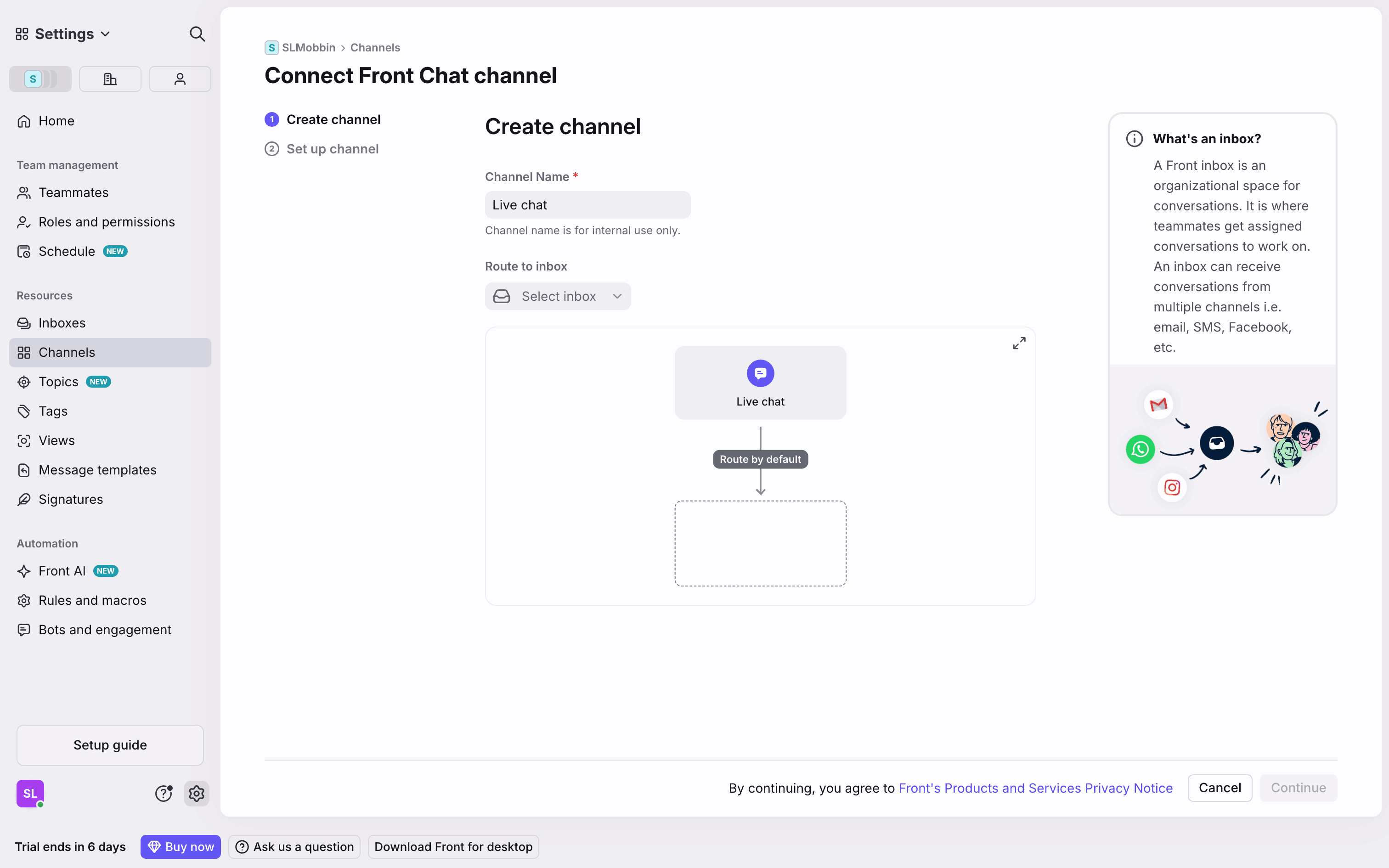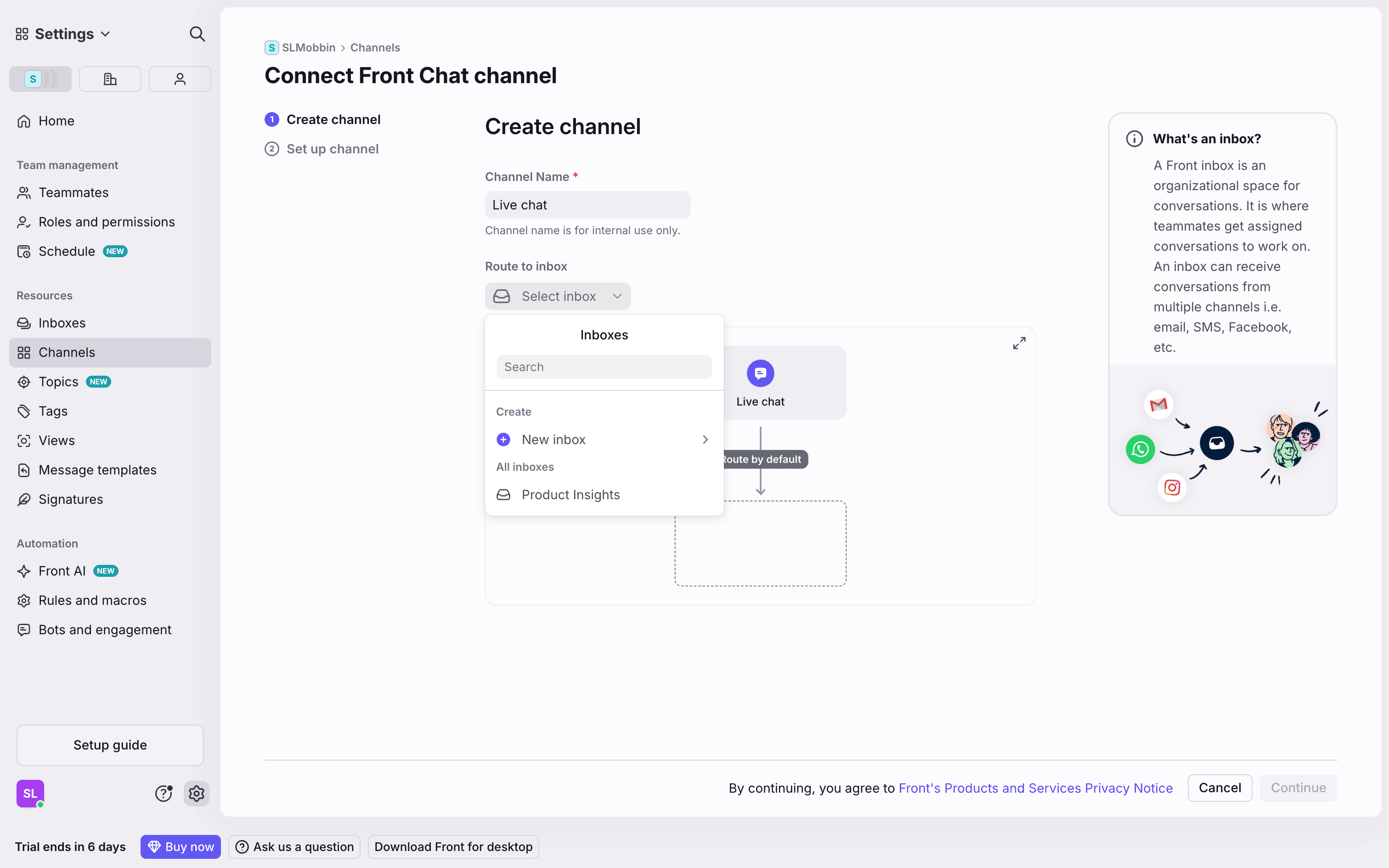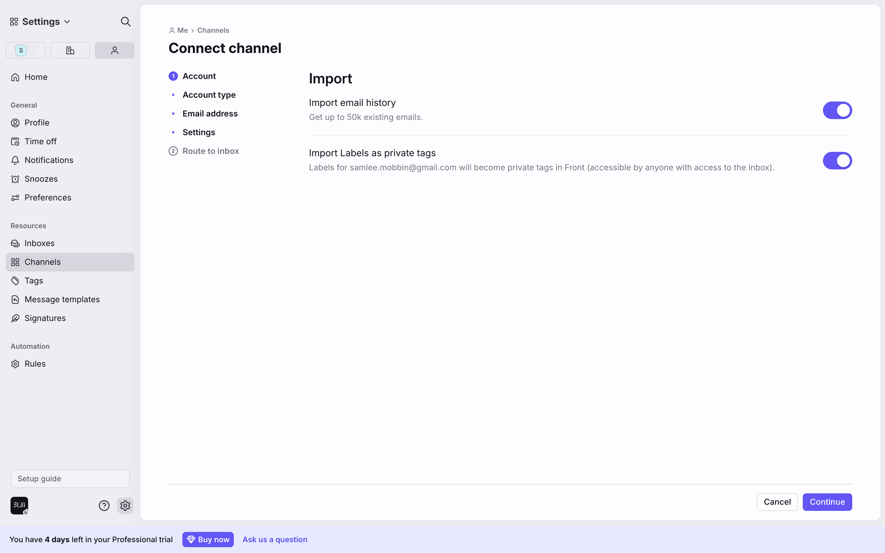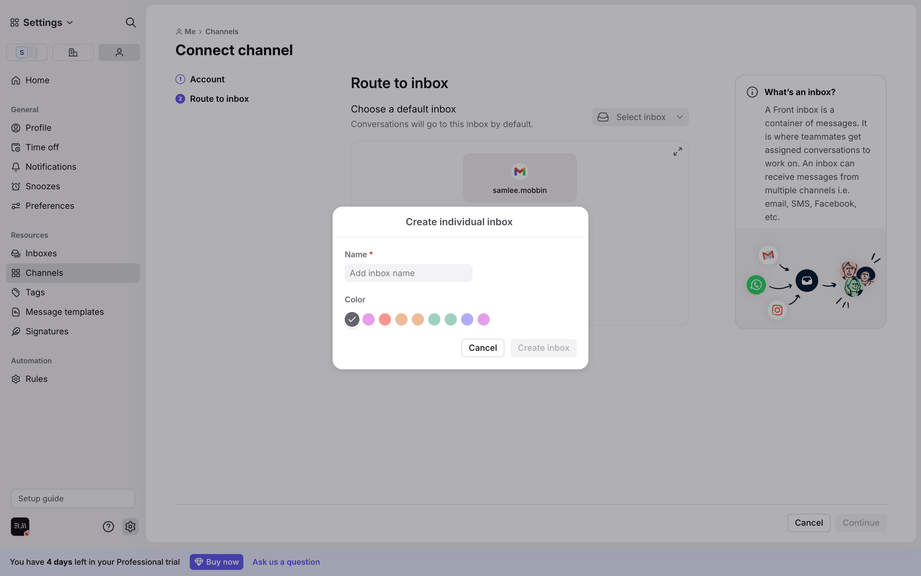 The user connects a new Gmail channel by granting permissions, configuring import settings, and routing it to a newly created inbox.