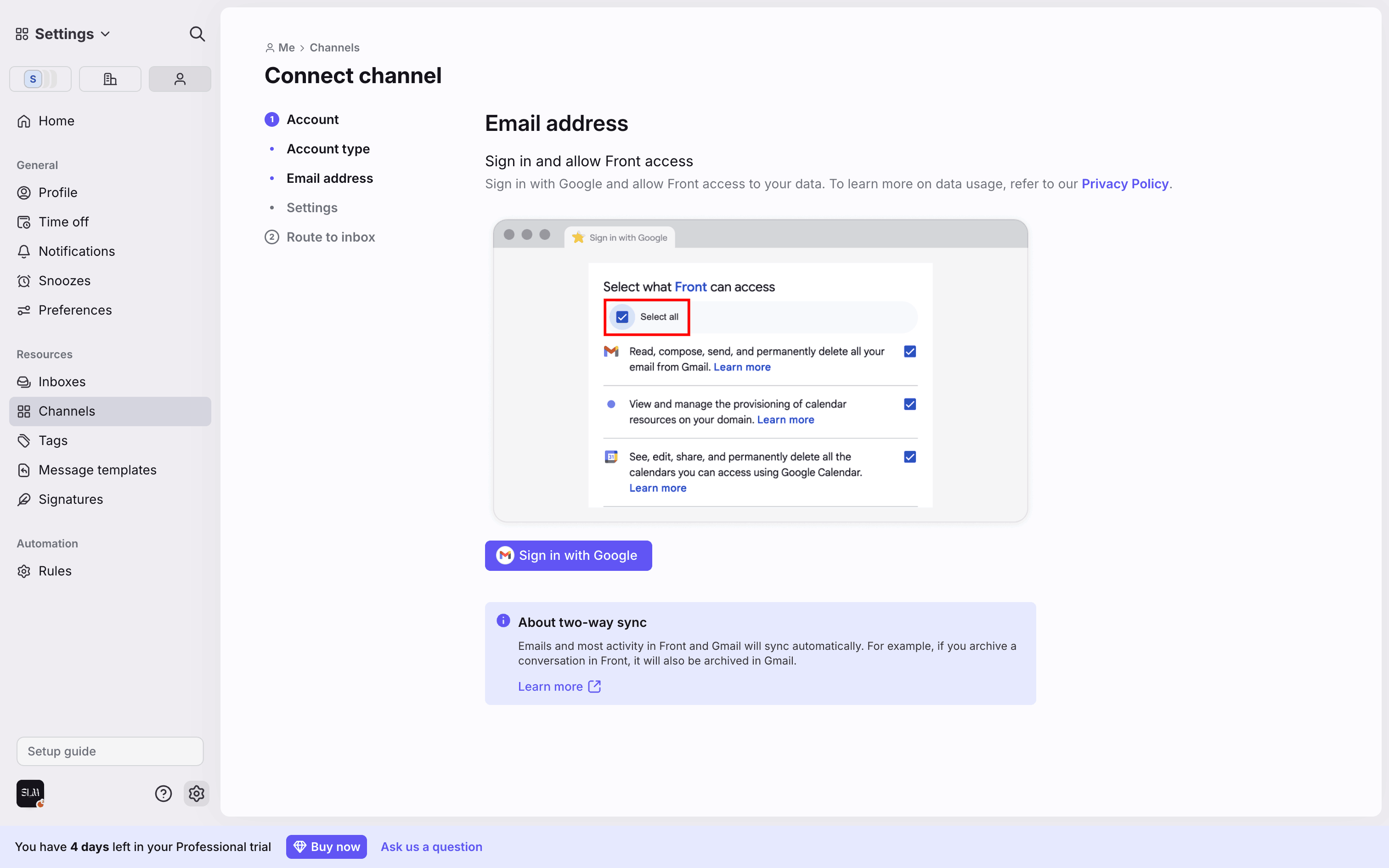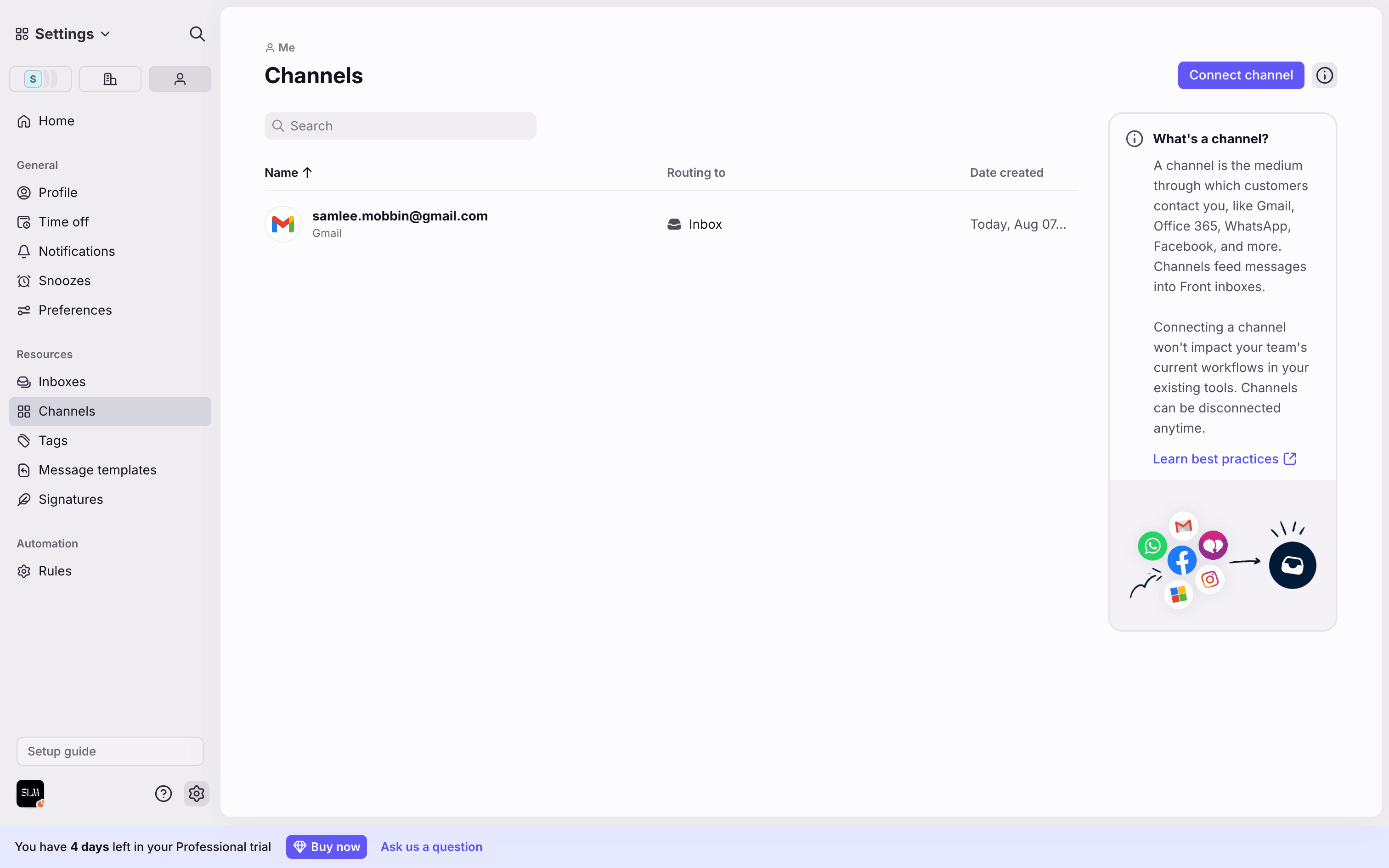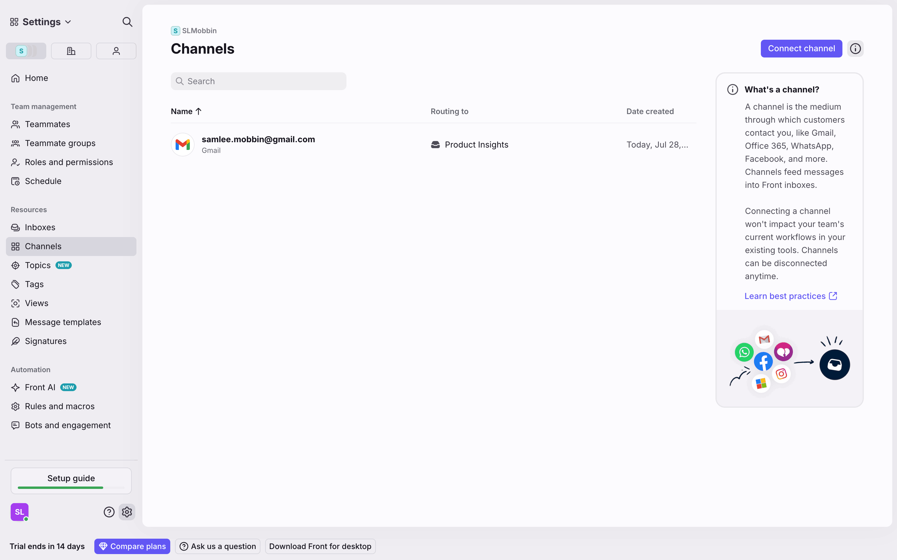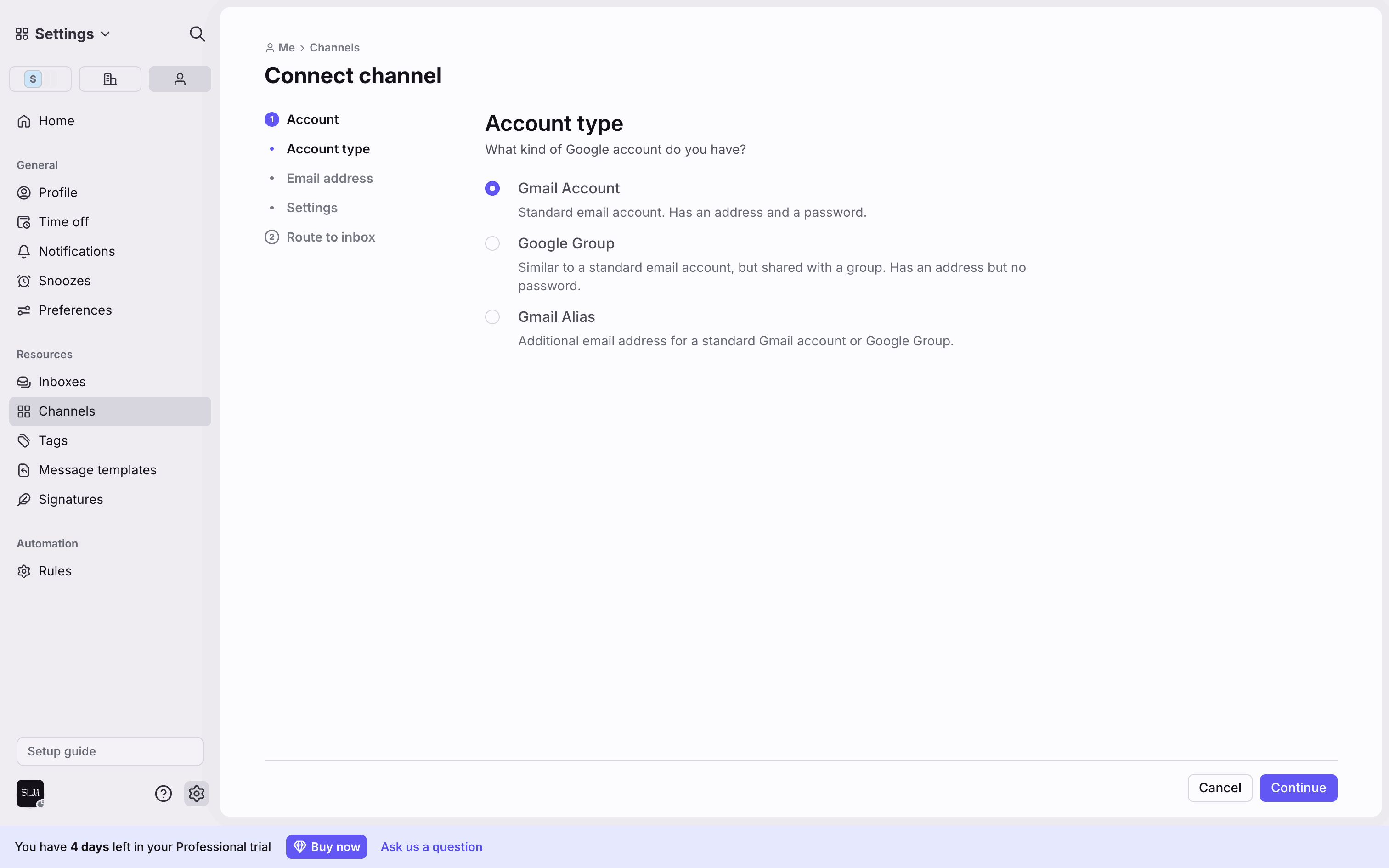 The user connects a new Gmail channel by granting permissions, configuring import settings, and routing it to a newly created inbox.