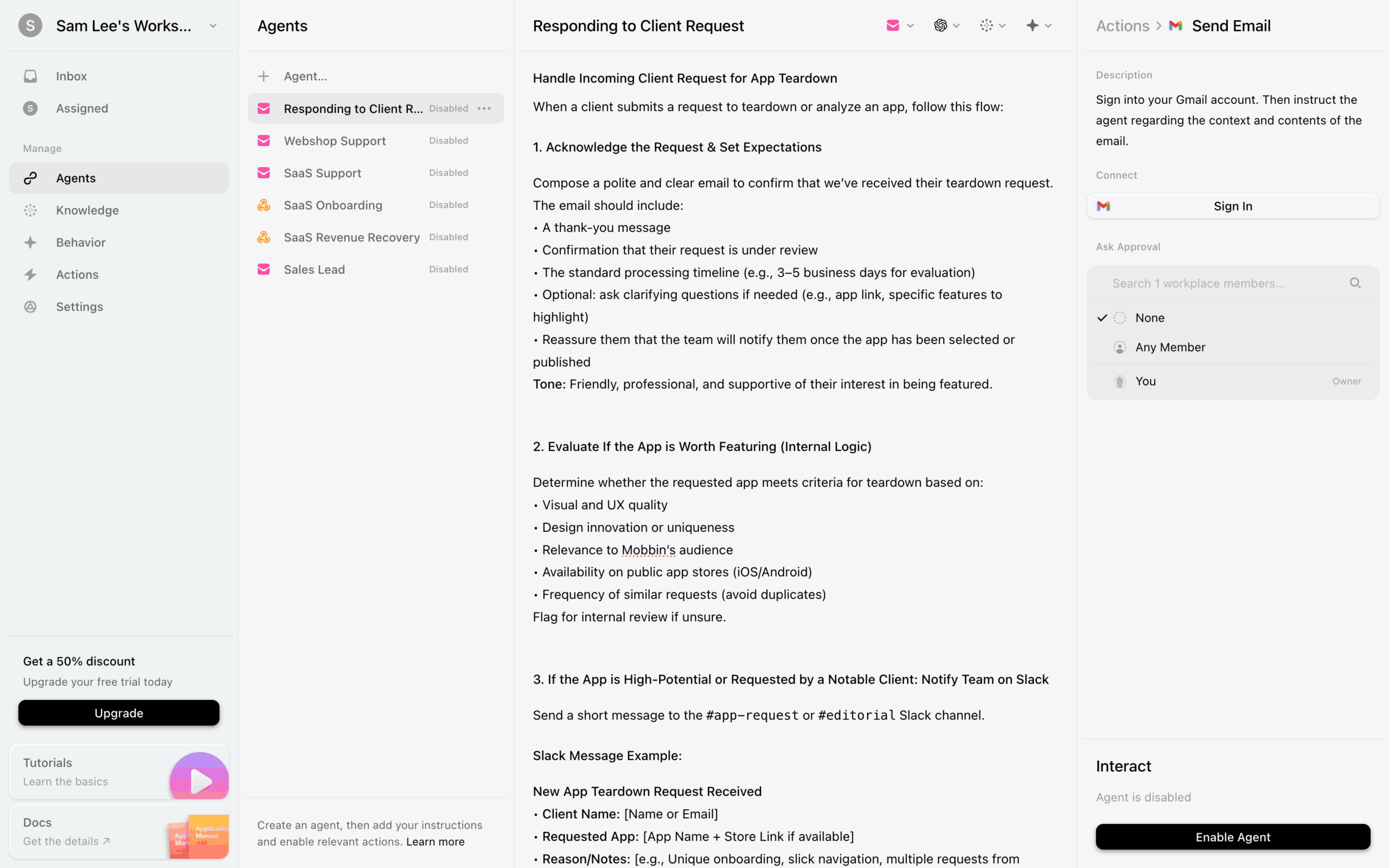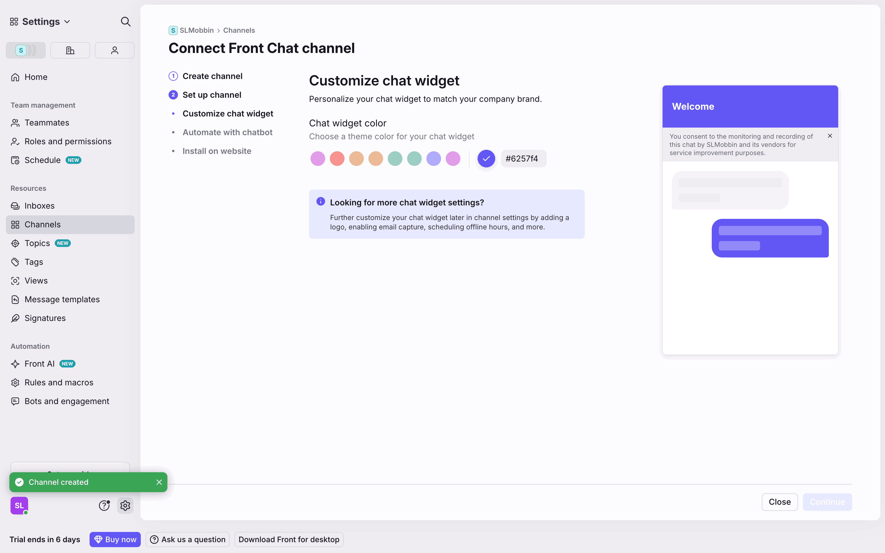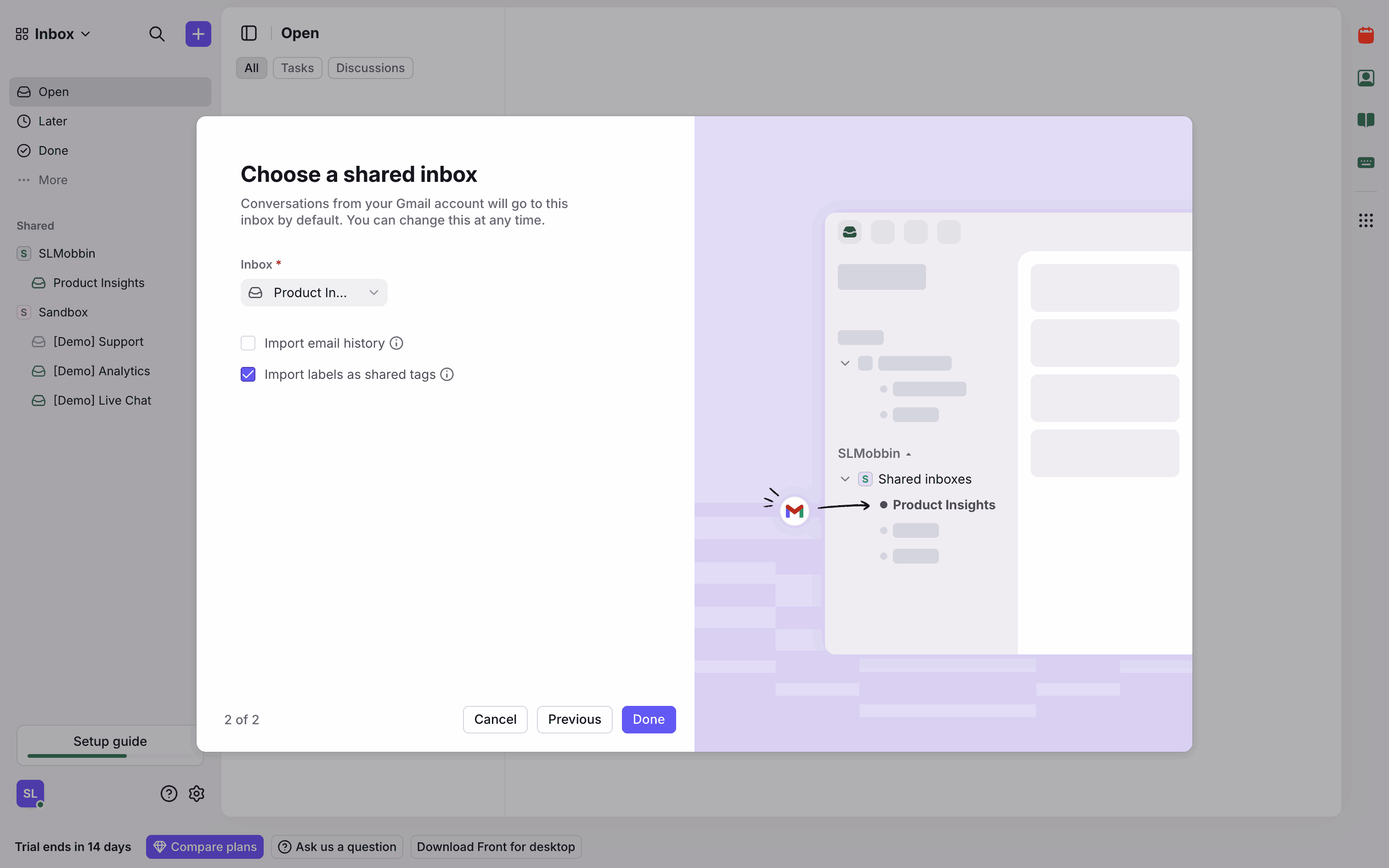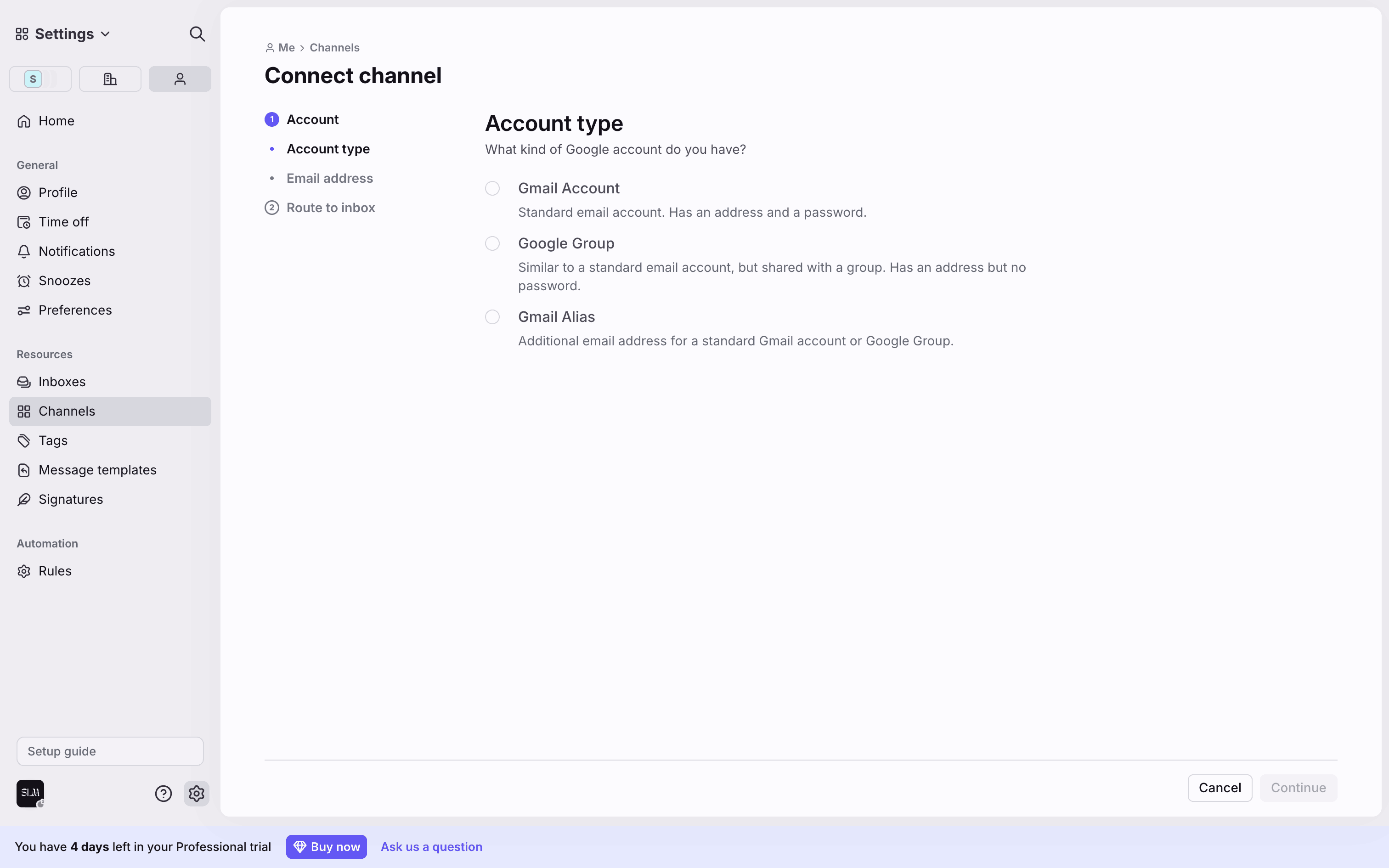 The user connects a new Gmail channel by granting permissions, configuring import settings, and routing it to a newly created inbox.