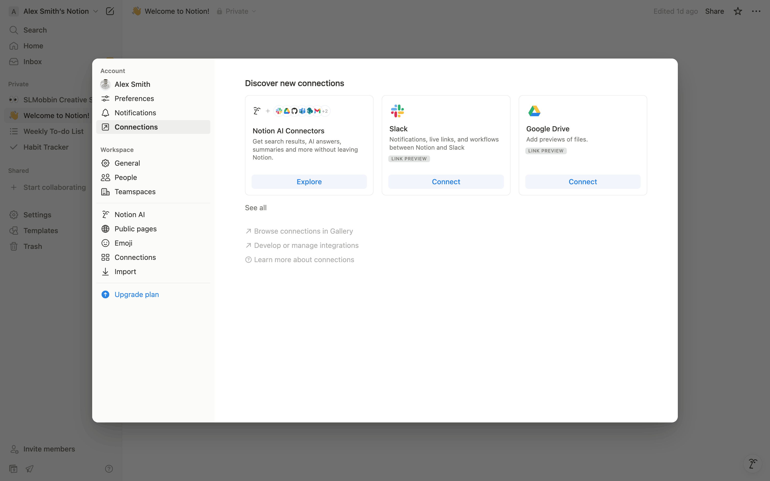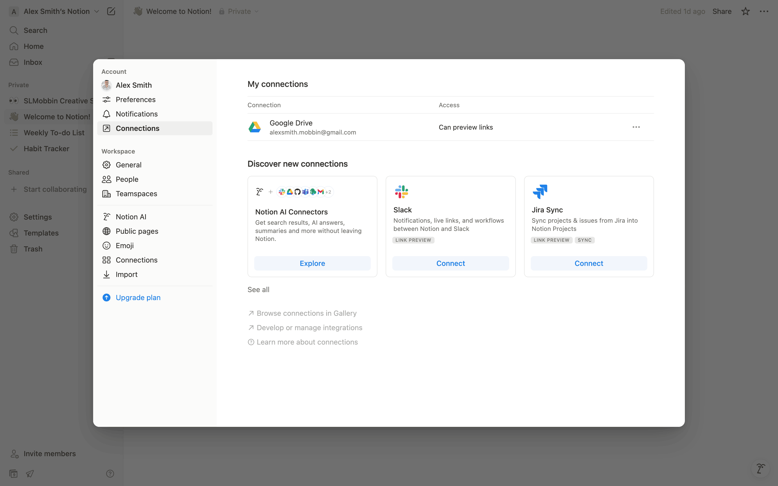 The user flow demonstrates connecting a Notion account to Google Drive. The connection is established and then displayed in the "My connections" modal.