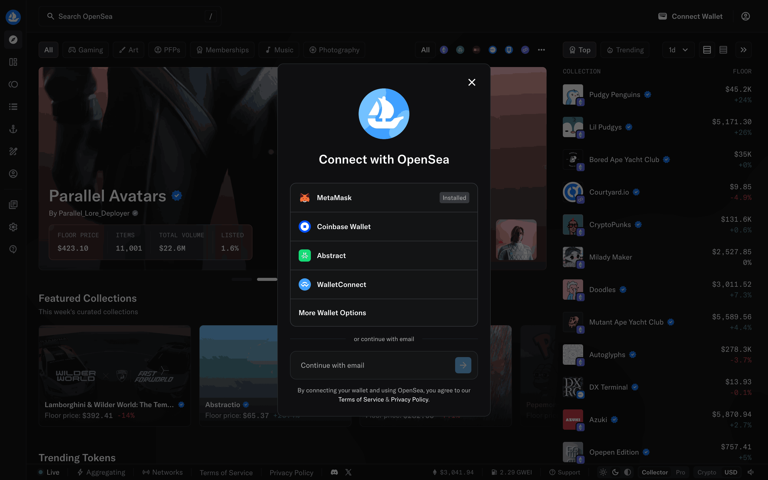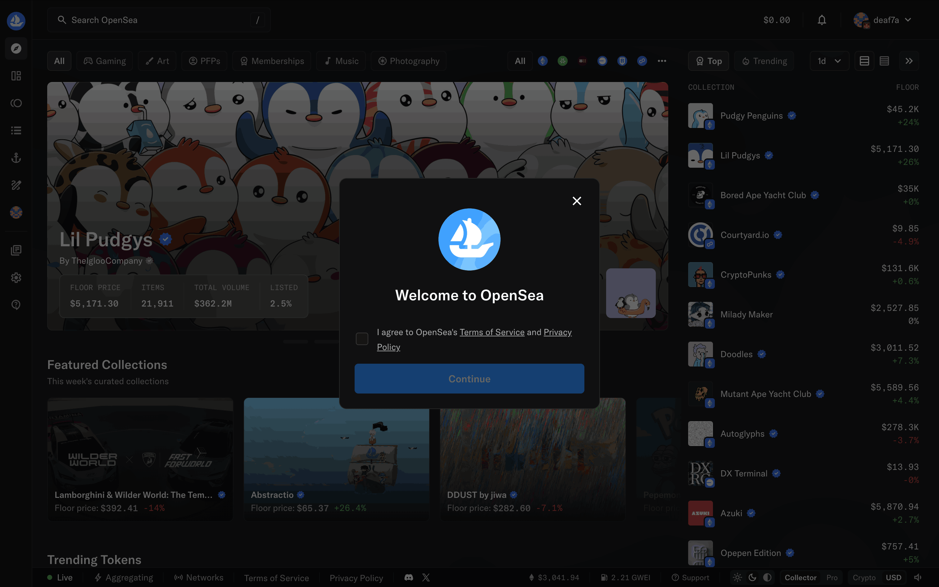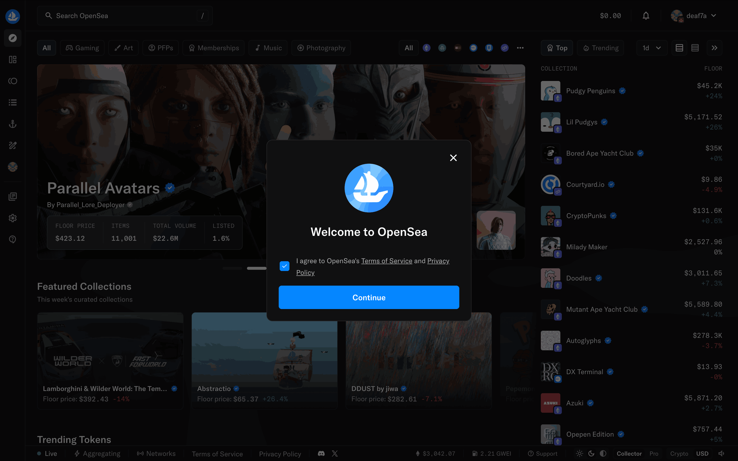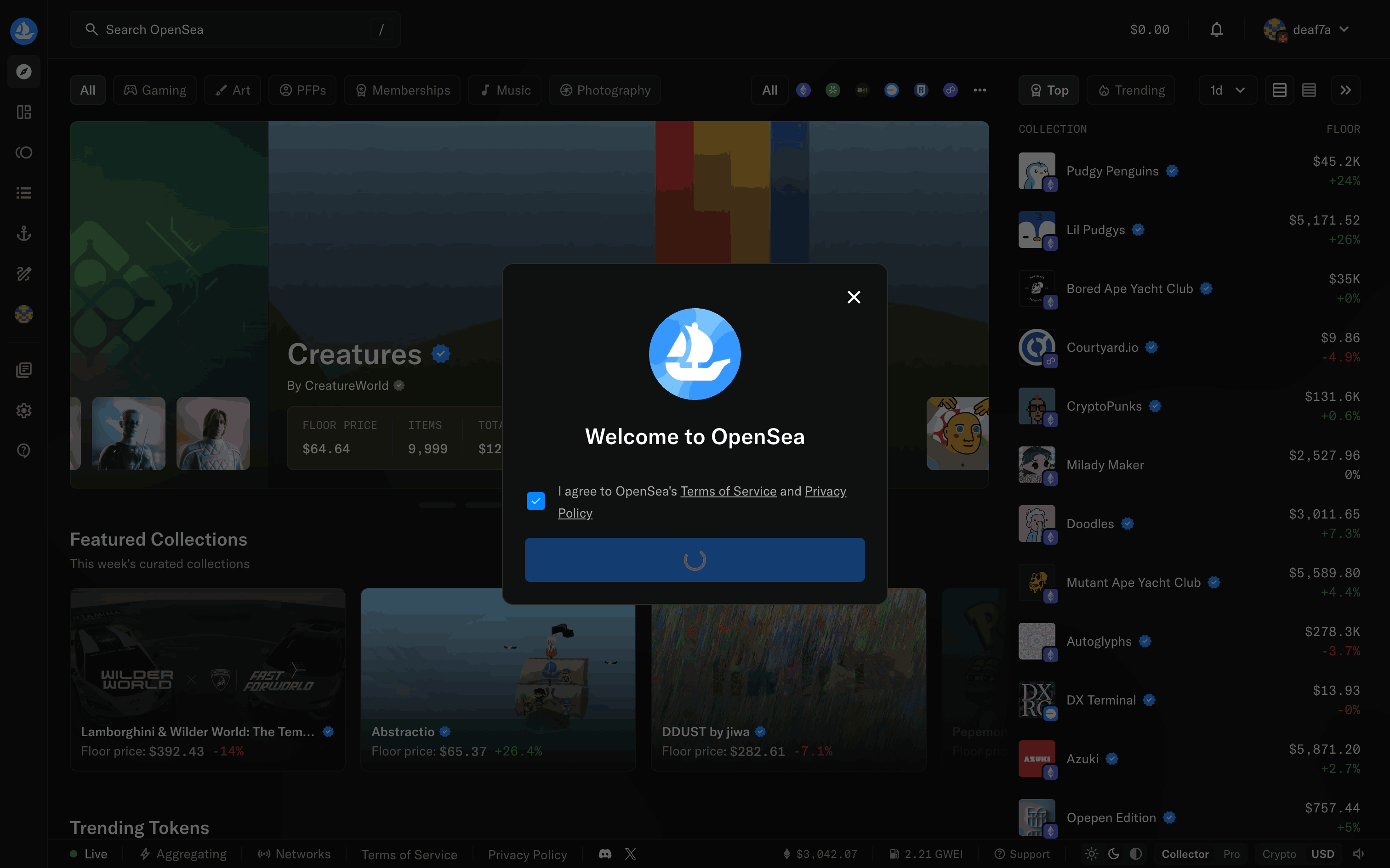 The user connects their wallet to OpenSea by selecting a provider and agreeing to the terms. The homepage then updates to show the connected wallet.
