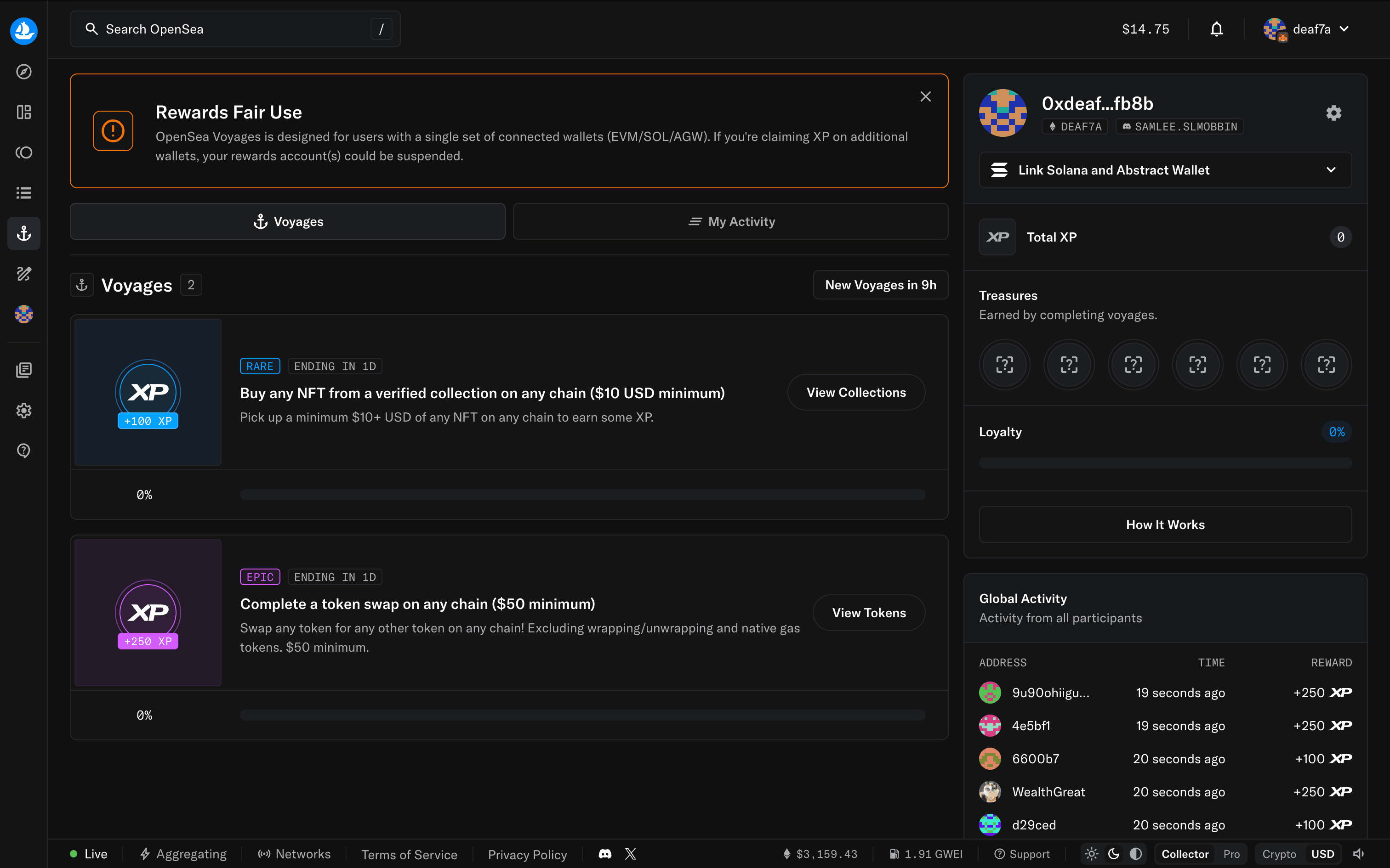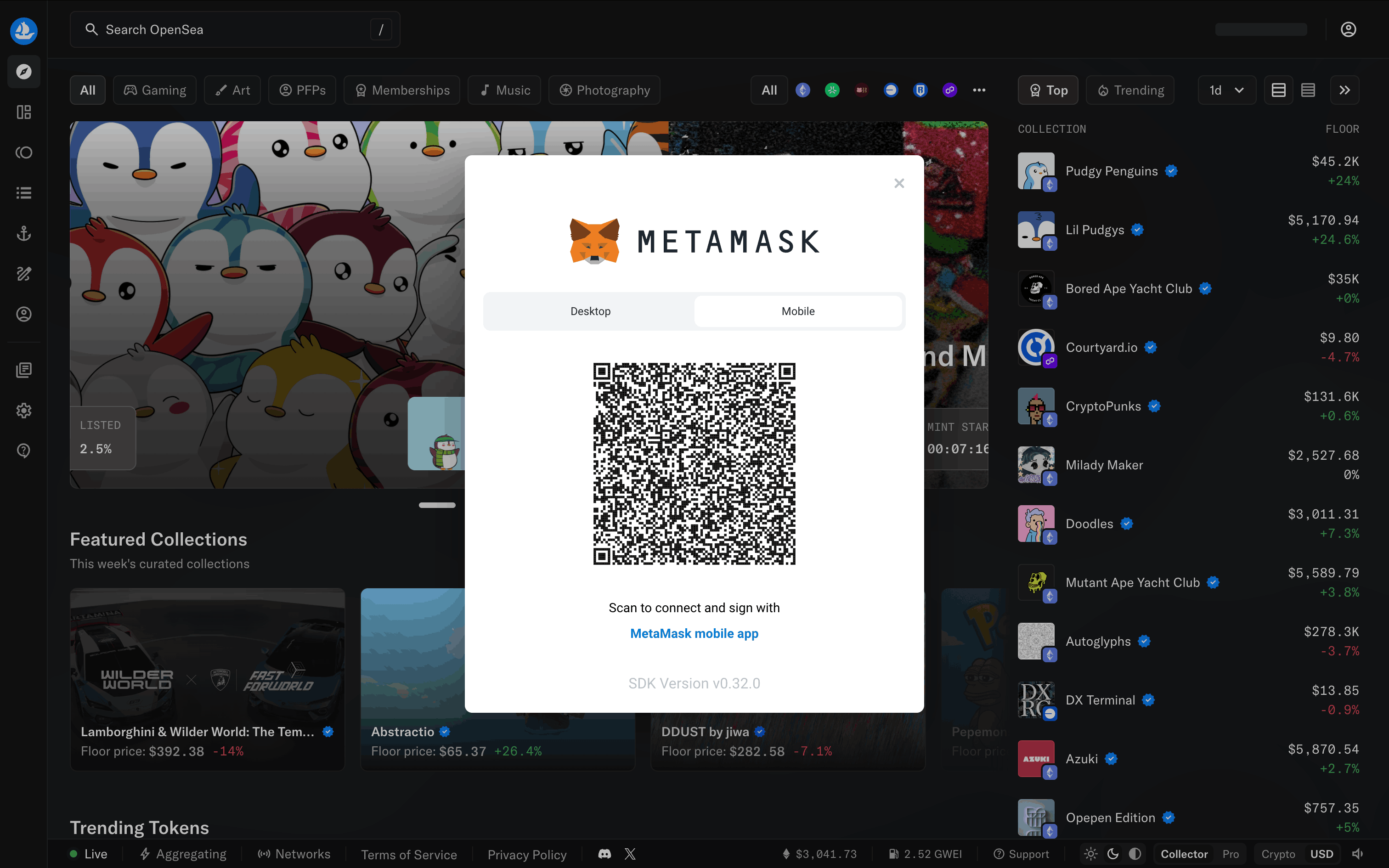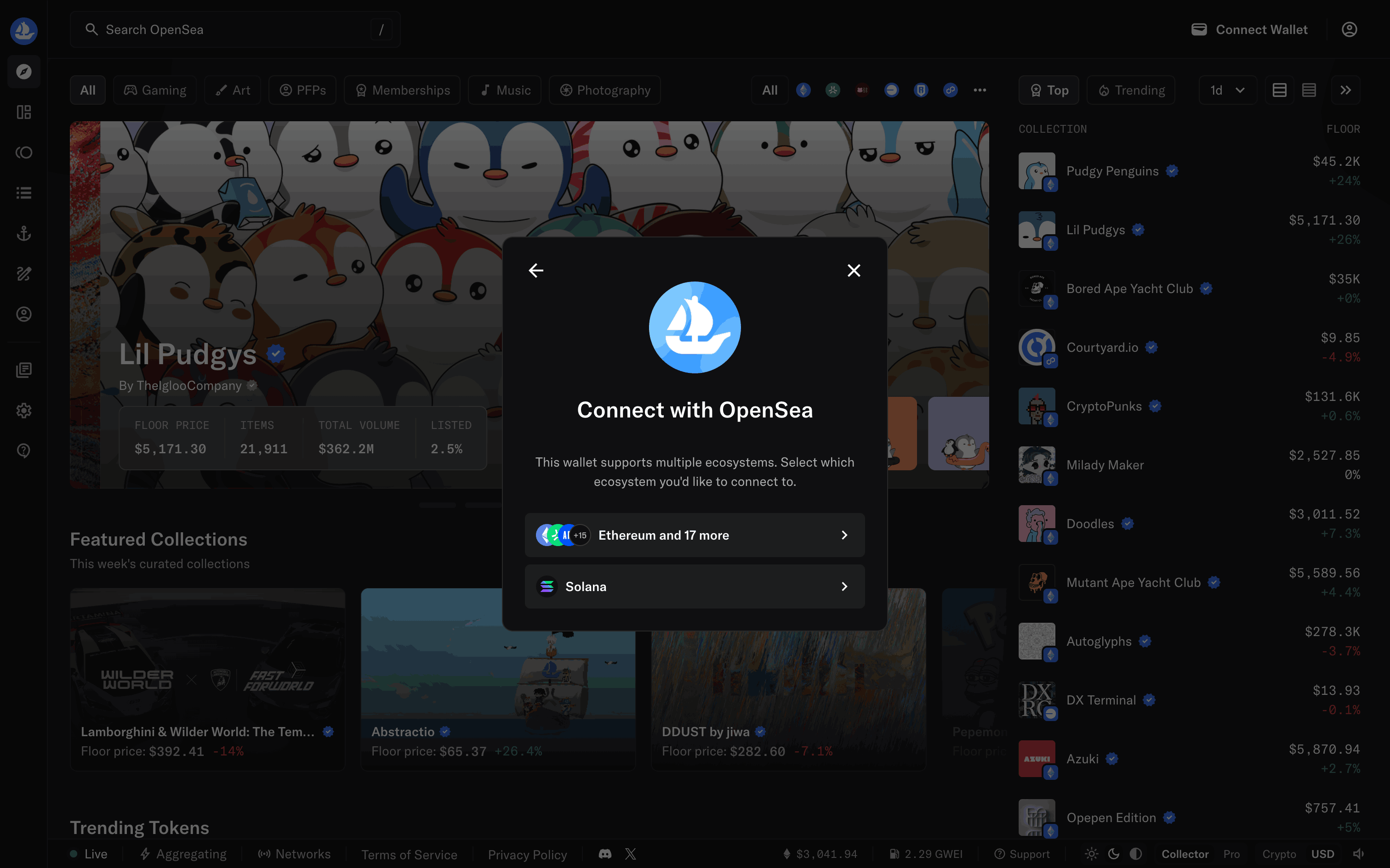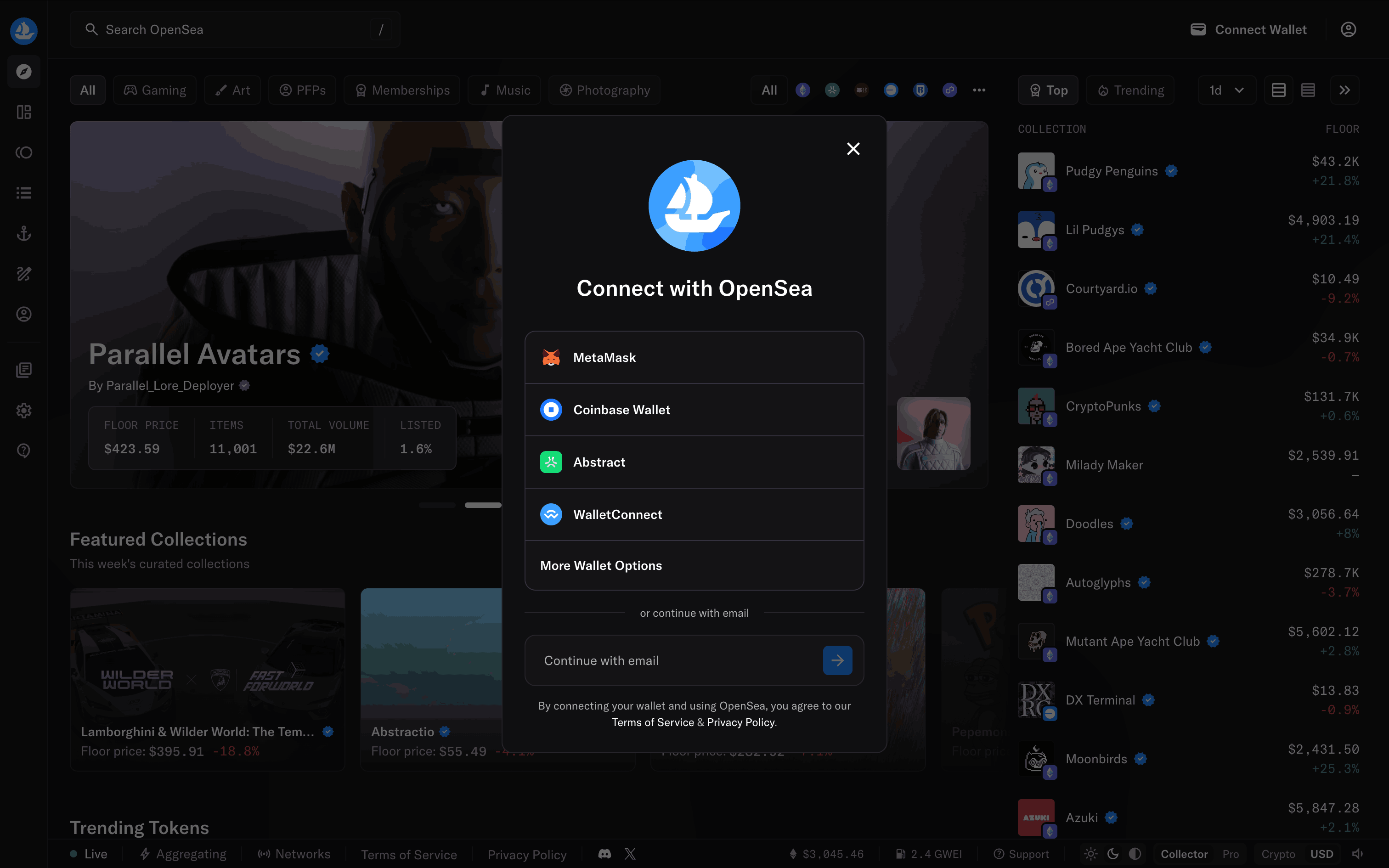 The user connects their wallet to OpenSea by selecting a provider and agreeing to the terms. The homepage then updates to show the connected wallet.