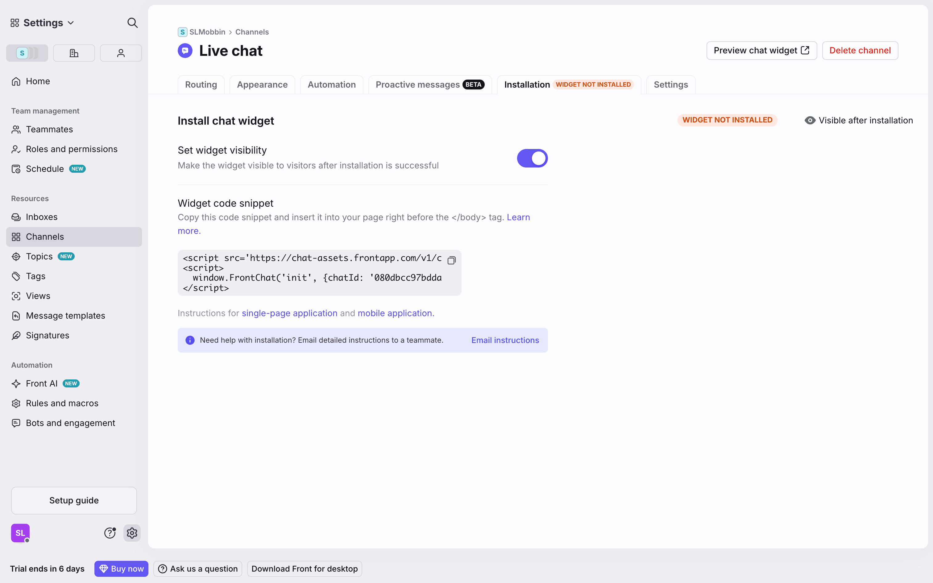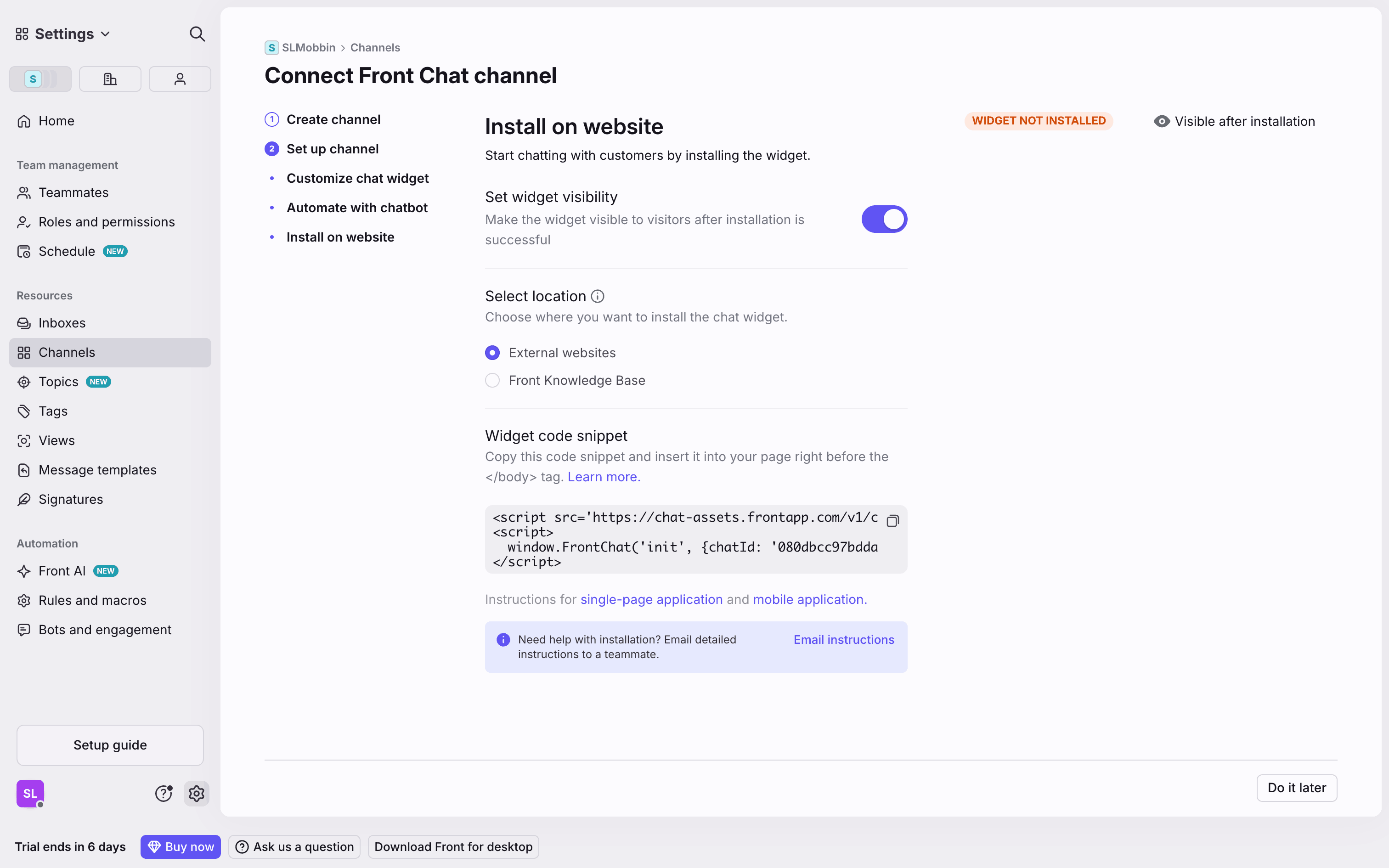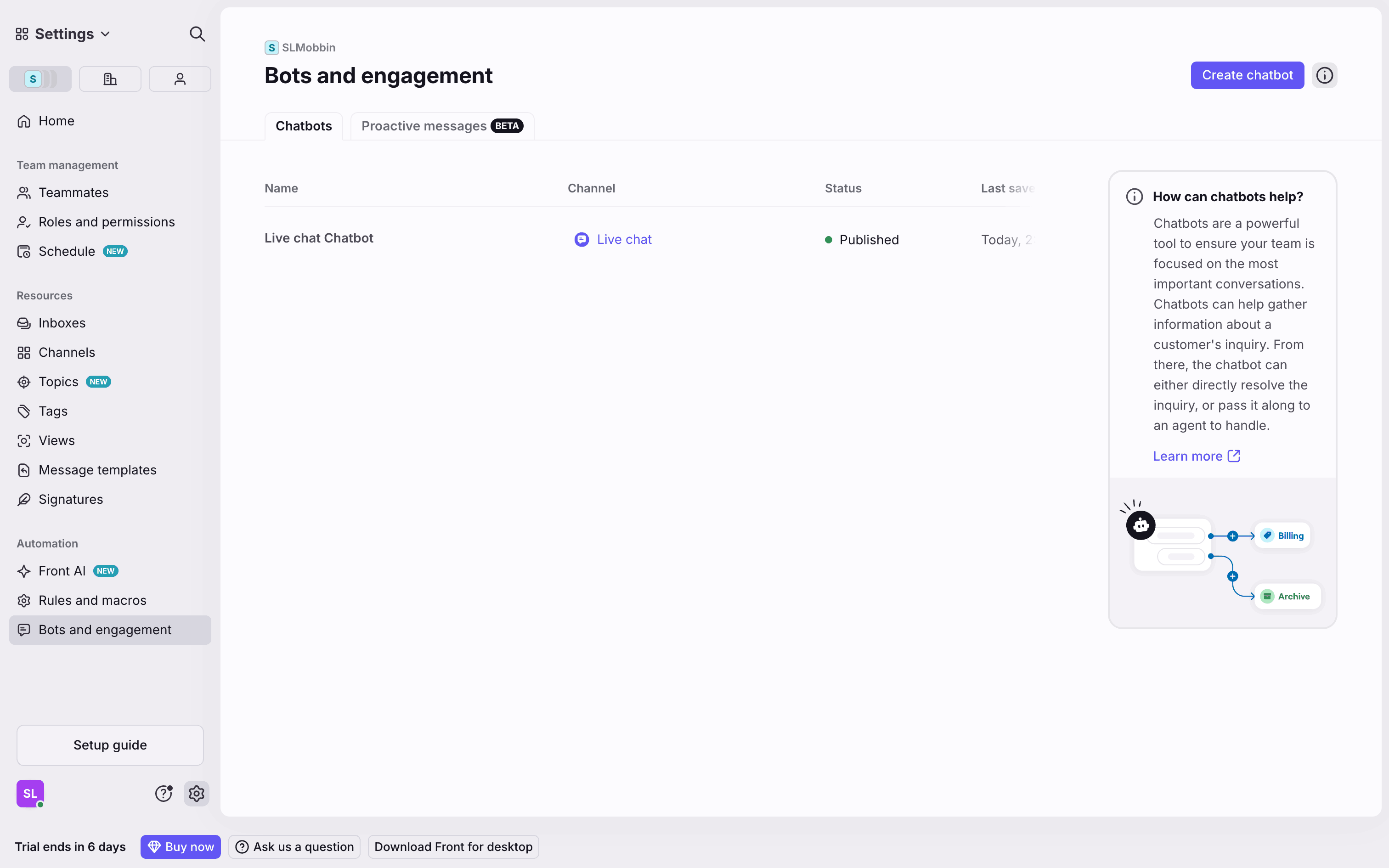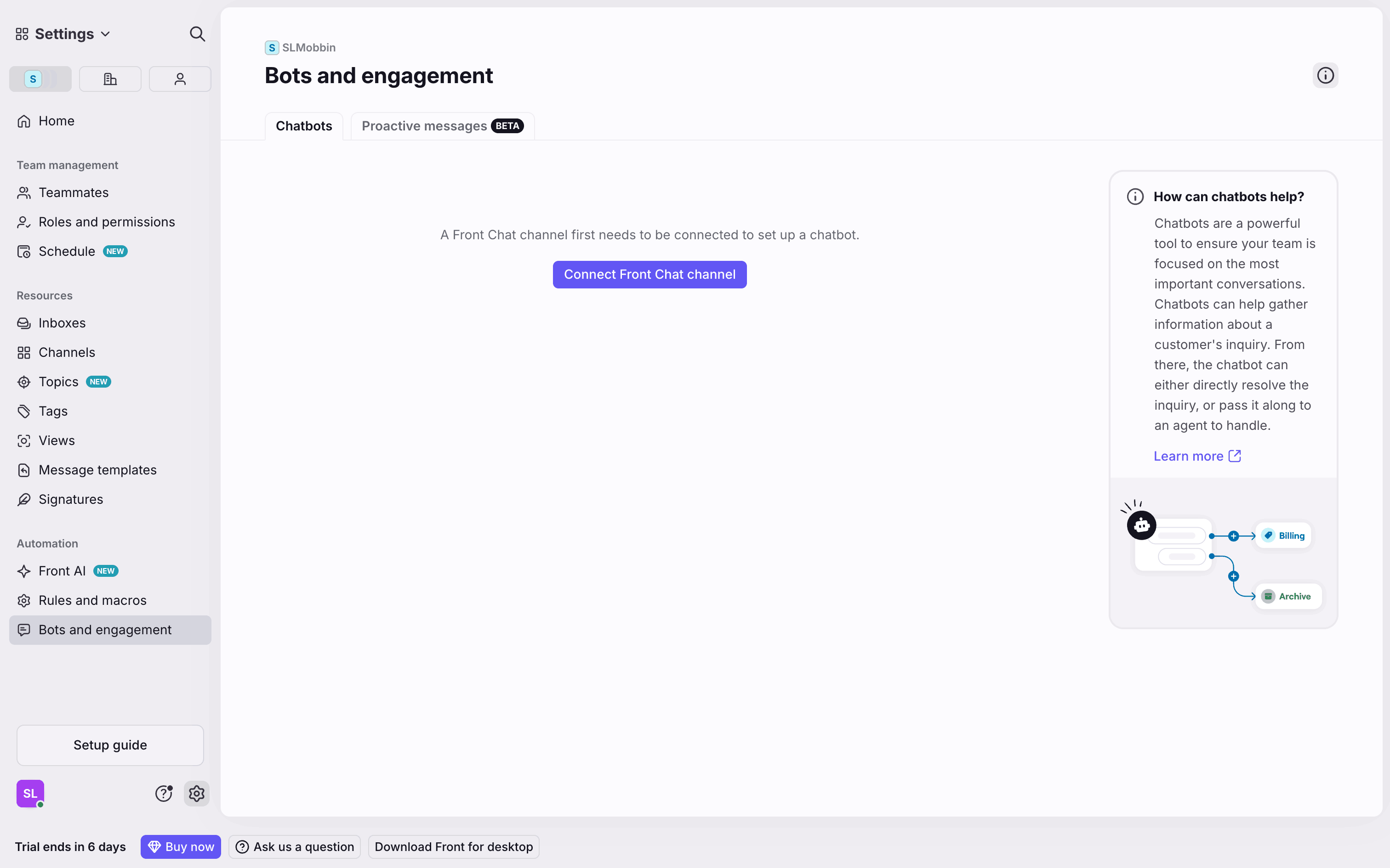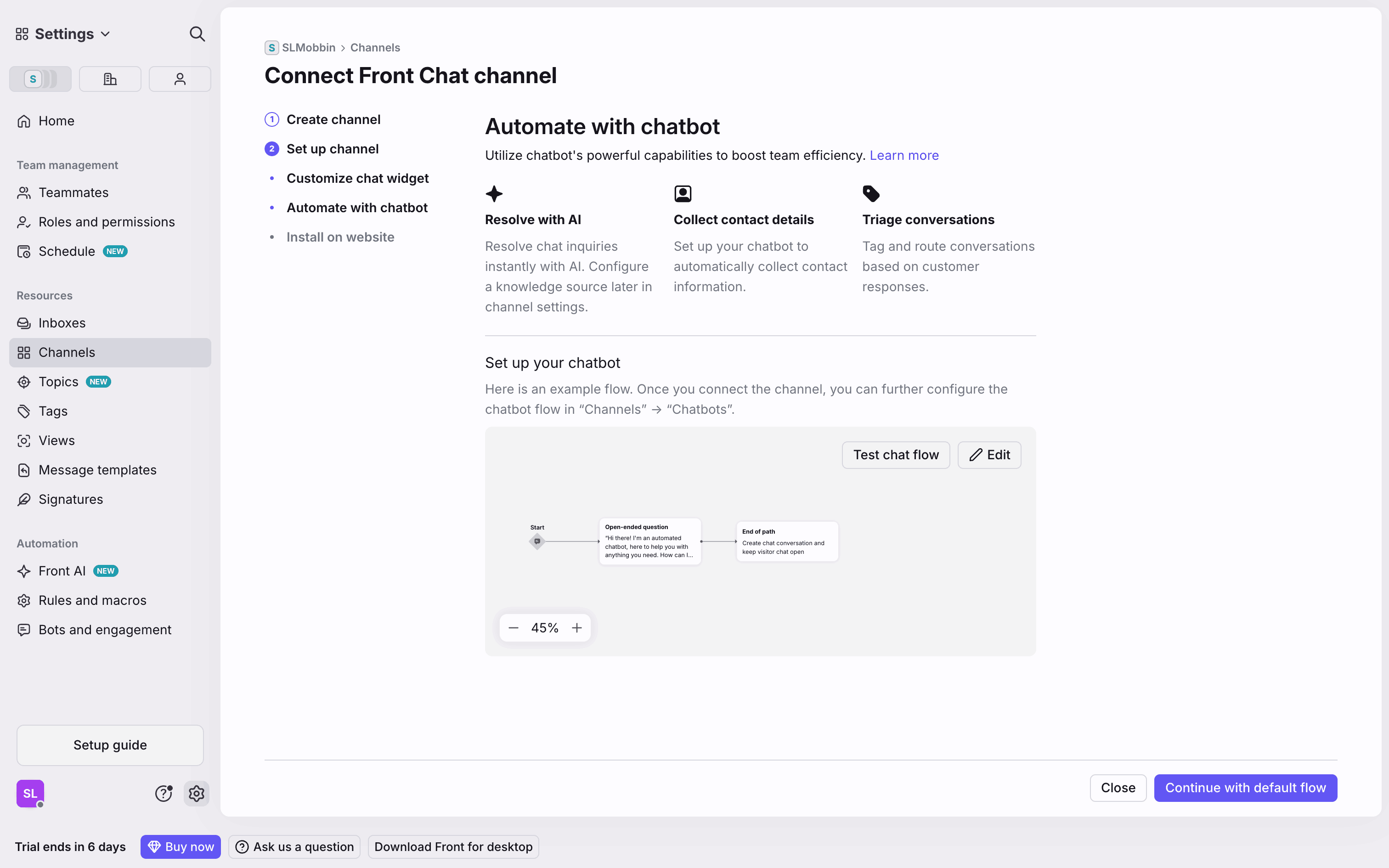 The user flow guides the user through connecting a Front Chat channel, customizing the widget, automating the chatbot, and installing it on their website. The flow concludes with the created chatbot listed on the Bots and engagement page.