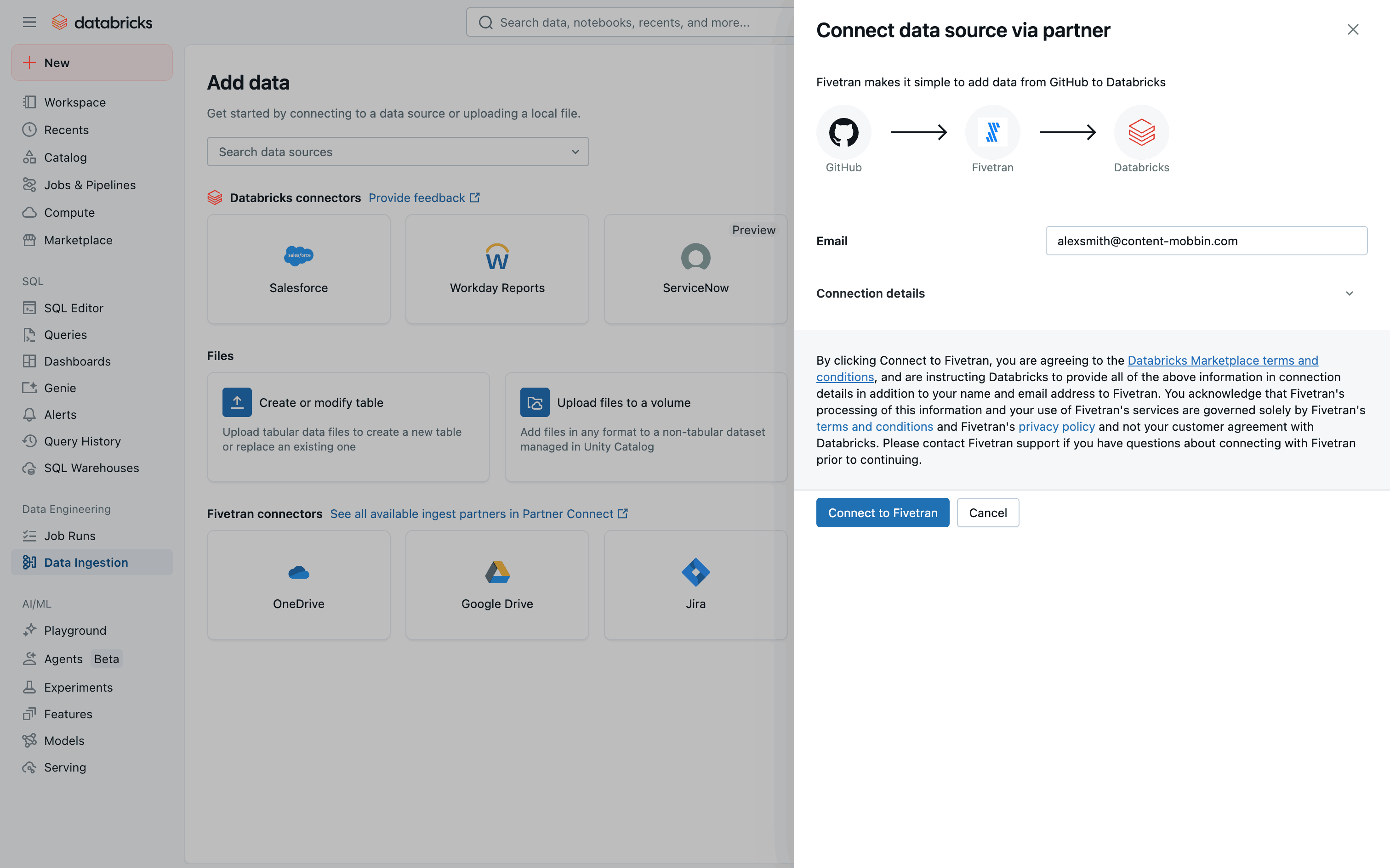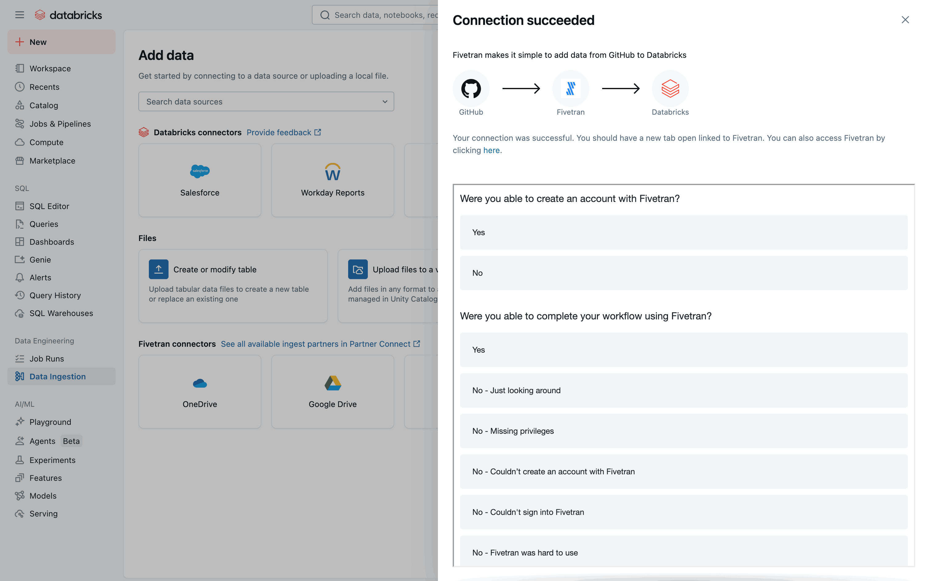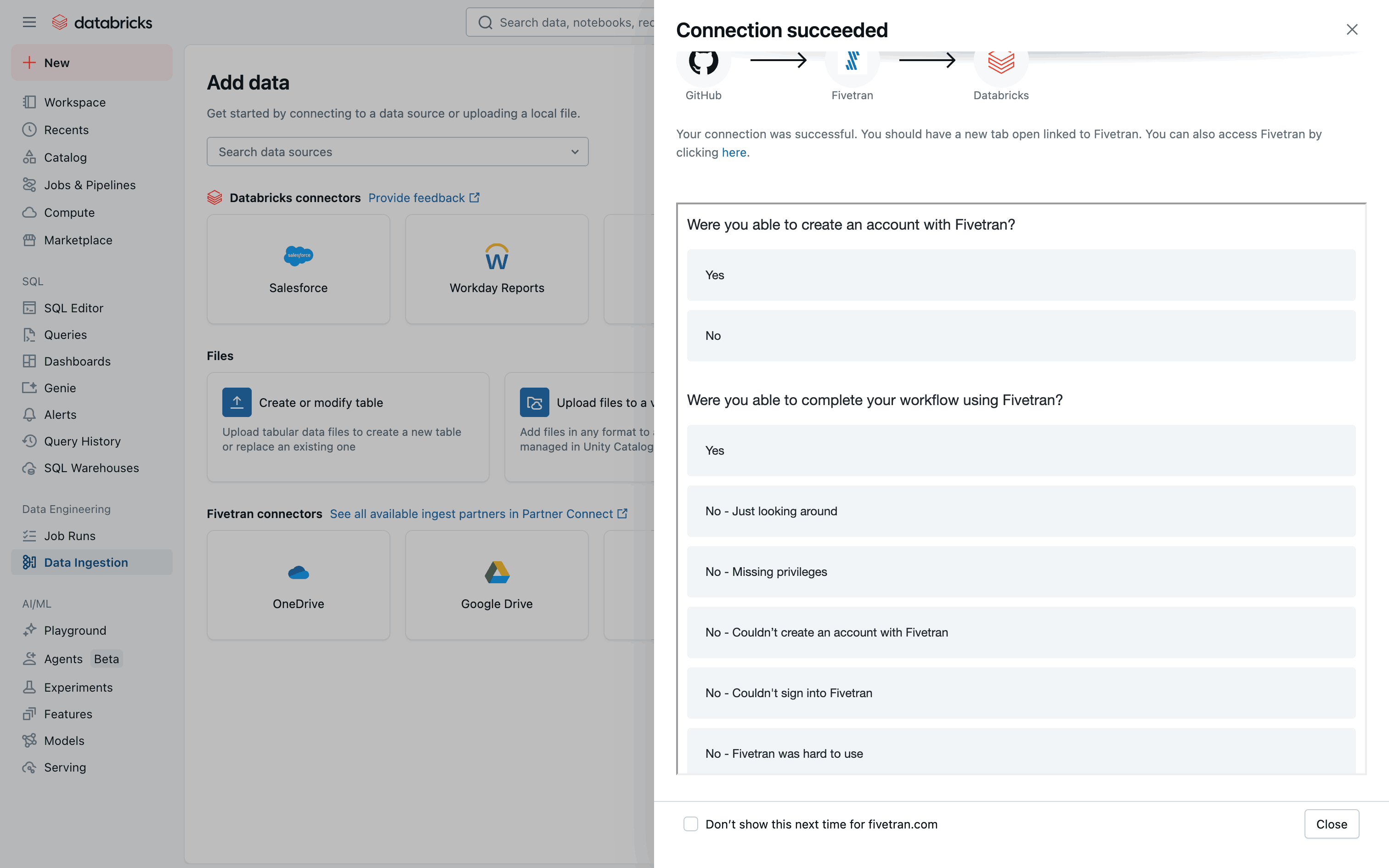 The user connects to Github via Fivetran. The flow involves configuring the connection and completing a survey.