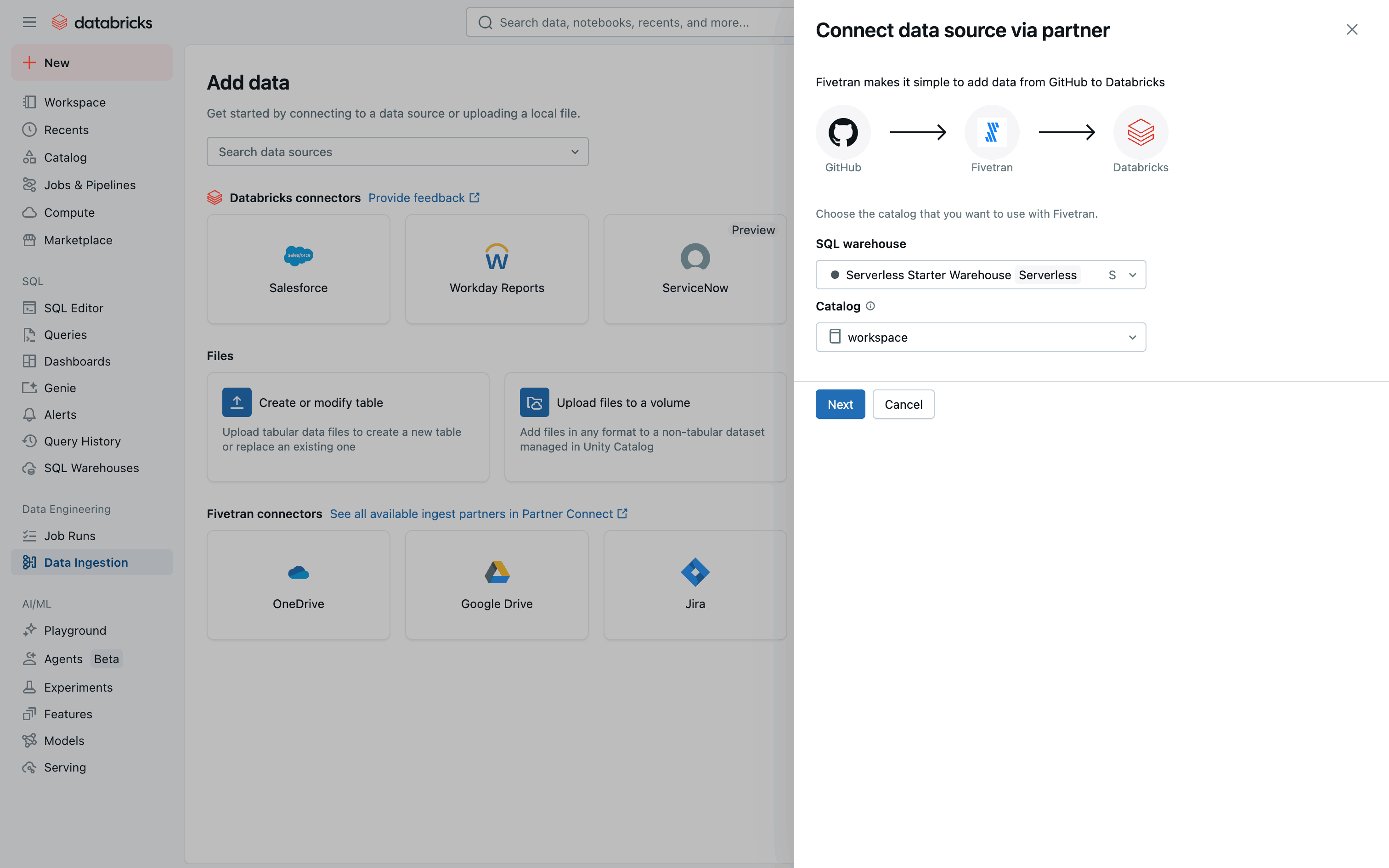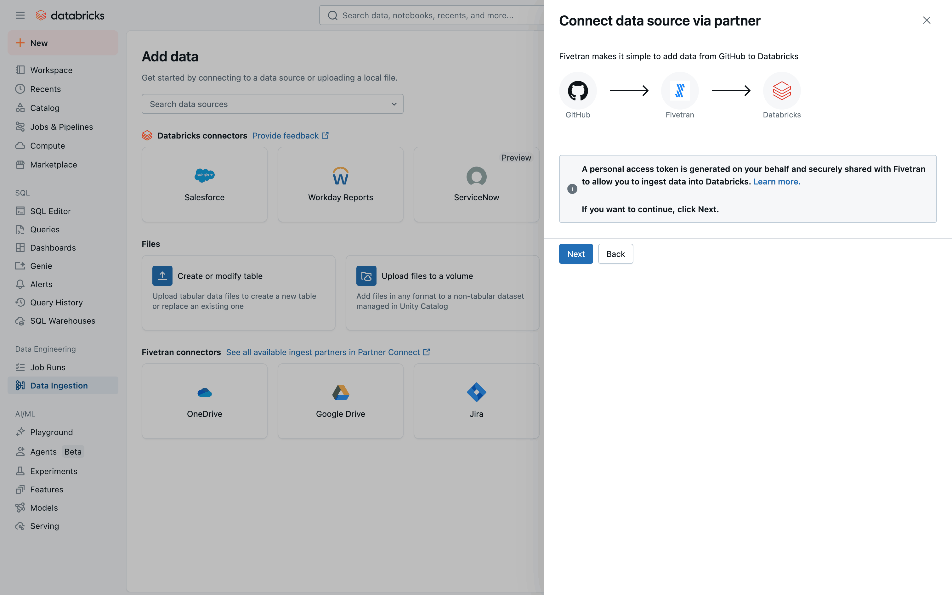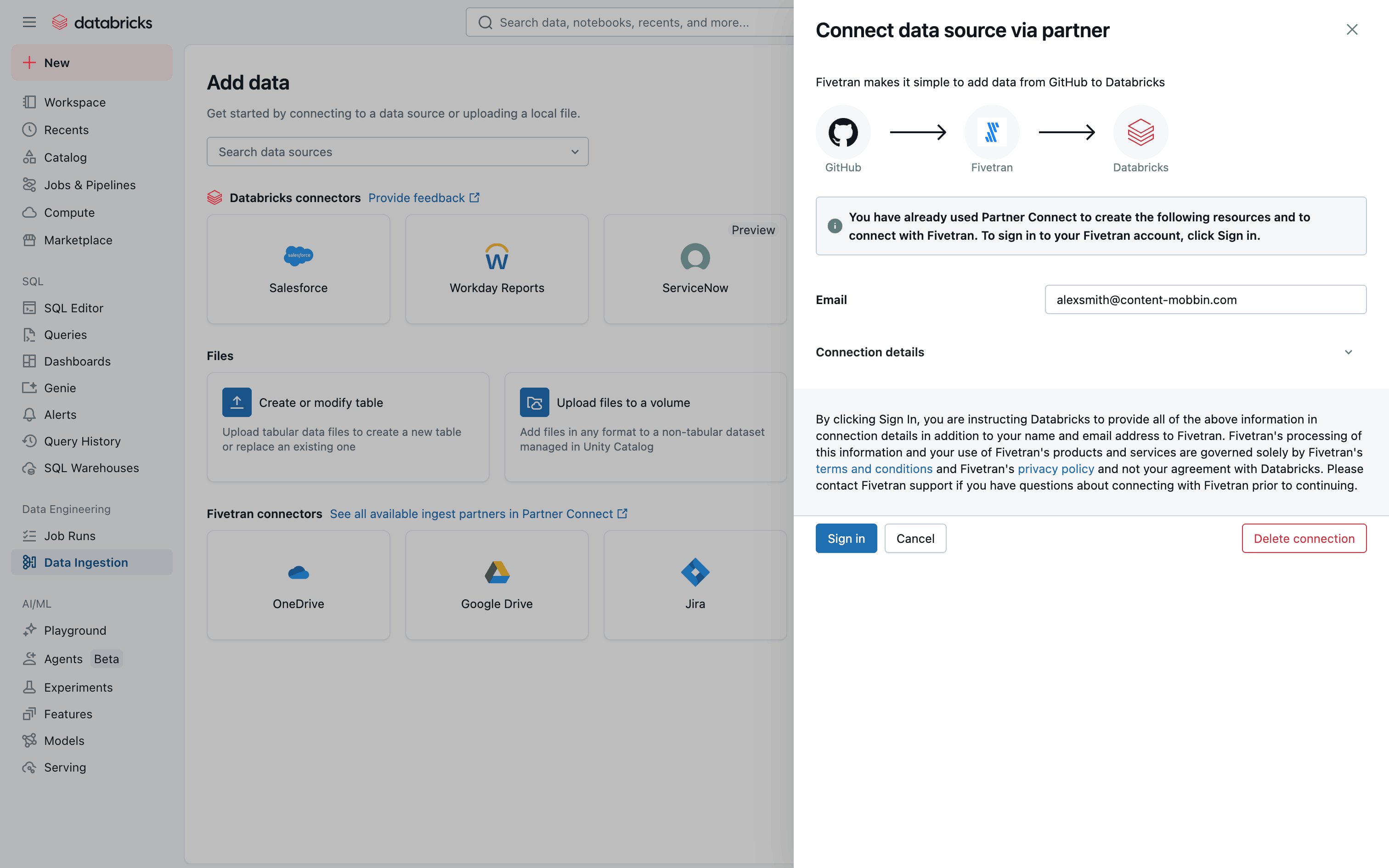 The user connects to Github via Fivetran. The flow involves configuring the connection and completing a survey.