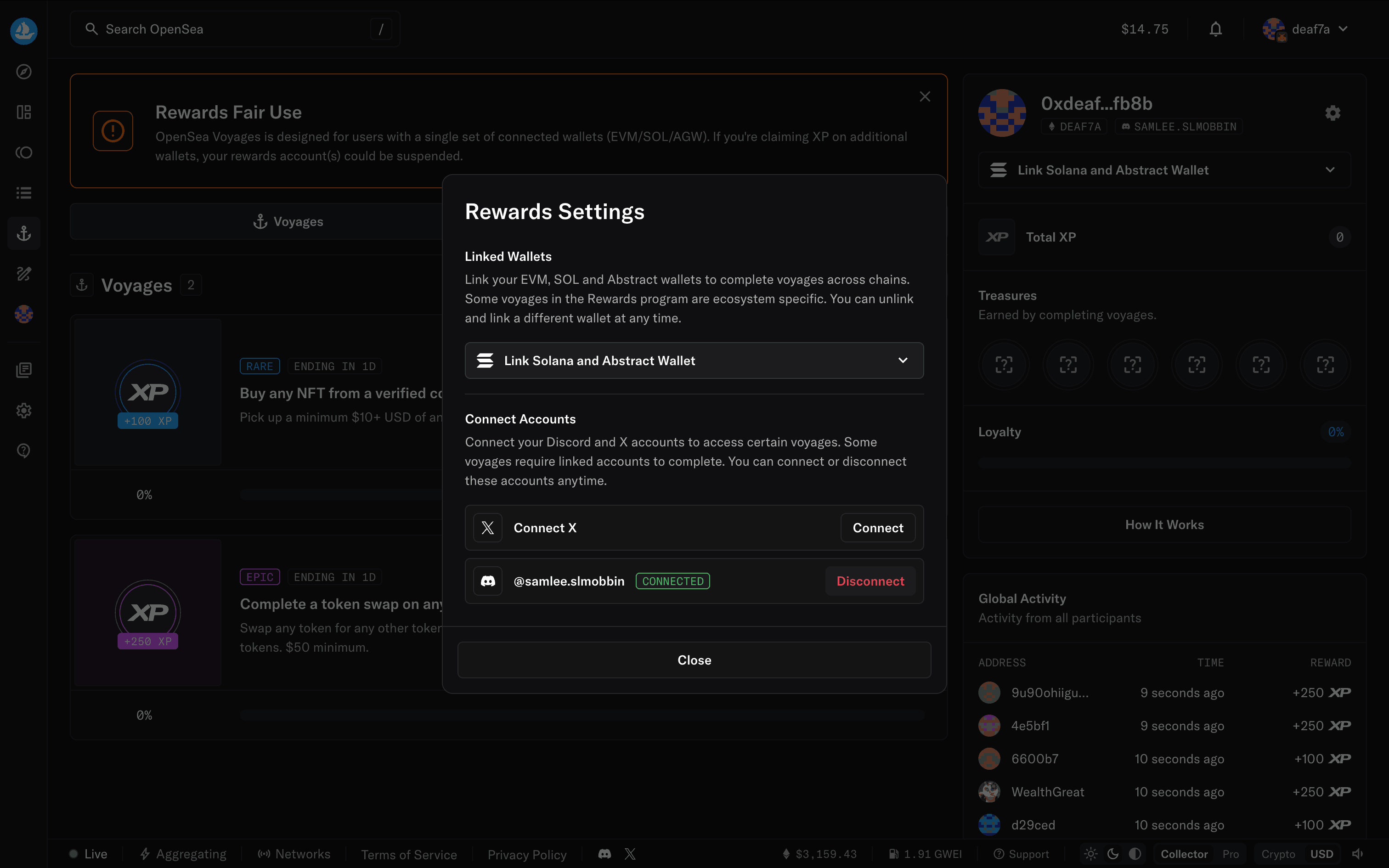 The user navigates to the Rewards Settings to connect their Discord account. The flow demonstrates connecting an external application.