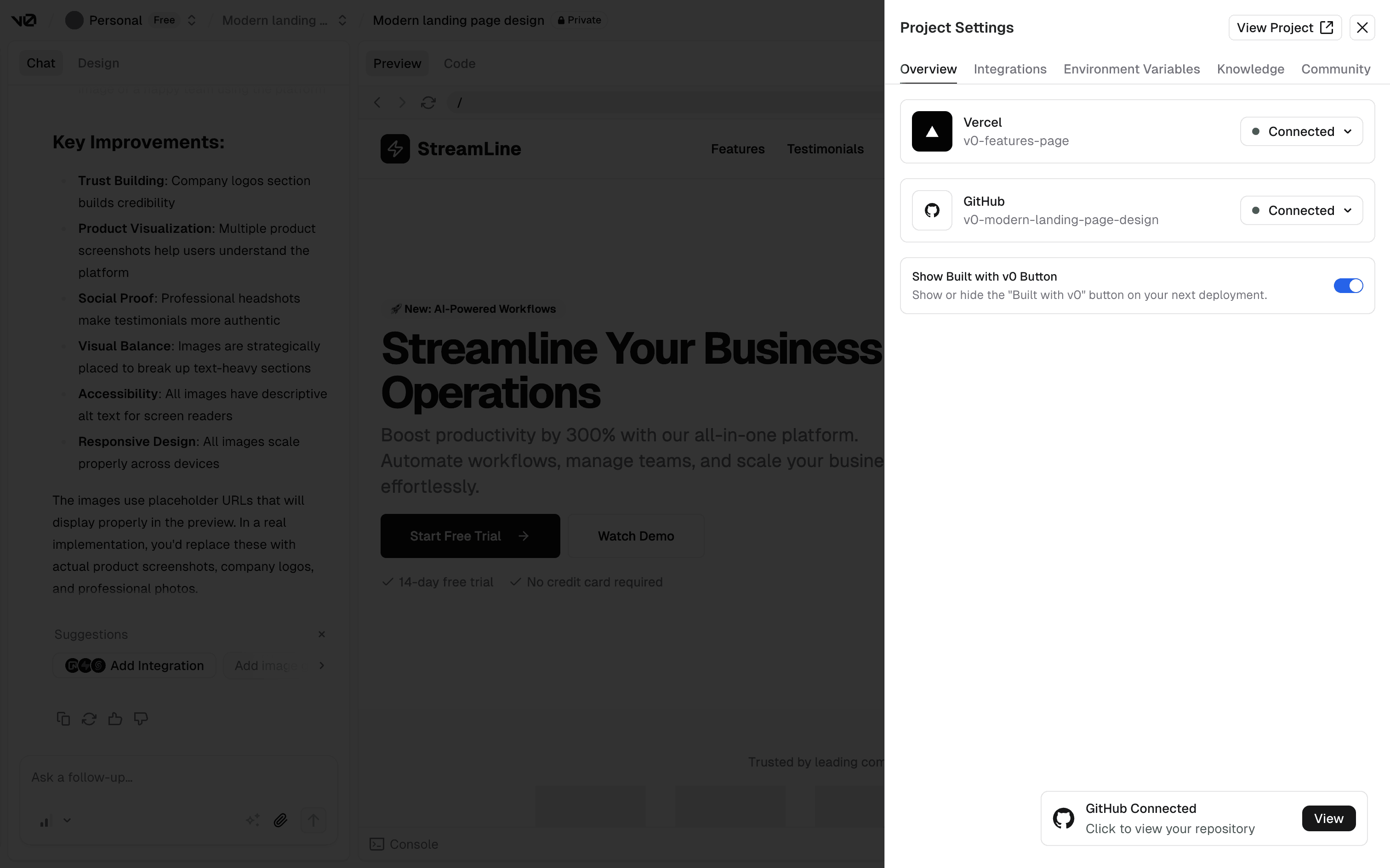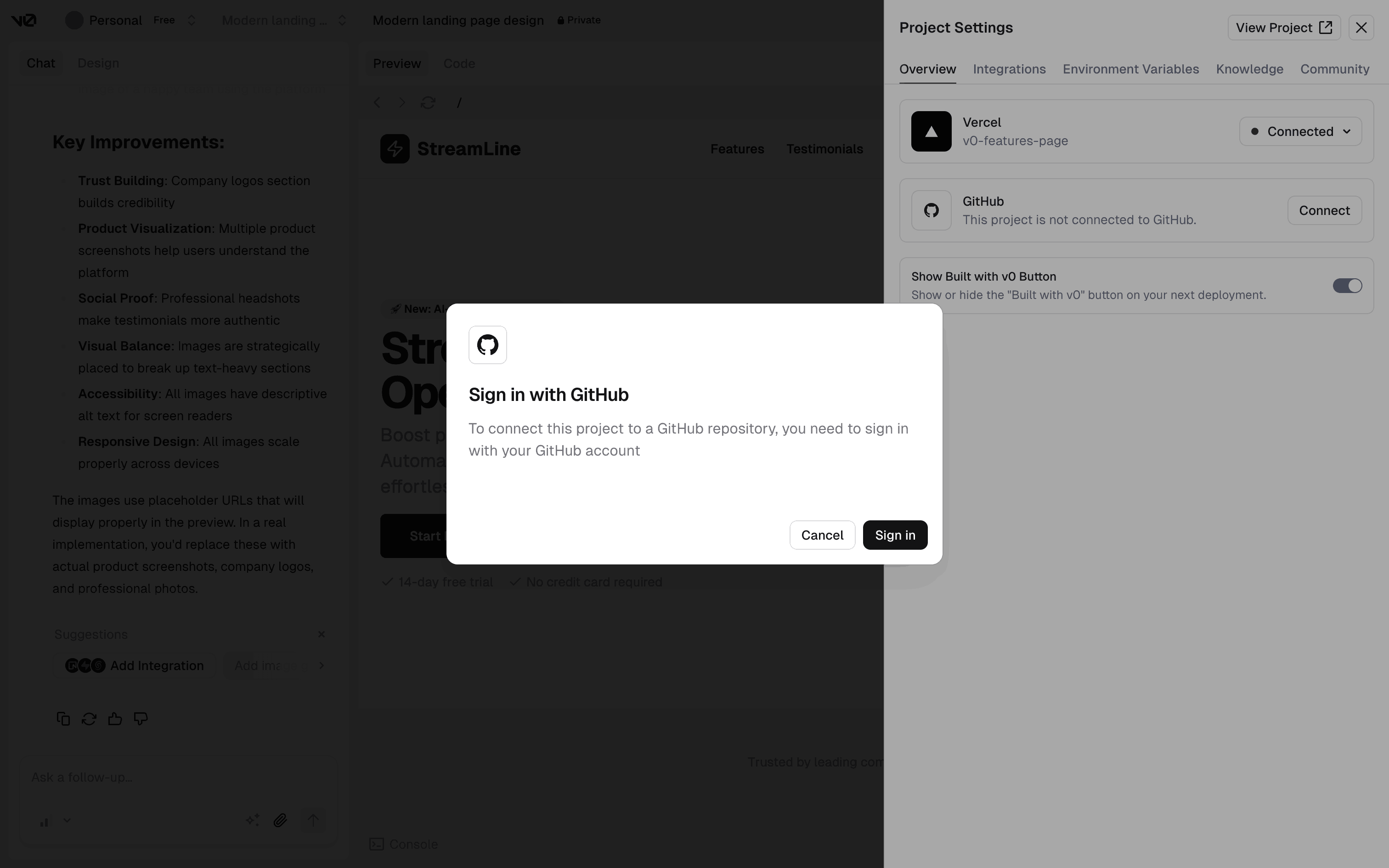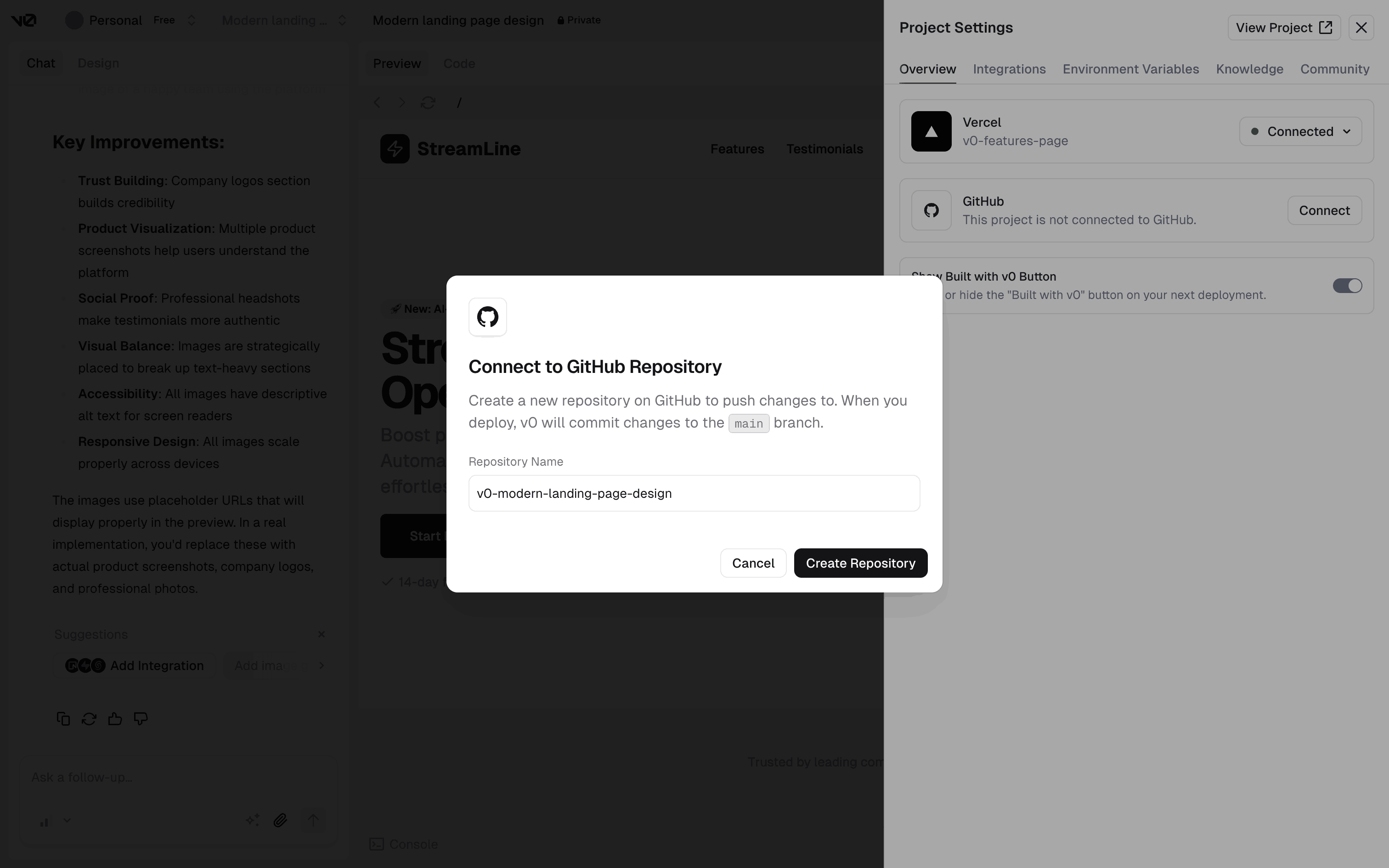 The user connects their project to a Github repository. They sign in to Github and create a new repository to complete the connection.