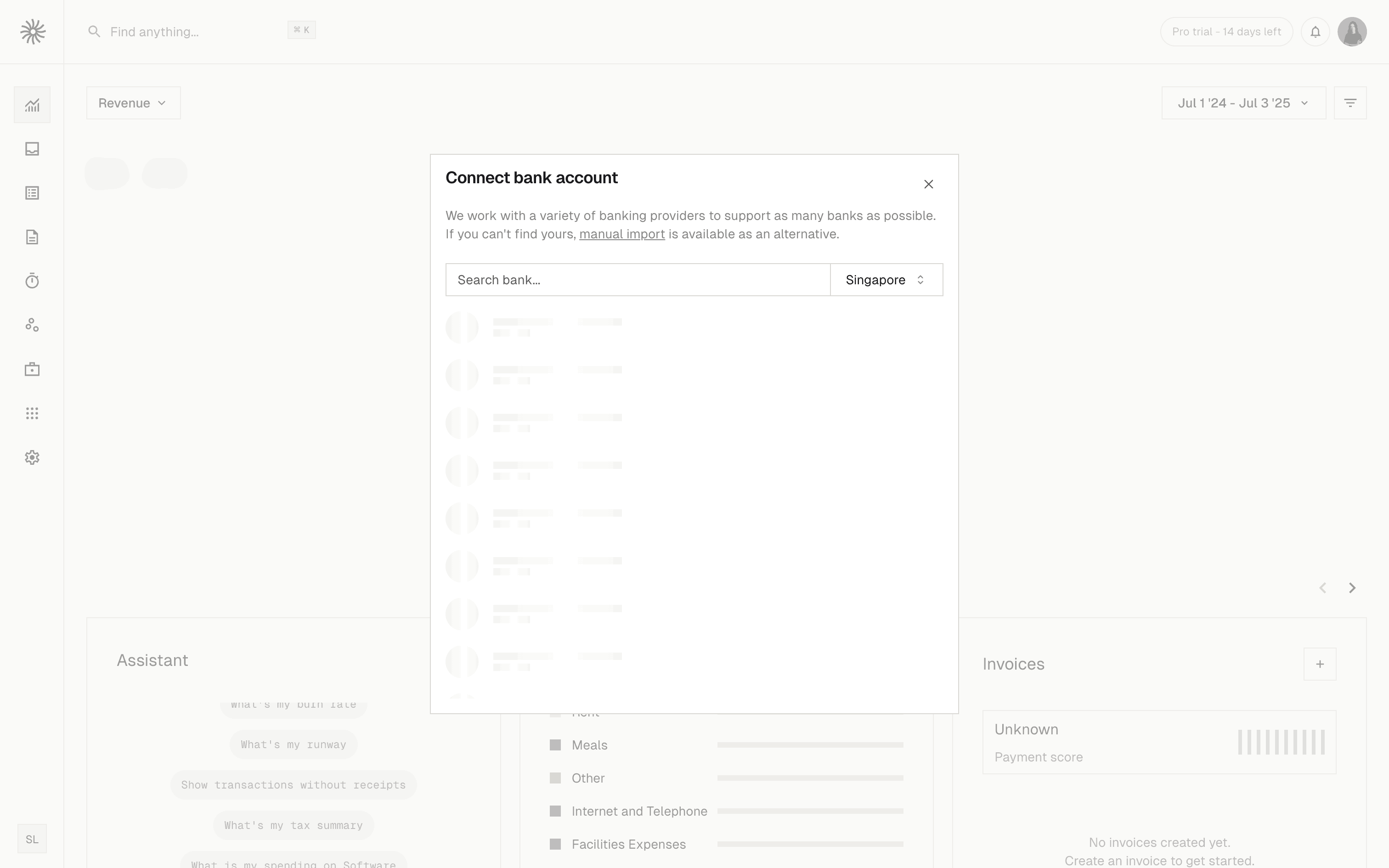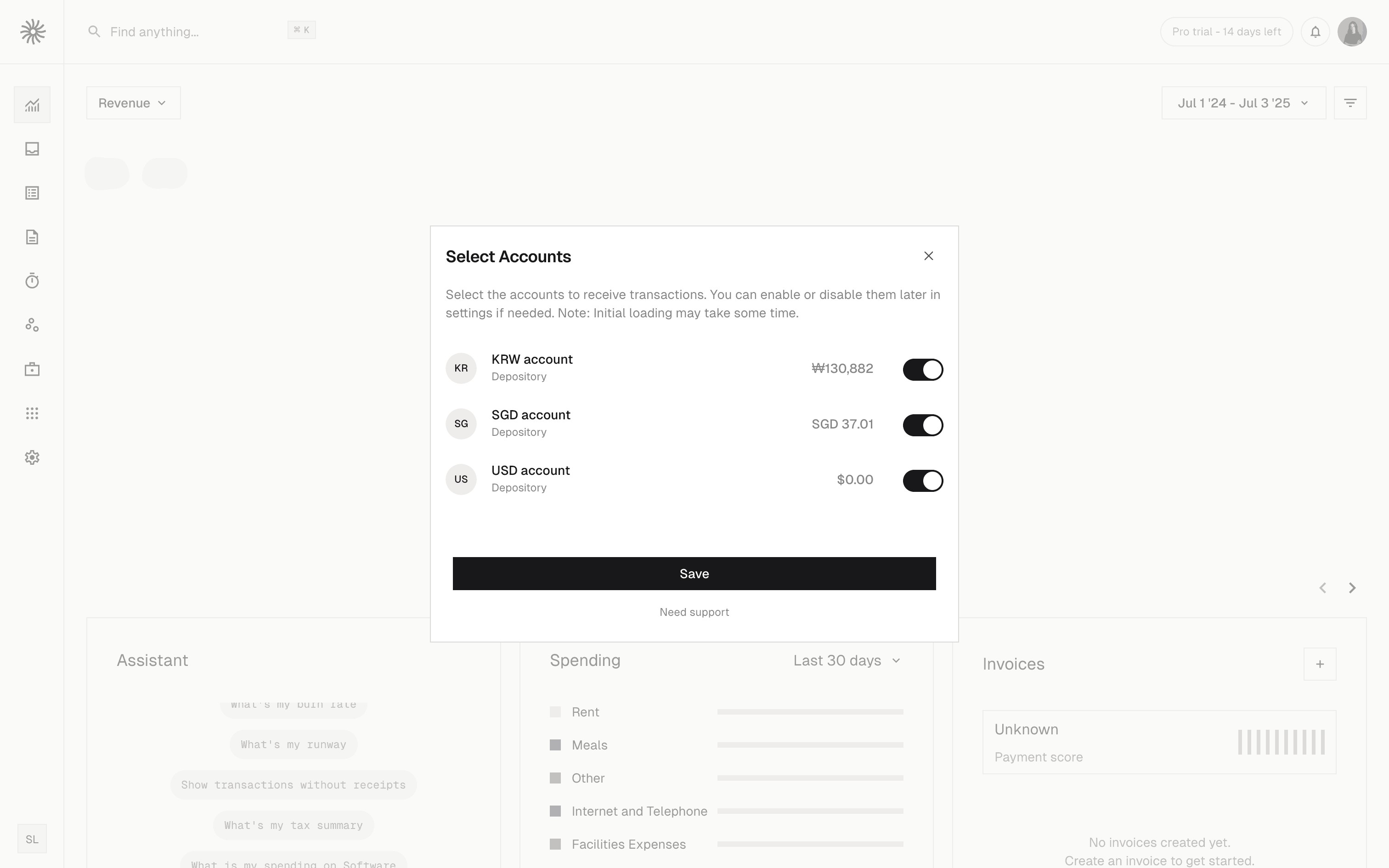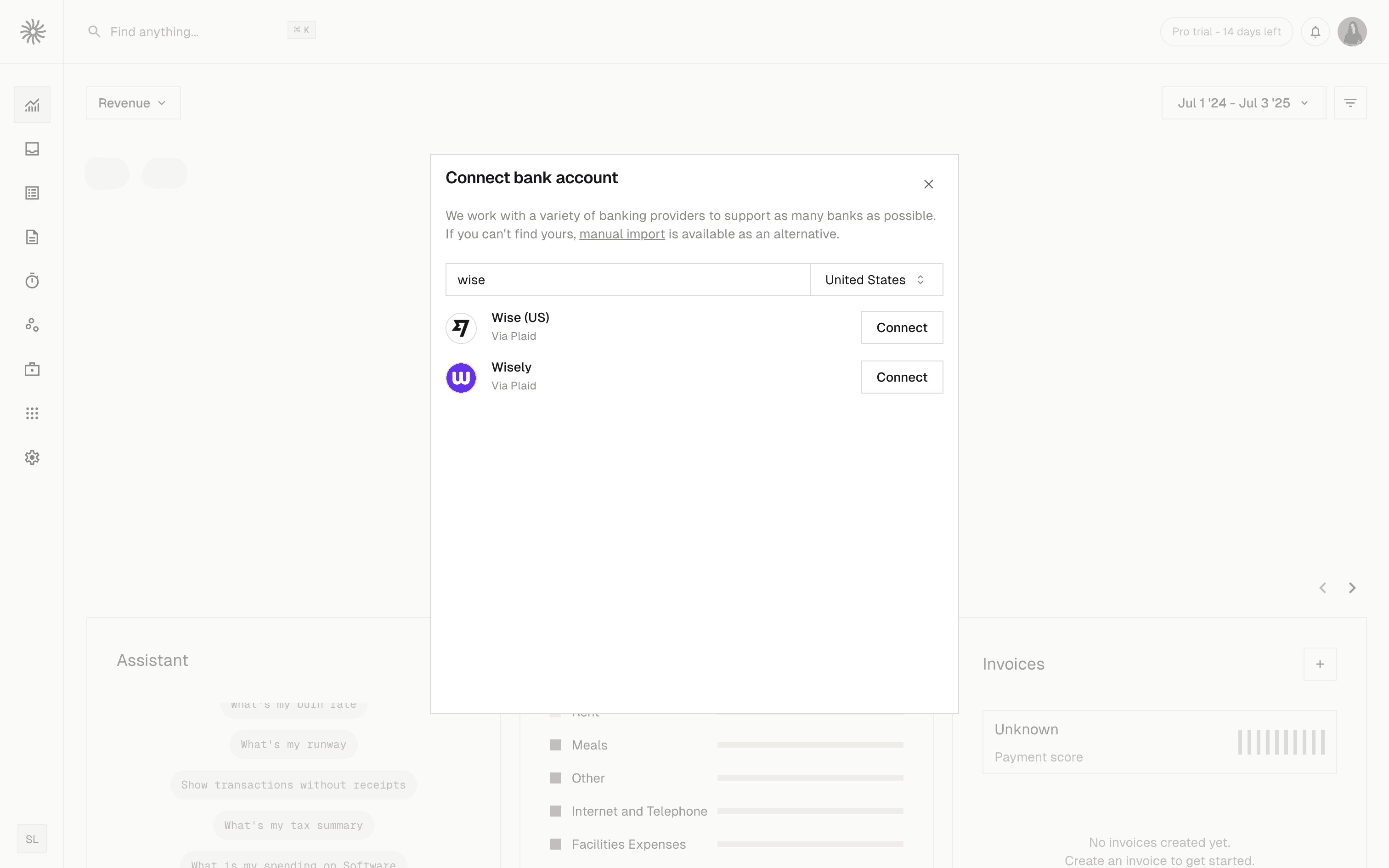 The user connects a bank account by searching for their bank and selecting accounts. The dashboard then updates to display financial data.