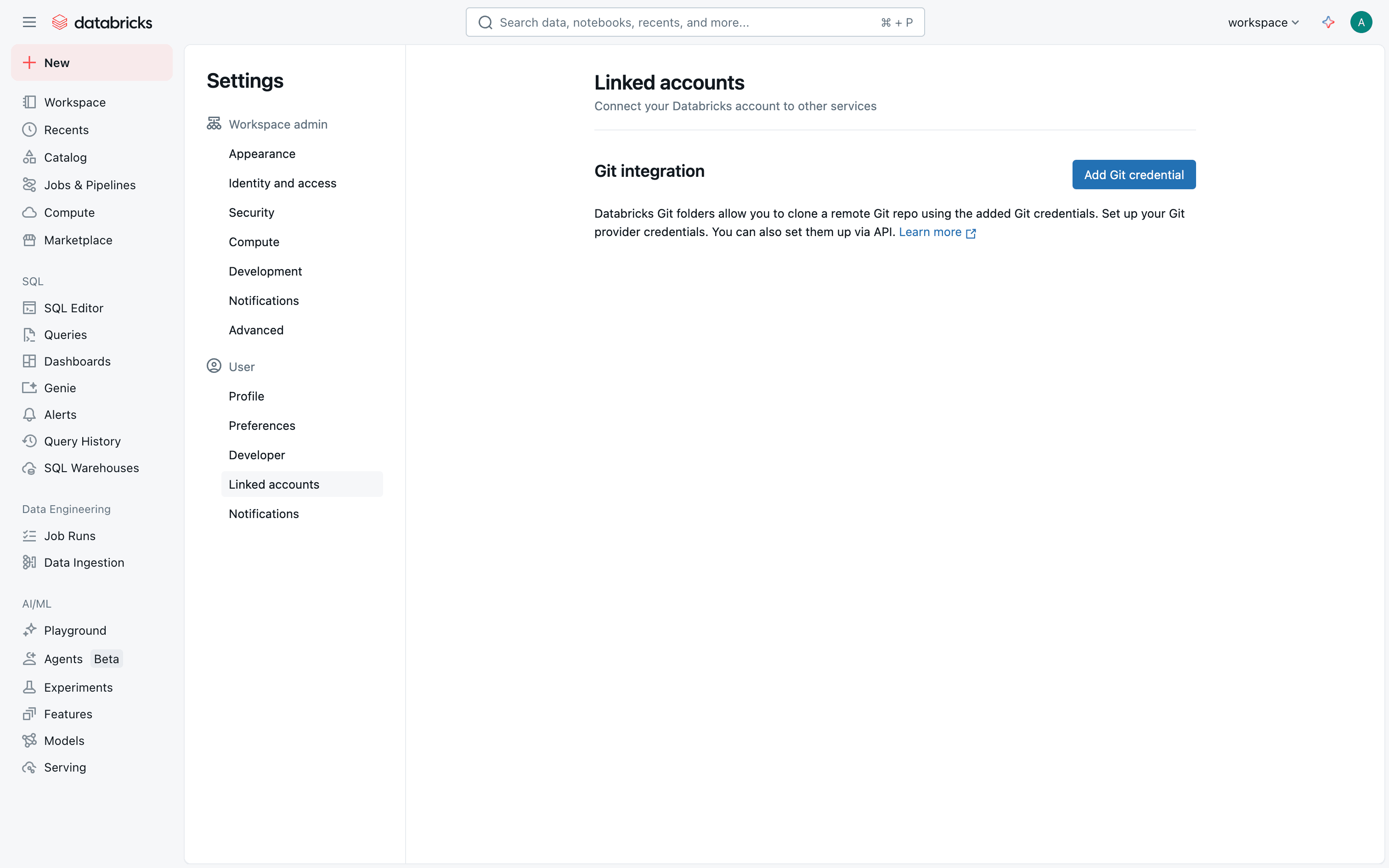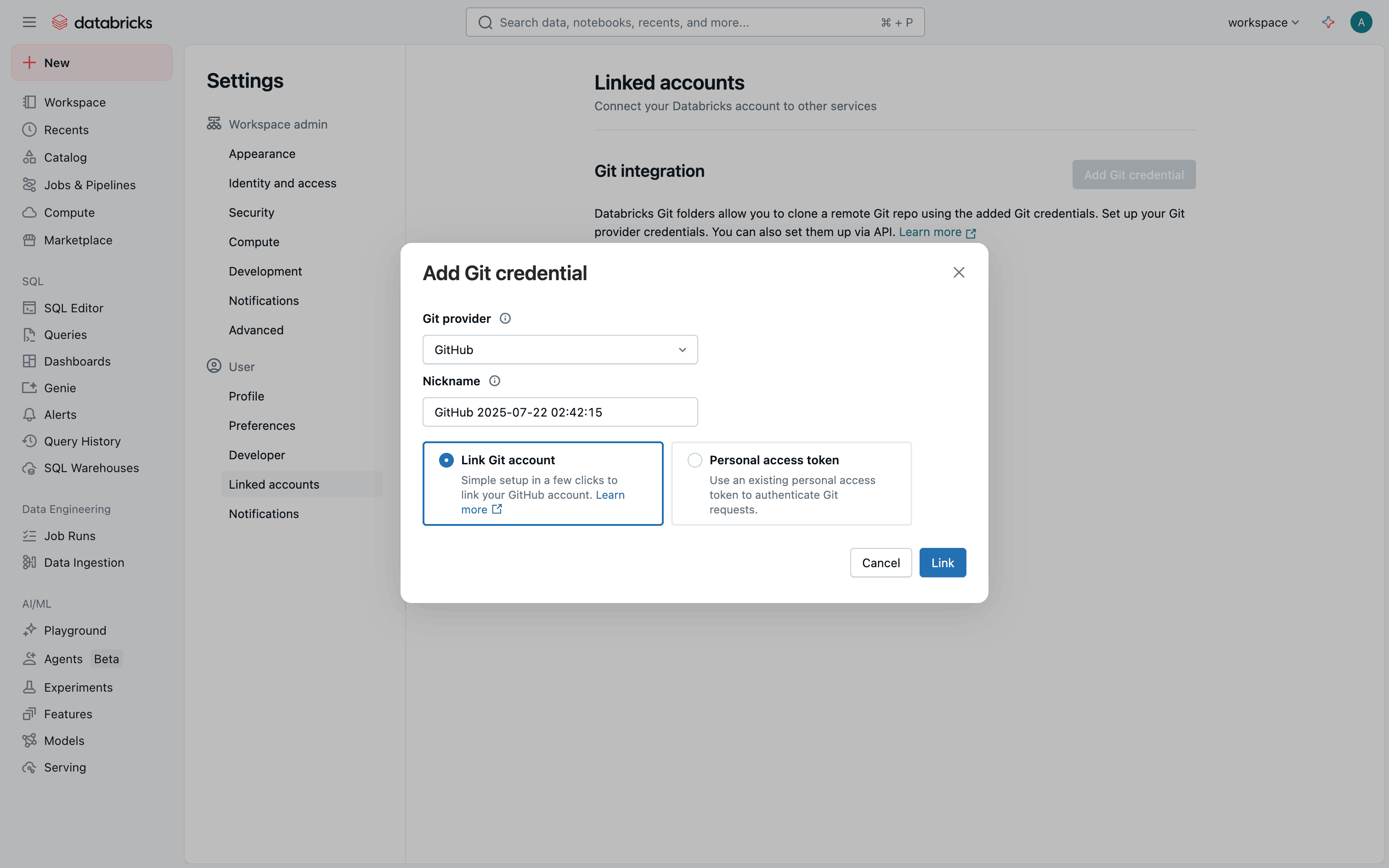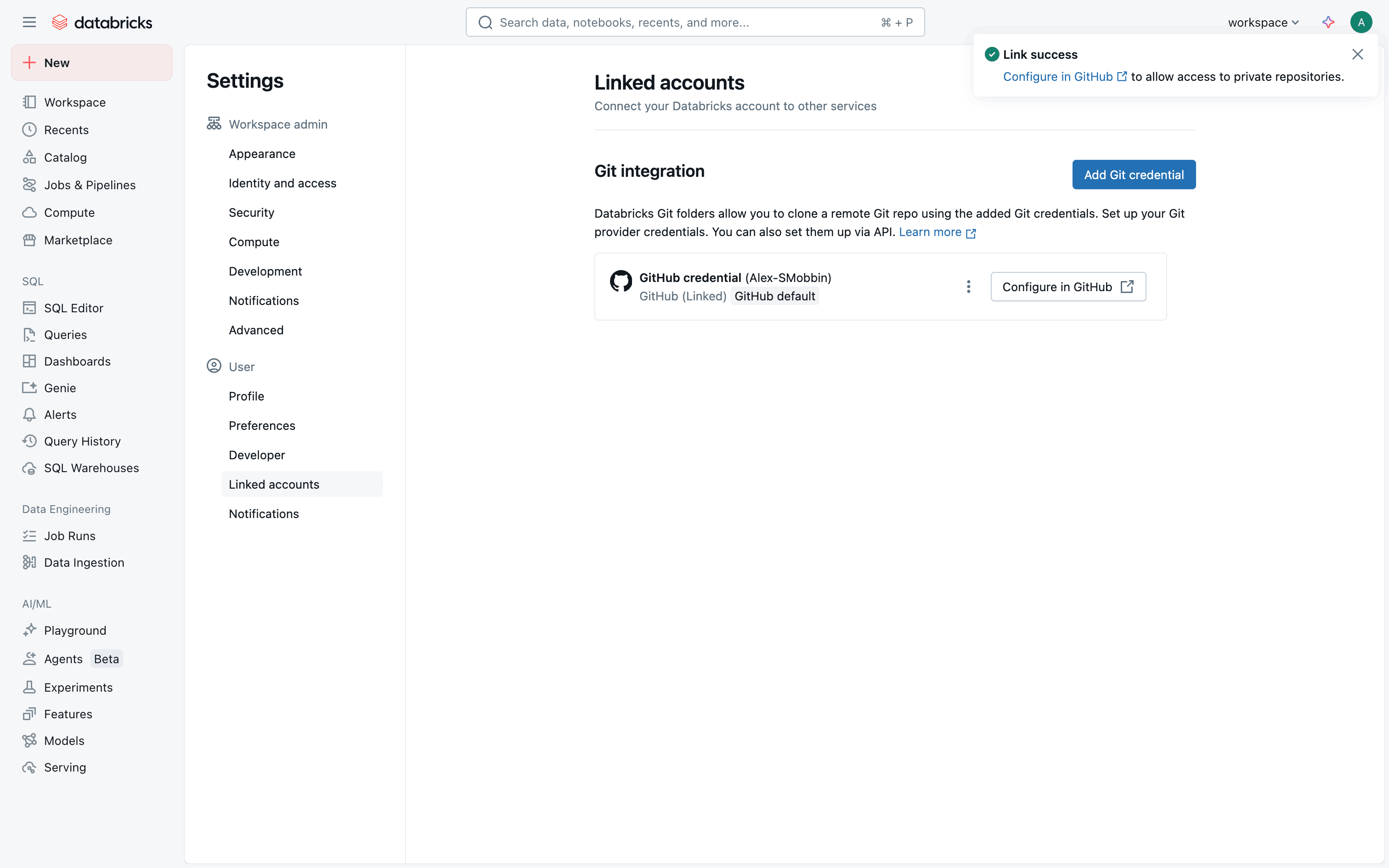 The user links their GitHub account by navigating to settings, adding Git credentials, and configuring the connection. A success message confirms the successful link.