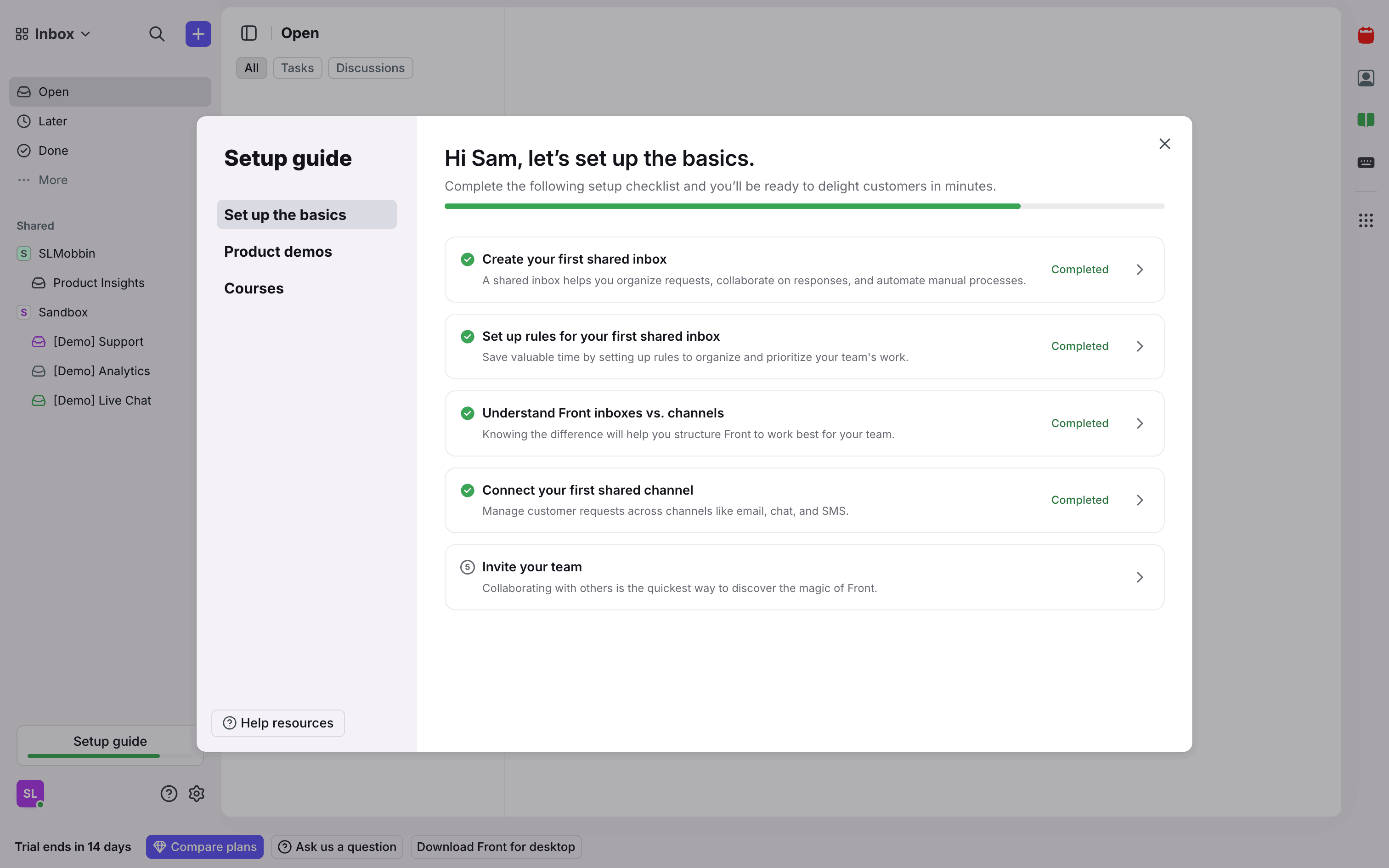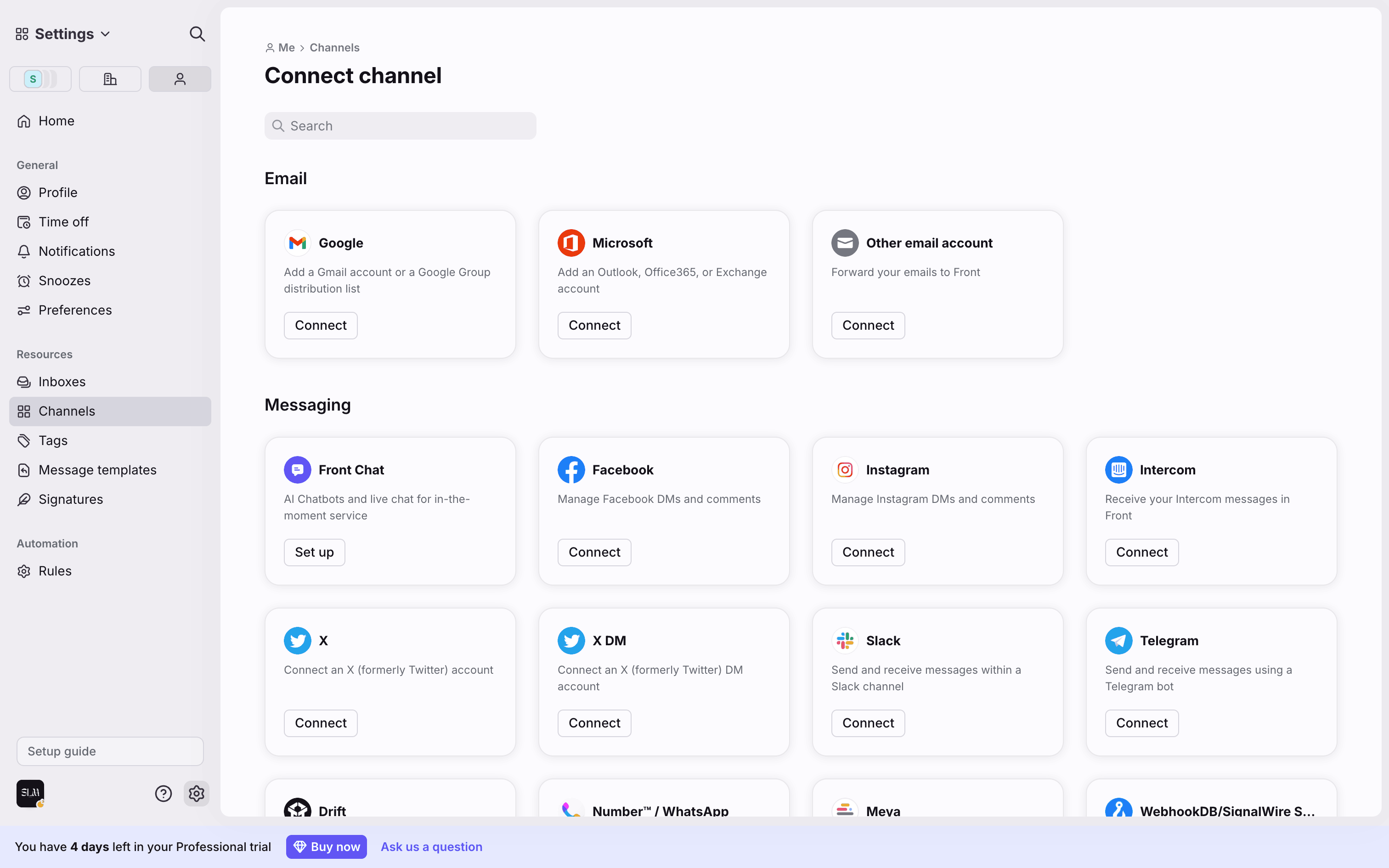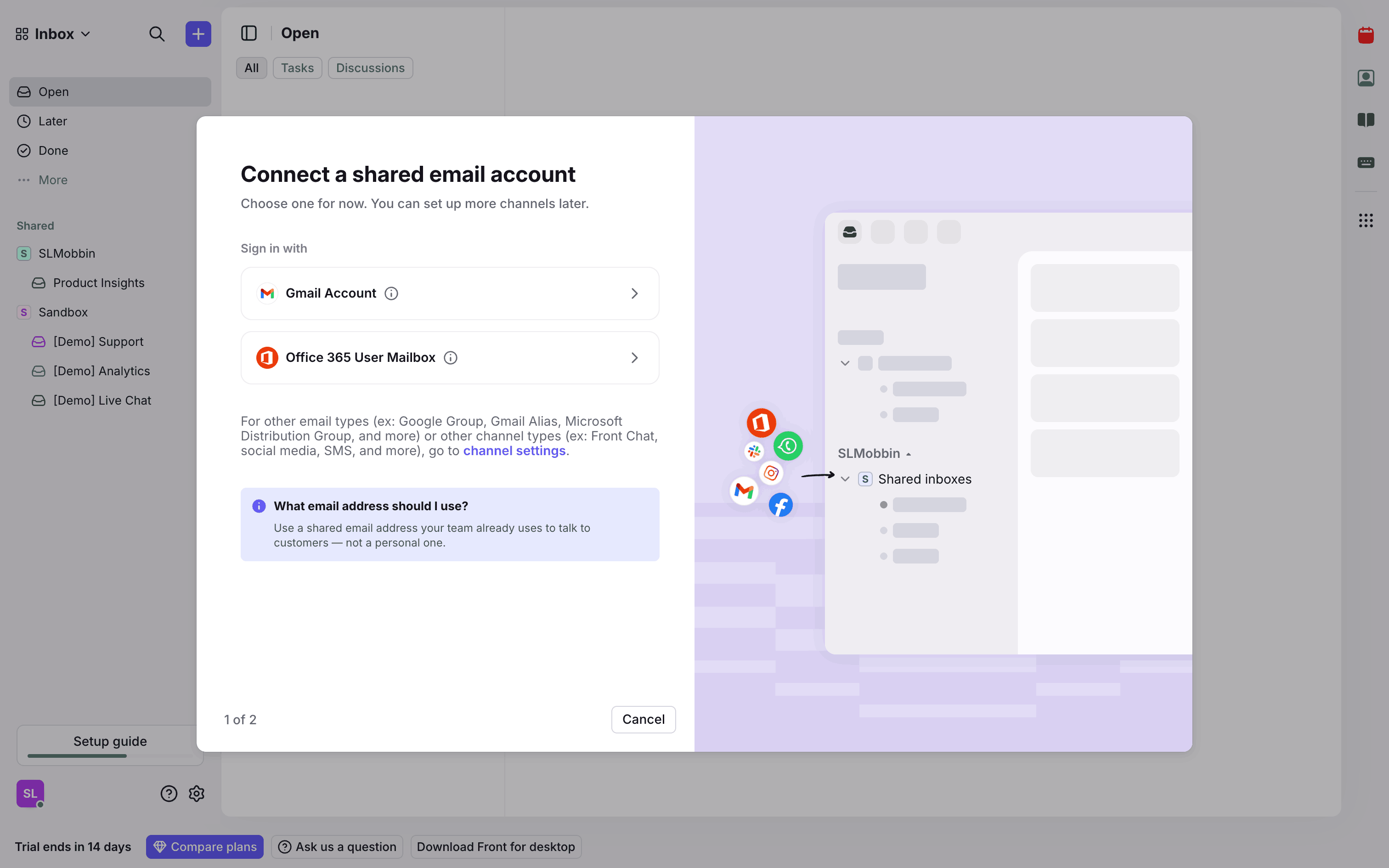 The user flow demonstrates connecting a shared email channel. It guides the user from the setup guide to the connected channel in settings.
