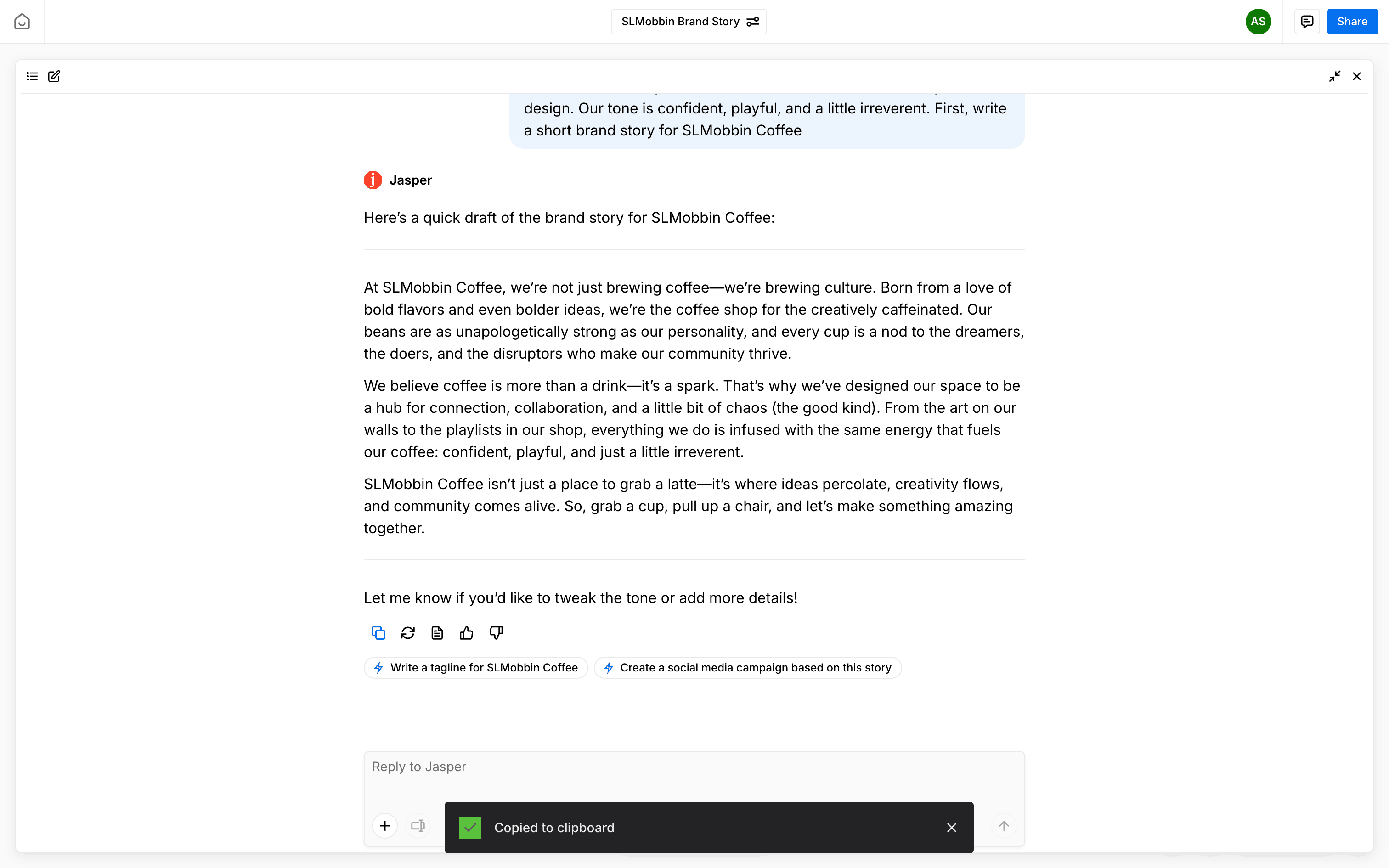 The user views a chat message containing a brand story and copies it to the clipboard. A confirmation message then appears.