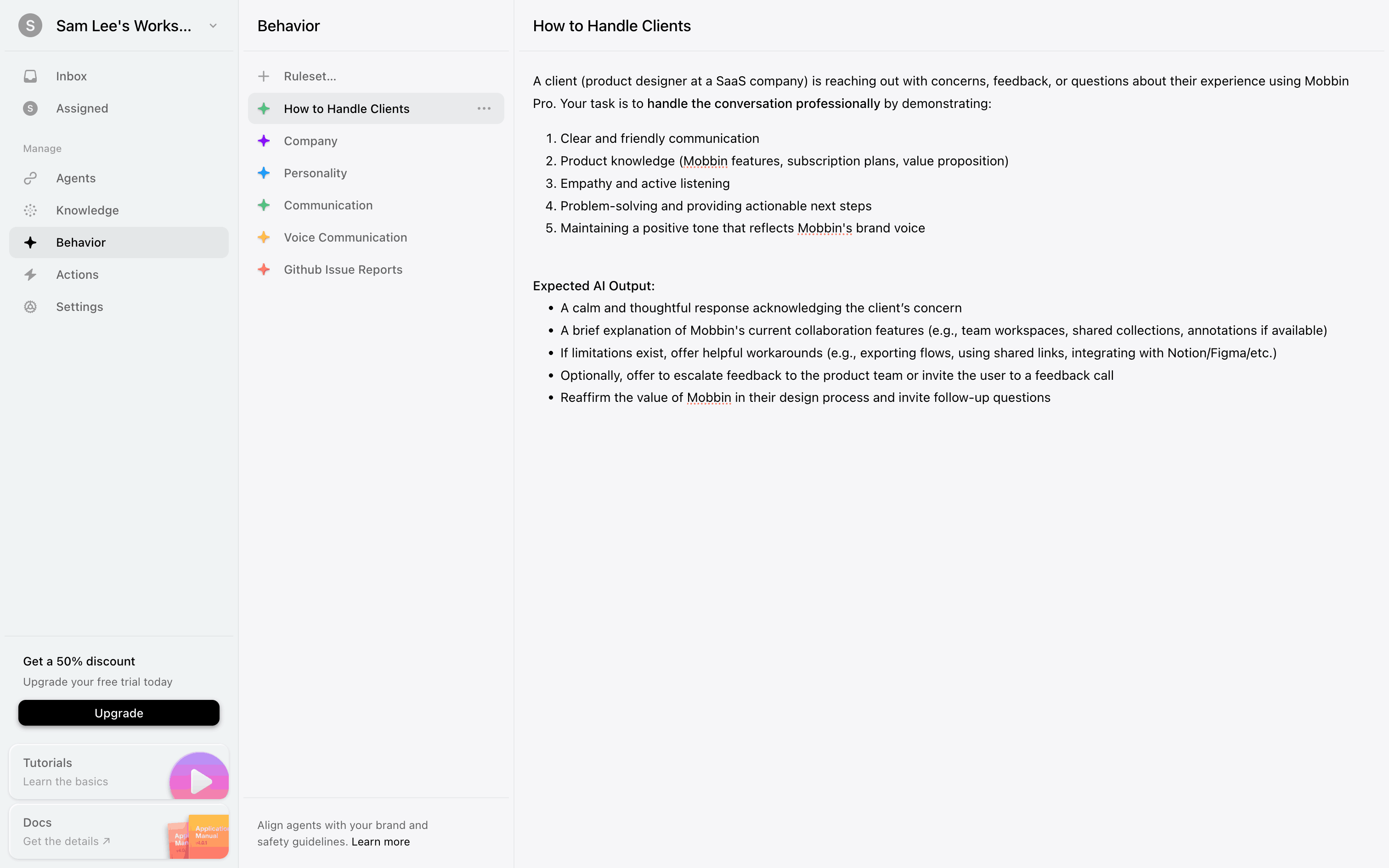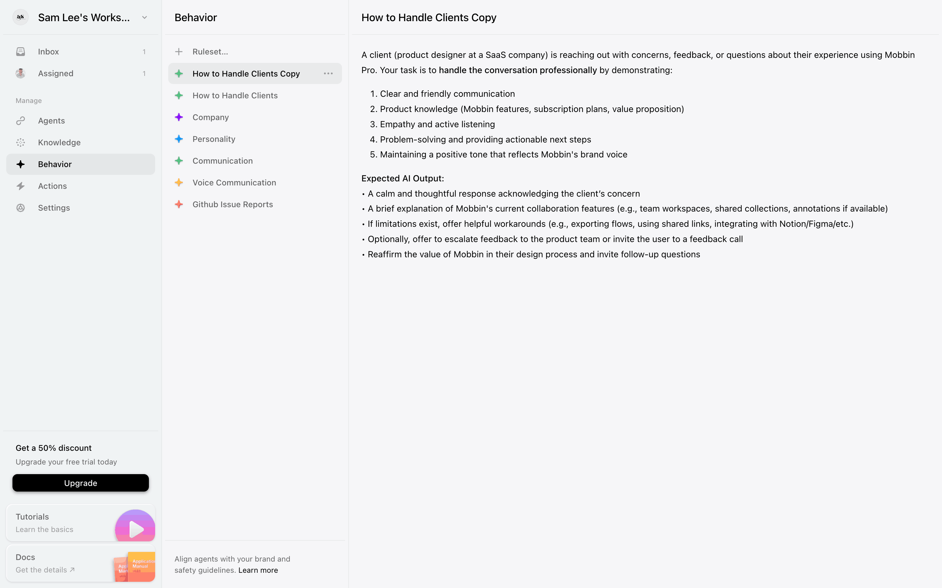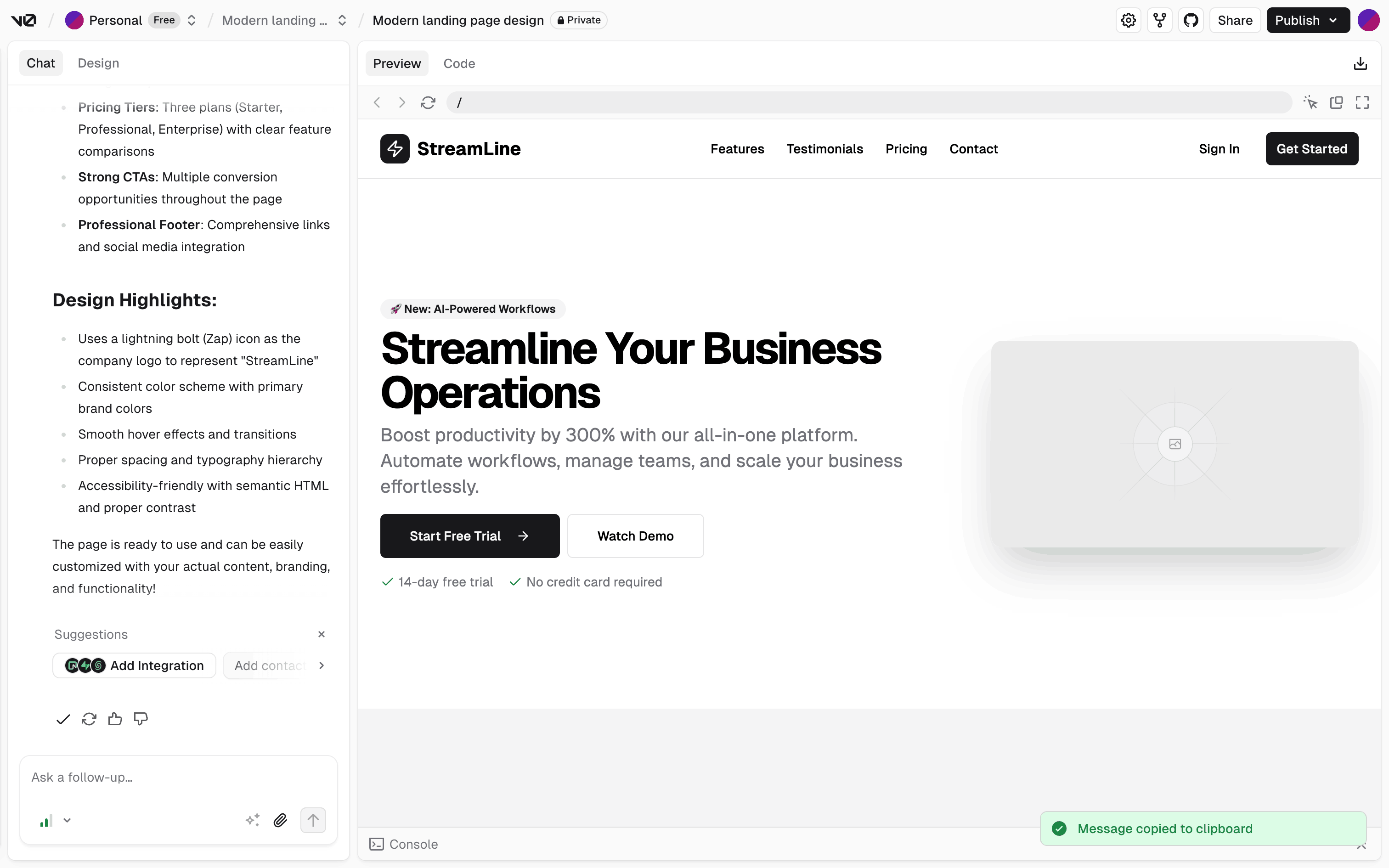 The user reviews a conversation in a web application's chat interface and copies a message. A confirmation message then appears.