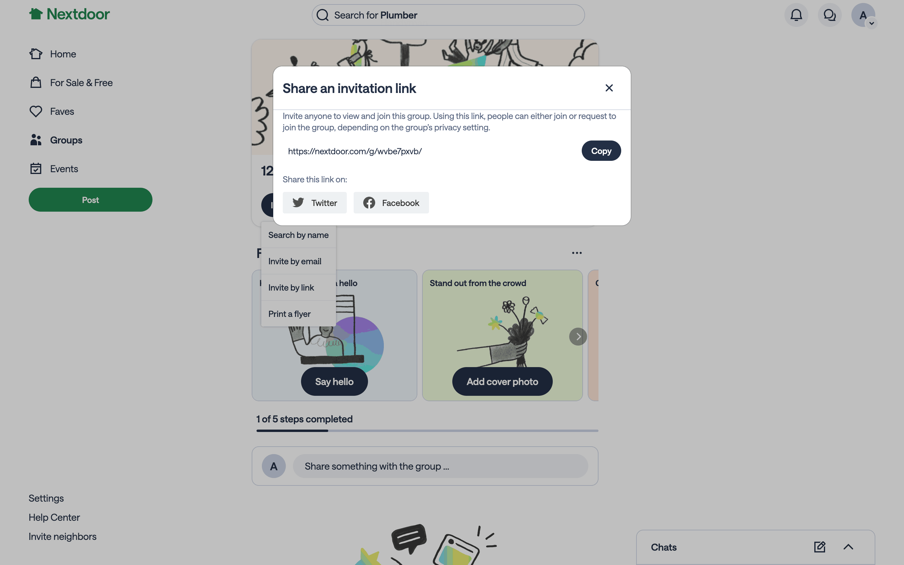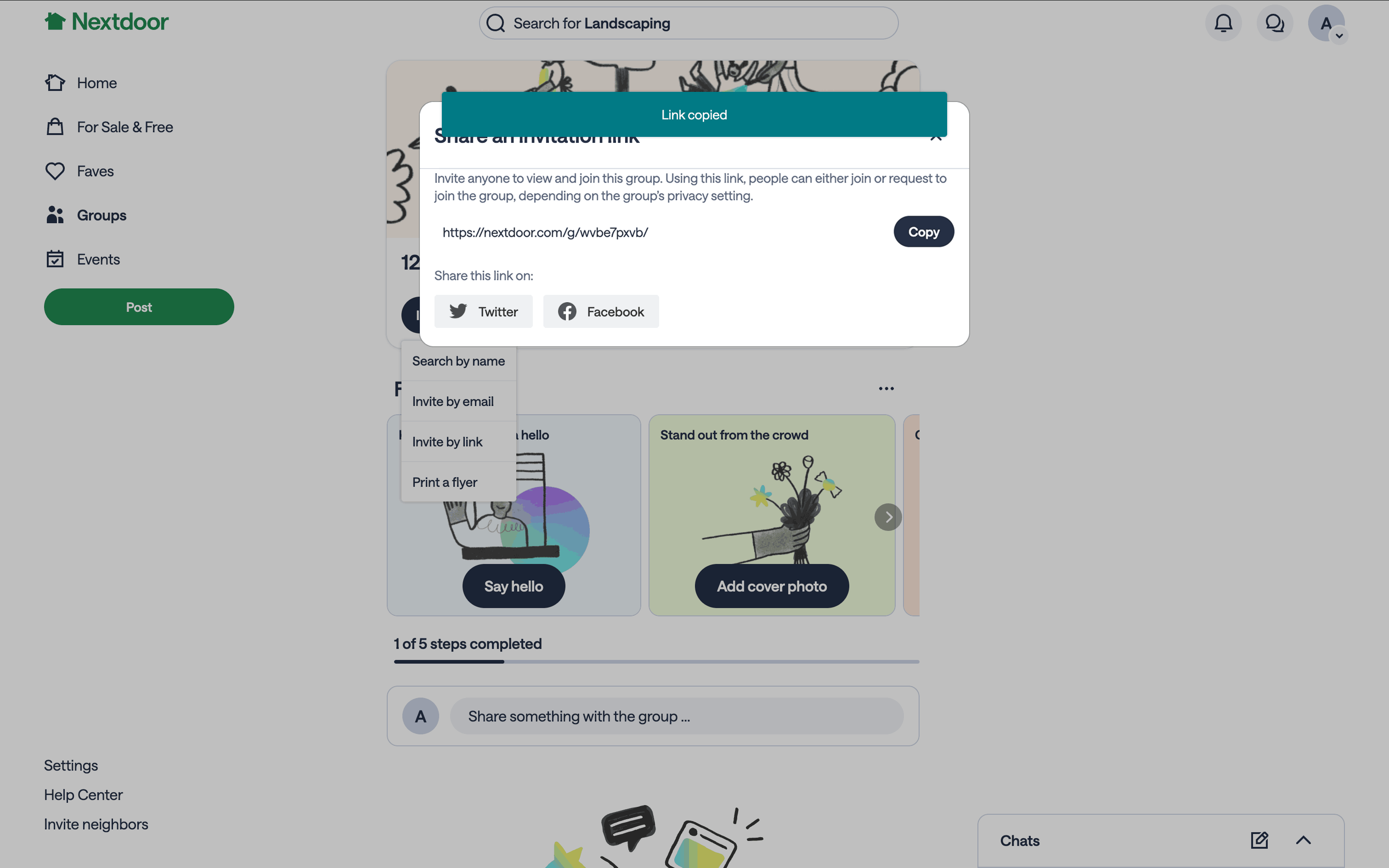 The user navigates to a group page and copies the invitation link. The link can then be shared with others to invite them to the group.