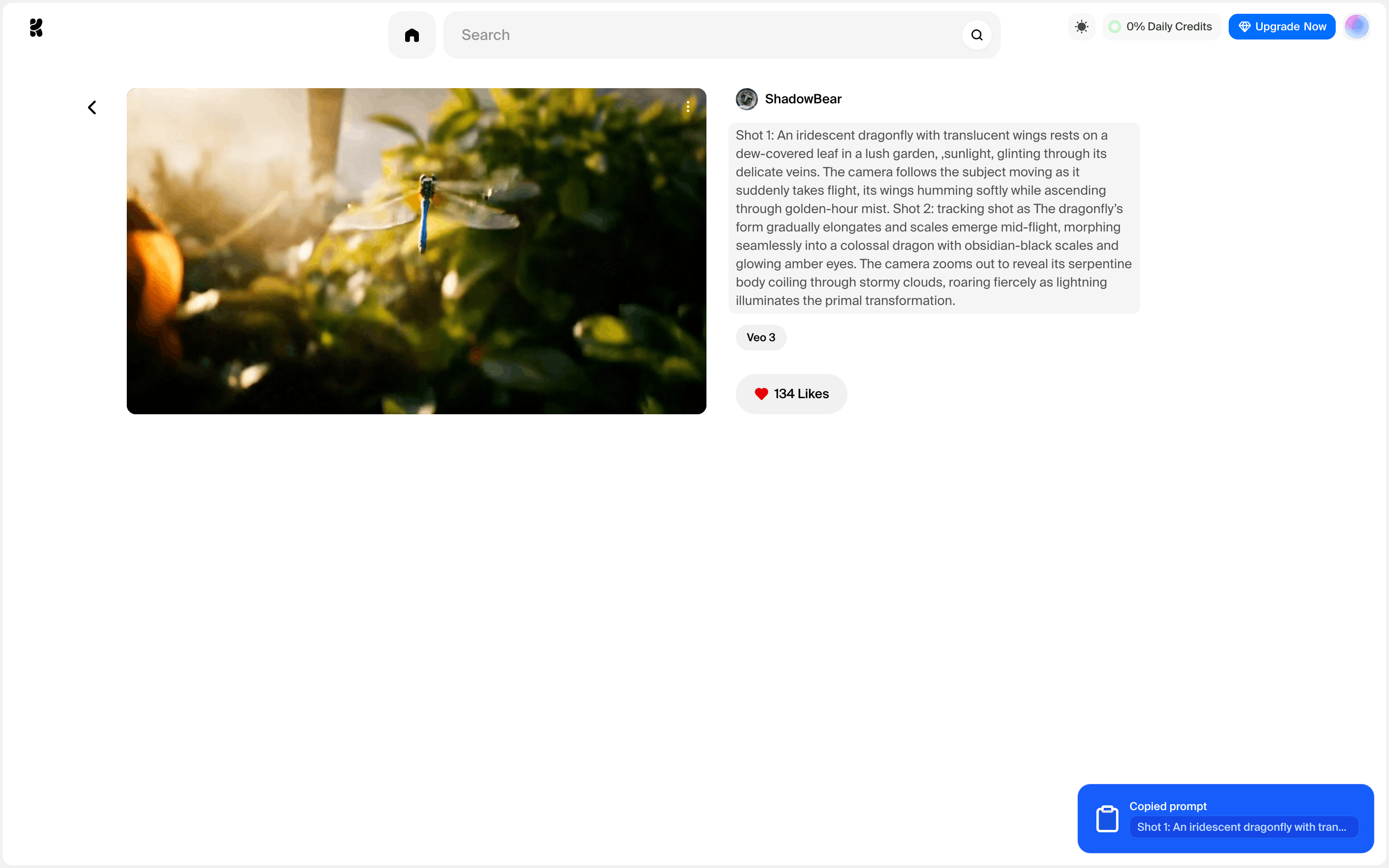 The user browses the gallery, views an image detail, and copies the prompt. The flow concludes with a confirmation message.