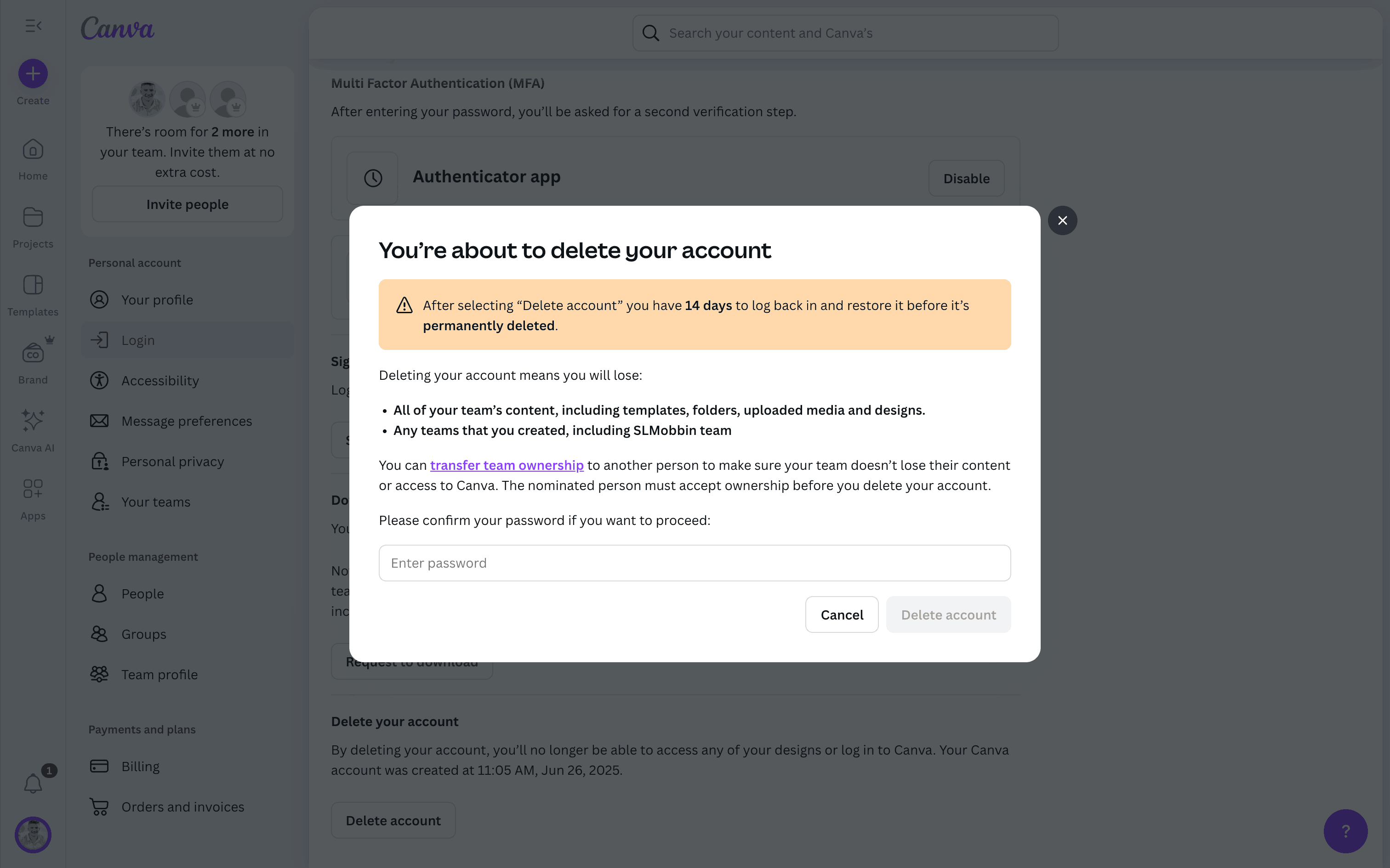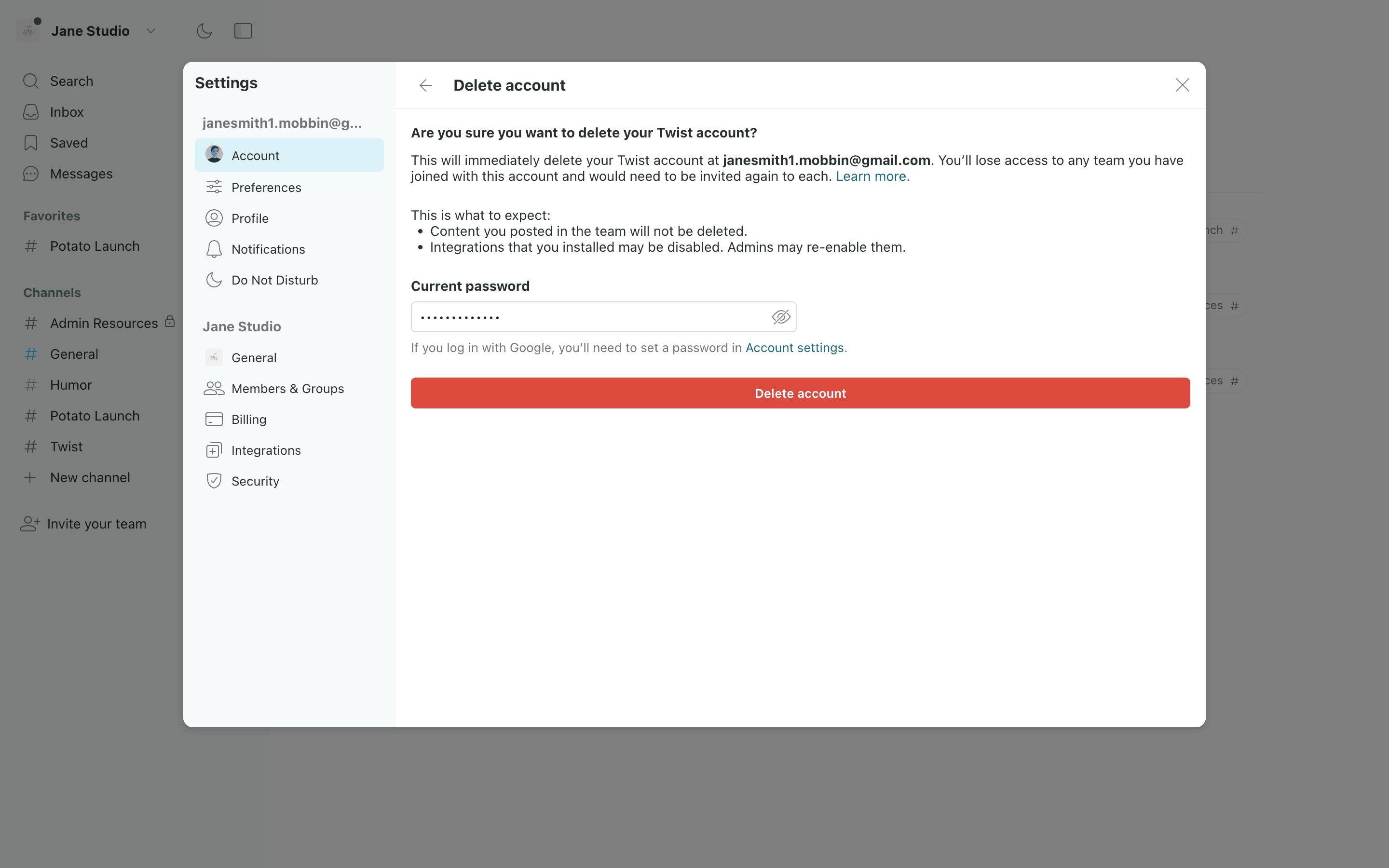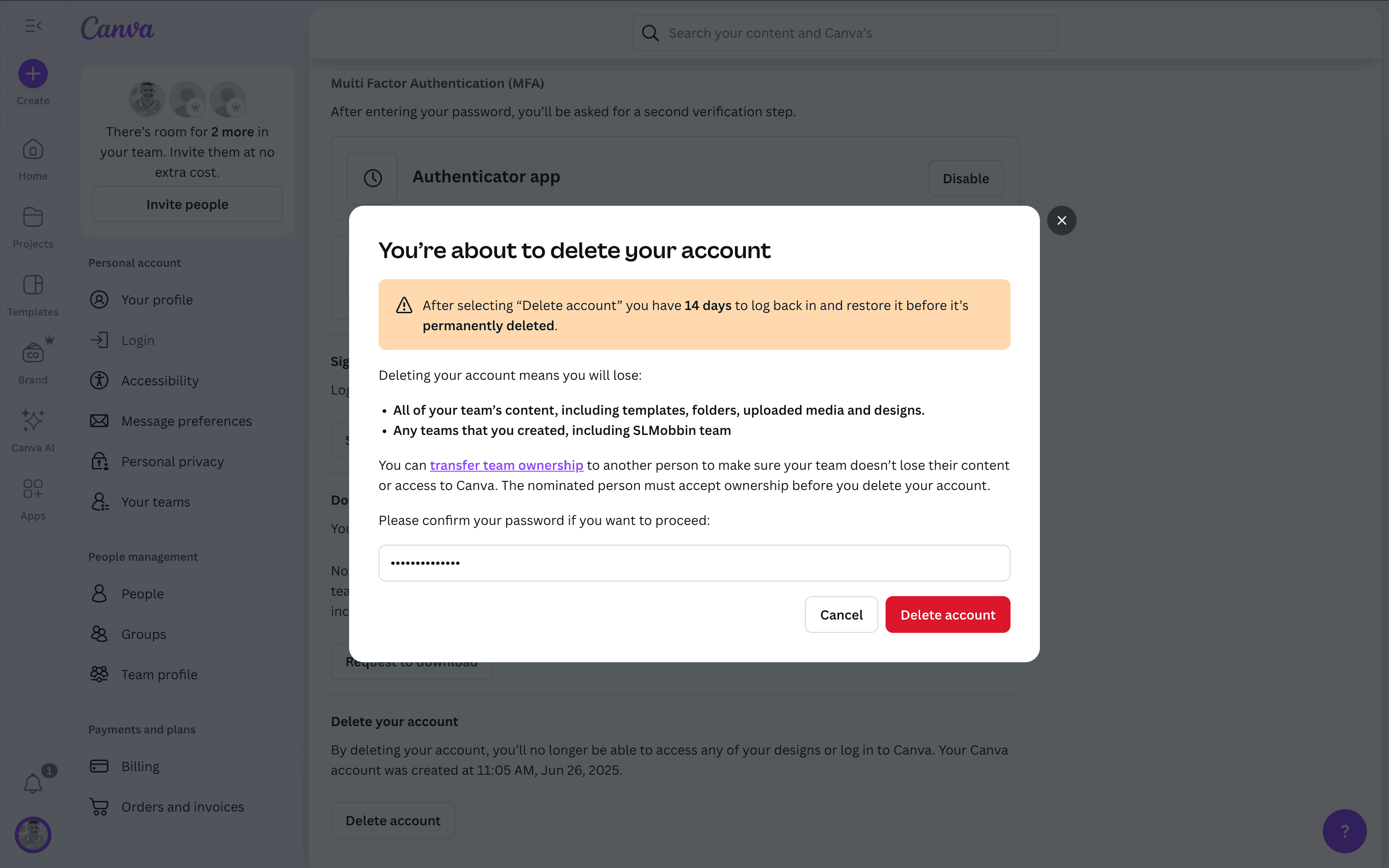 The user navigates through account settings to delete their account. They confirm by entering their password and see a confirmation message.