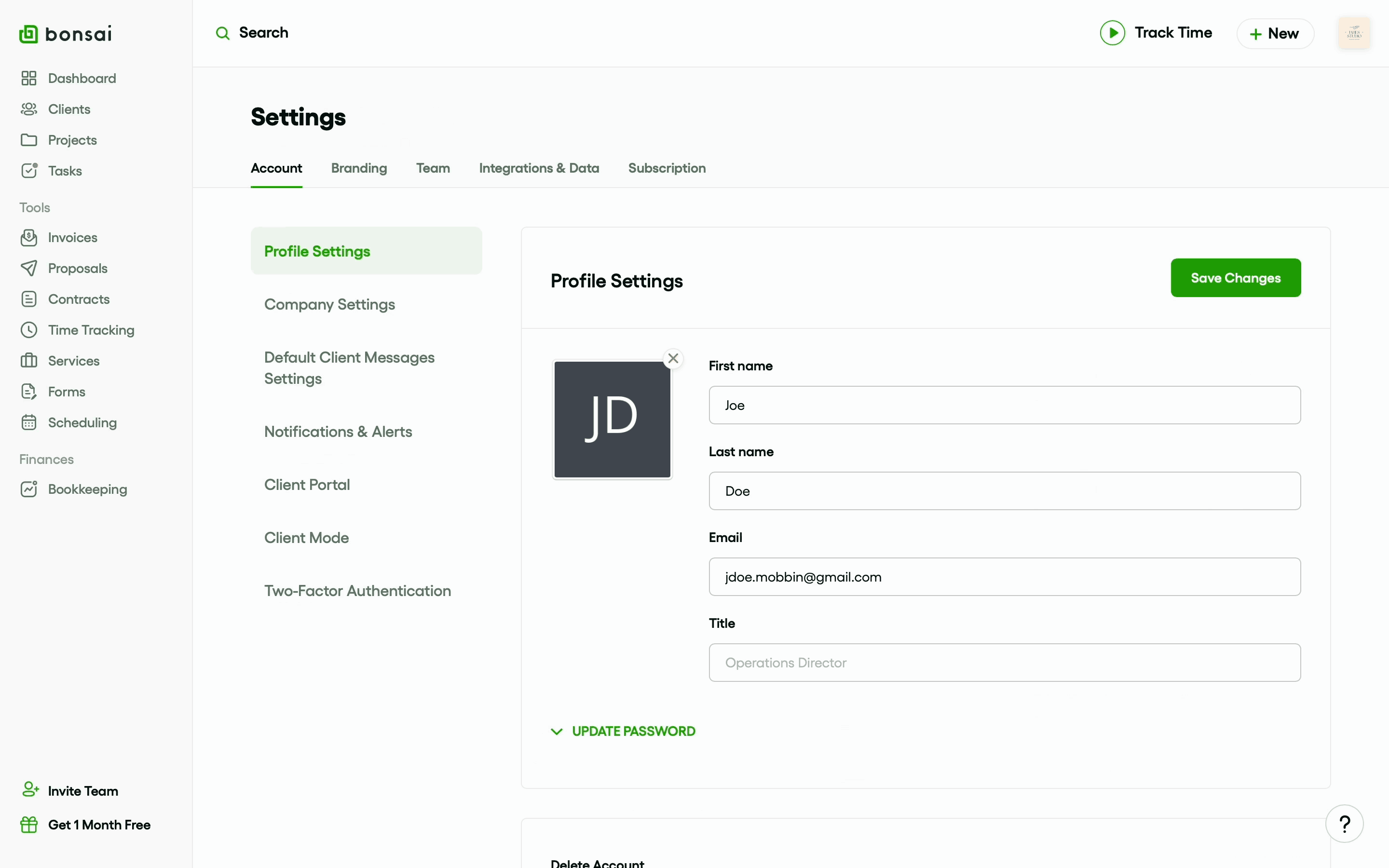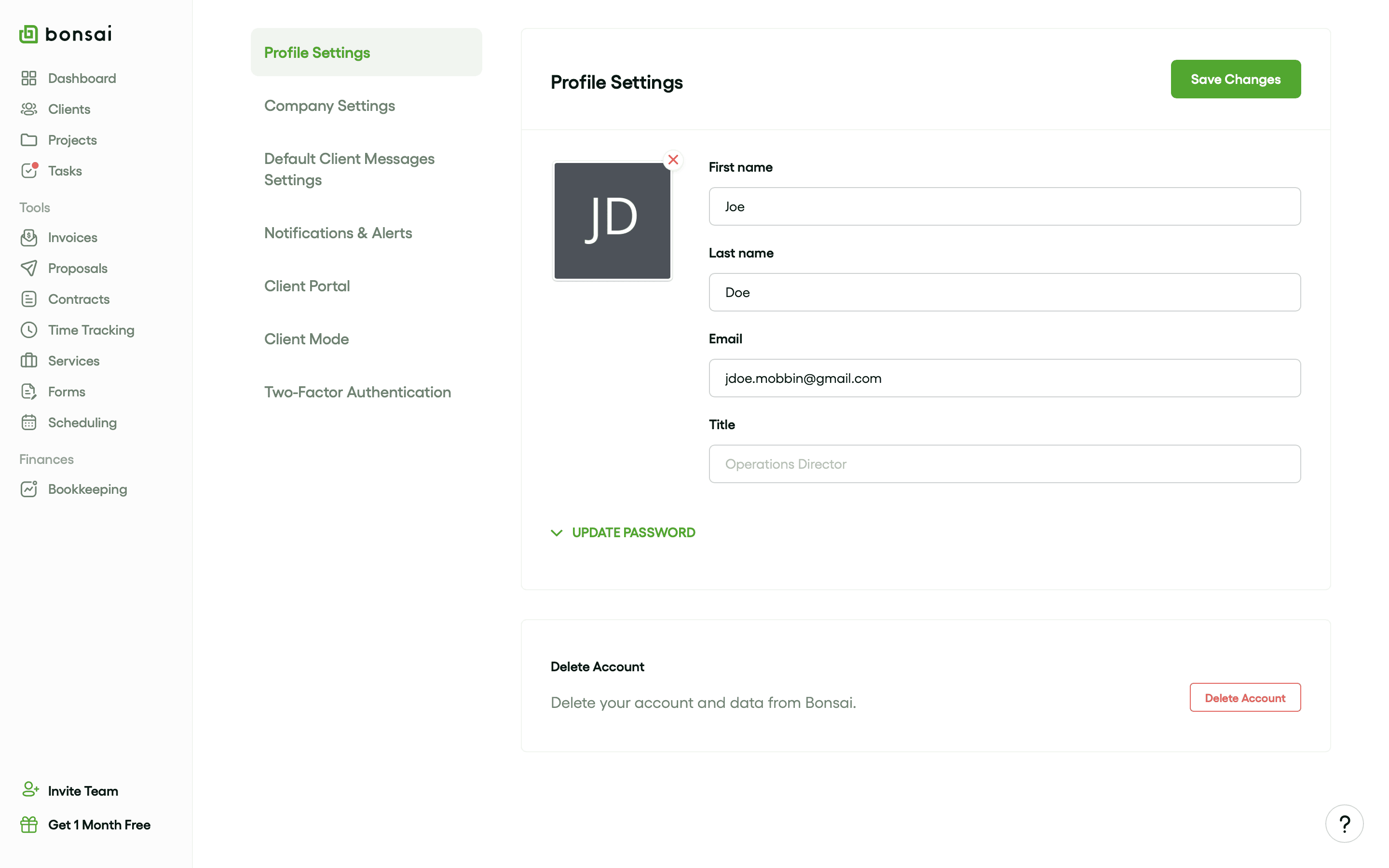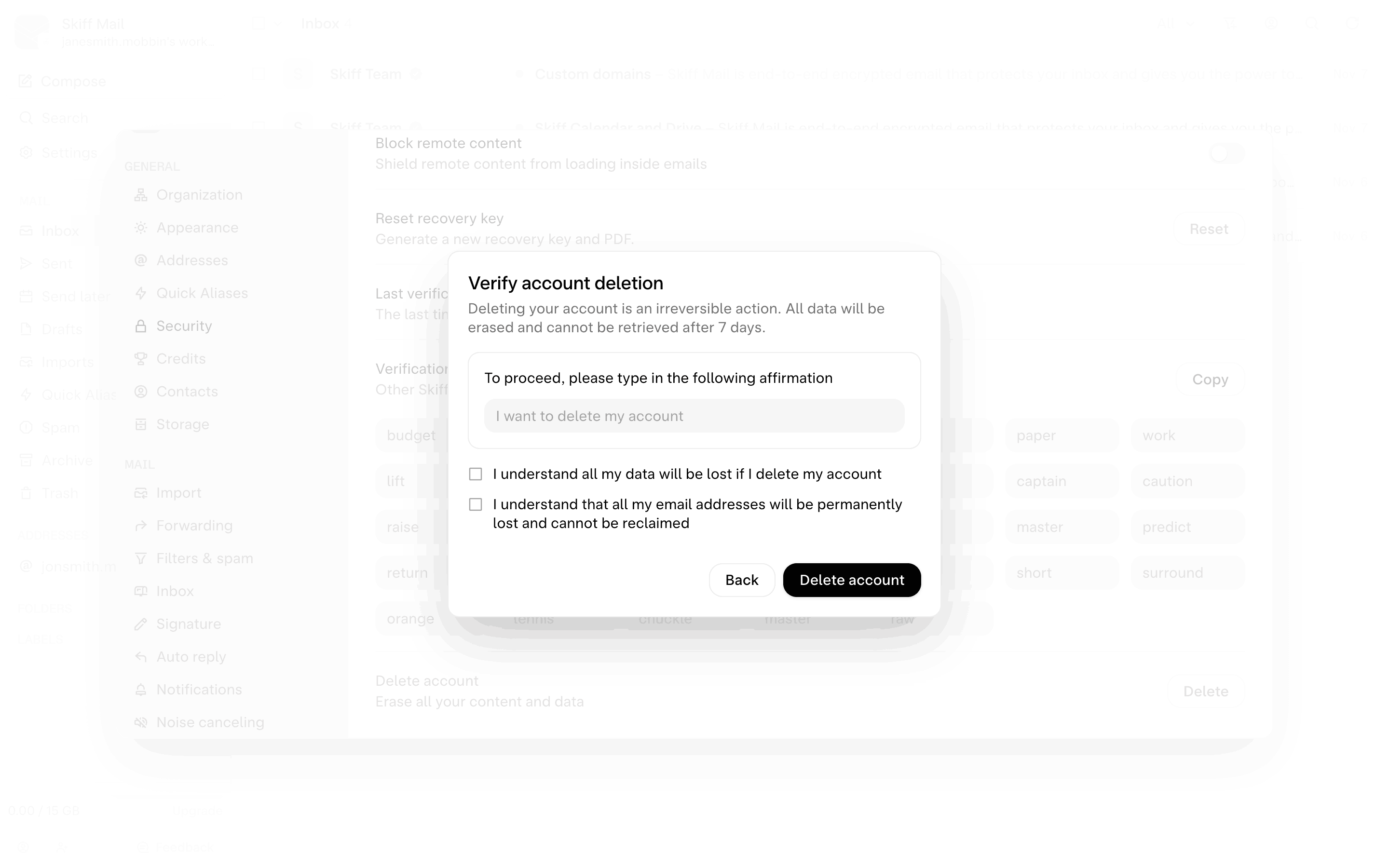 The user navigates through account settings to delete their account. They confirm by entering their password and see a confirmation message.