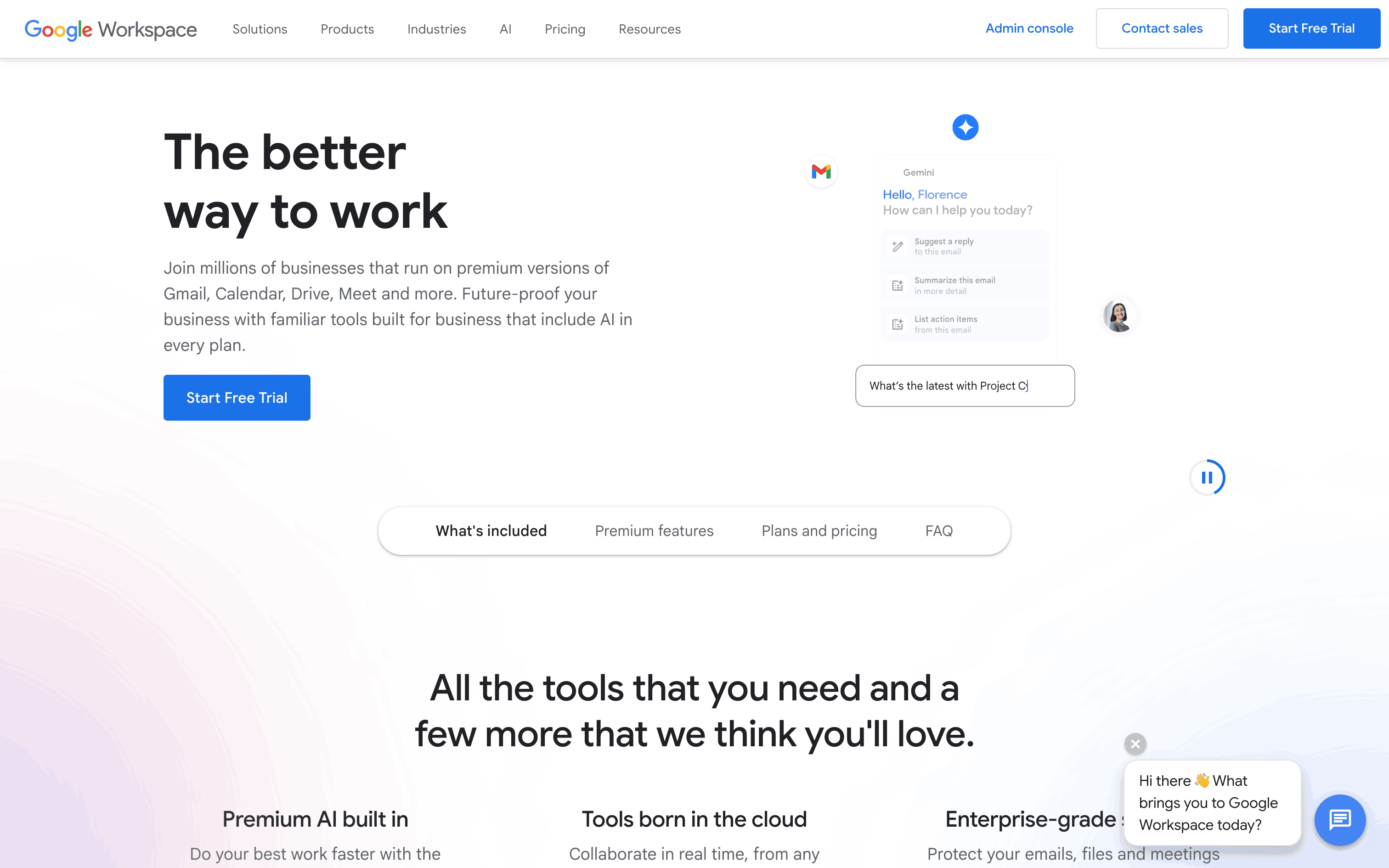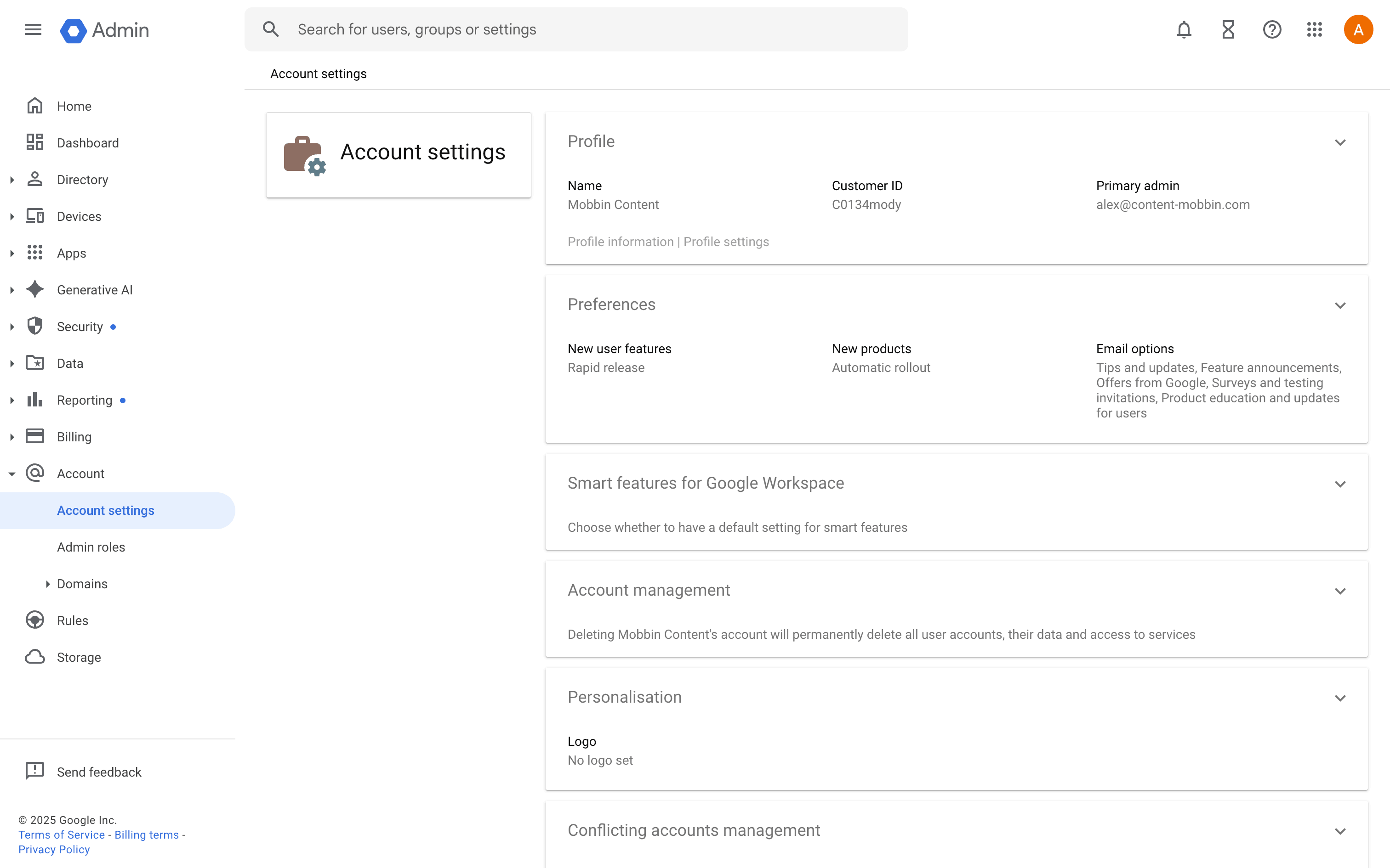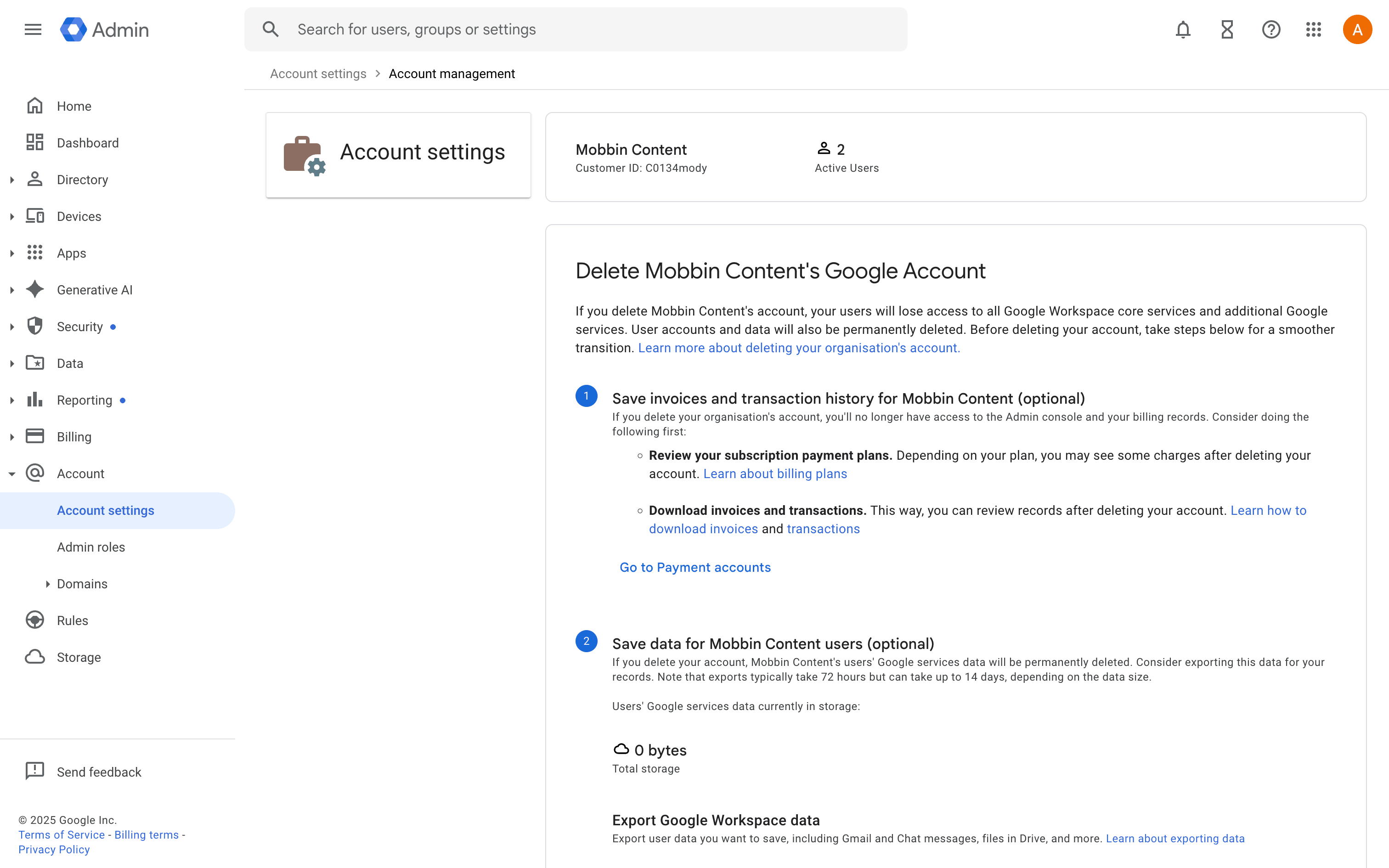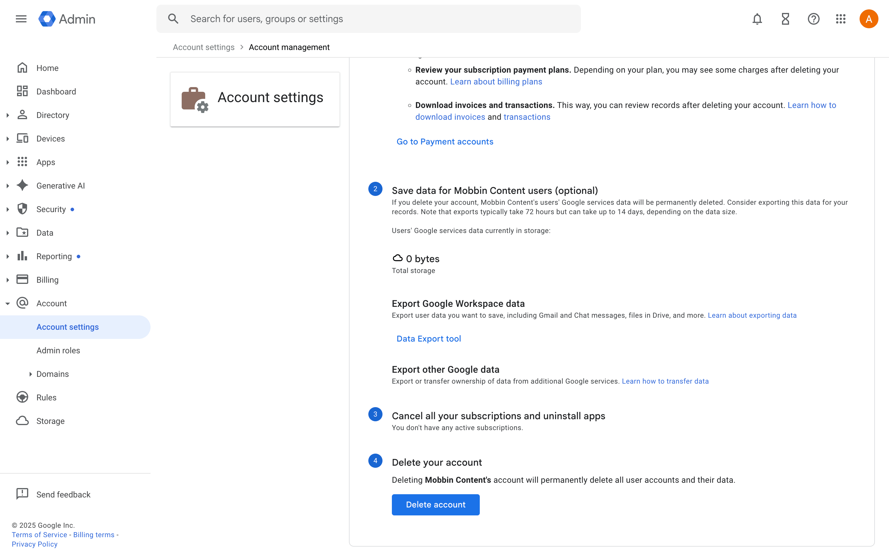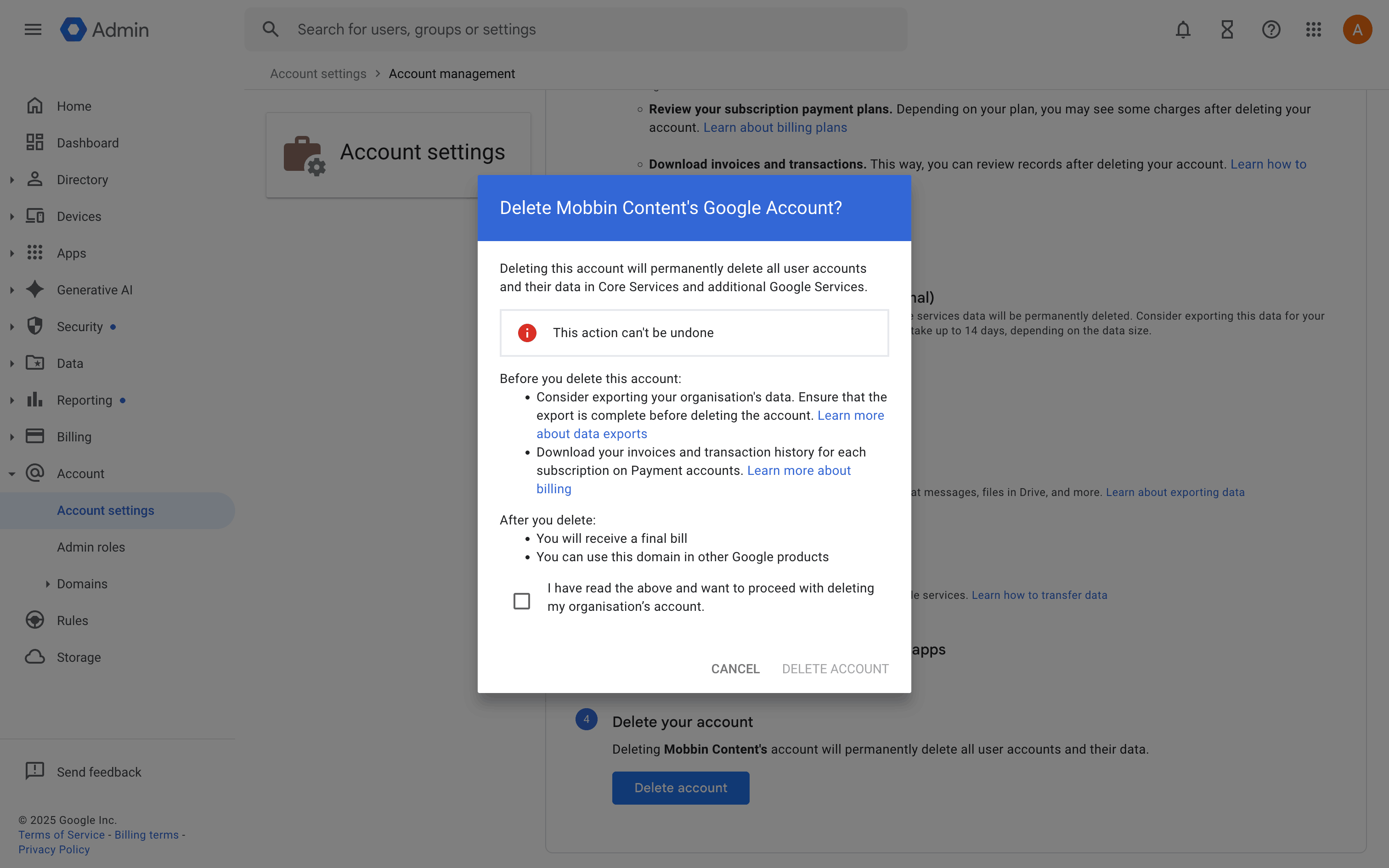 The user navigates through account settings to delete their account, confirming through a dialog. After confirmation, they are redirected to the Google Workspace homepage.