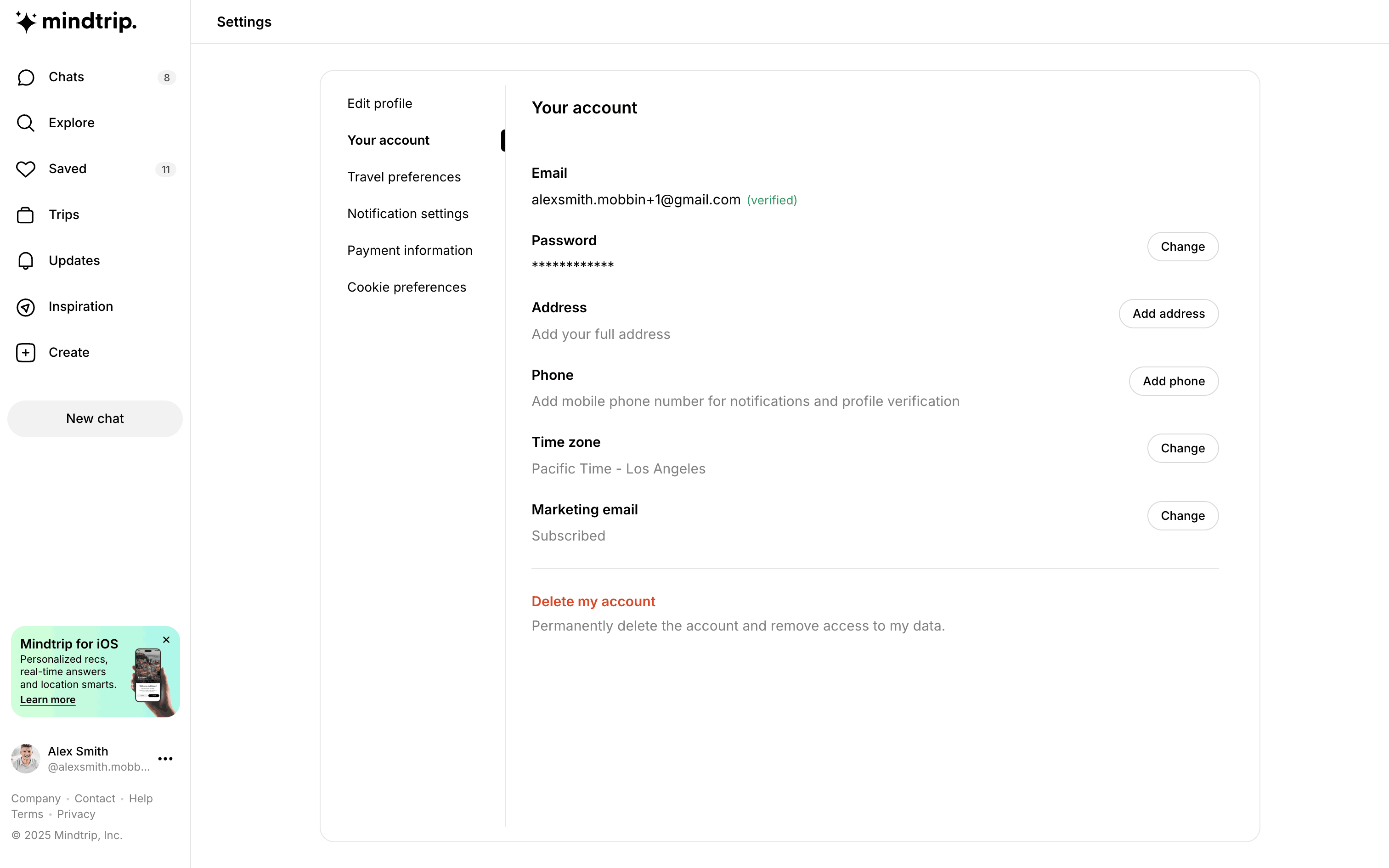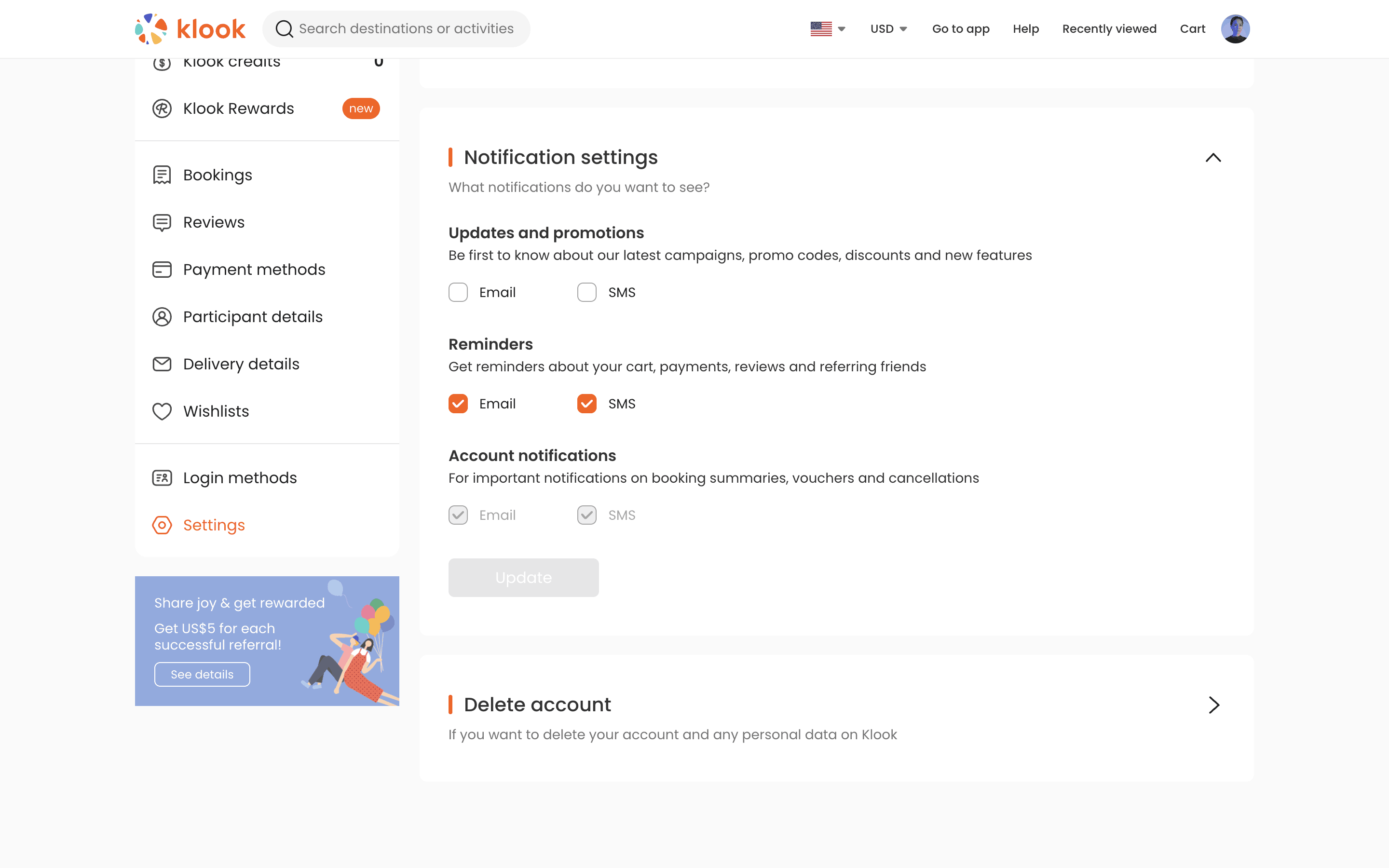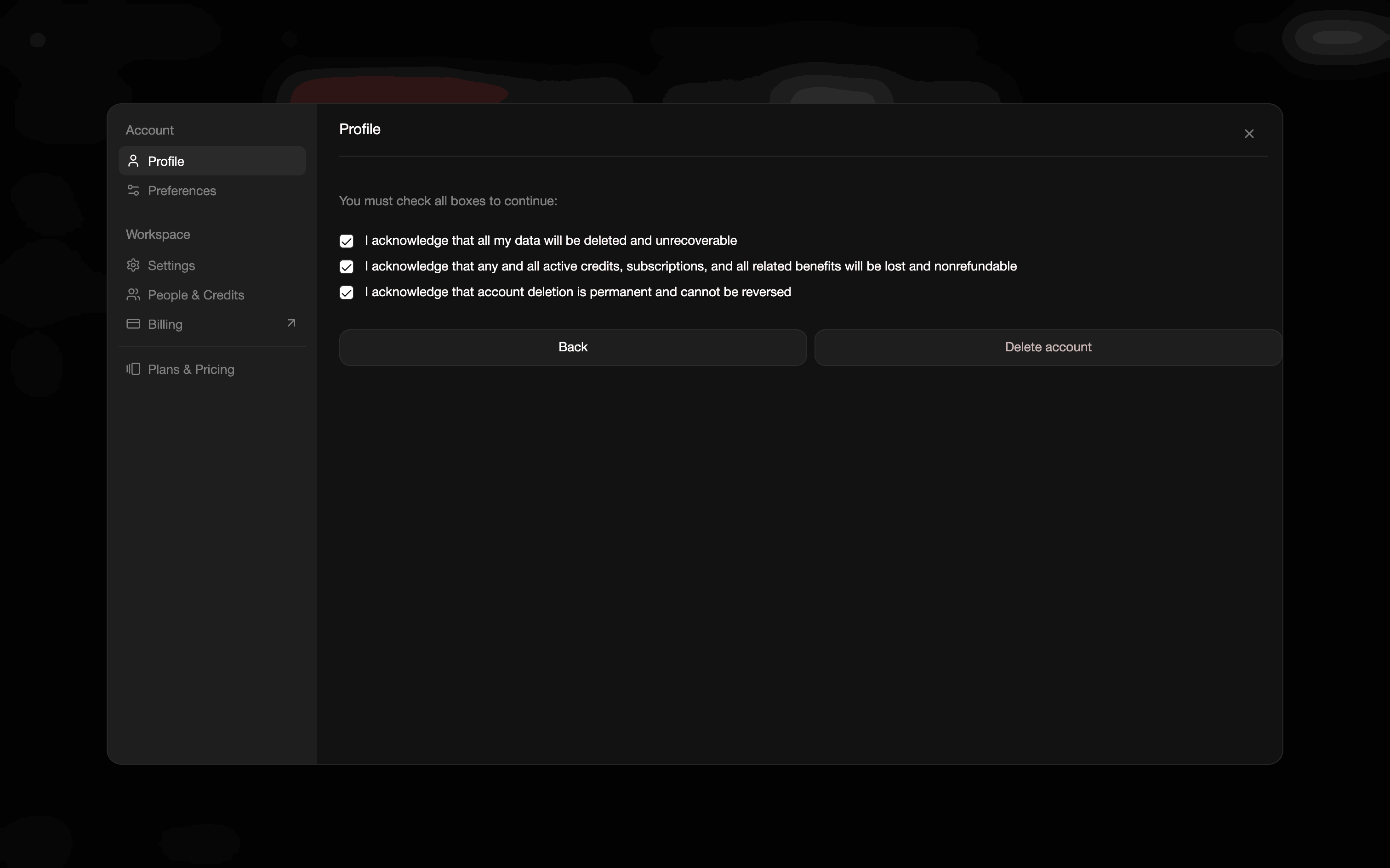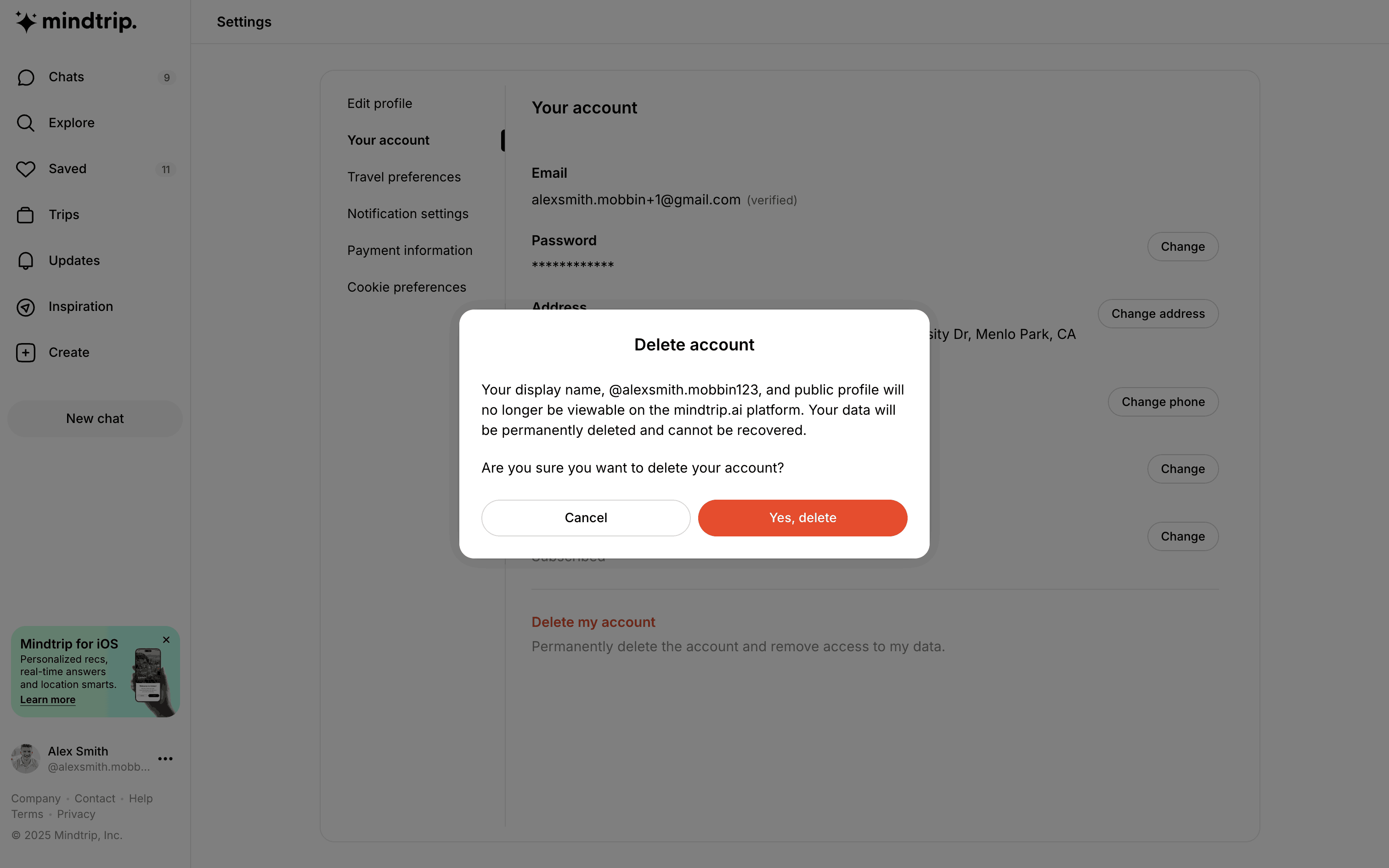 The user navigates to account settings and initiates account deletion. After confirming, they are redirected to the homepage.