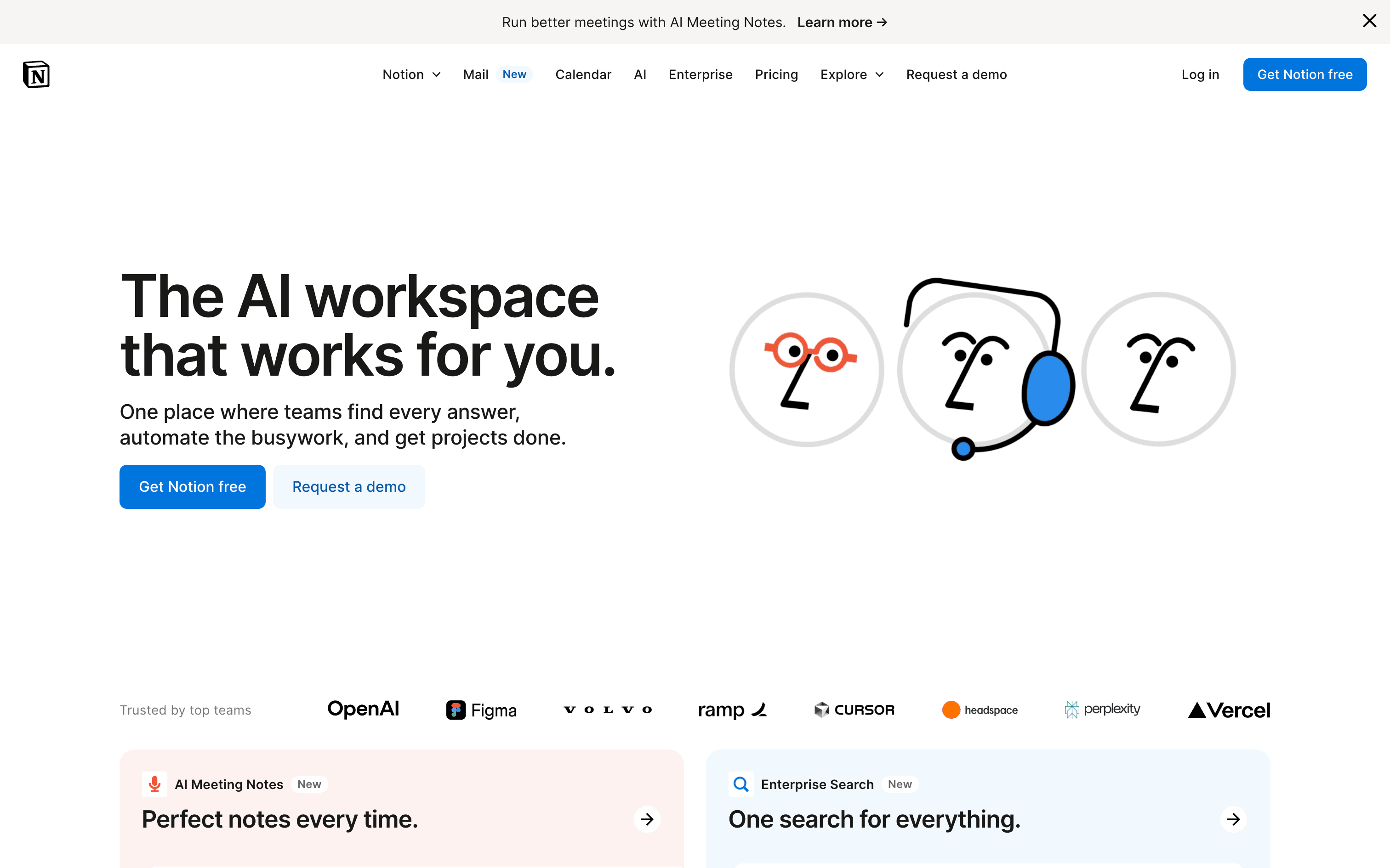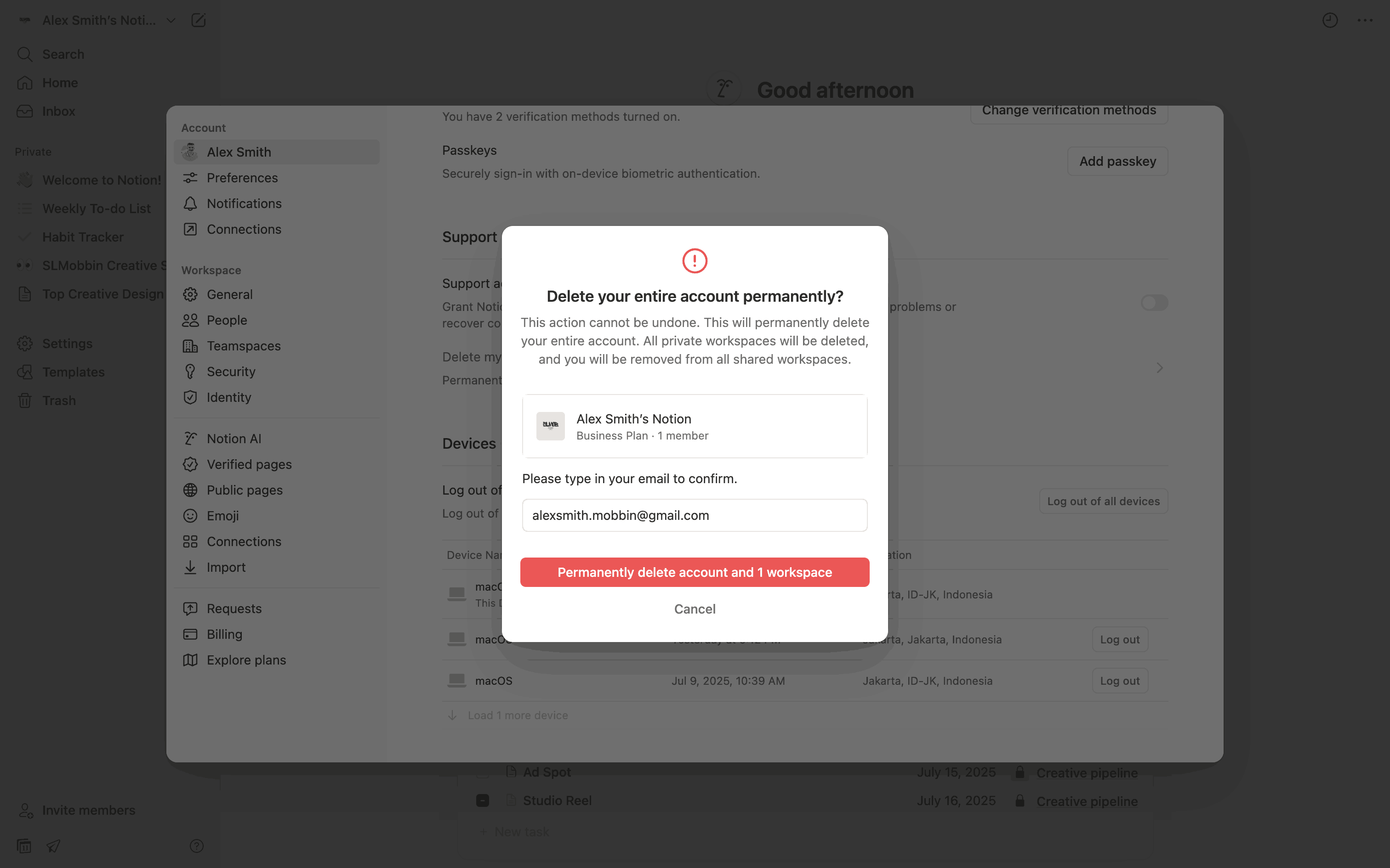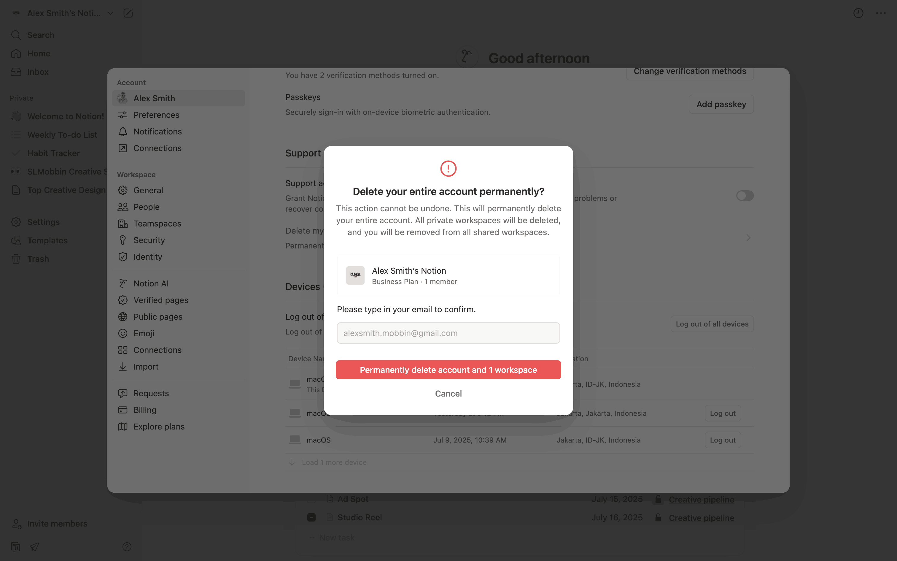 The user navigates to account settings, confirms account deletion, and is redirected to the Notion homepage. The flow showcases account deletion.