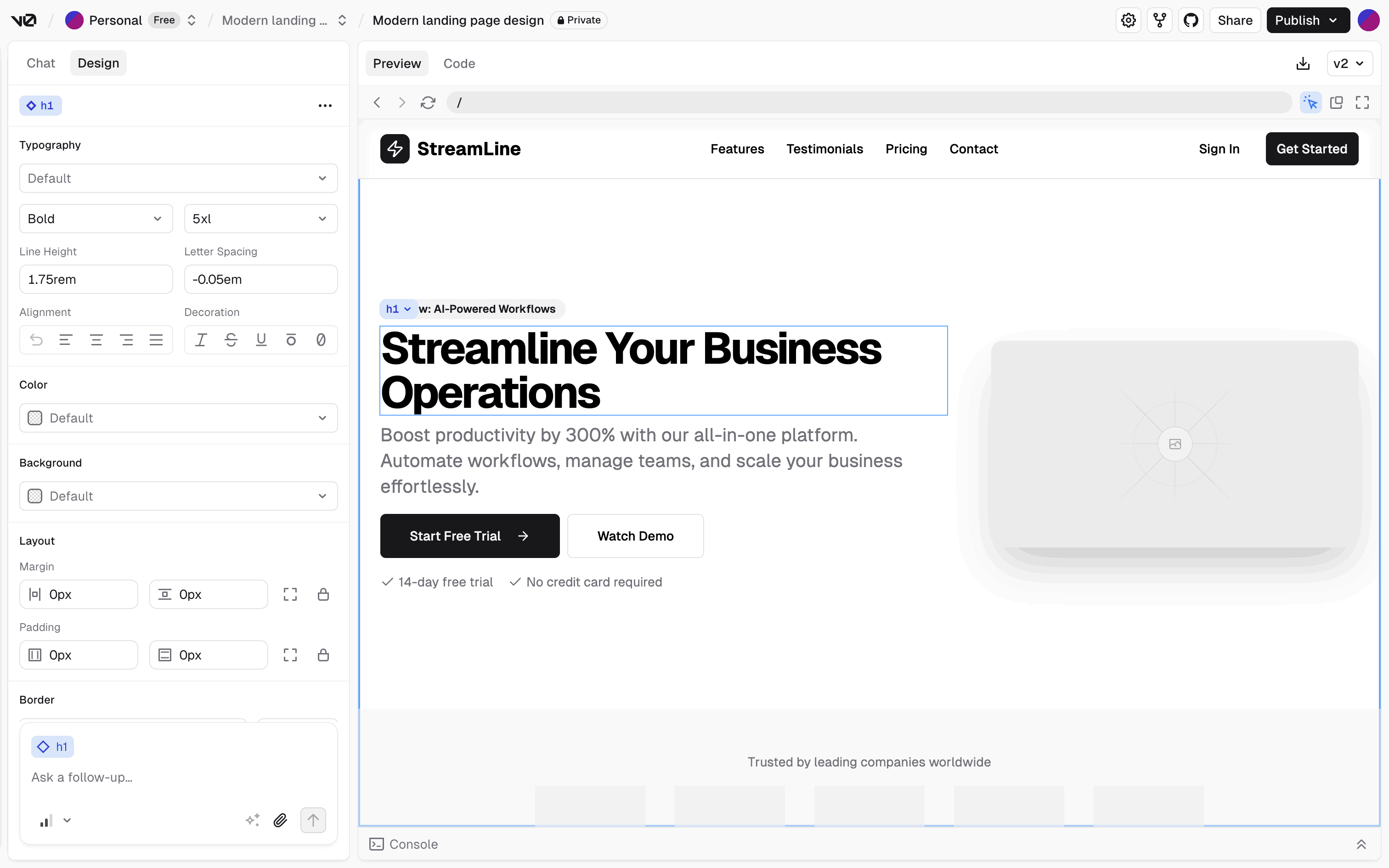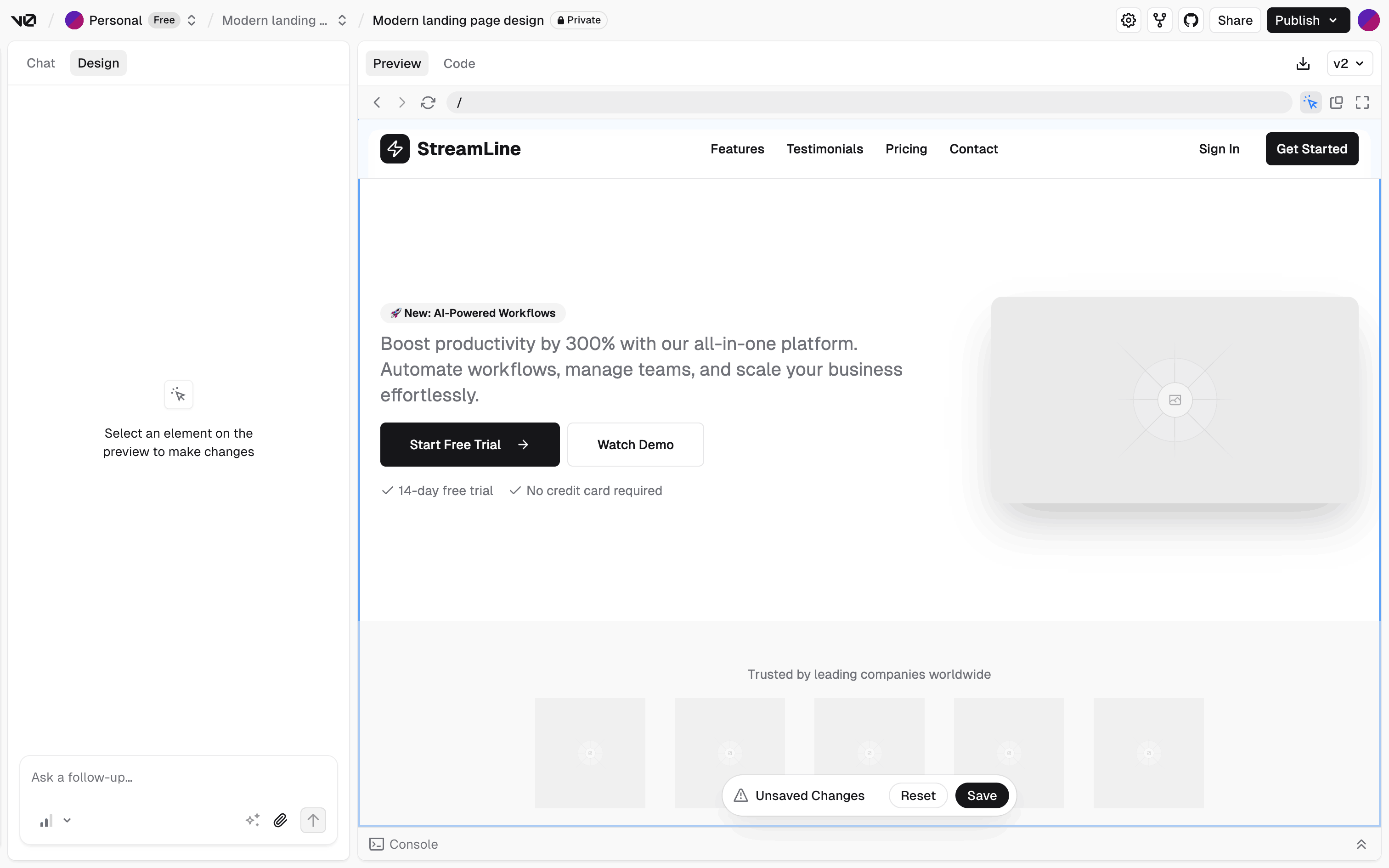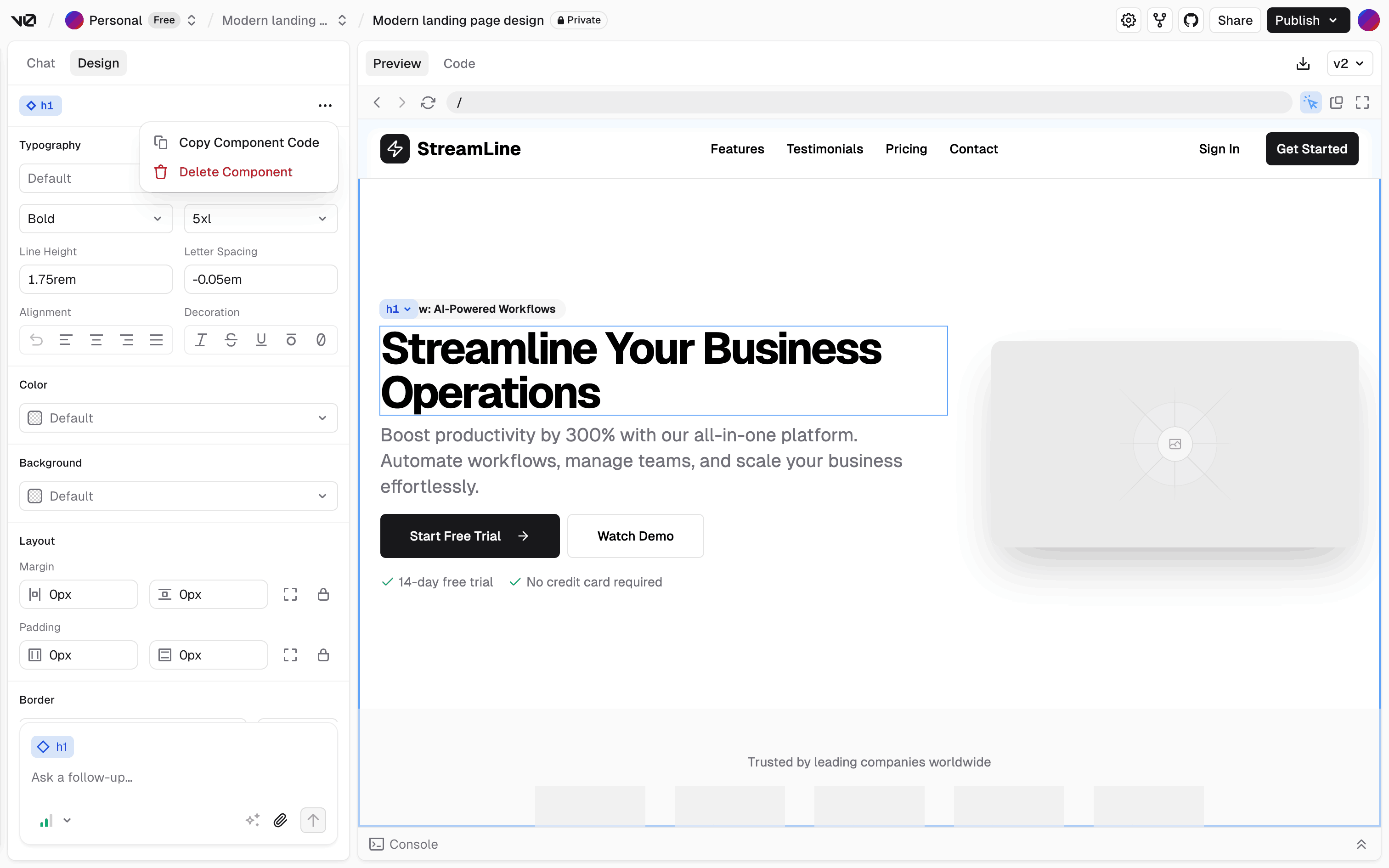 The user selects a component and then deletes it from the landing page design using a context menu. The component is then removed.