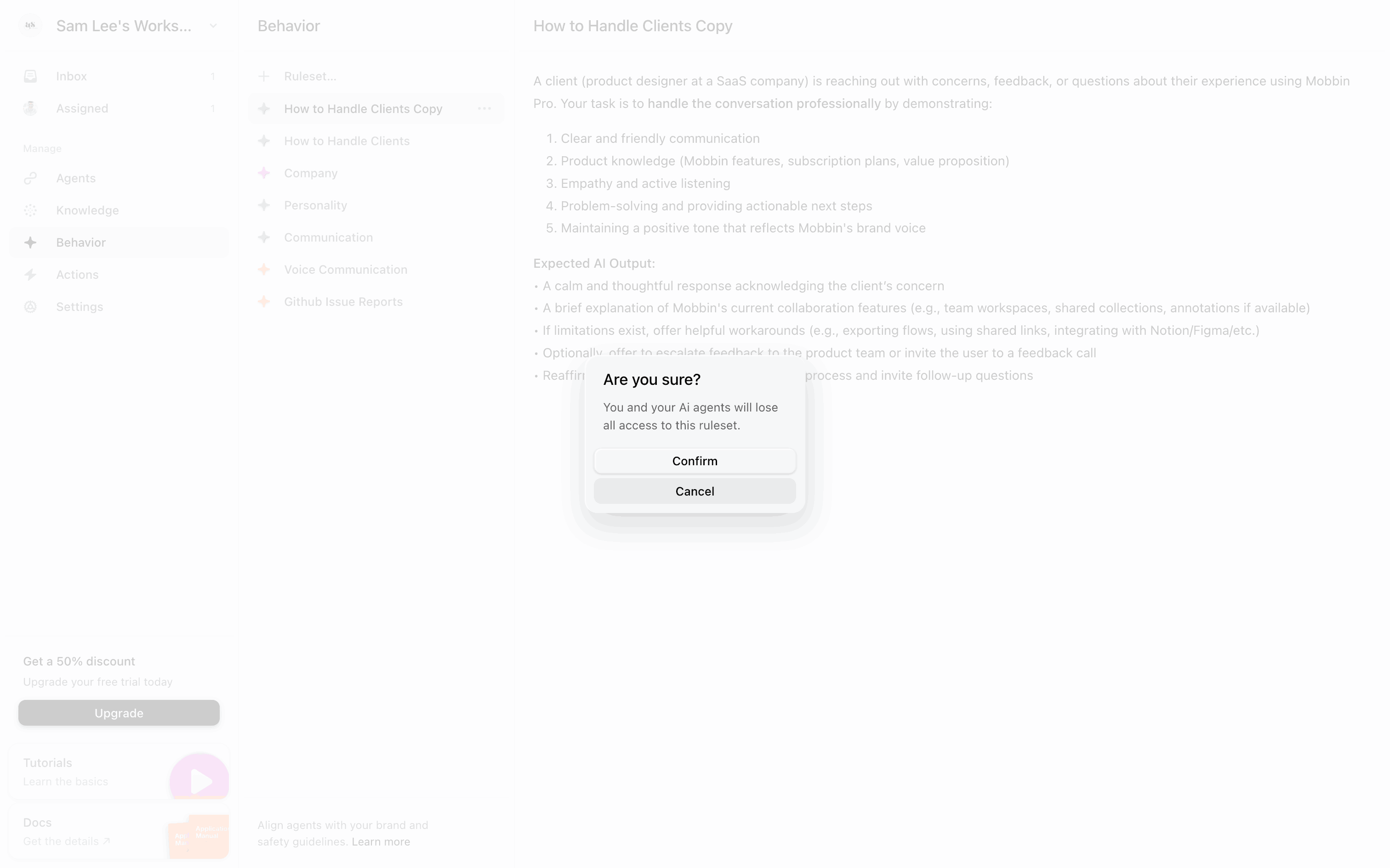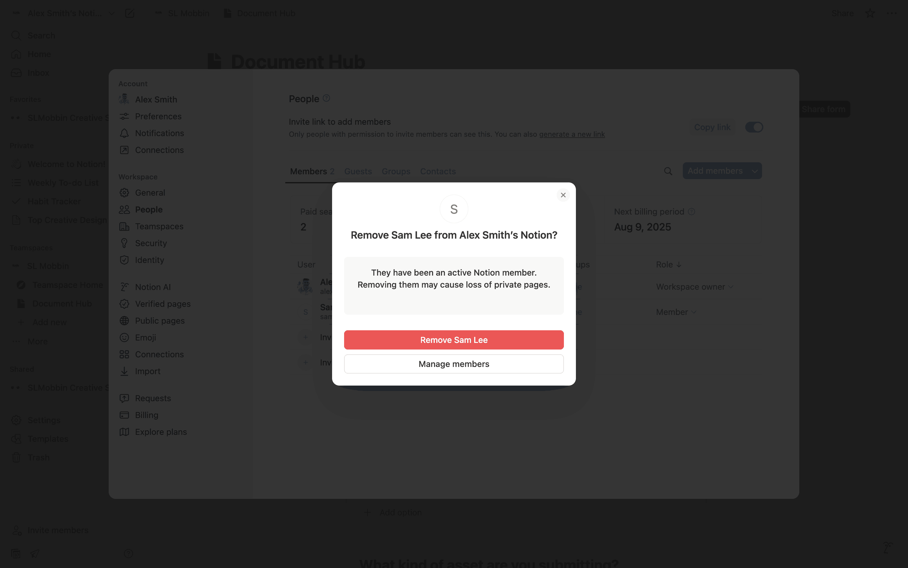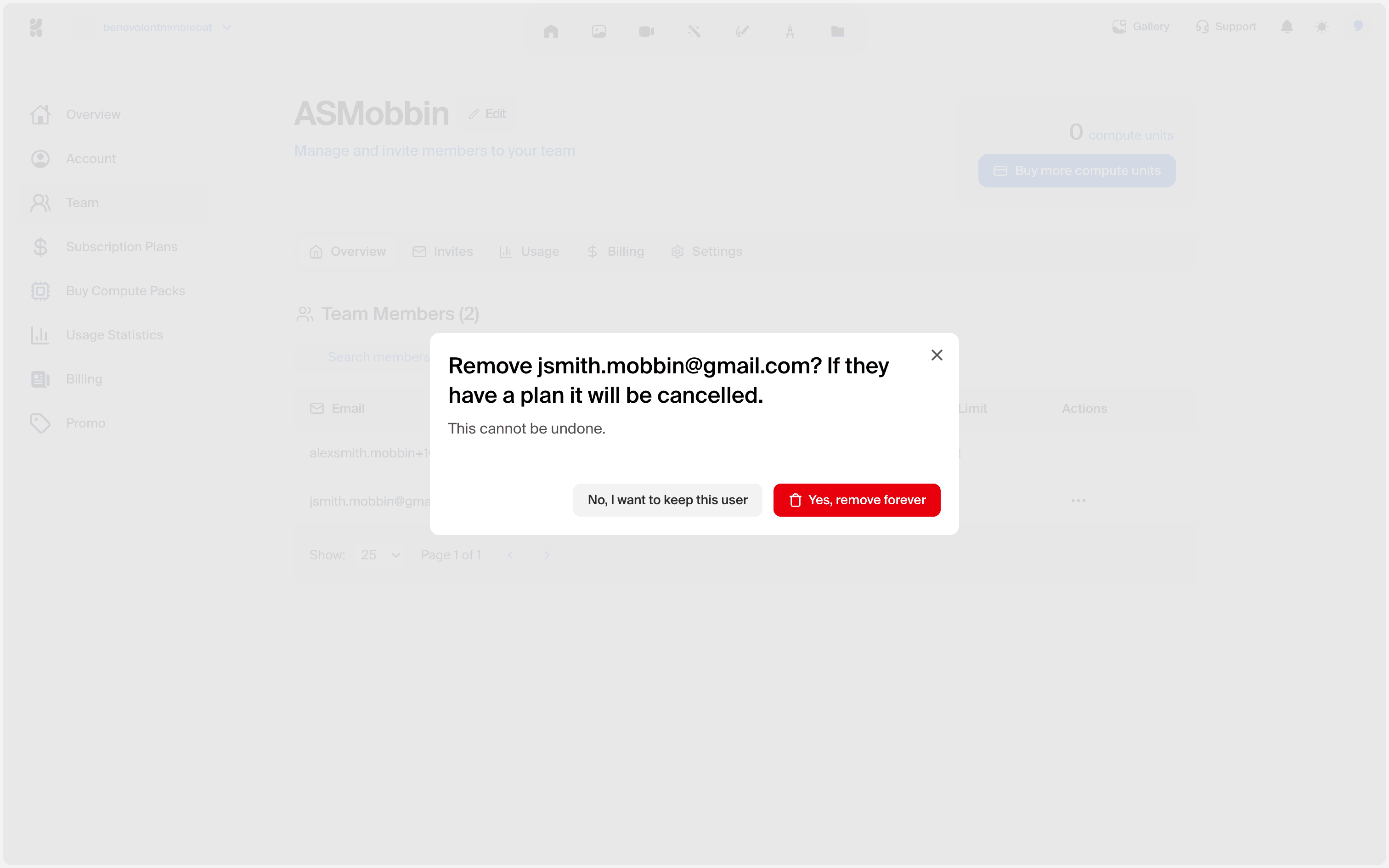 The user removes a member from the team. This involves selecting the remove option and confirming the action in a dialog.
