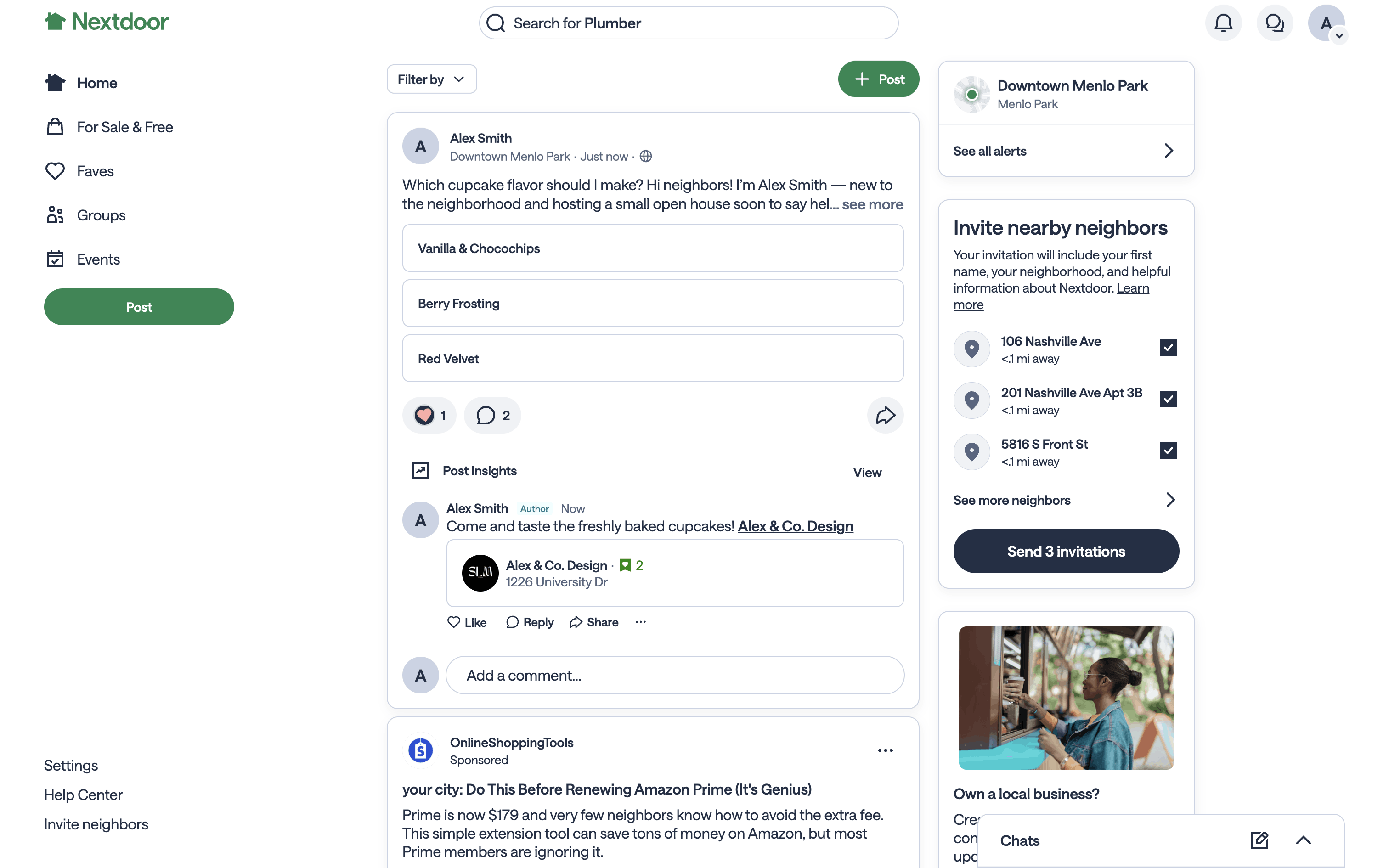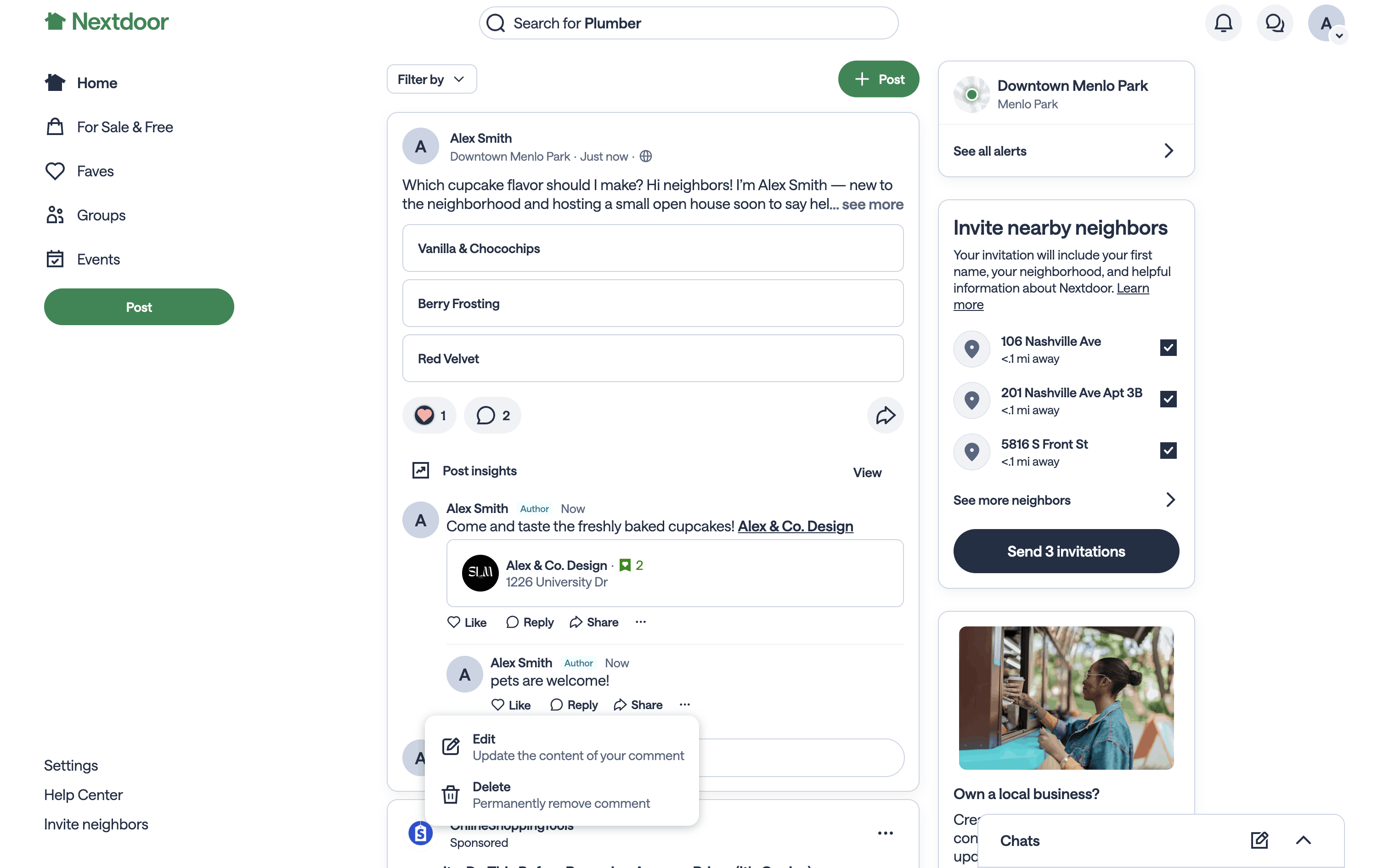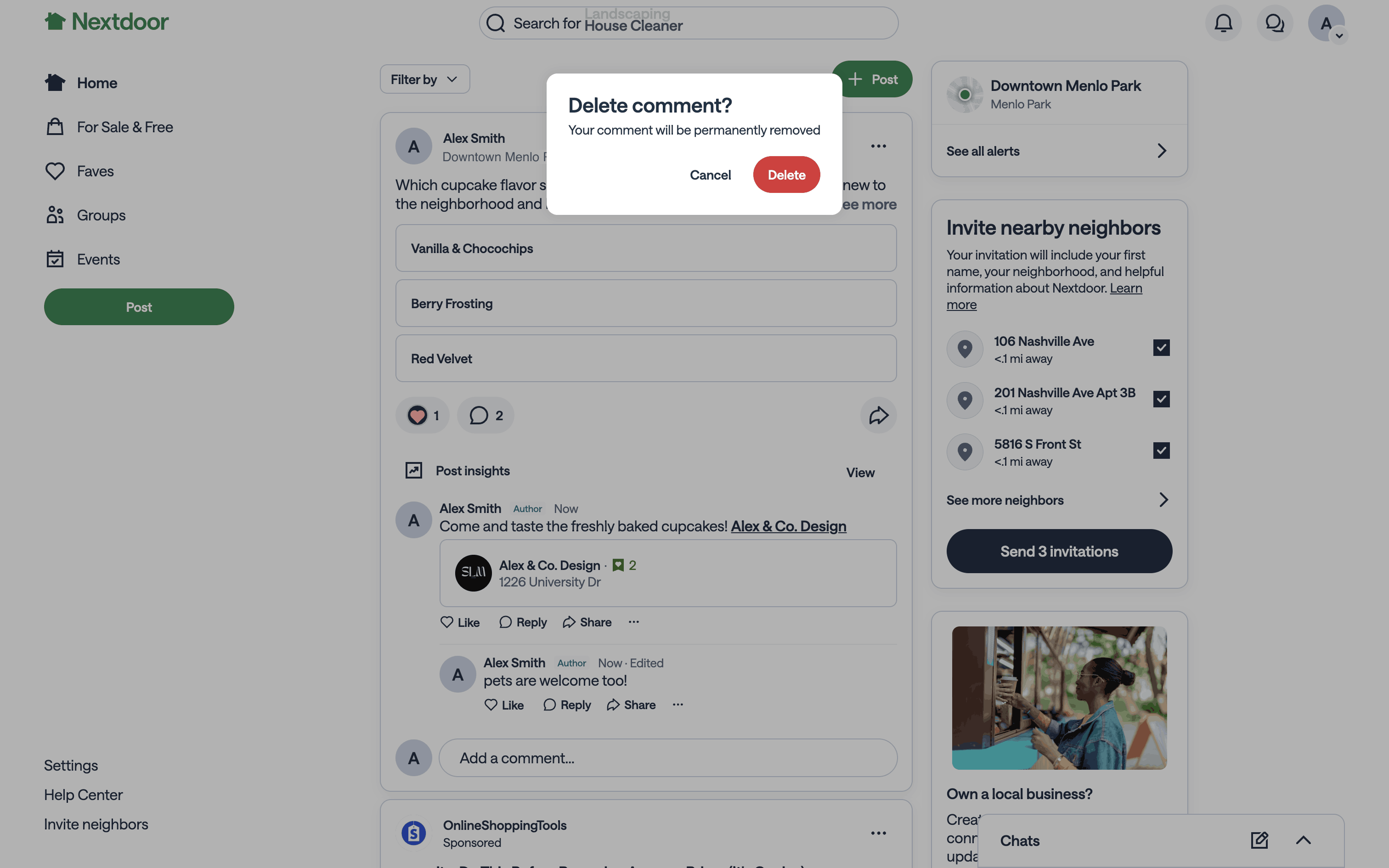 The user flow shows deleting a comment. The user selects the delete option, confirms, and the comment disappears from the feed.