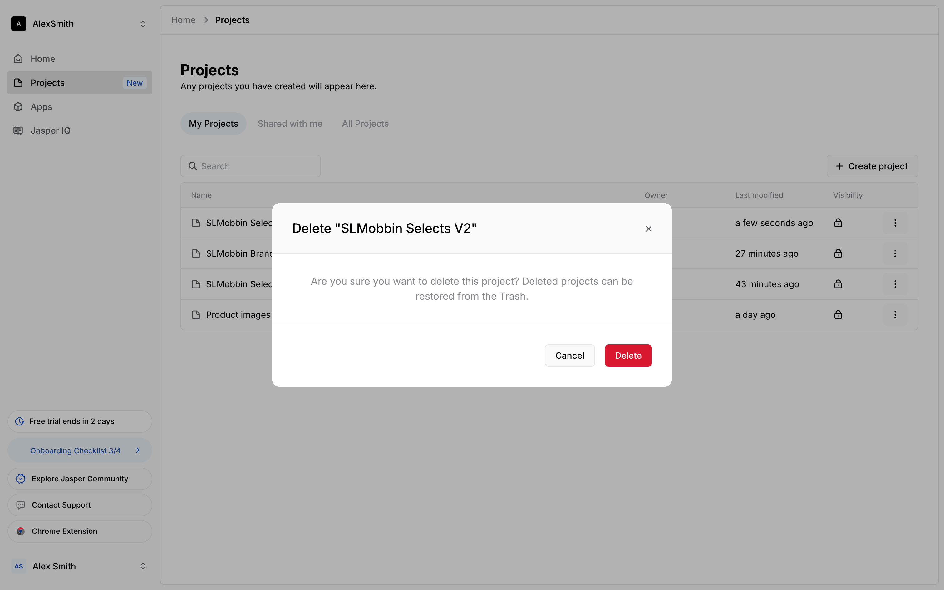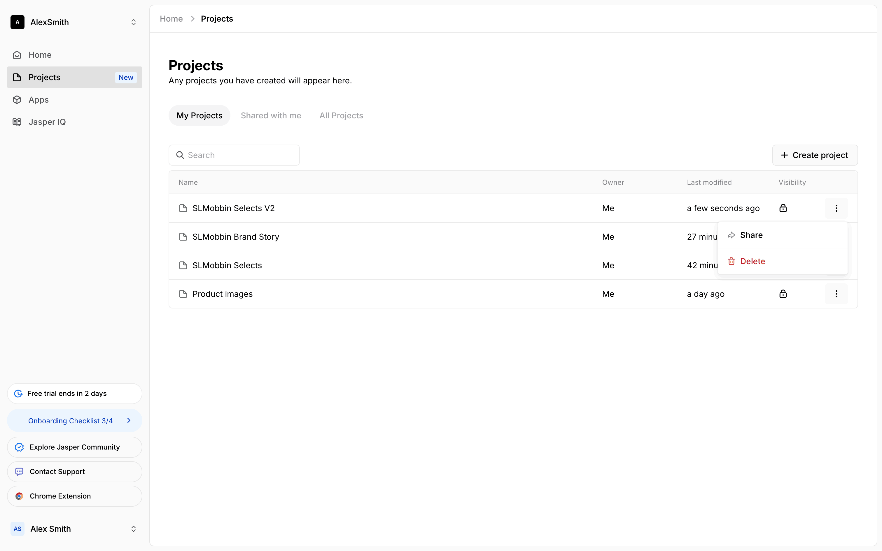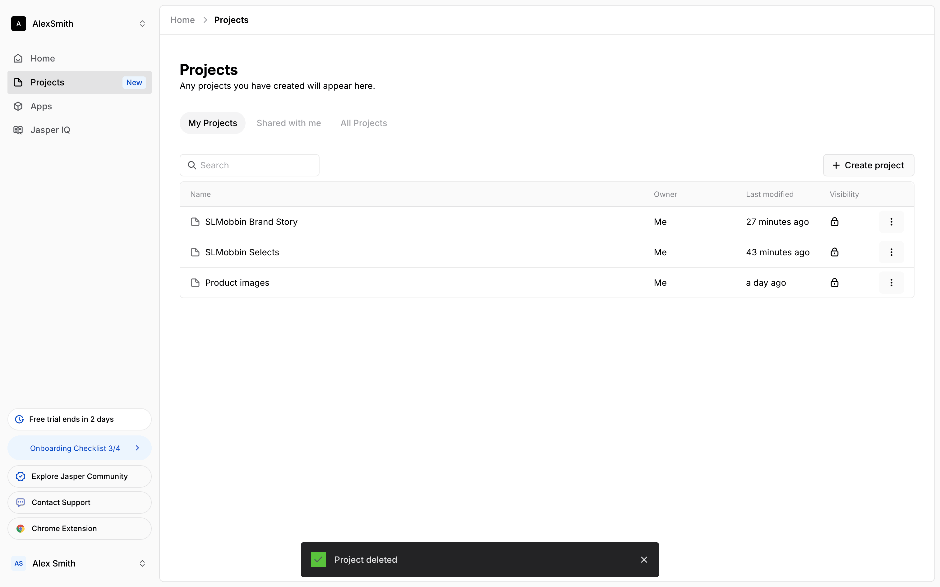 The user flow demonstrates deleting a project. The user selects a project, opens the context menu, confirms the deletion, and the project is removed.