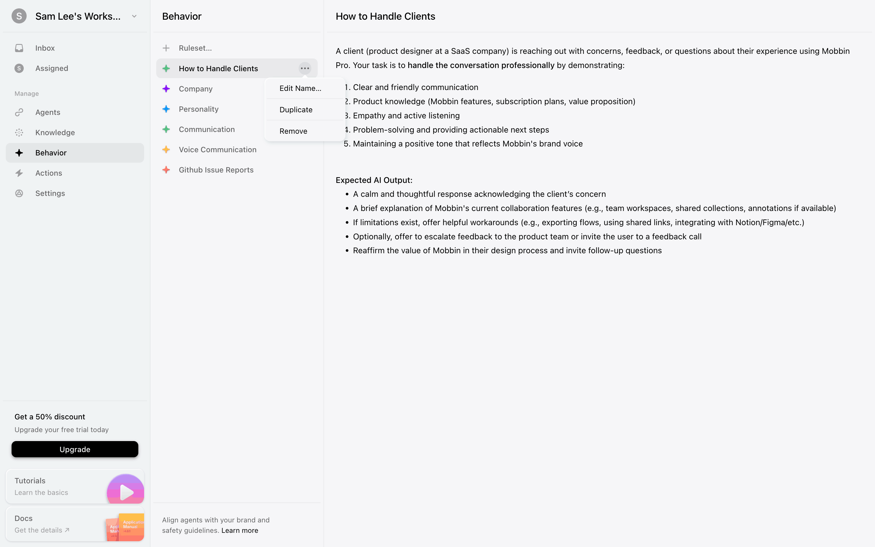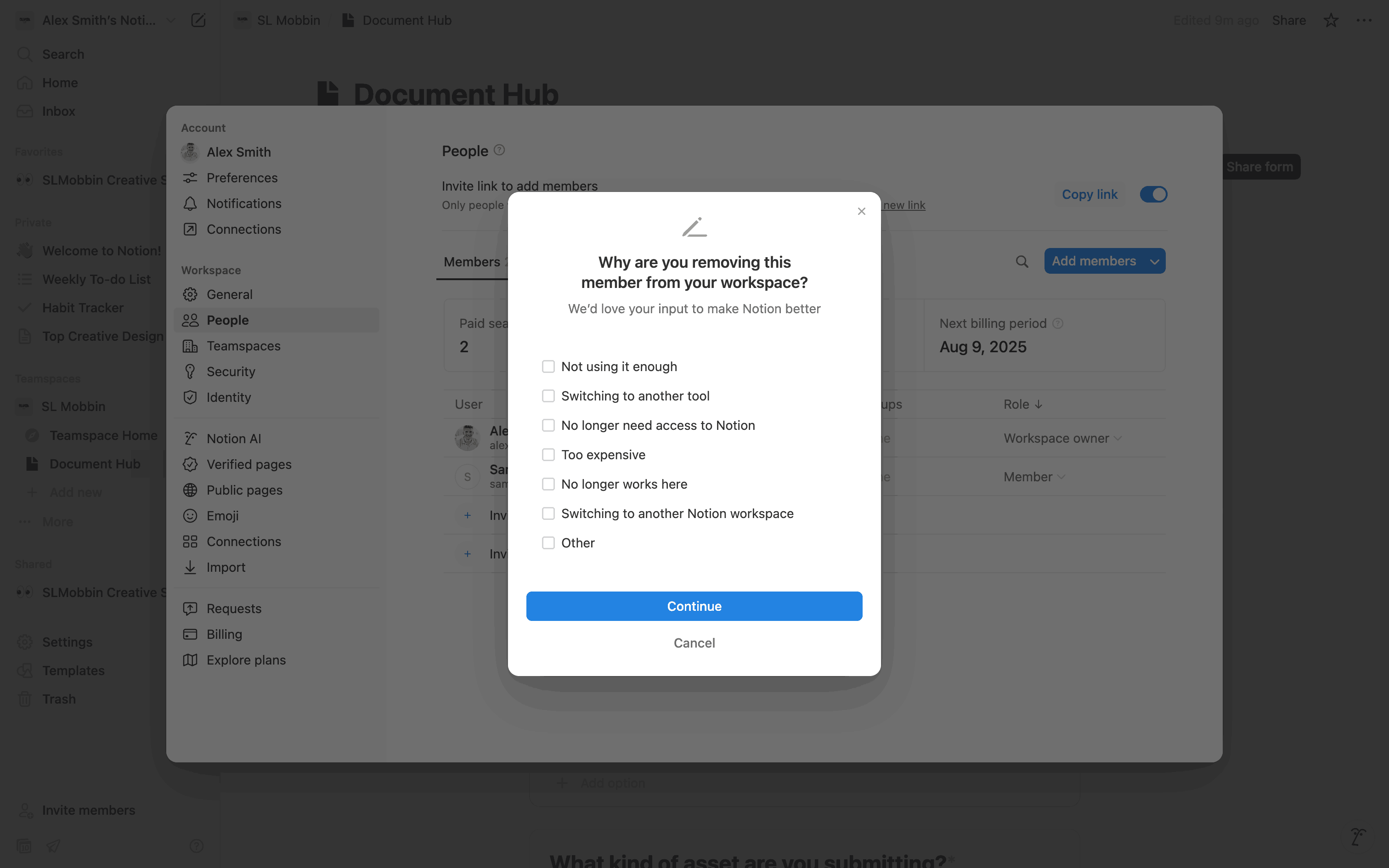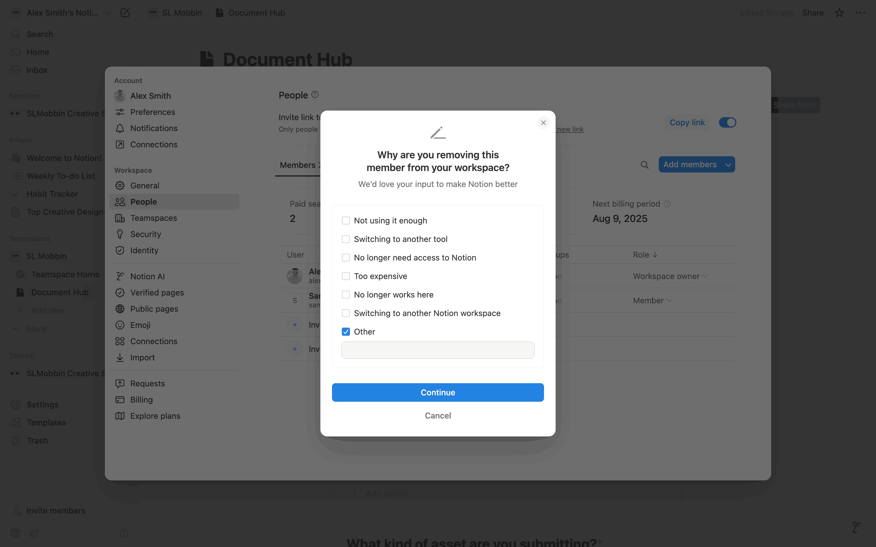 The user flow demonstrates how to remove a member from a workspace. It involves selecting a member, providing a reason, and confirming the removal.