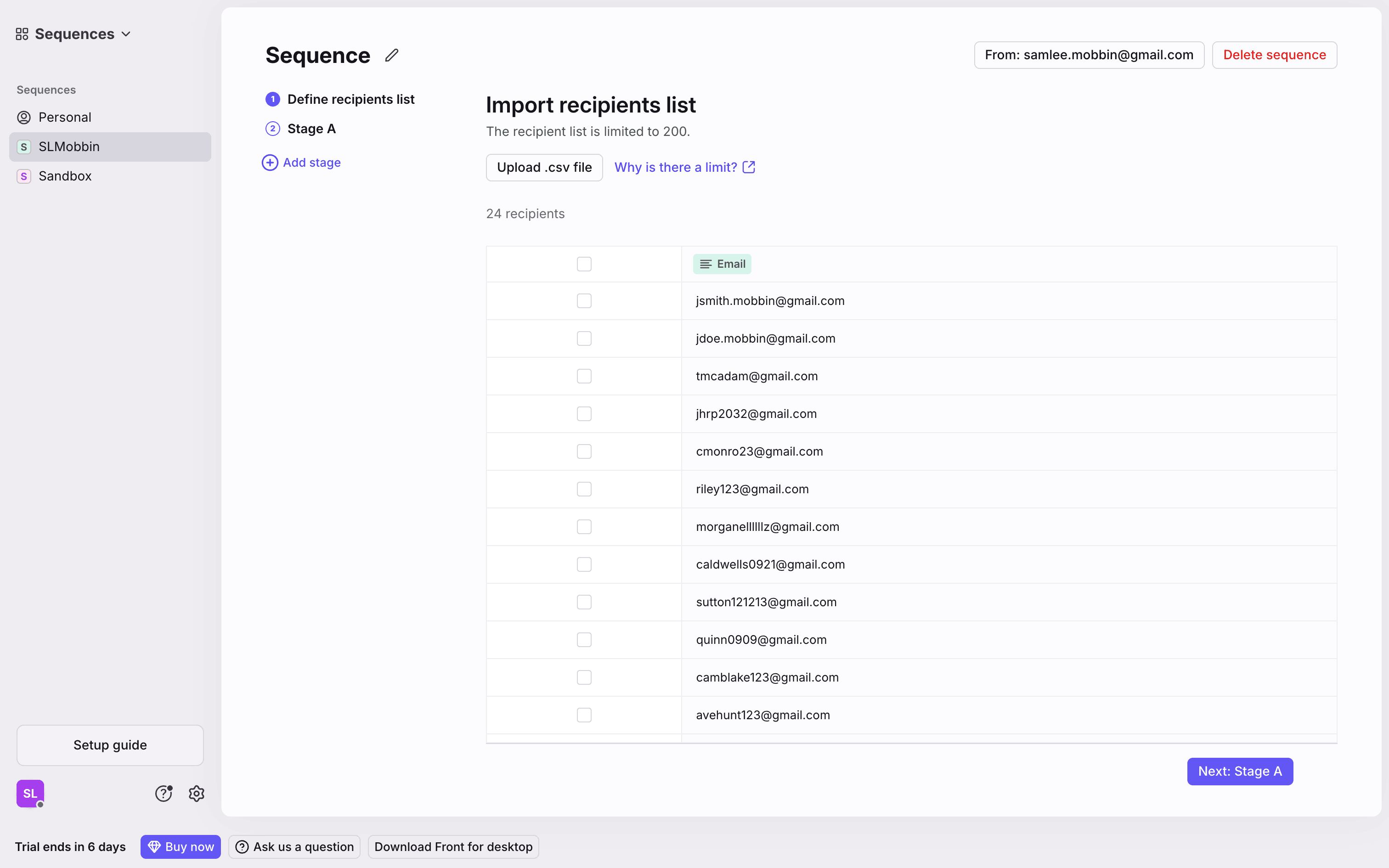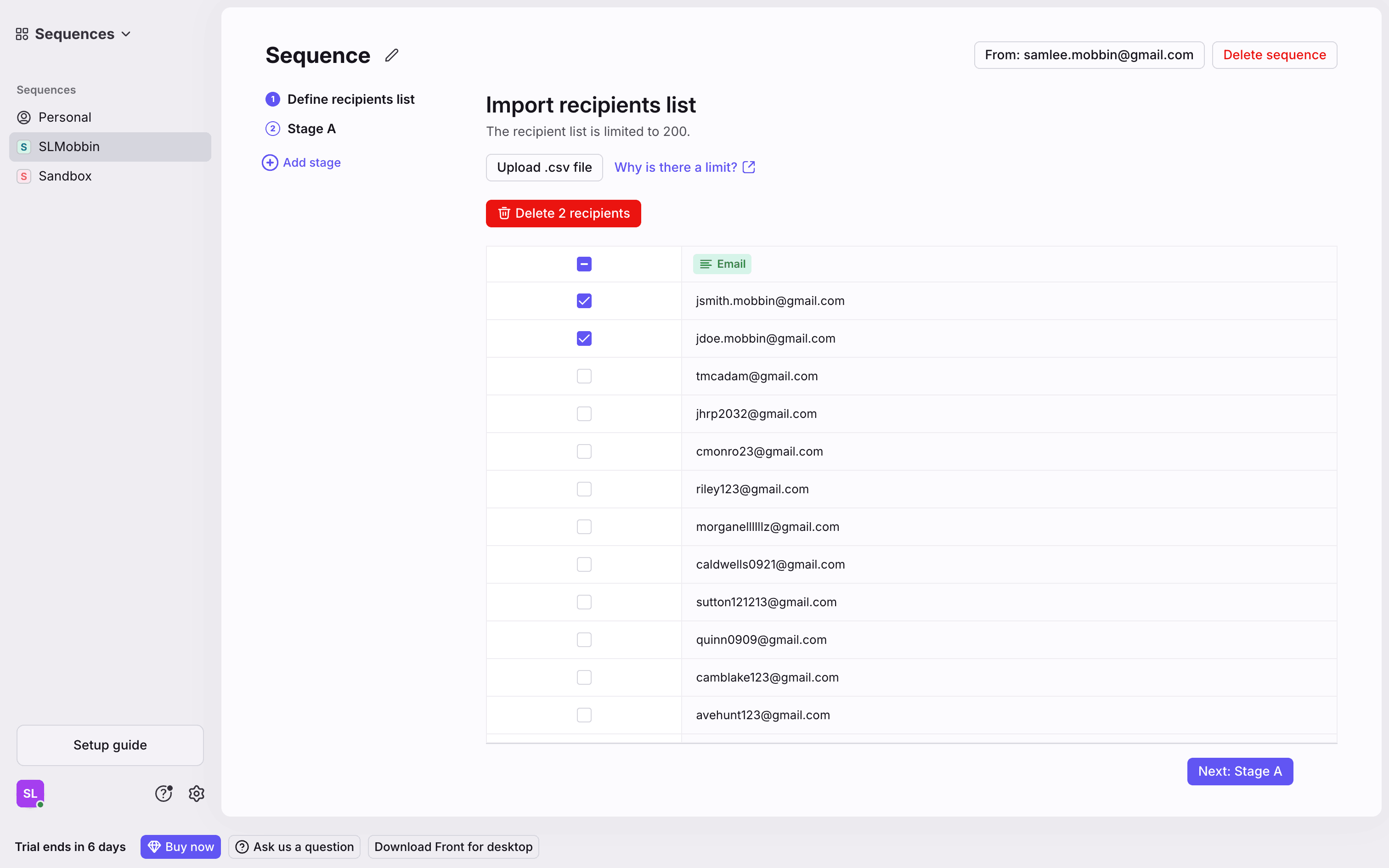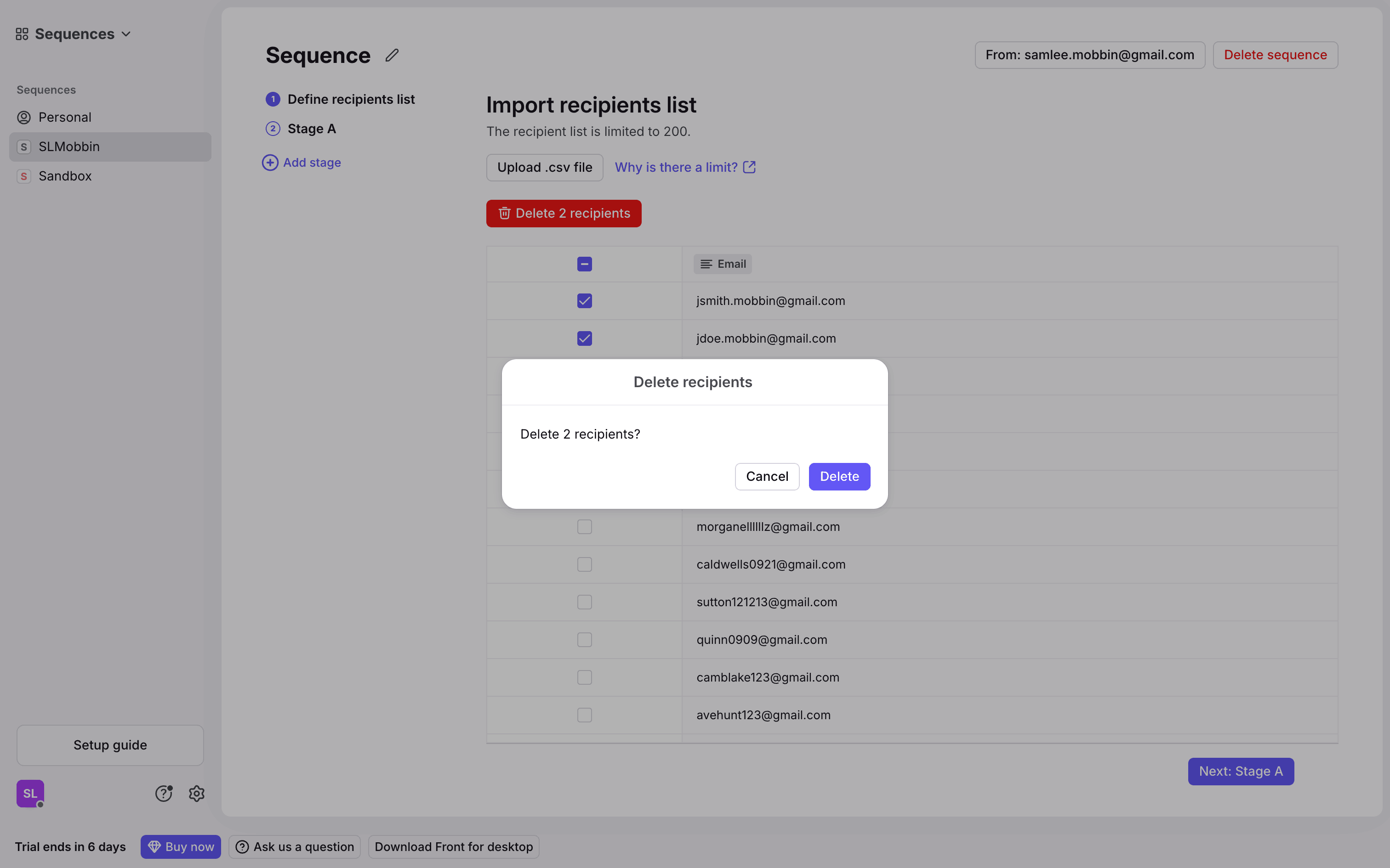 The user defines a recipient list, selects recipients to delete, confirms the deletion, and views the updated list. The flow showcases deleting recipients from a list.