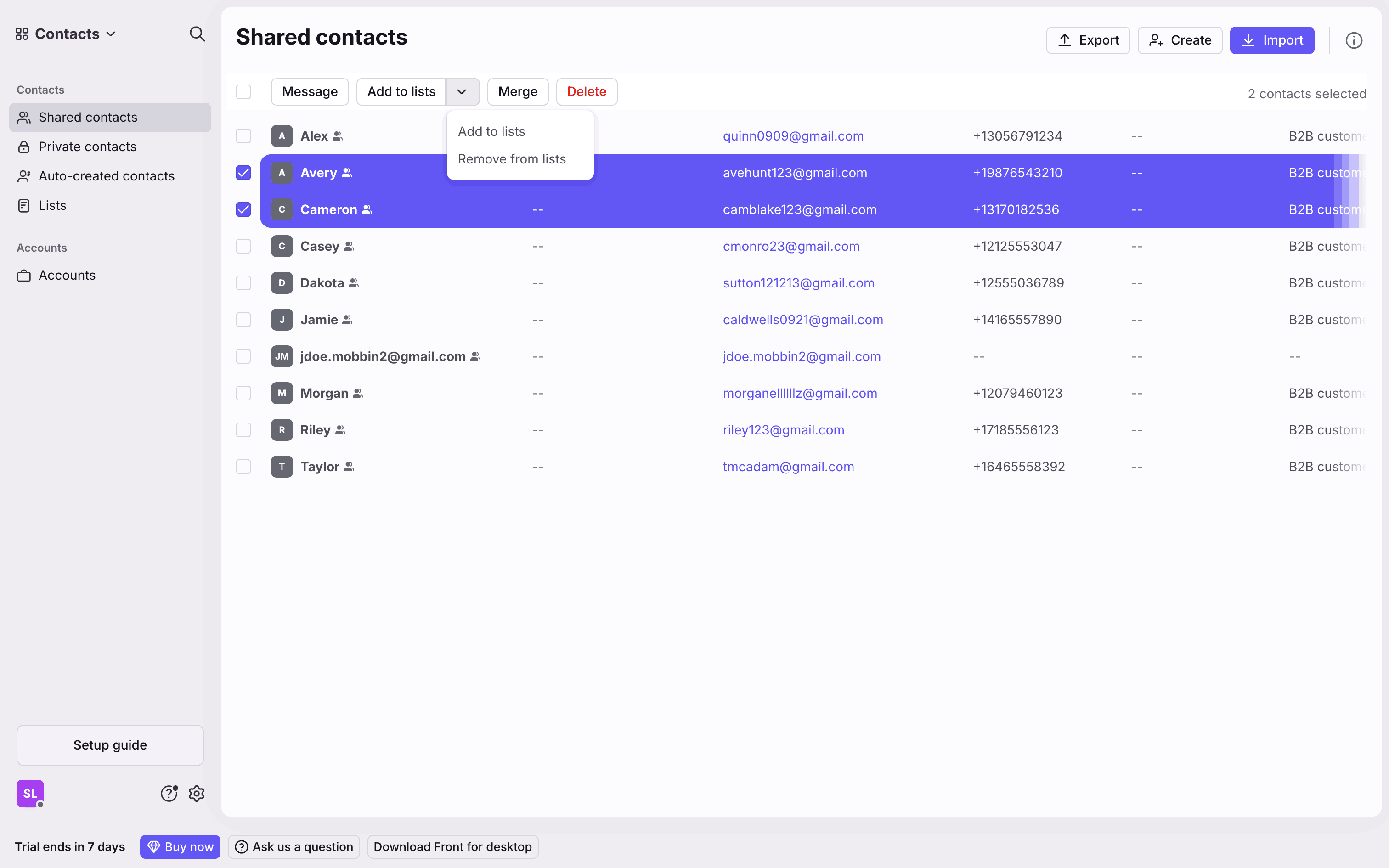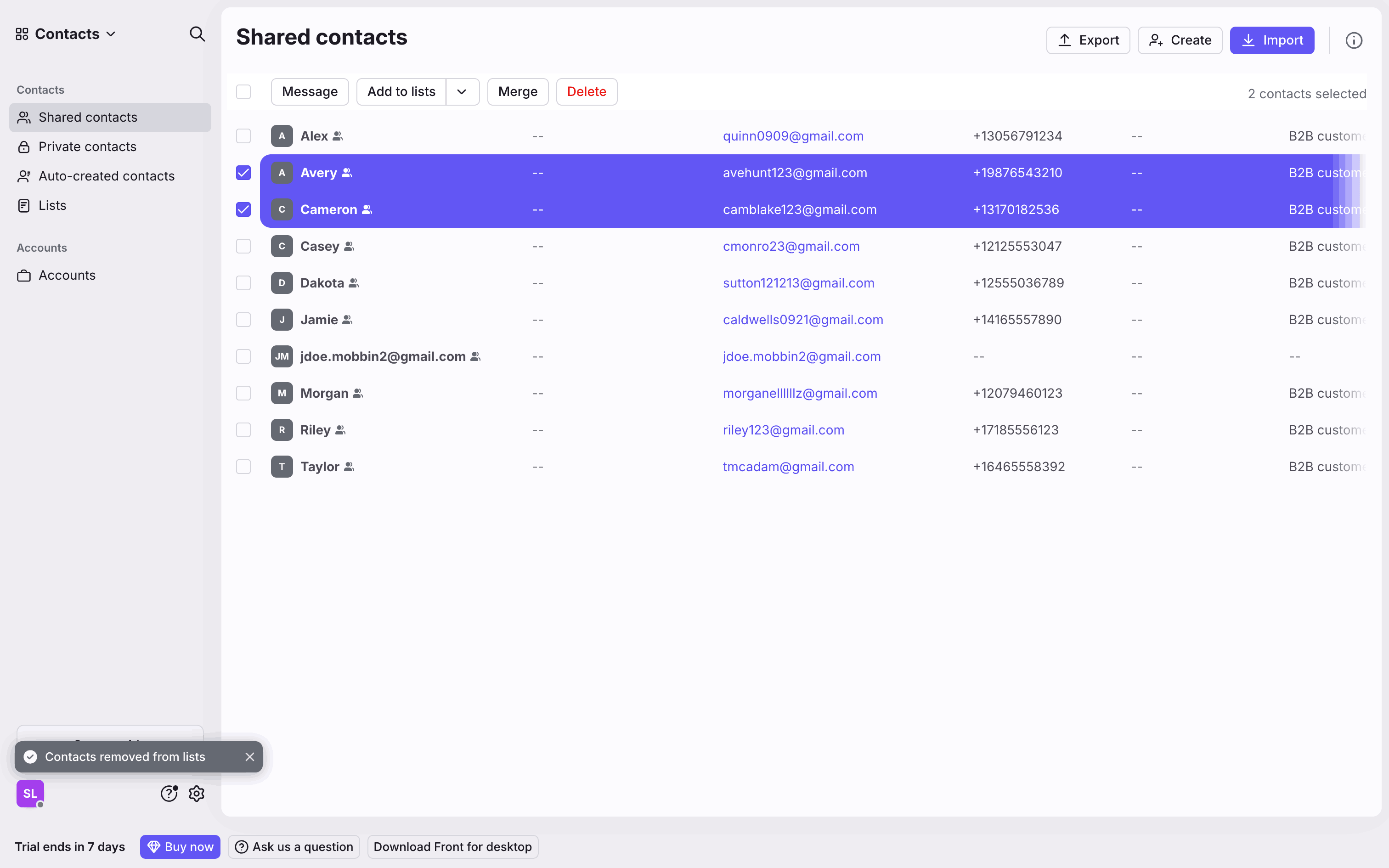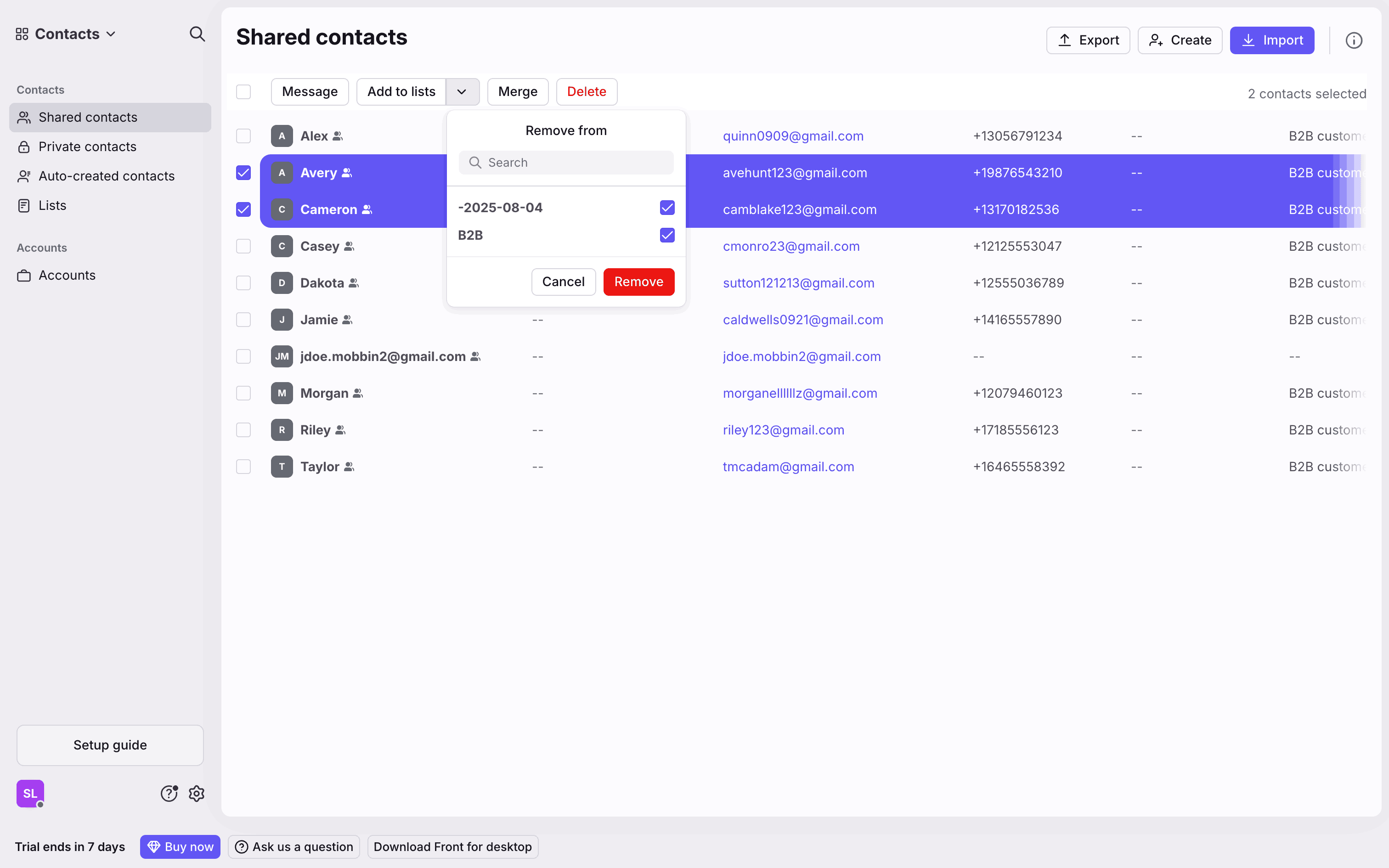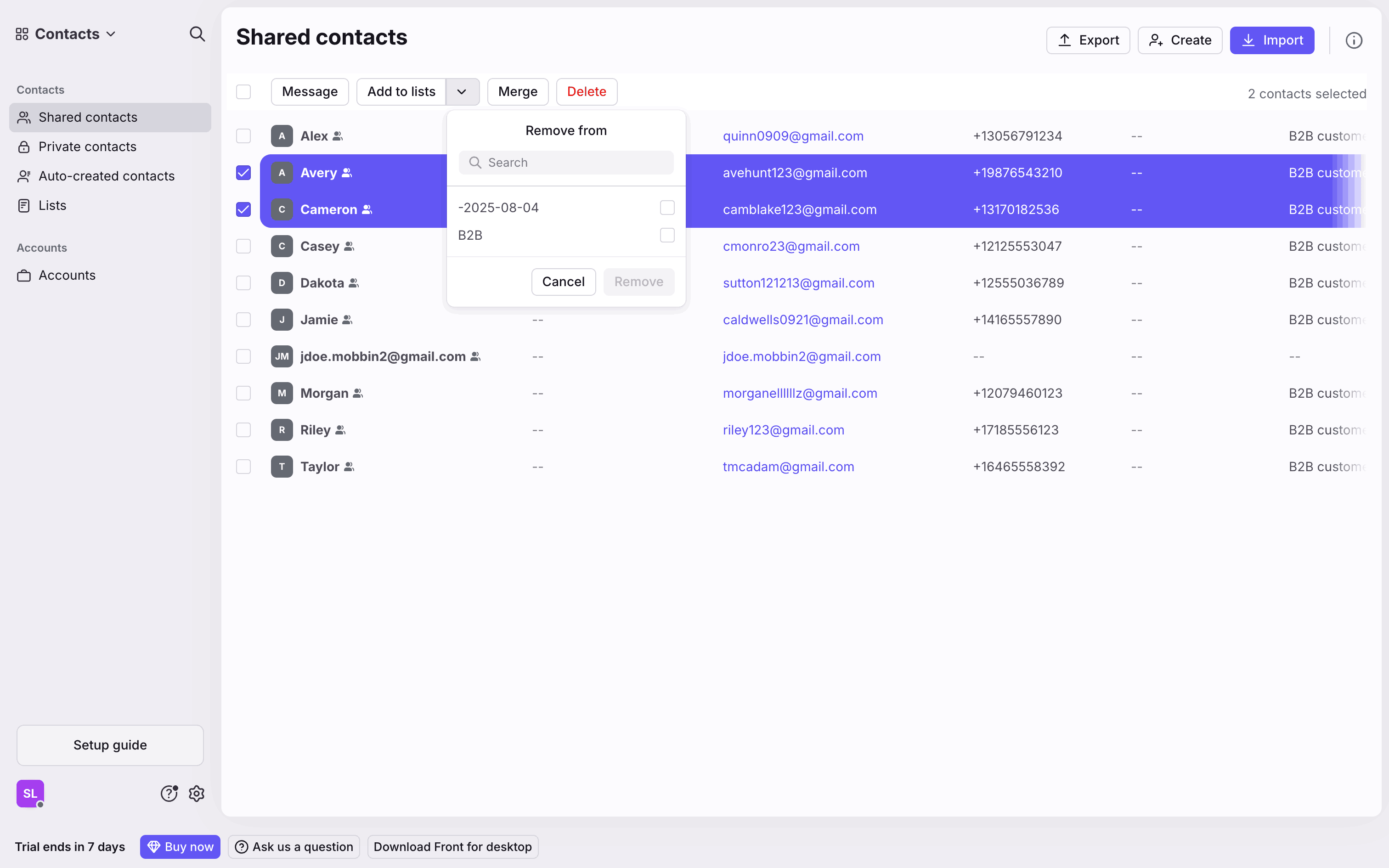 The user selects contacts, chooses a list, and removes the contacts from it. A confirmation message appears upon completion.