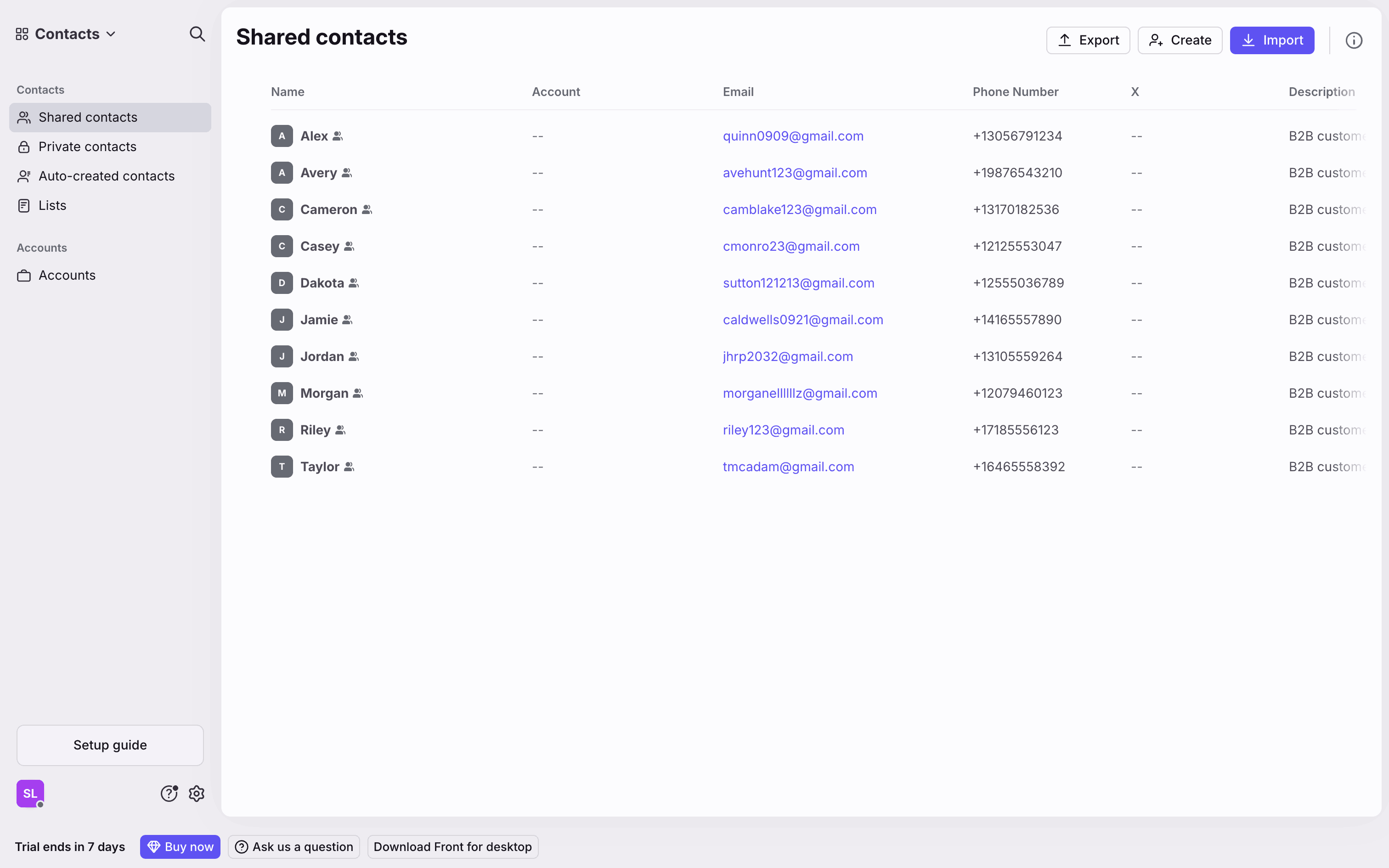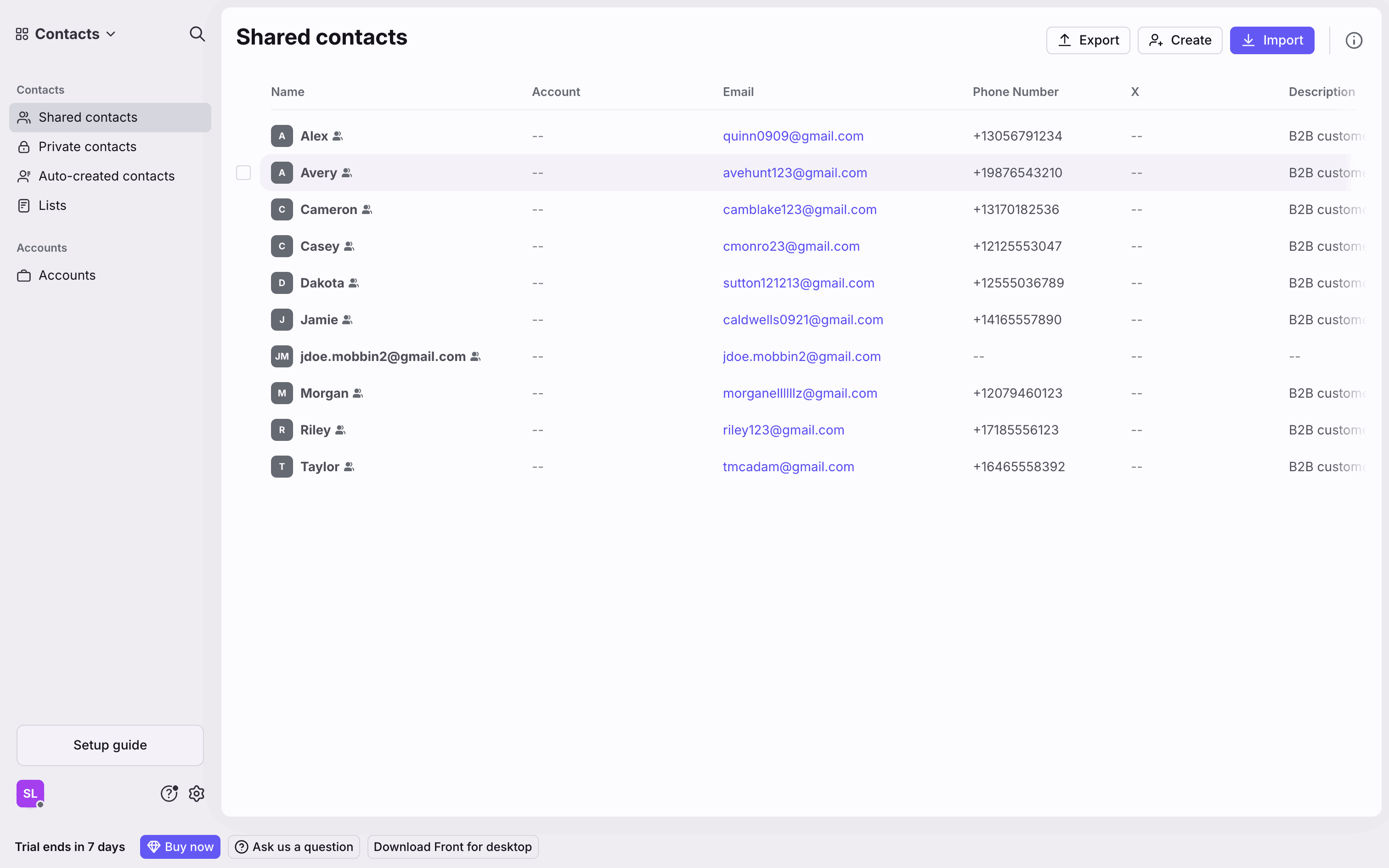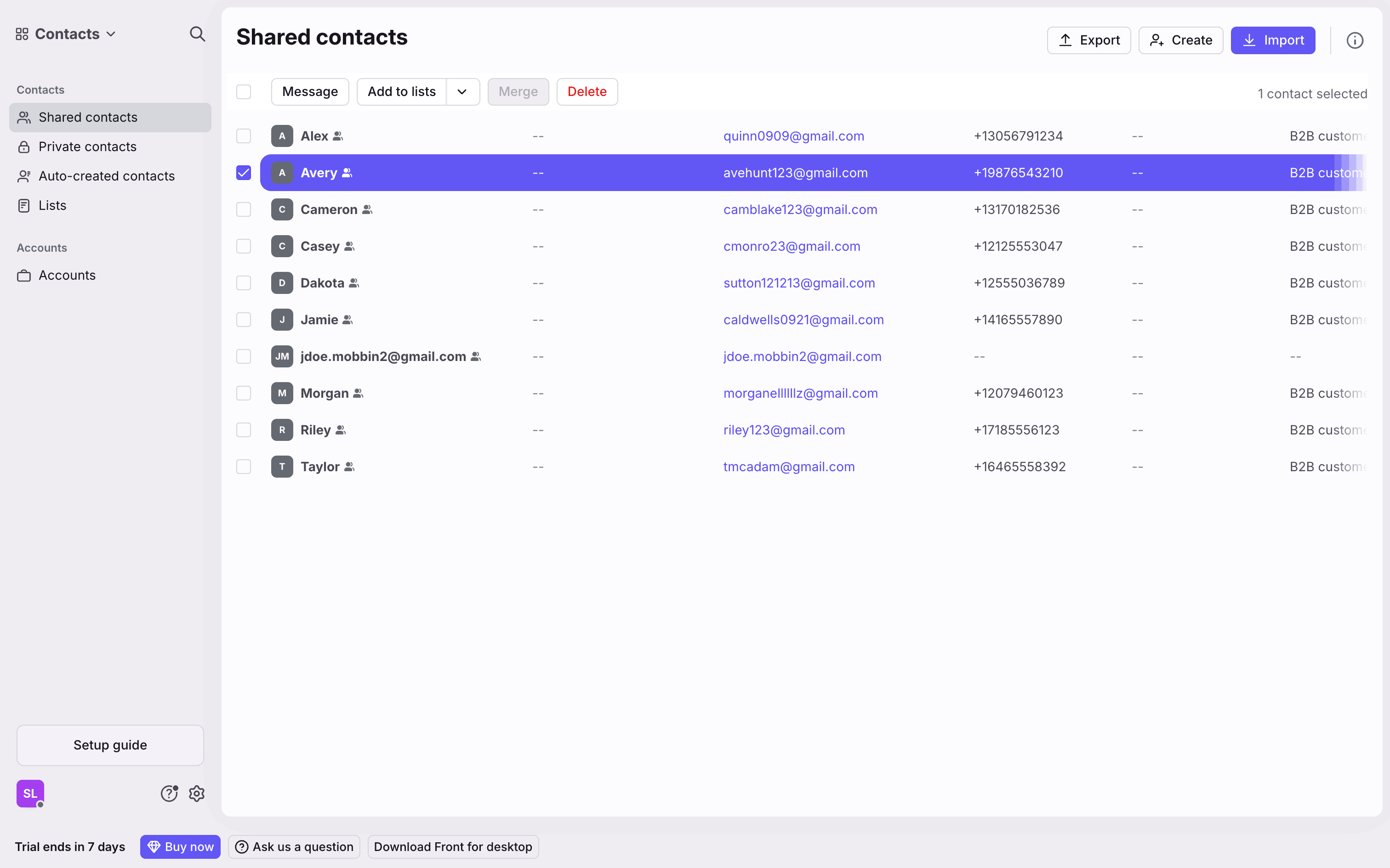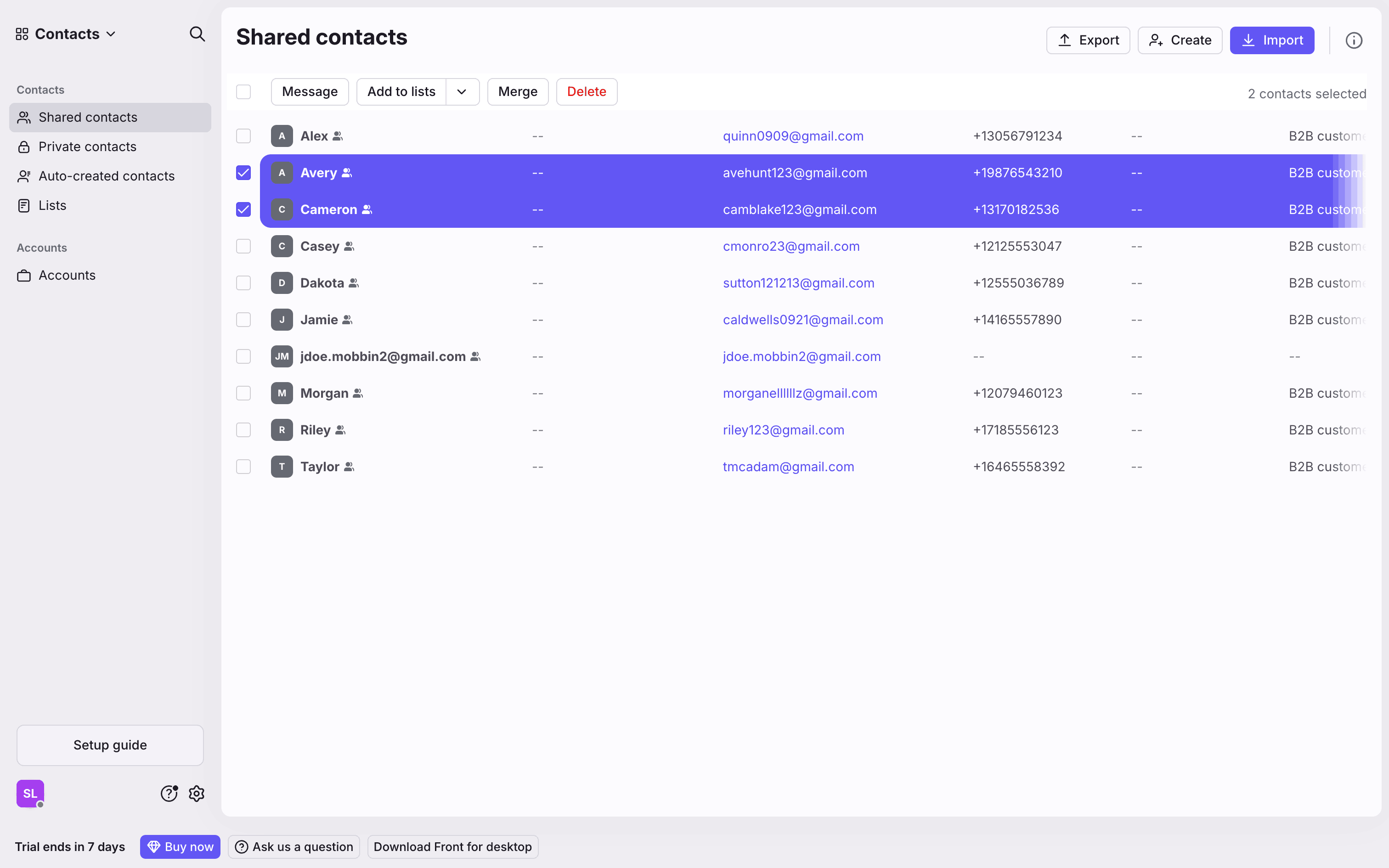 The user selects contacts, chooses a list, and removes the contacts from it. A confirmation message appears upon completion.