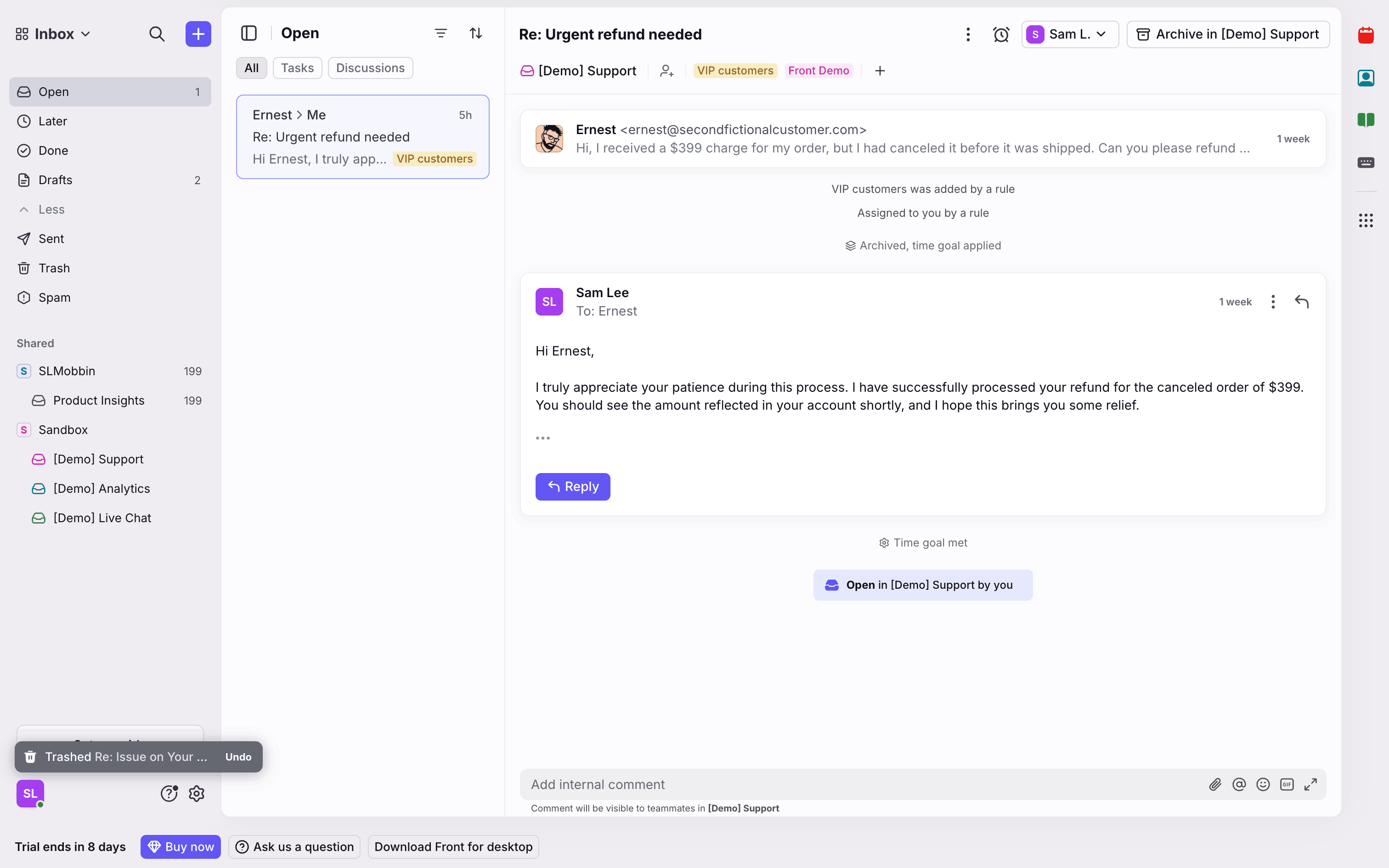 The user flow demonstrates deleting an email conversation: accessing the context menu, confirming the action, and viewing the updated inbox.