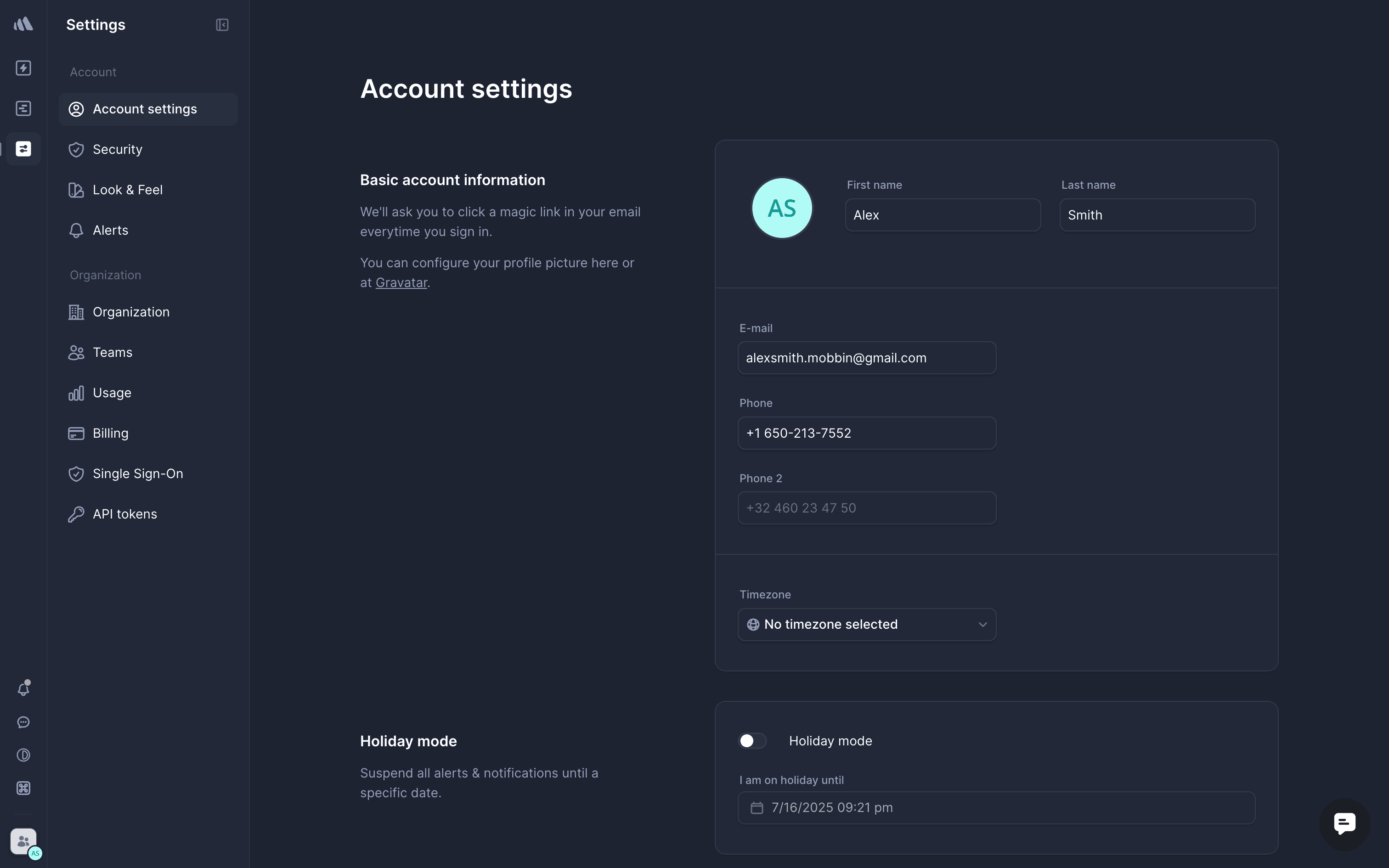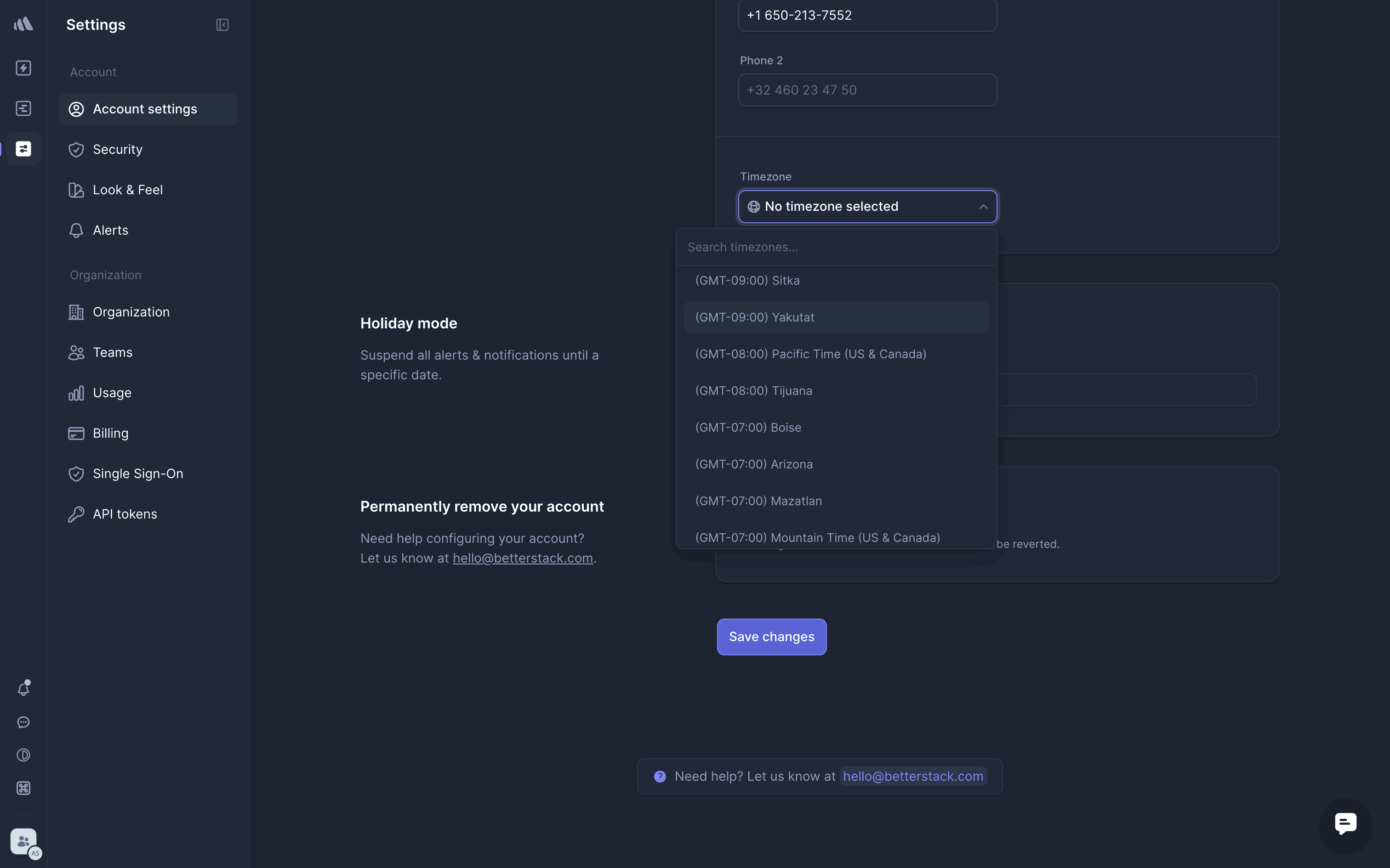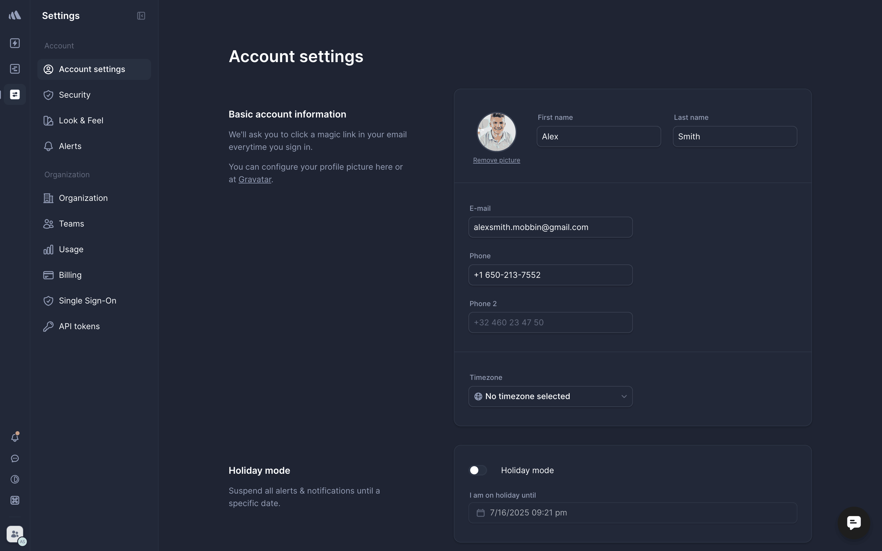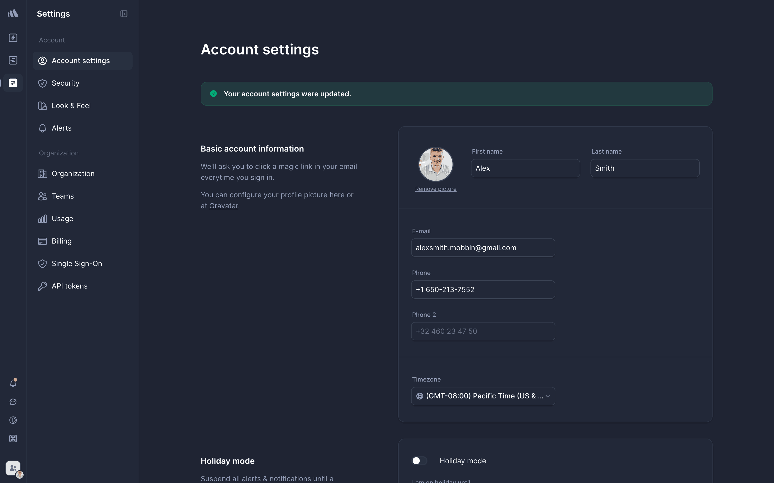 The user edits their account settings by uploading a profile picture and selecting a timezone. The changes are saved, and a confirmation message is displayed.