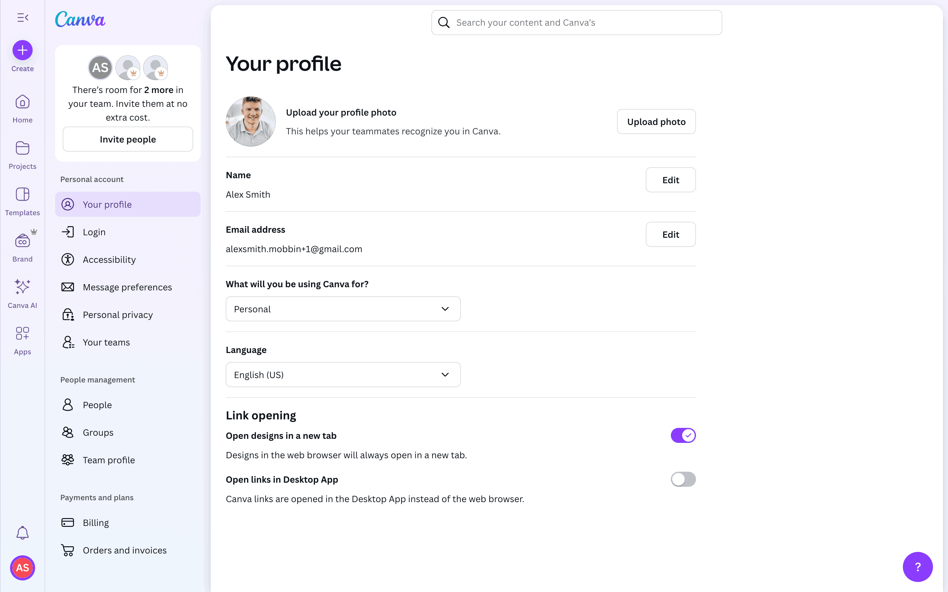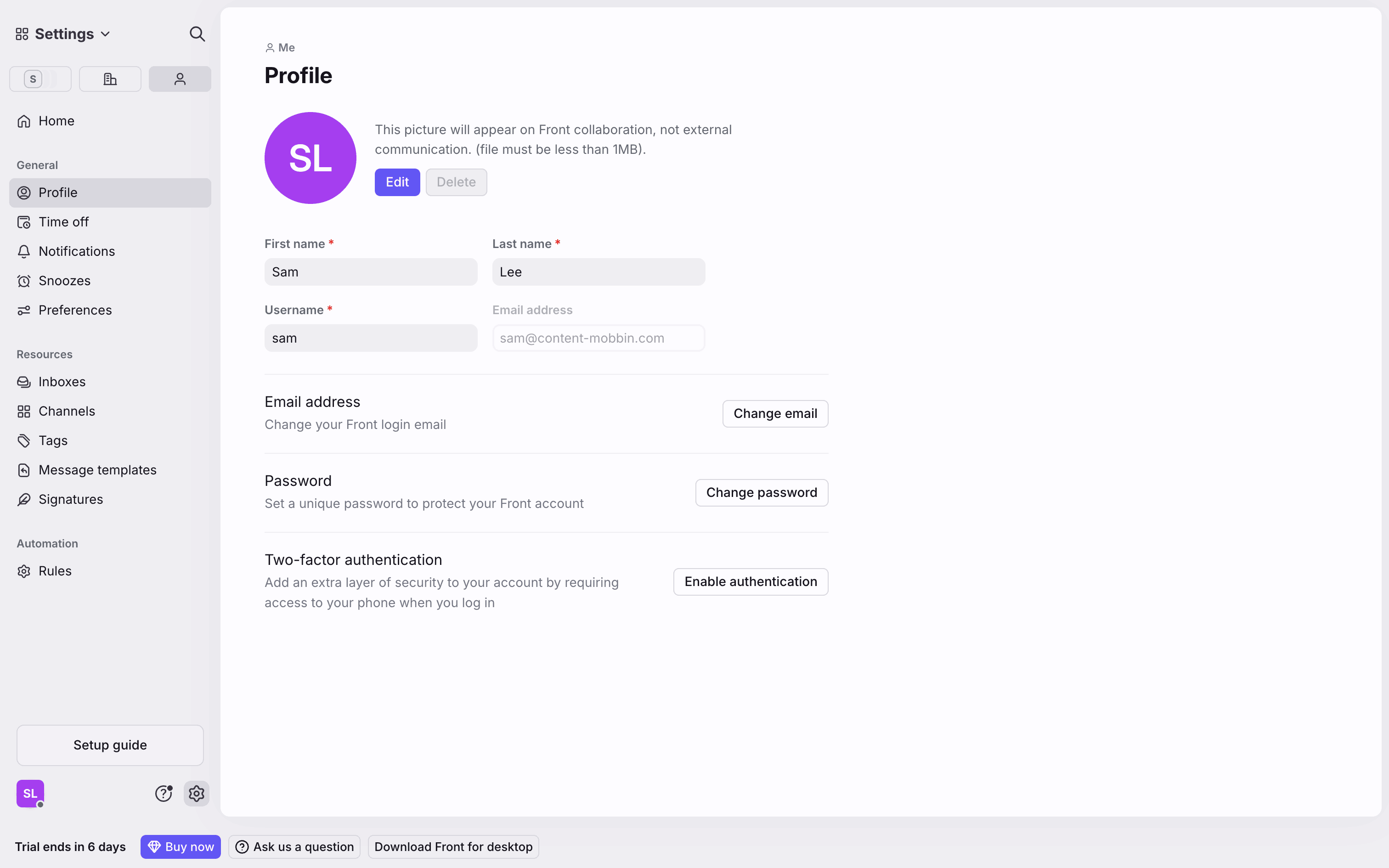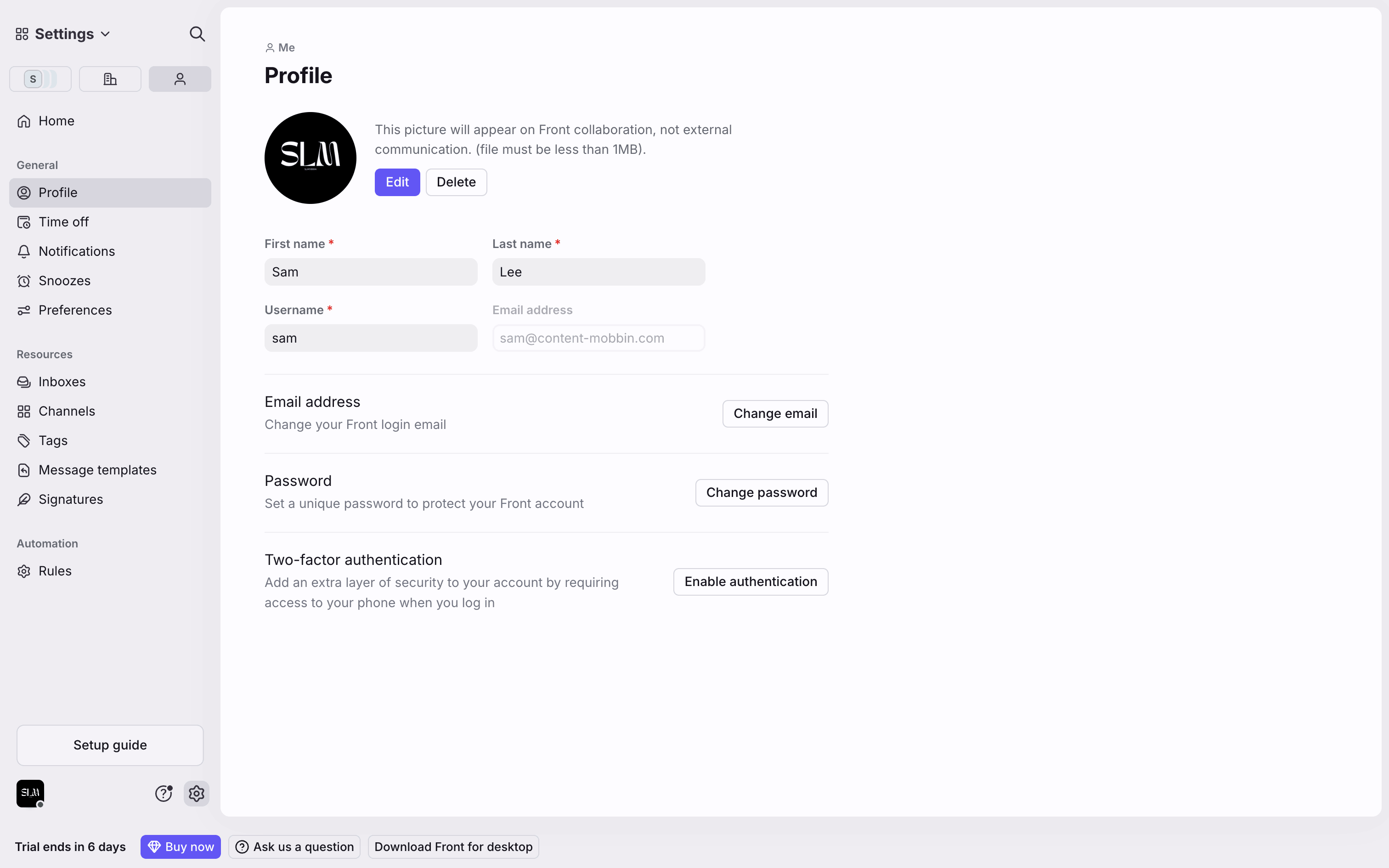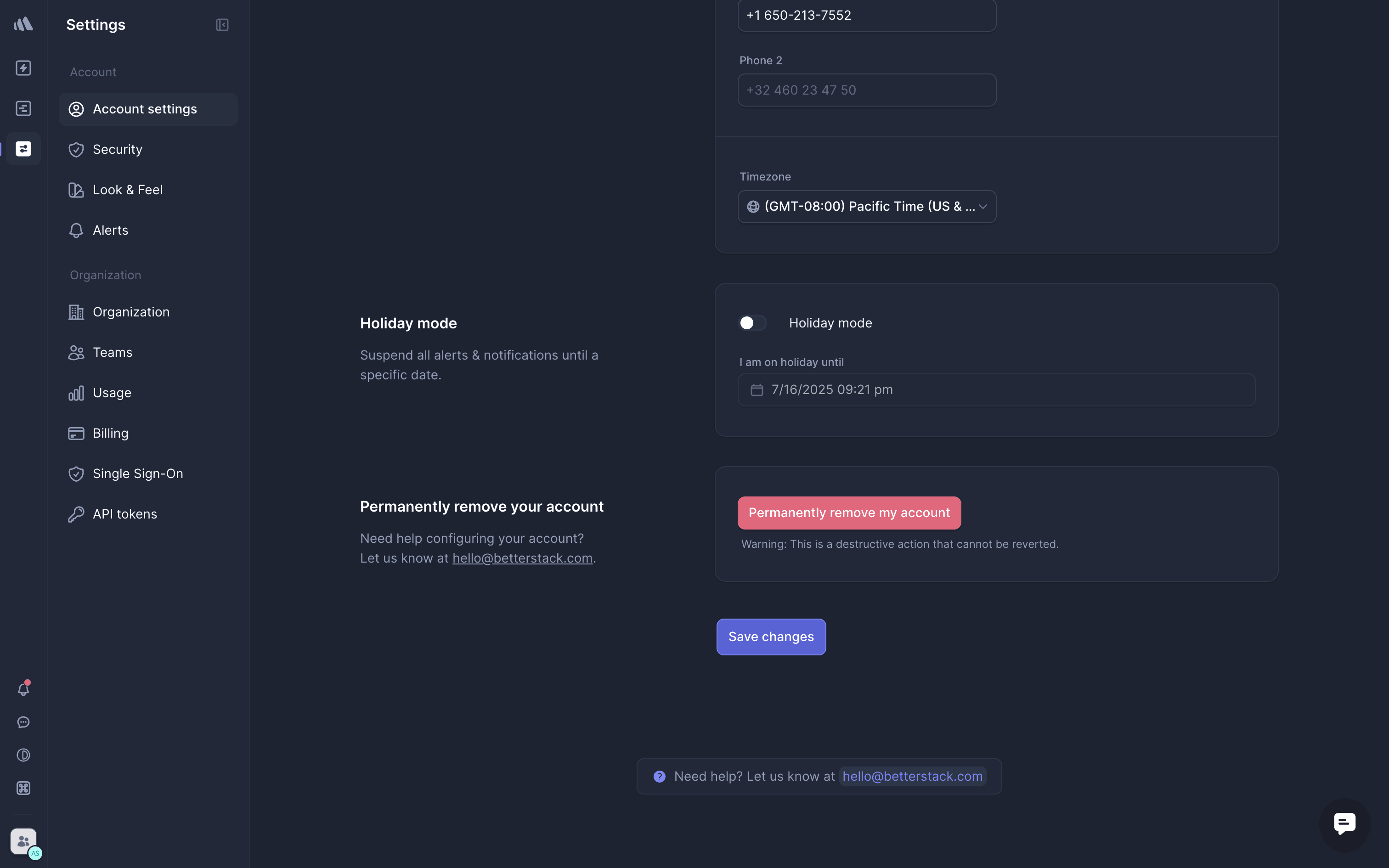 The user edits their account settings by uploading a profile picture and selecting a timezone. The changes are saved, and a confirmation message is displayed.