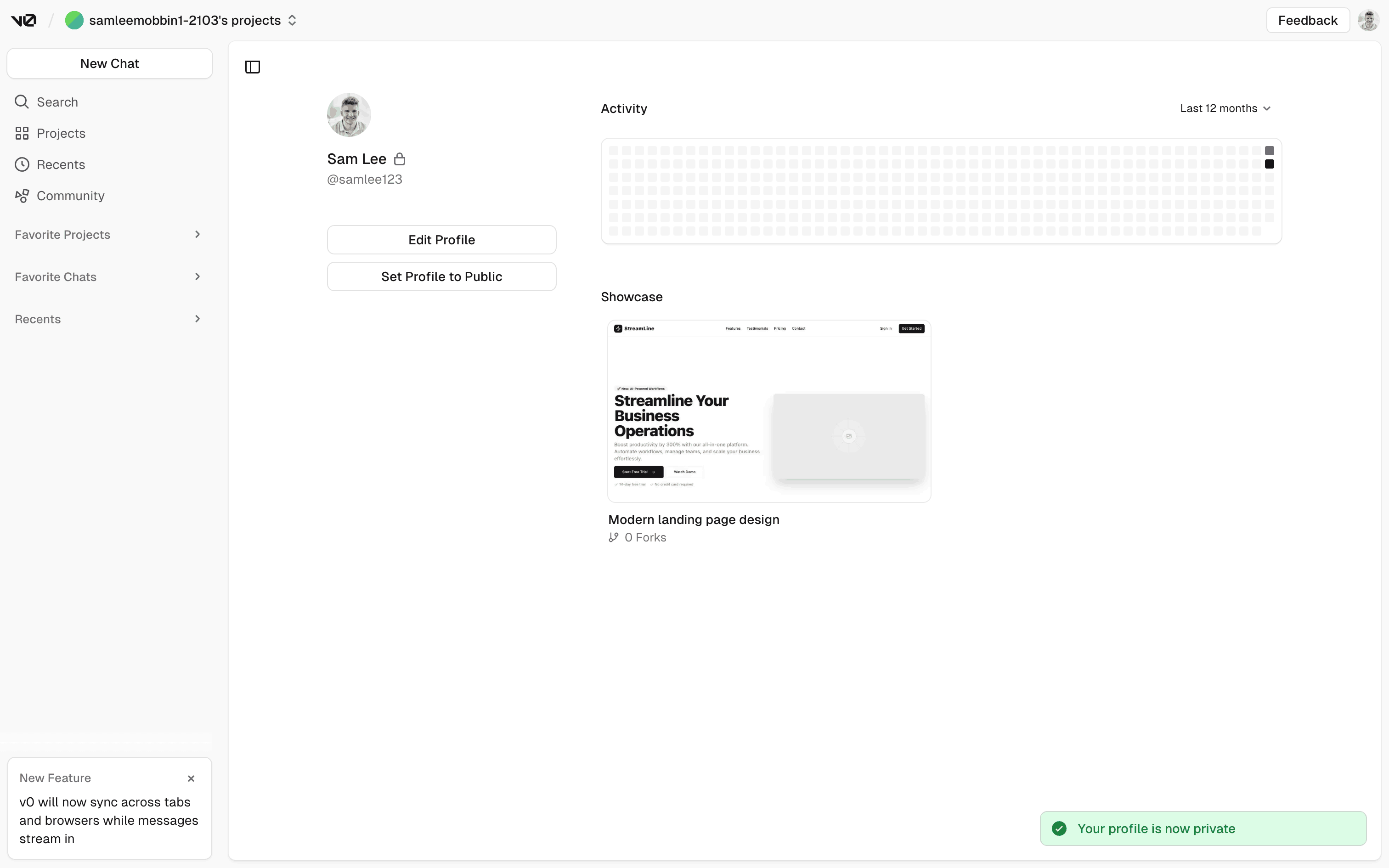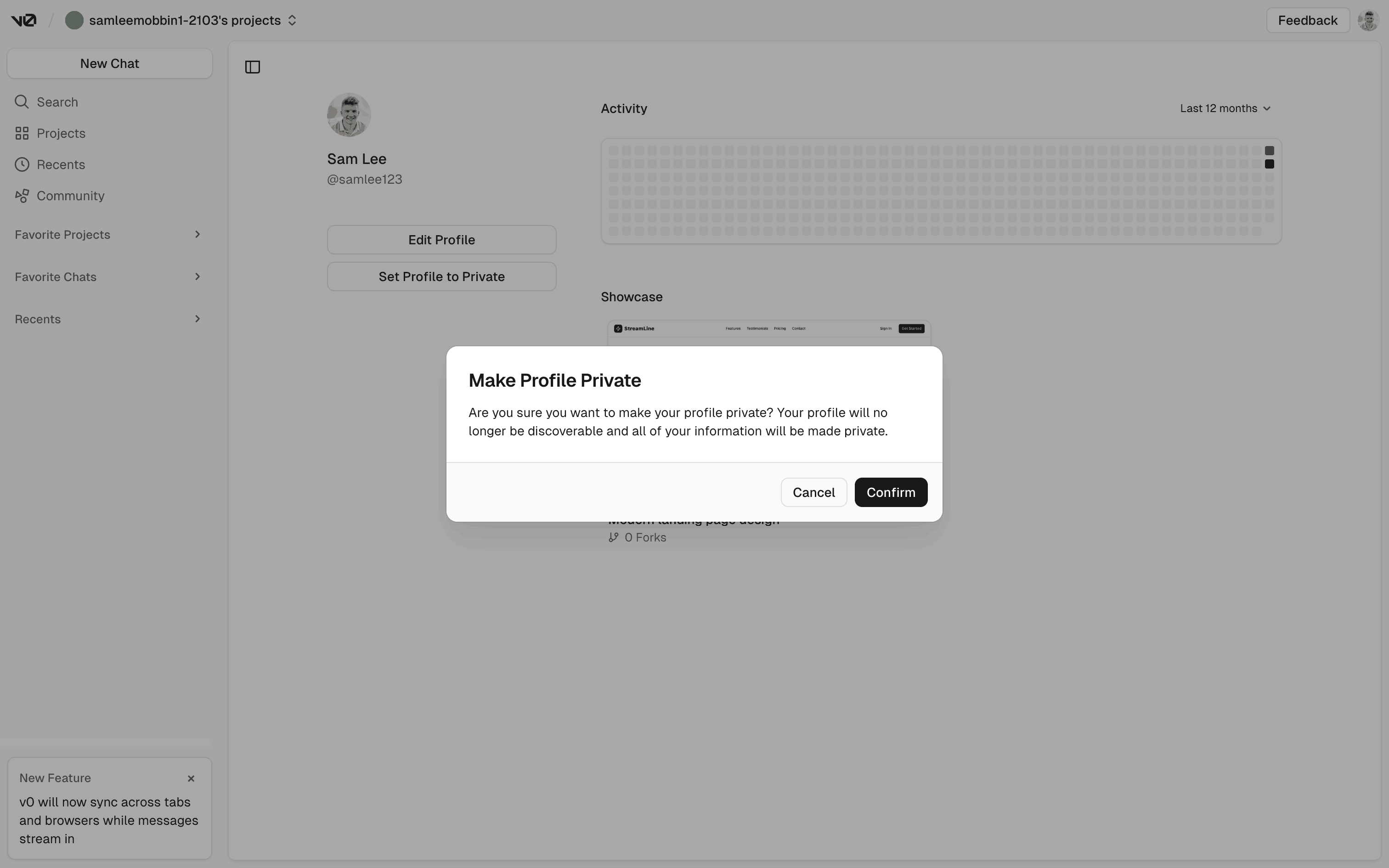 The user navigates to their profile and sets it to private. A confirmation dialog appears, and upon confirmation, the profile is updated to private.