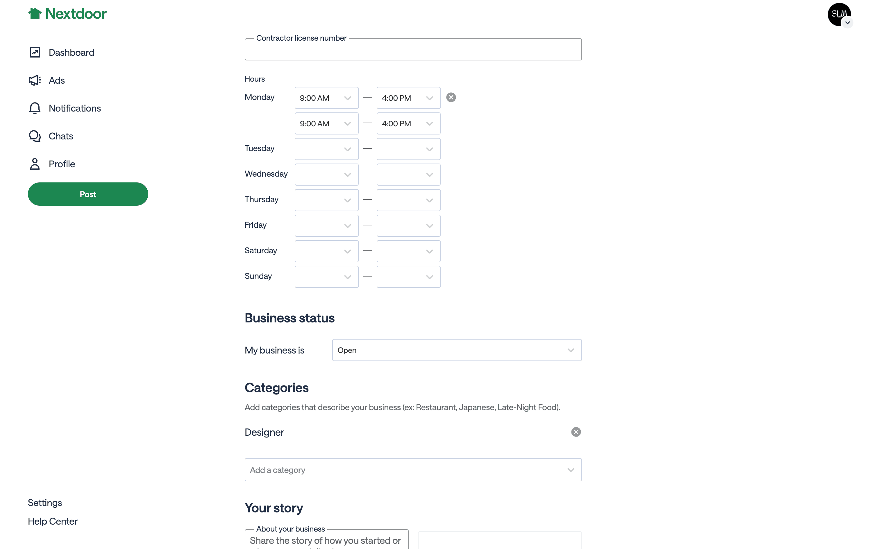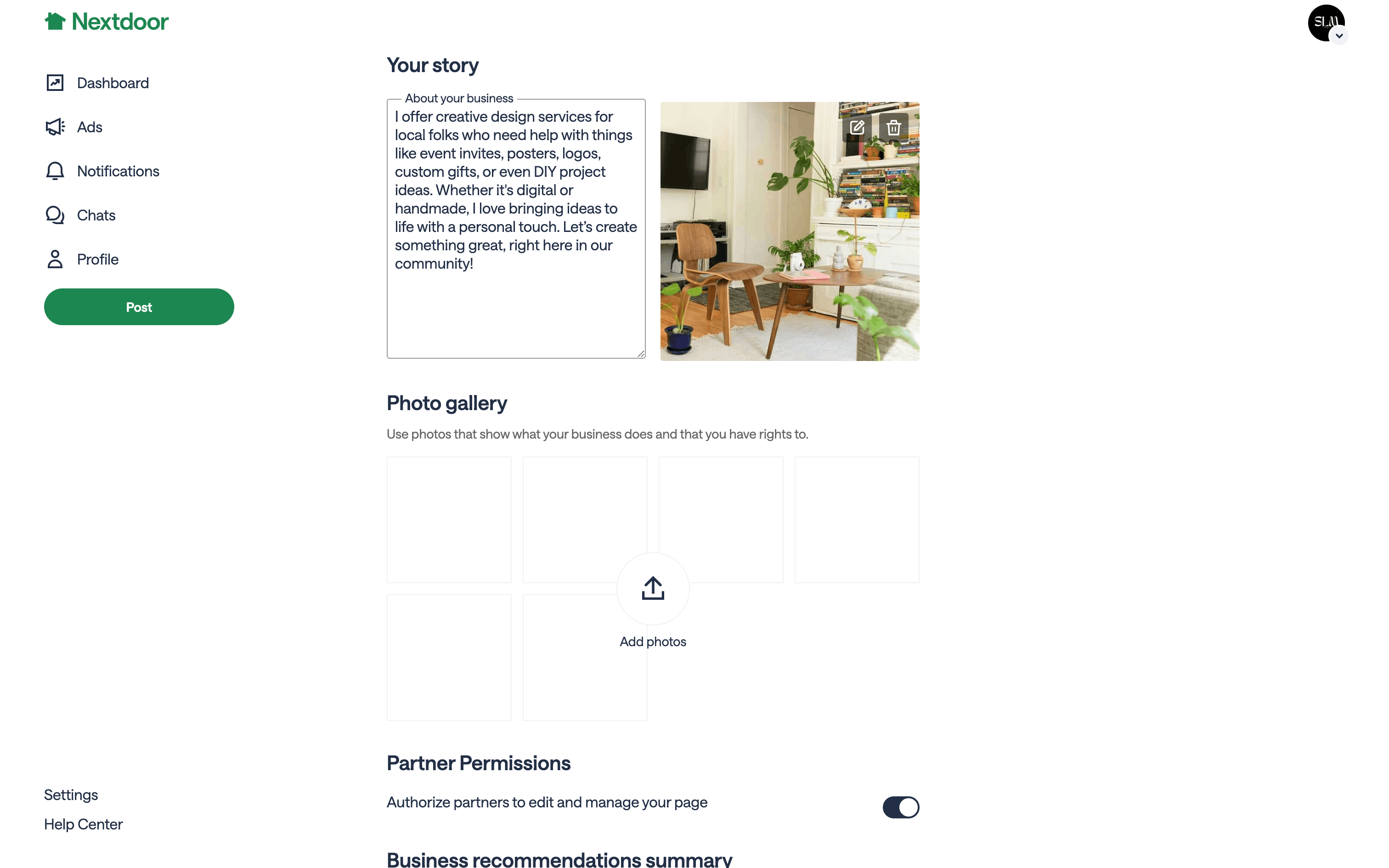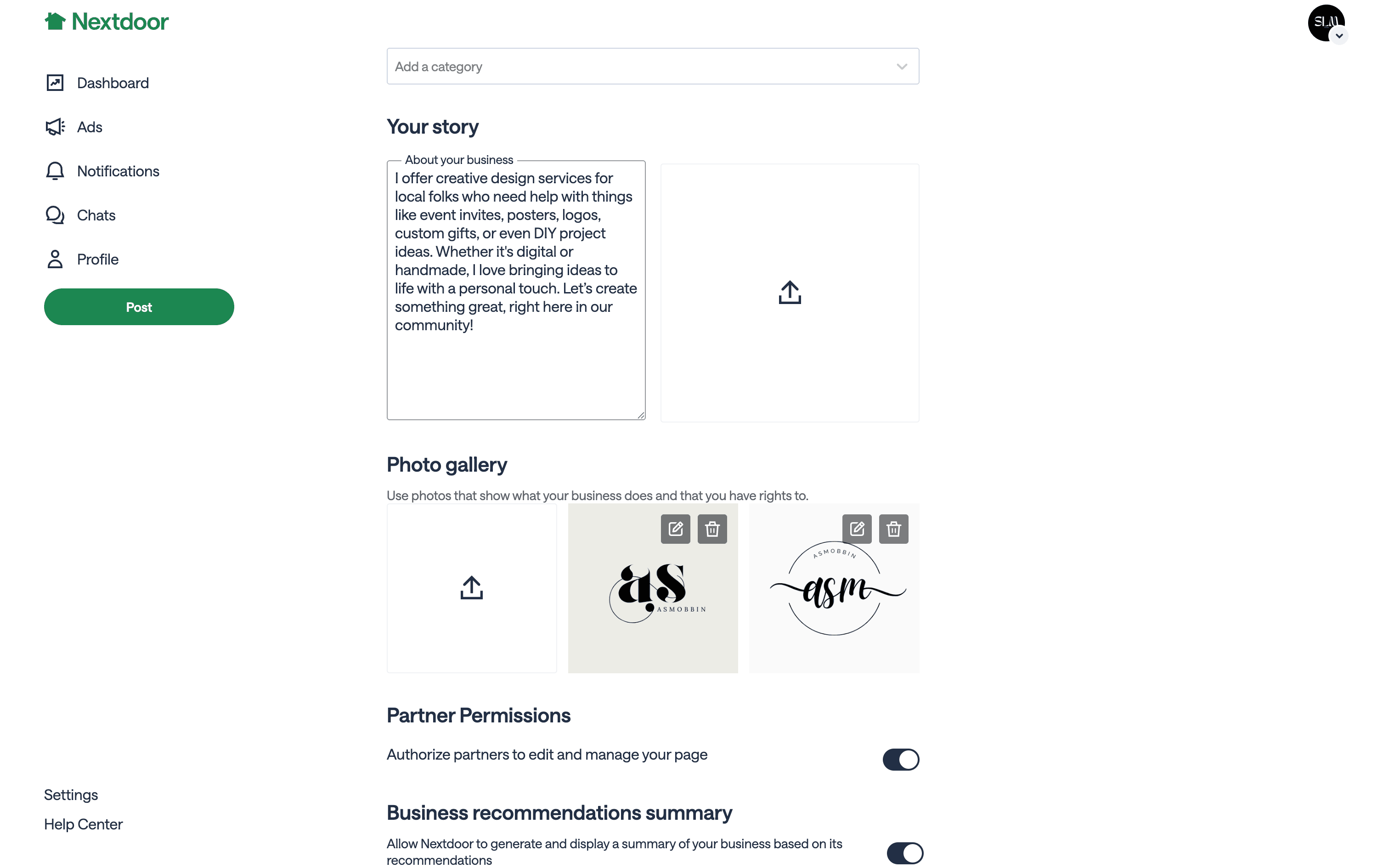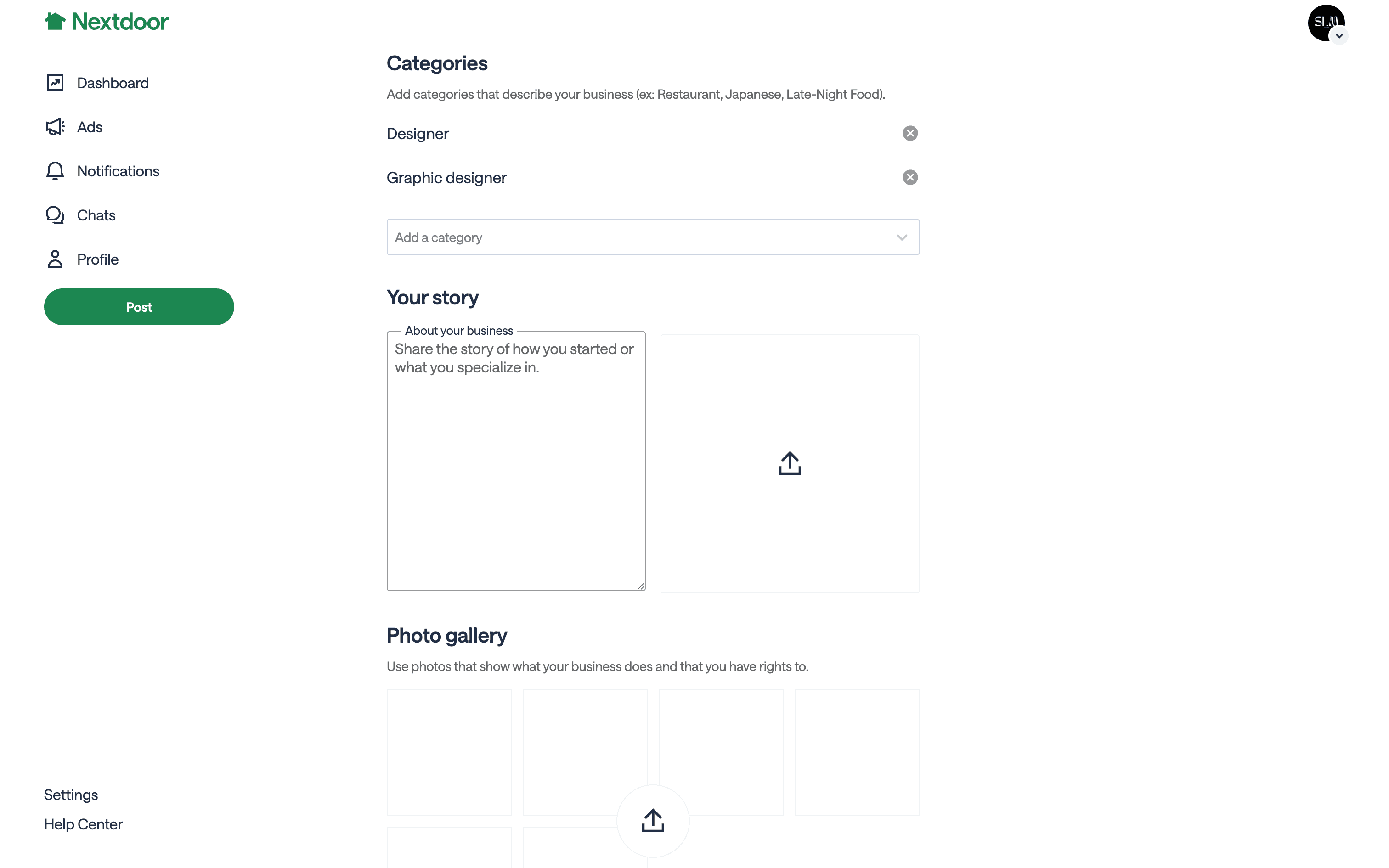 The user sets up a business profile by uploading media and filling out business details. This includes adding a logo, cover photo, business information, story and gallery.