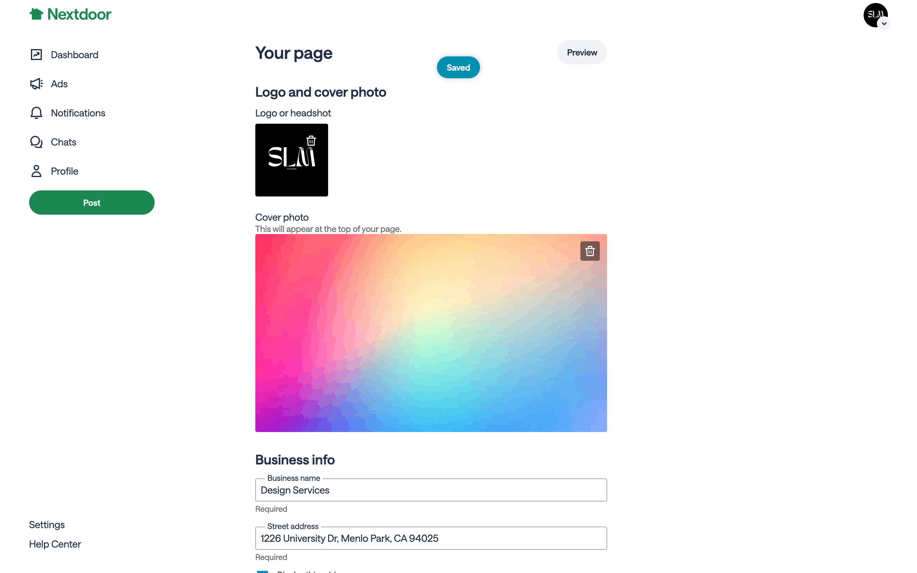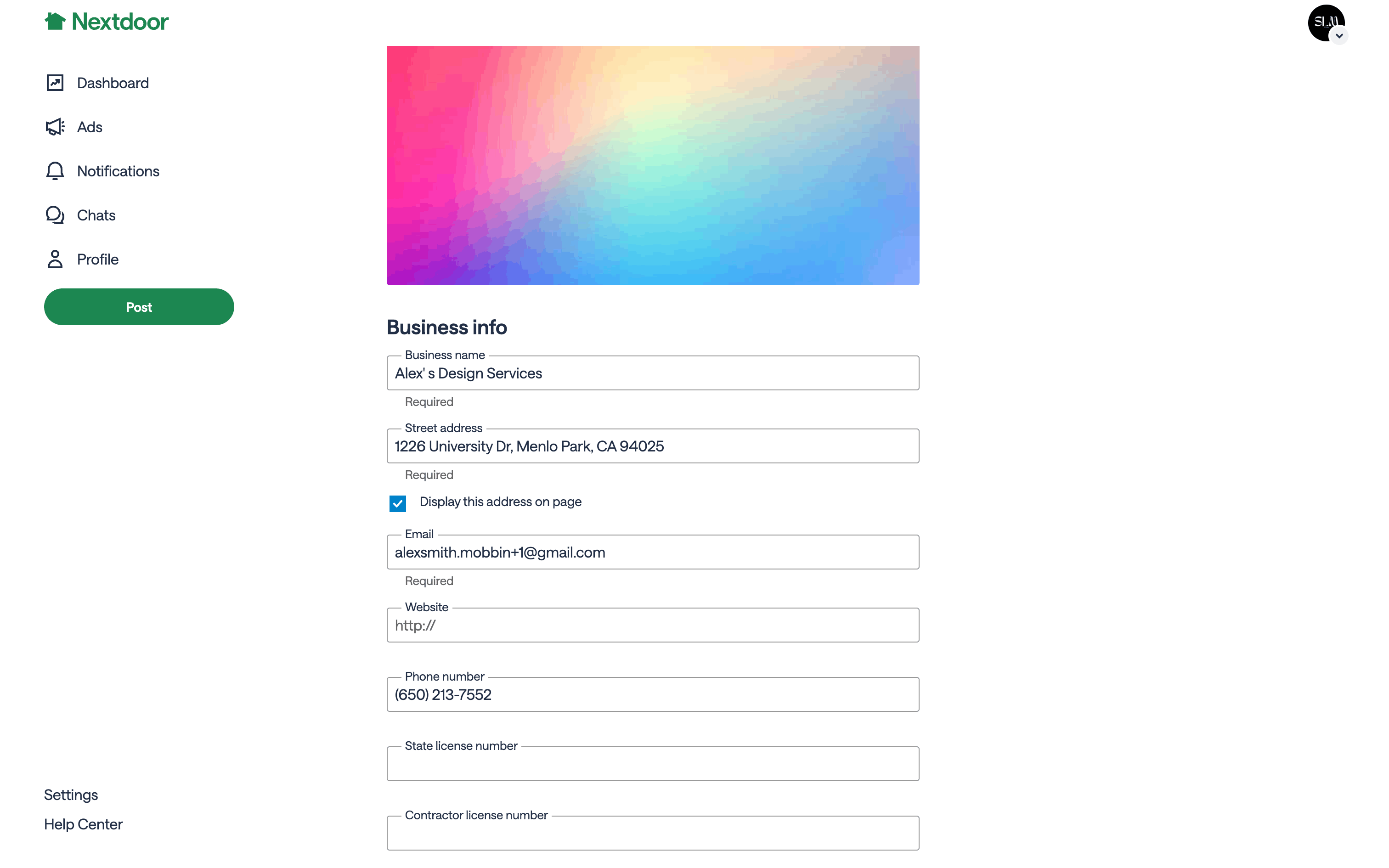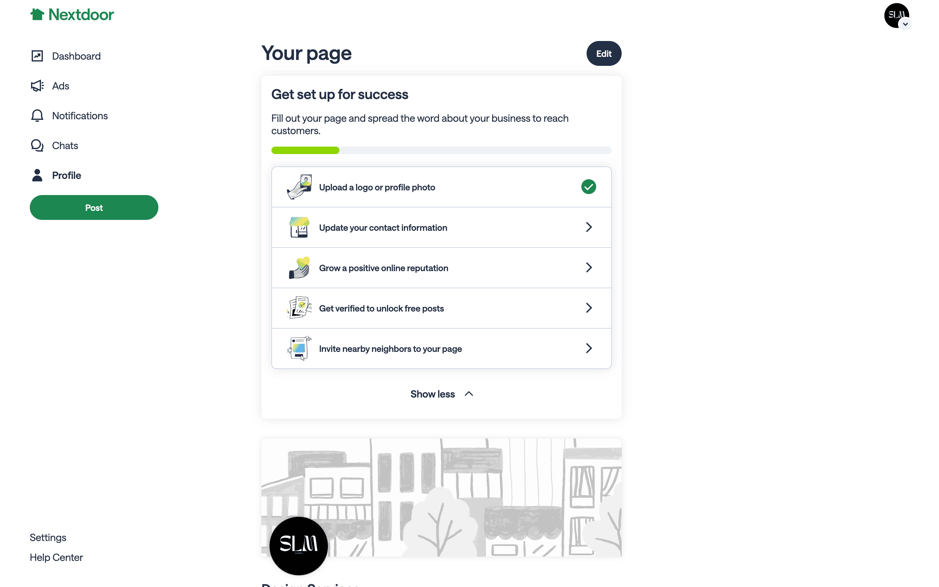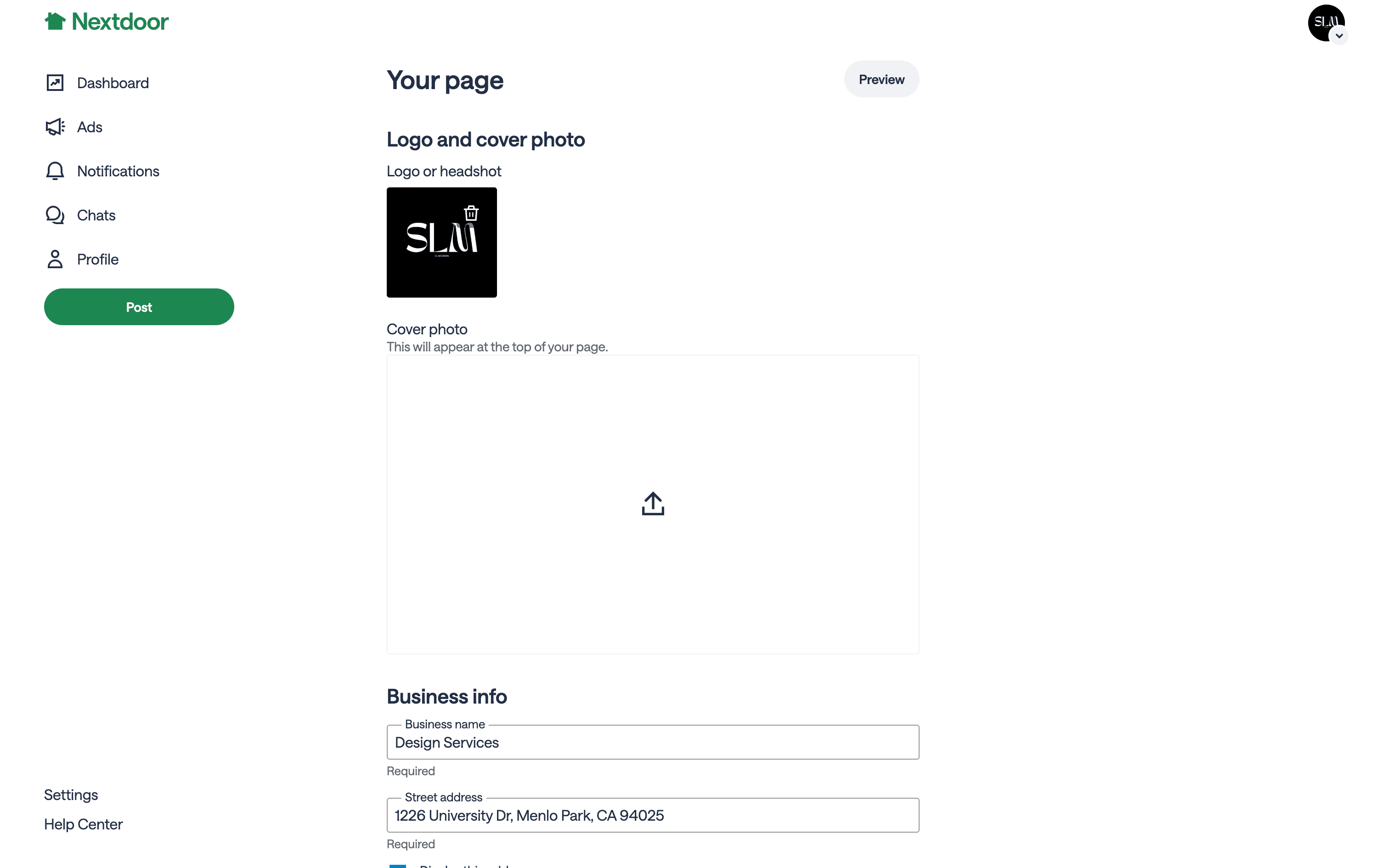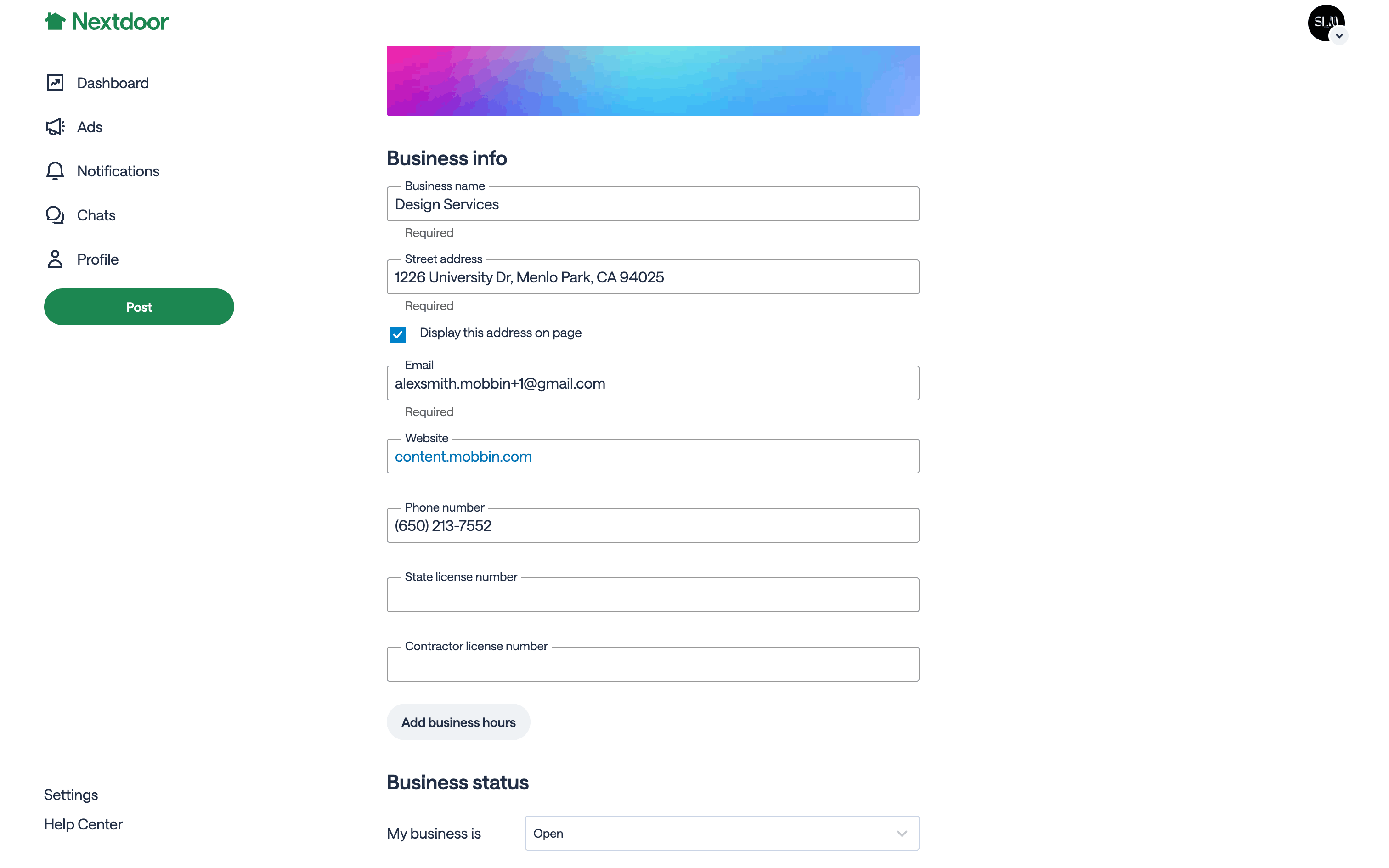 The user sets up a business profile by uploading media and filling out business details. This includes adding a logo, cover photo, business information, story and gallery.