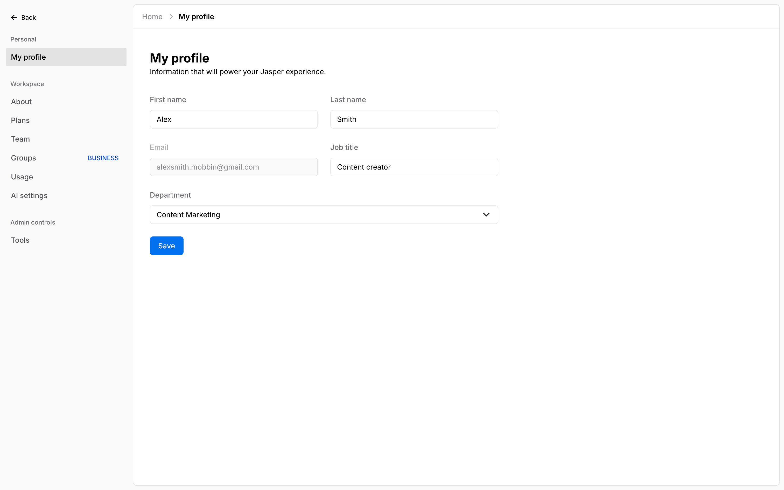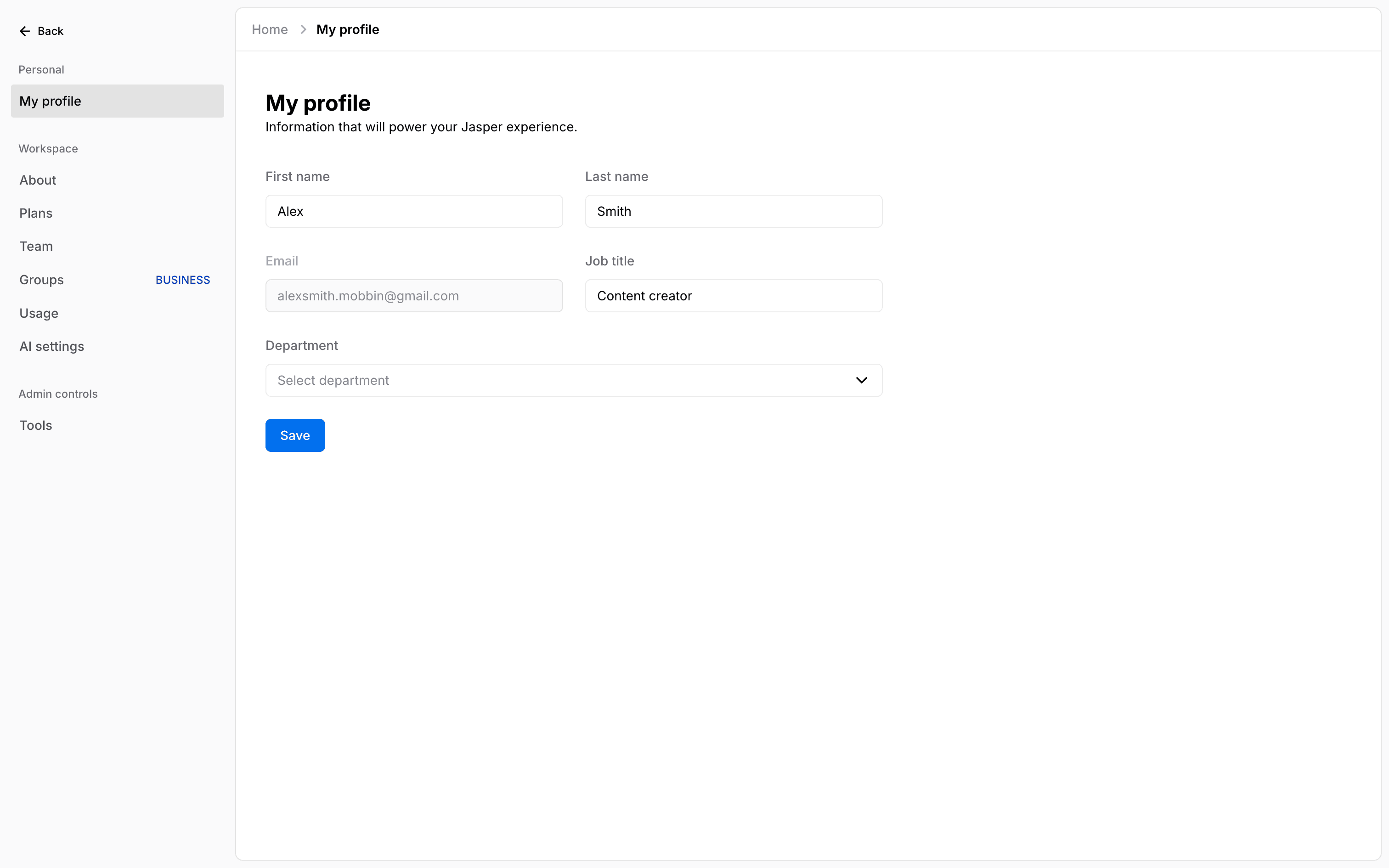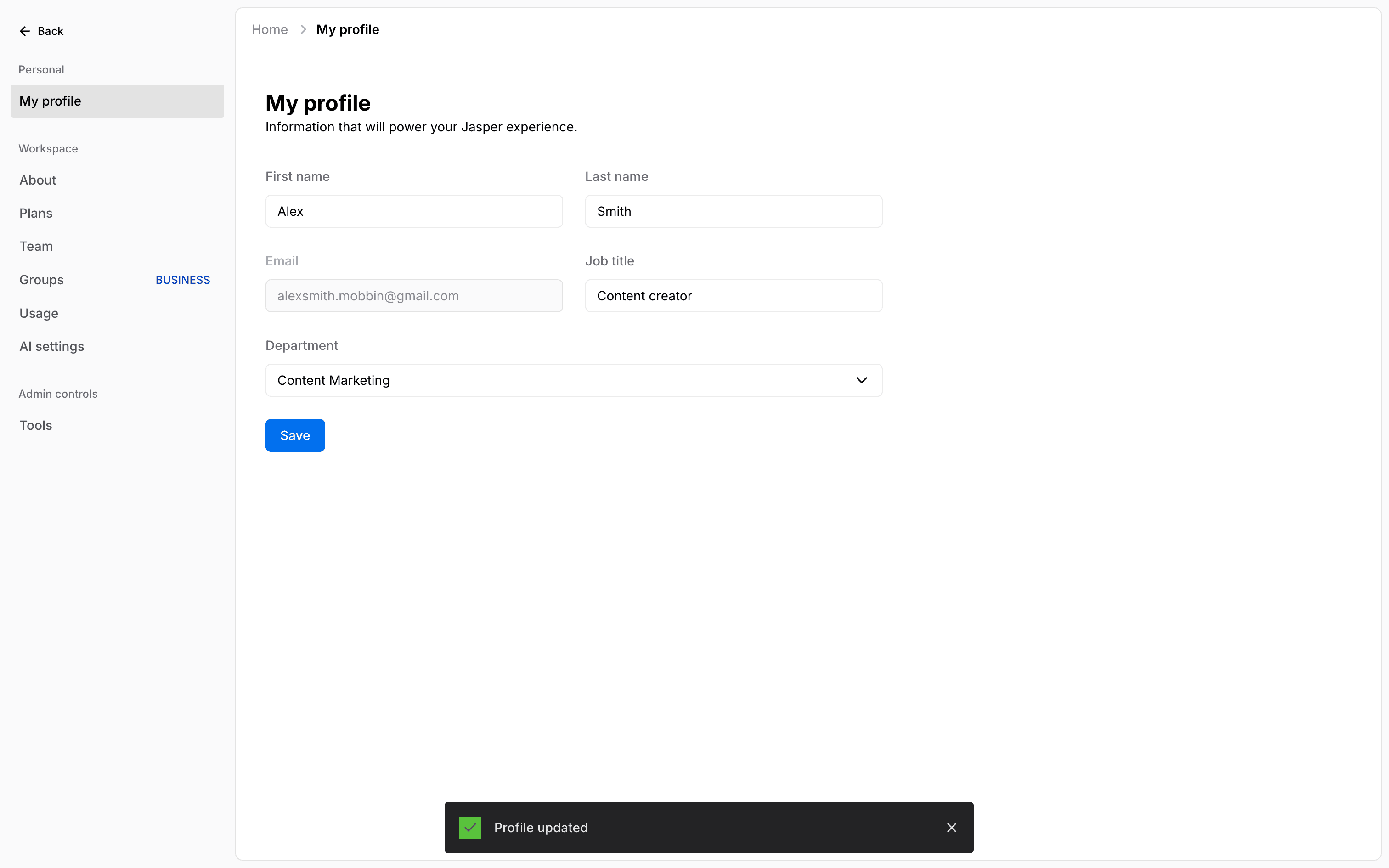 The user updates their profile information, specifically their job title and department. A confirmation message appears upon saving.