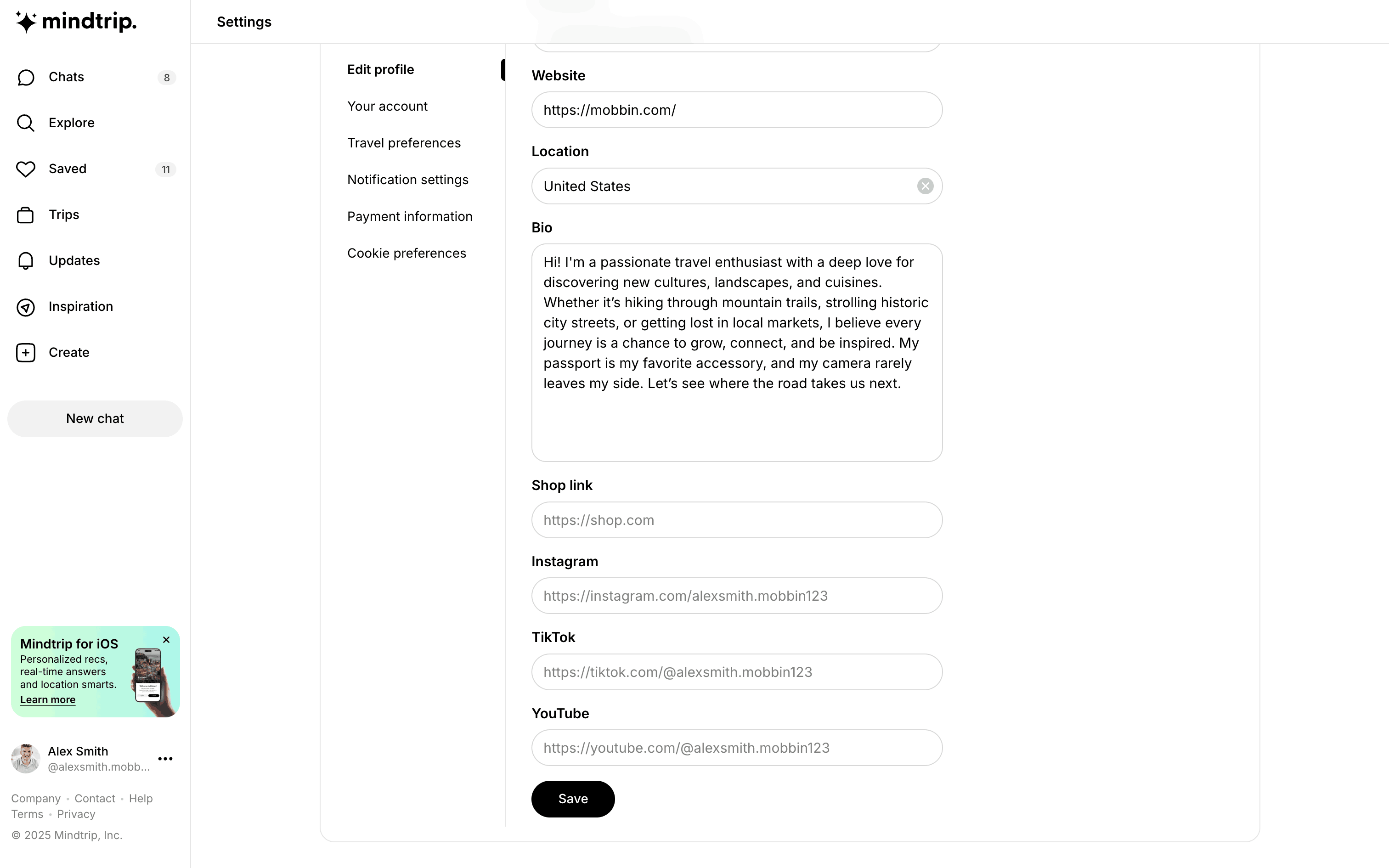 The user edits their profile information, including personal details and social media links. After saving, a confirmation message appears.