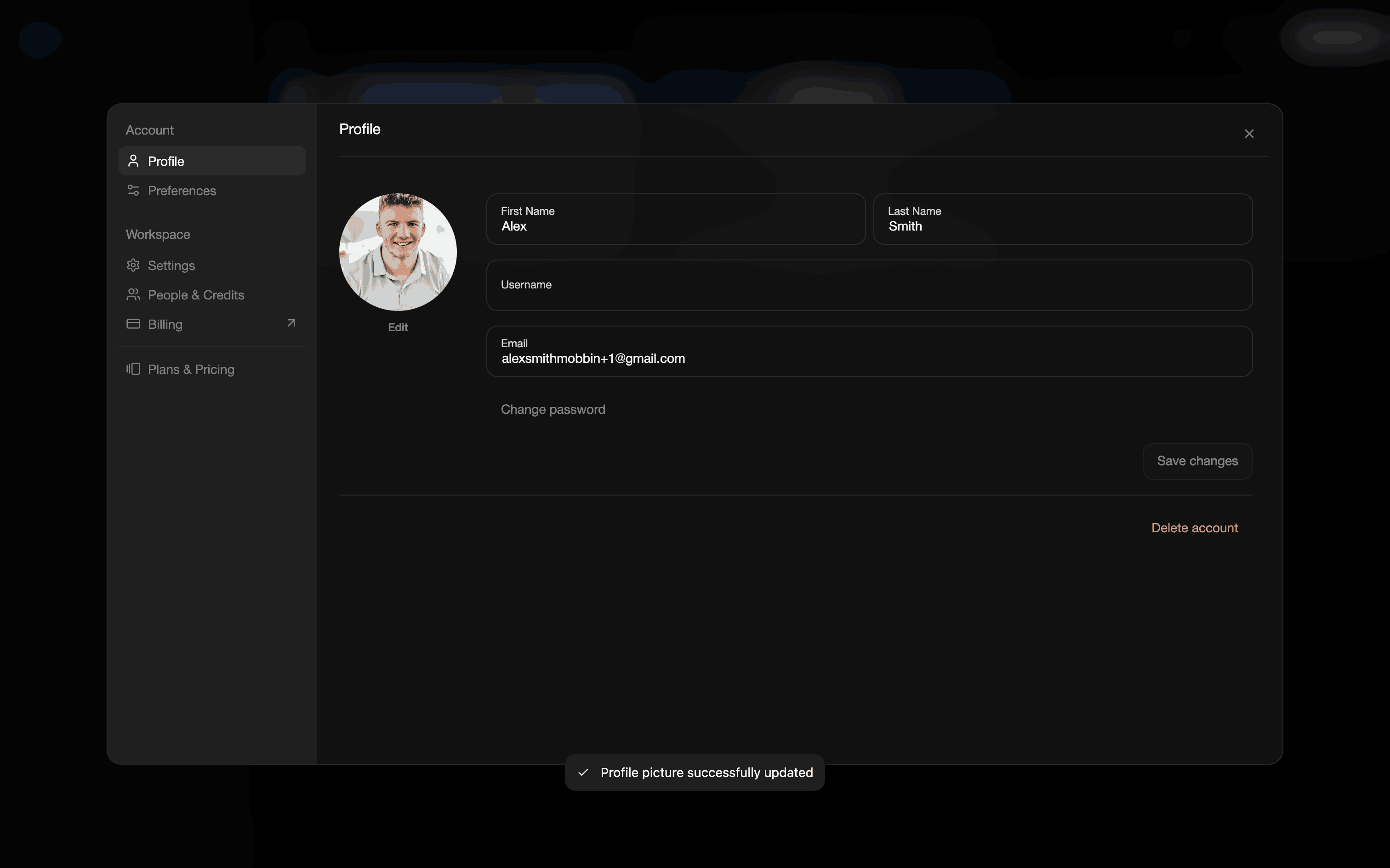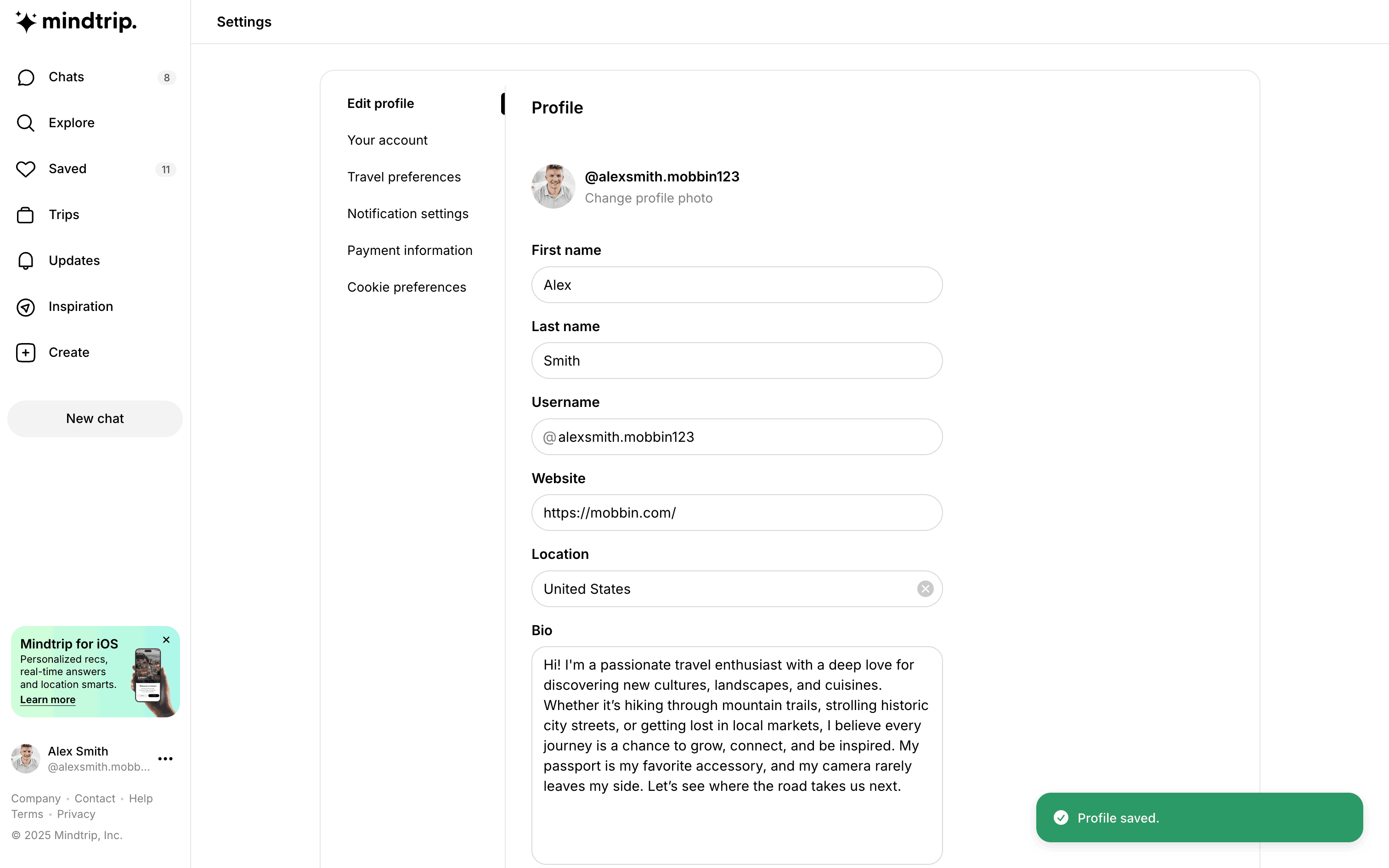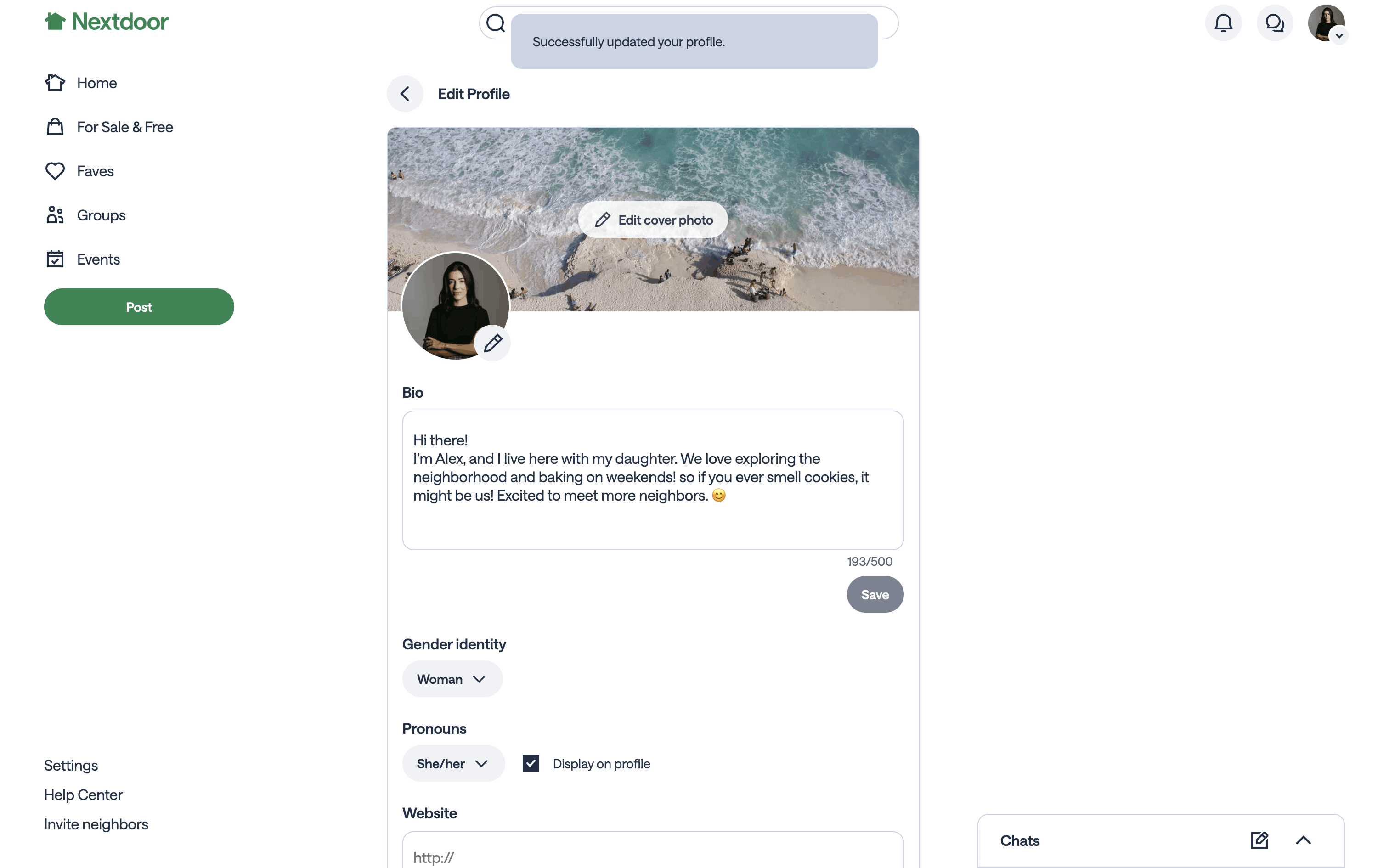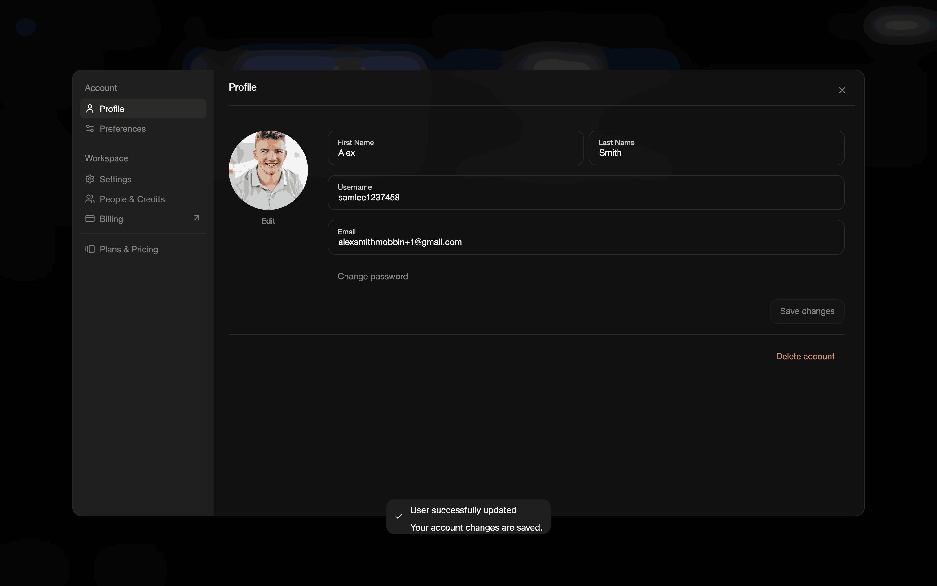 The user edits their profile by updating their profile picture and username. The changes are then saved, and a confirmation message is displayed.