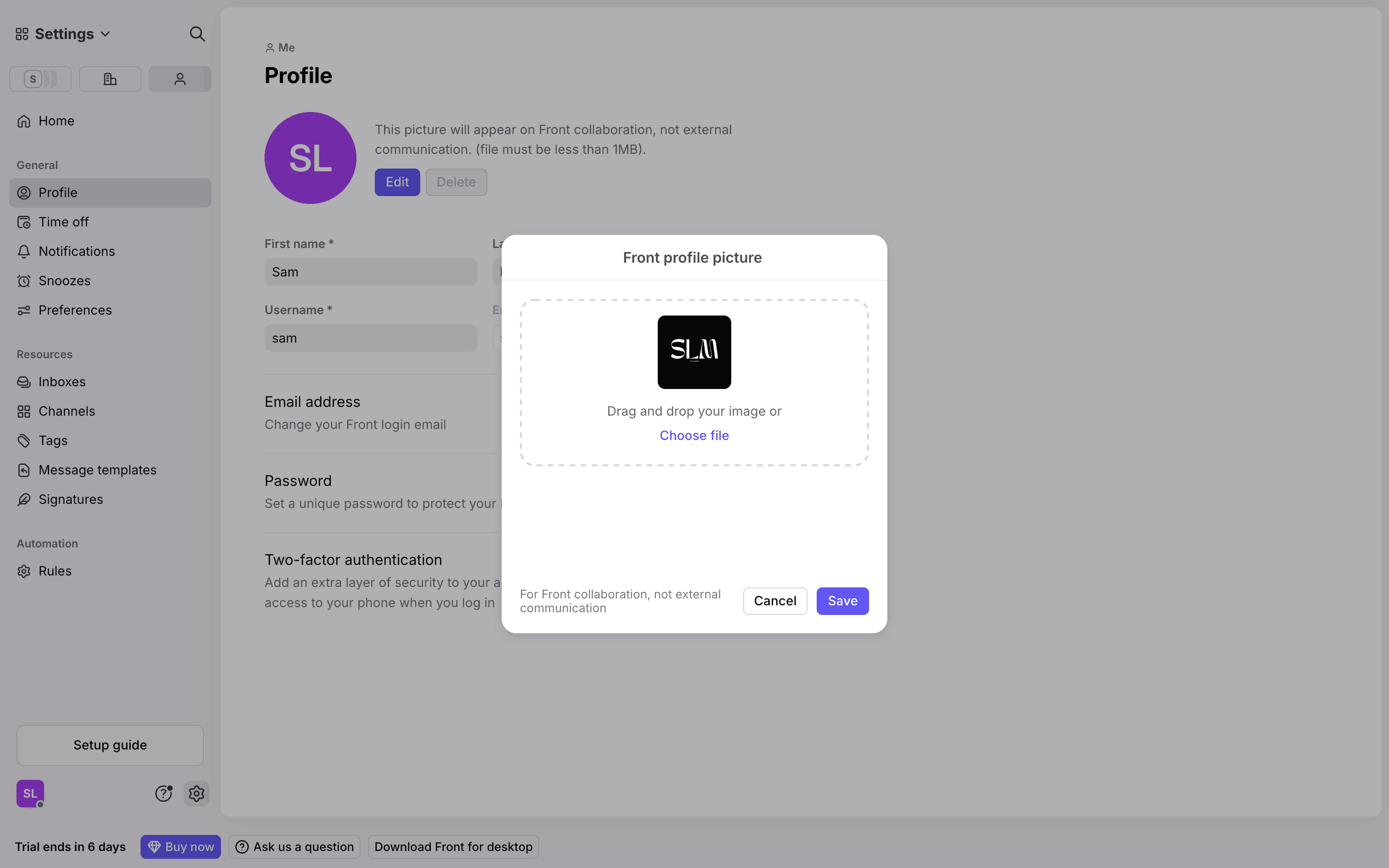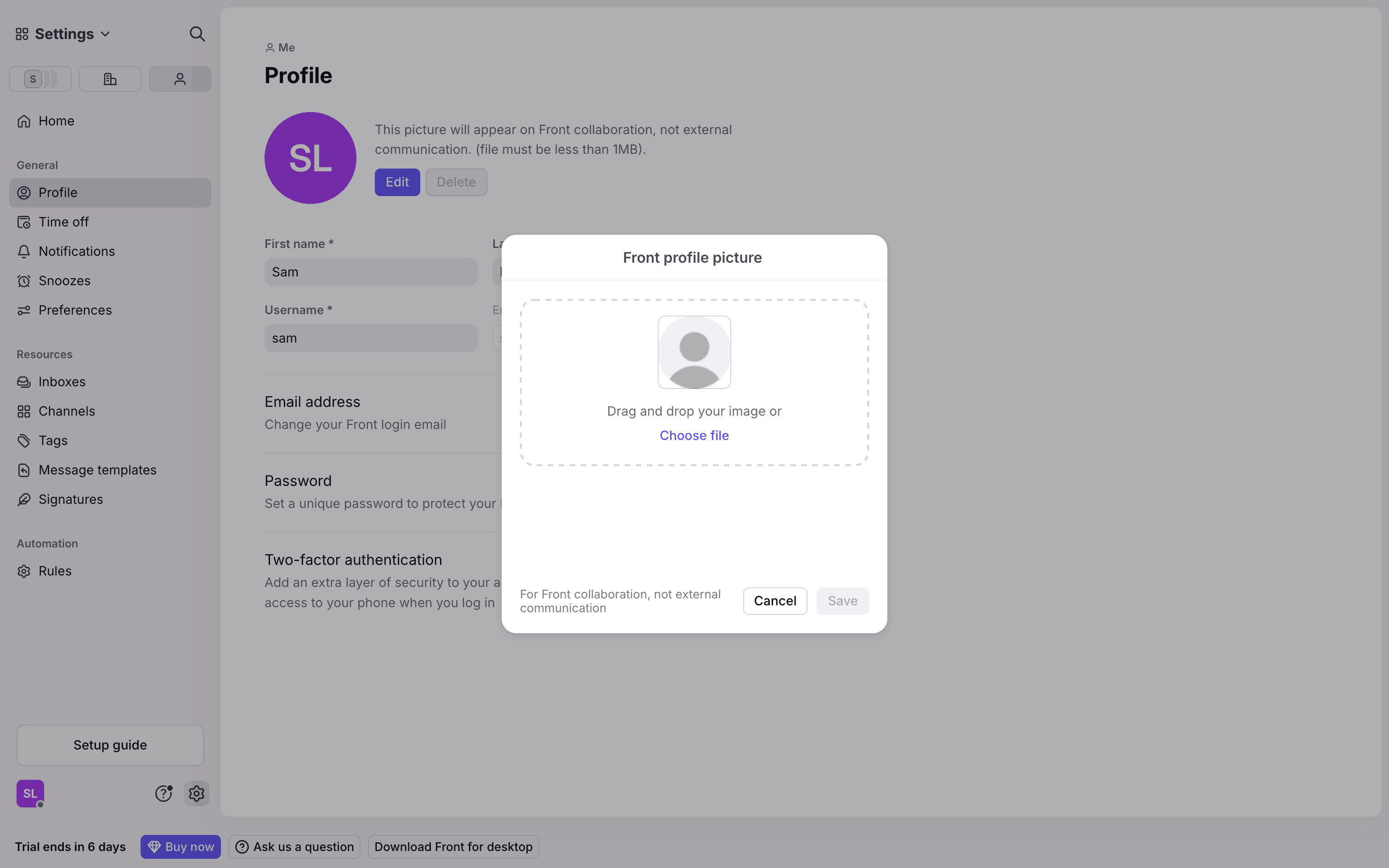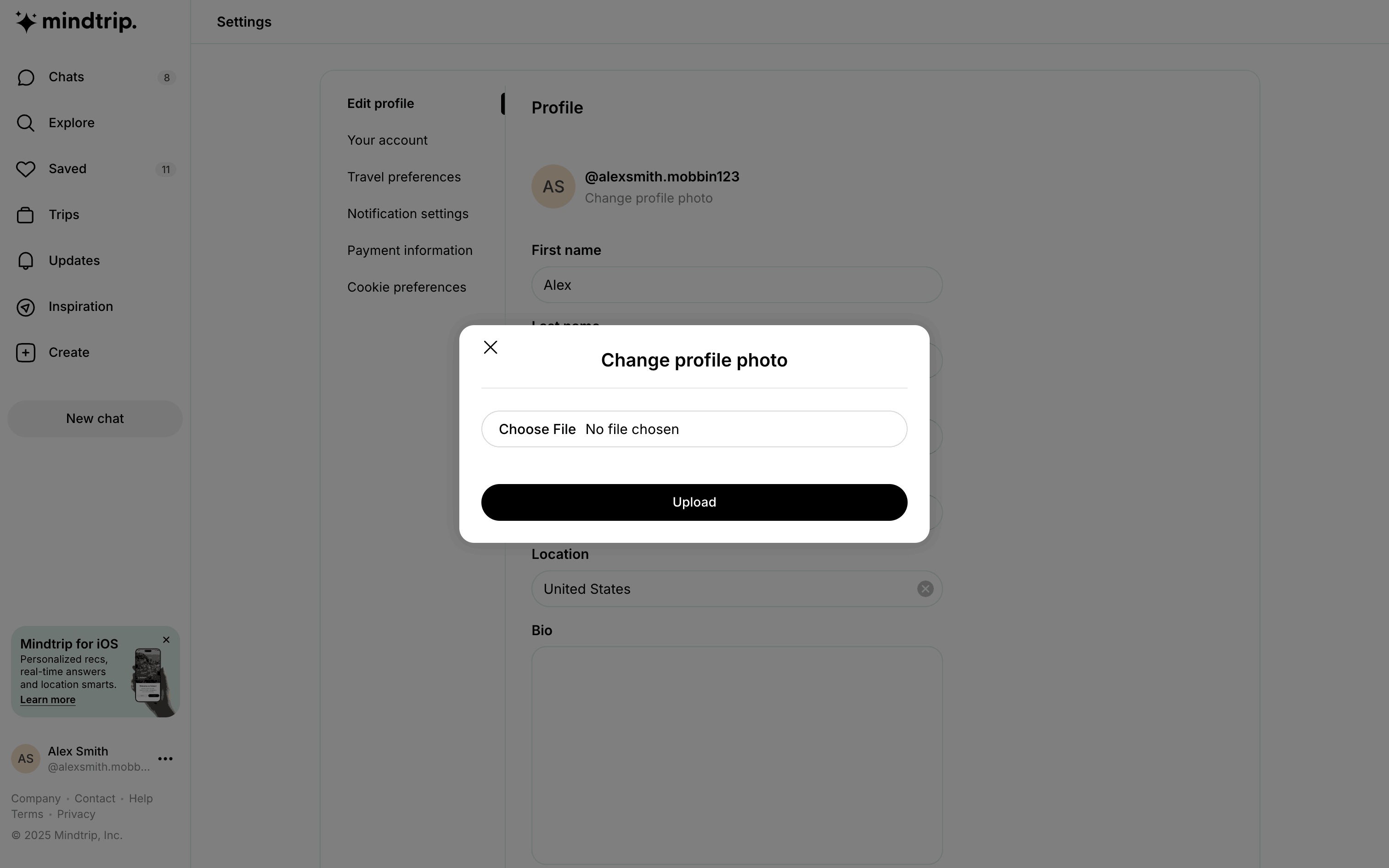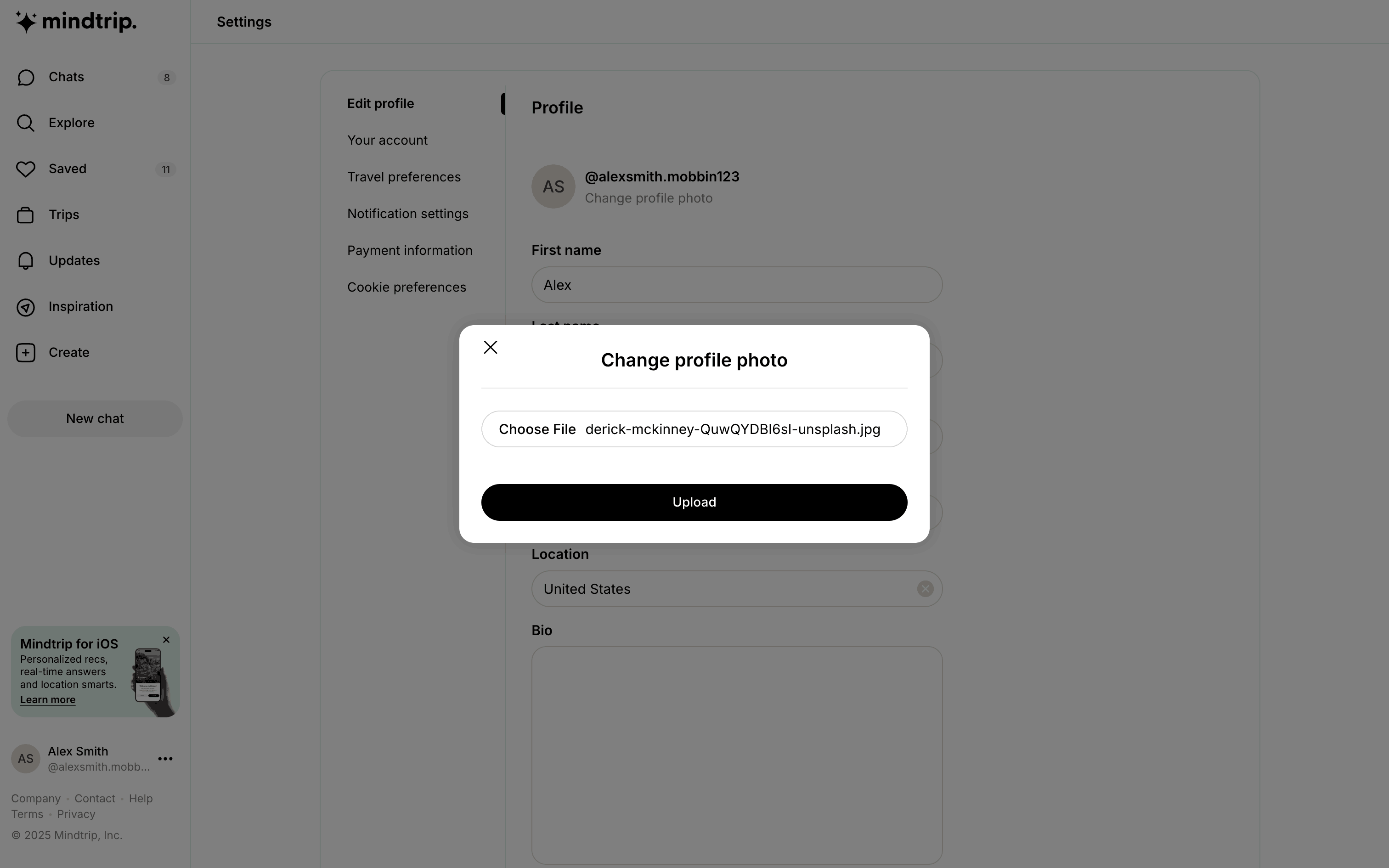 The user updates their profile picture by uploading a new image via a modal. The profile page then reflects the change.
