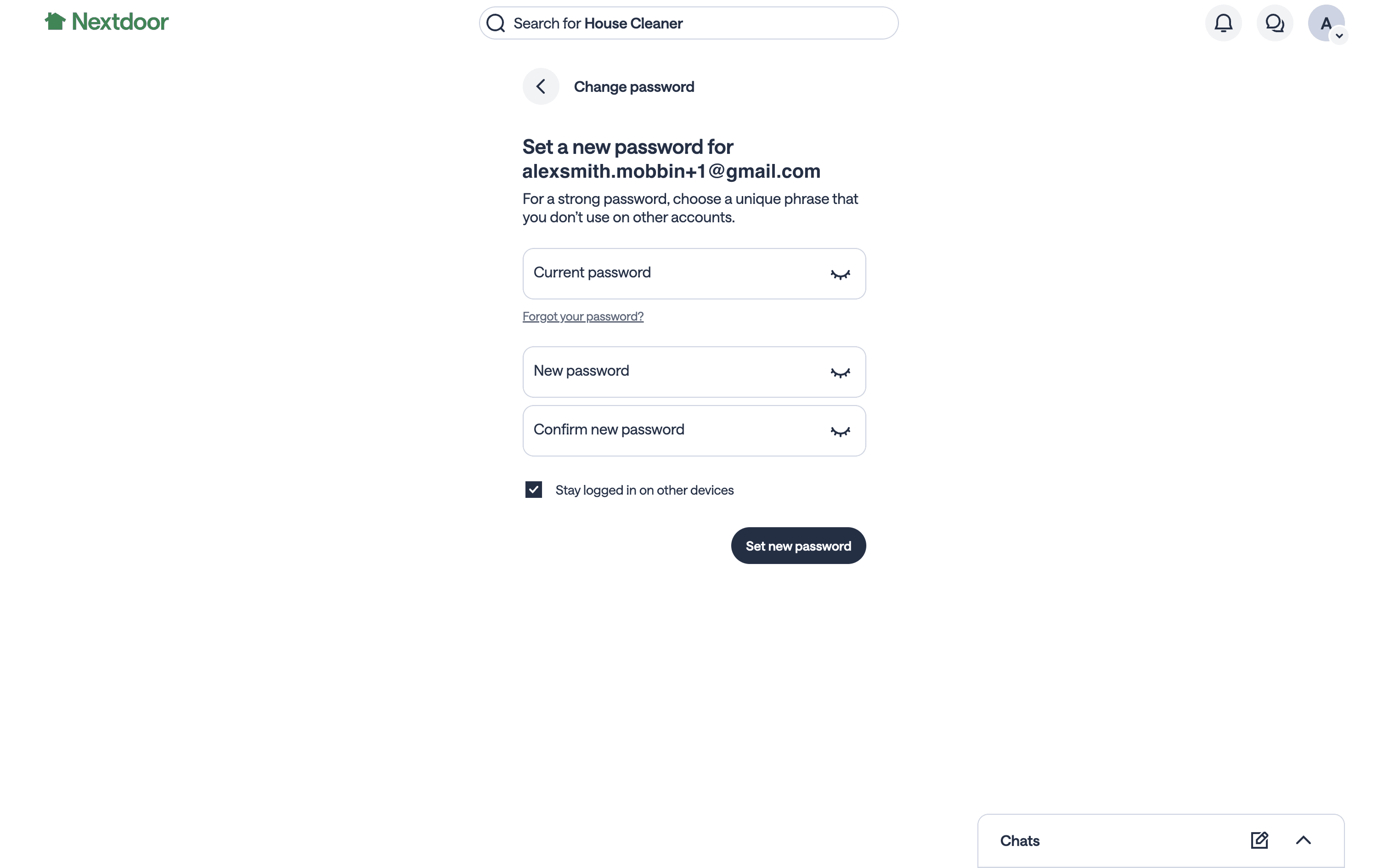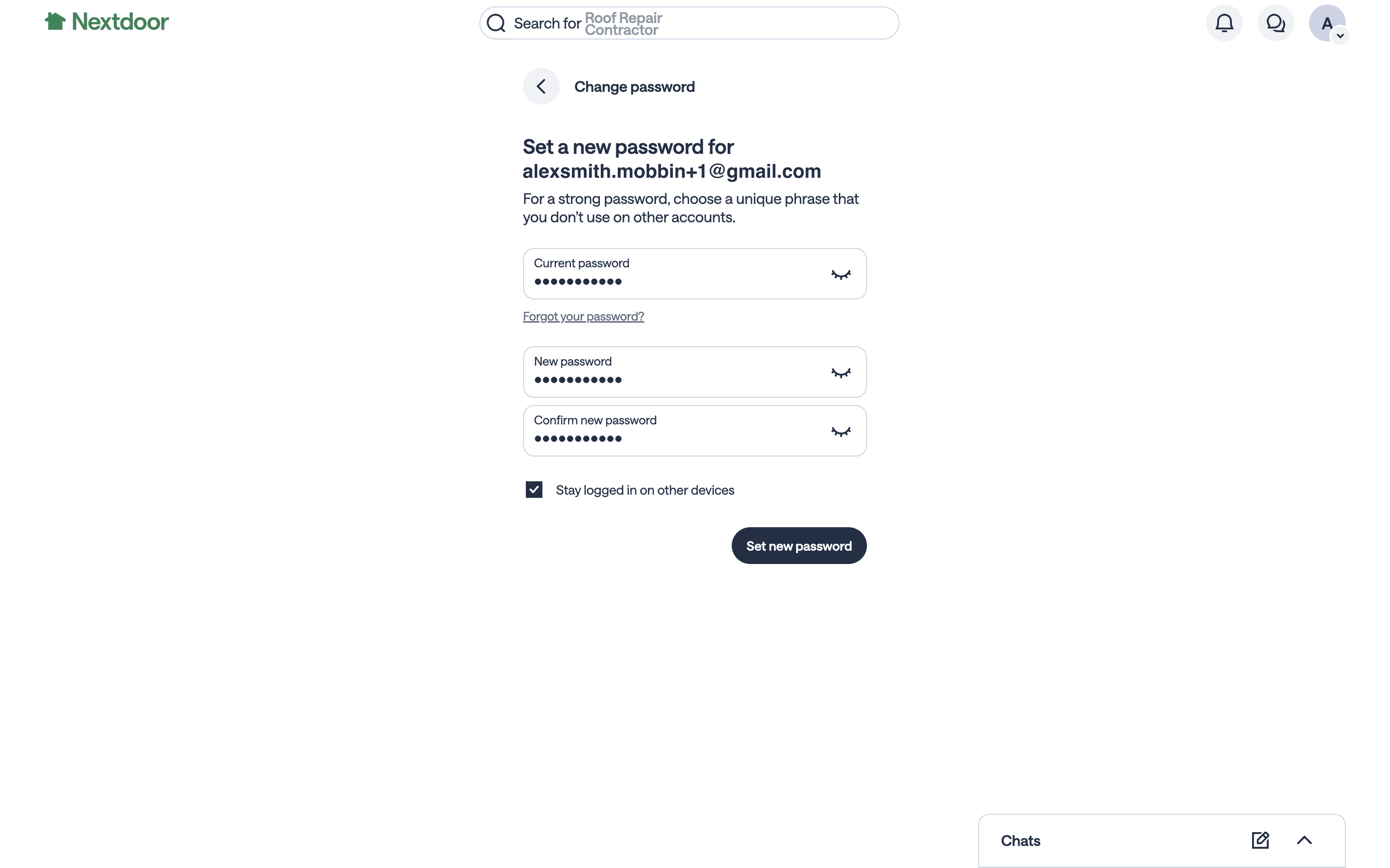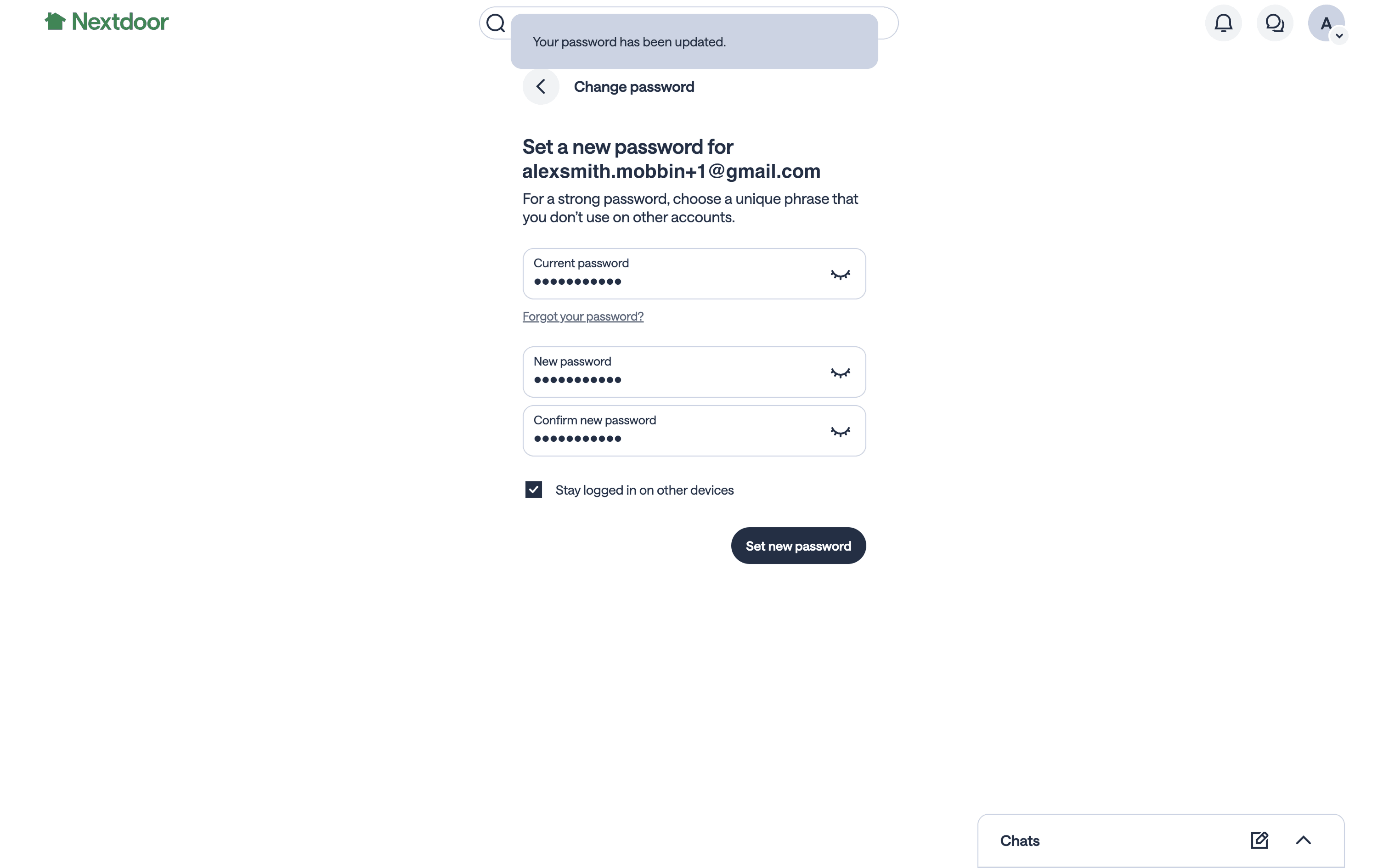 The user navigates to account settings, enters and submits a new password. A confirmation message confirms the successful password update.