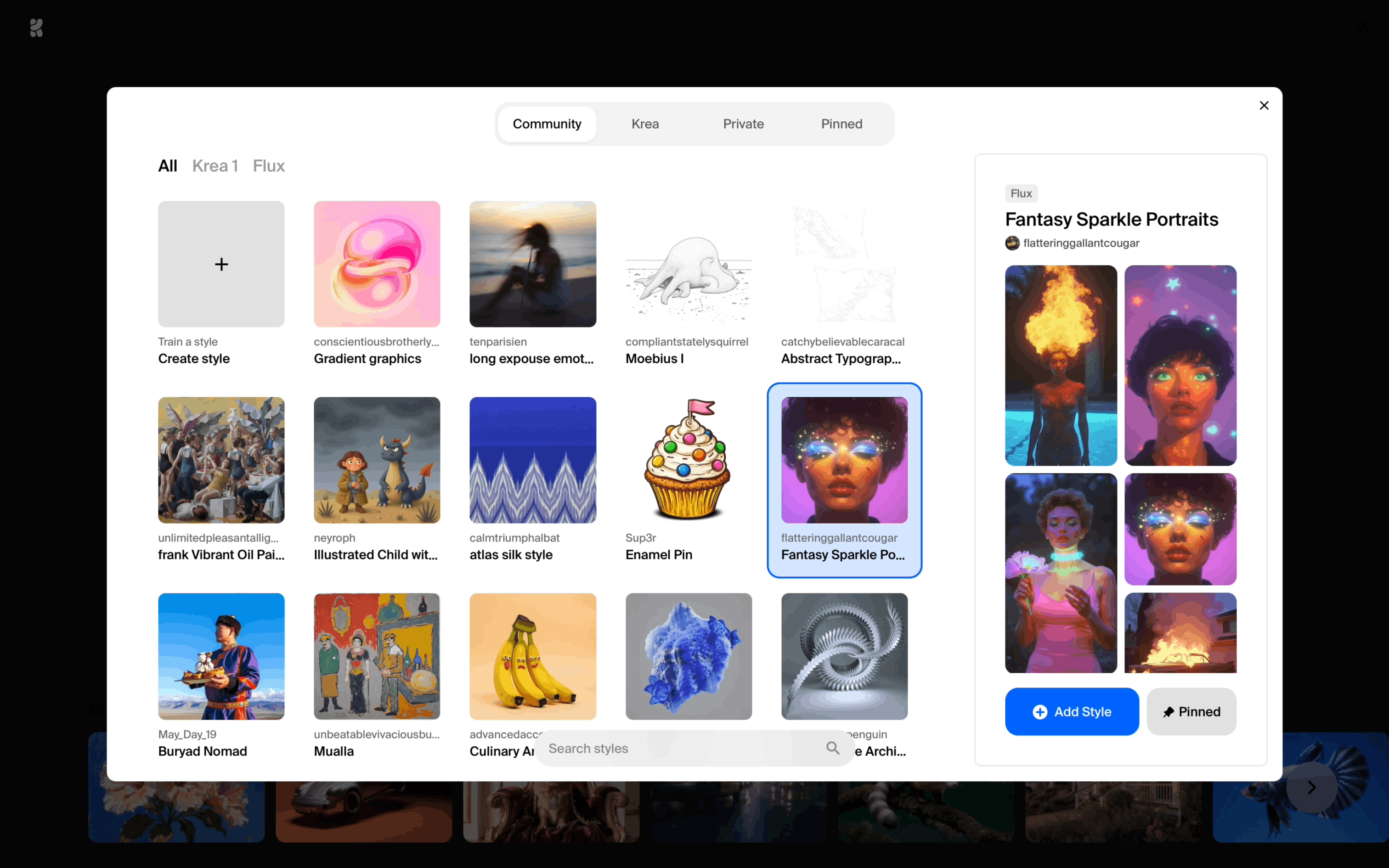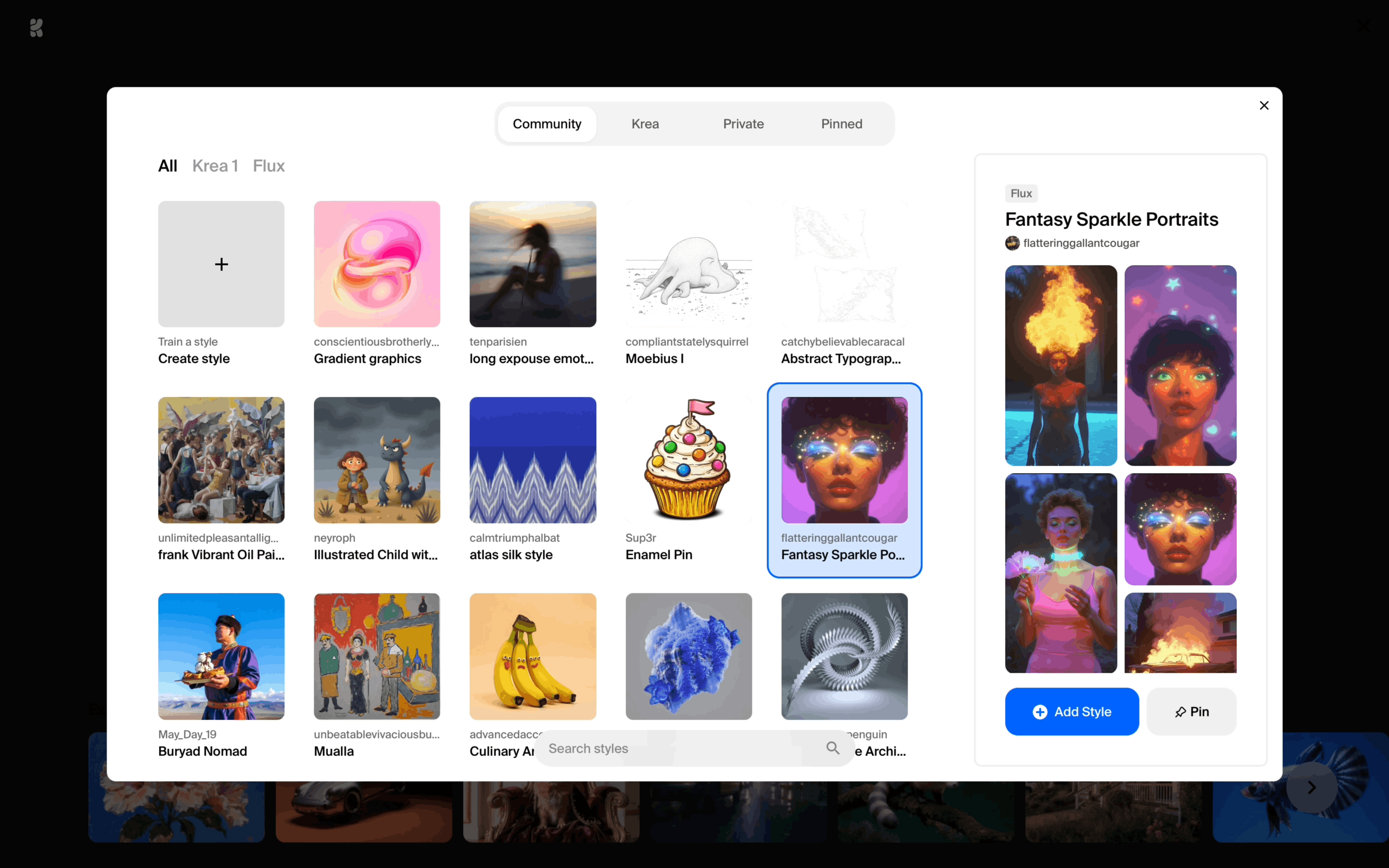 The user selects a style from a modal and pins it. The 'Pin' button changes to 'Pinned' to confirm the action.