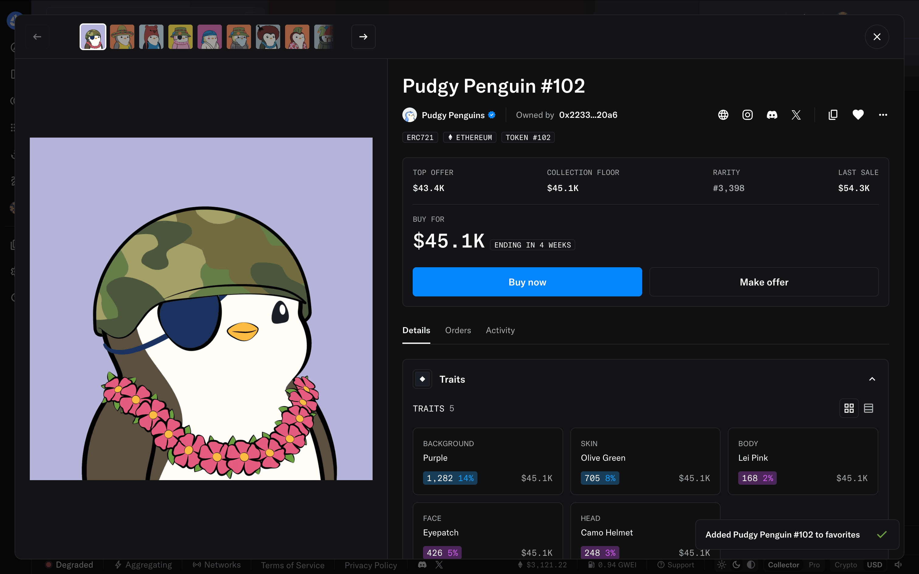 The user views an NFT's details, then favorites it. A confirmation message appears to confirm the action.