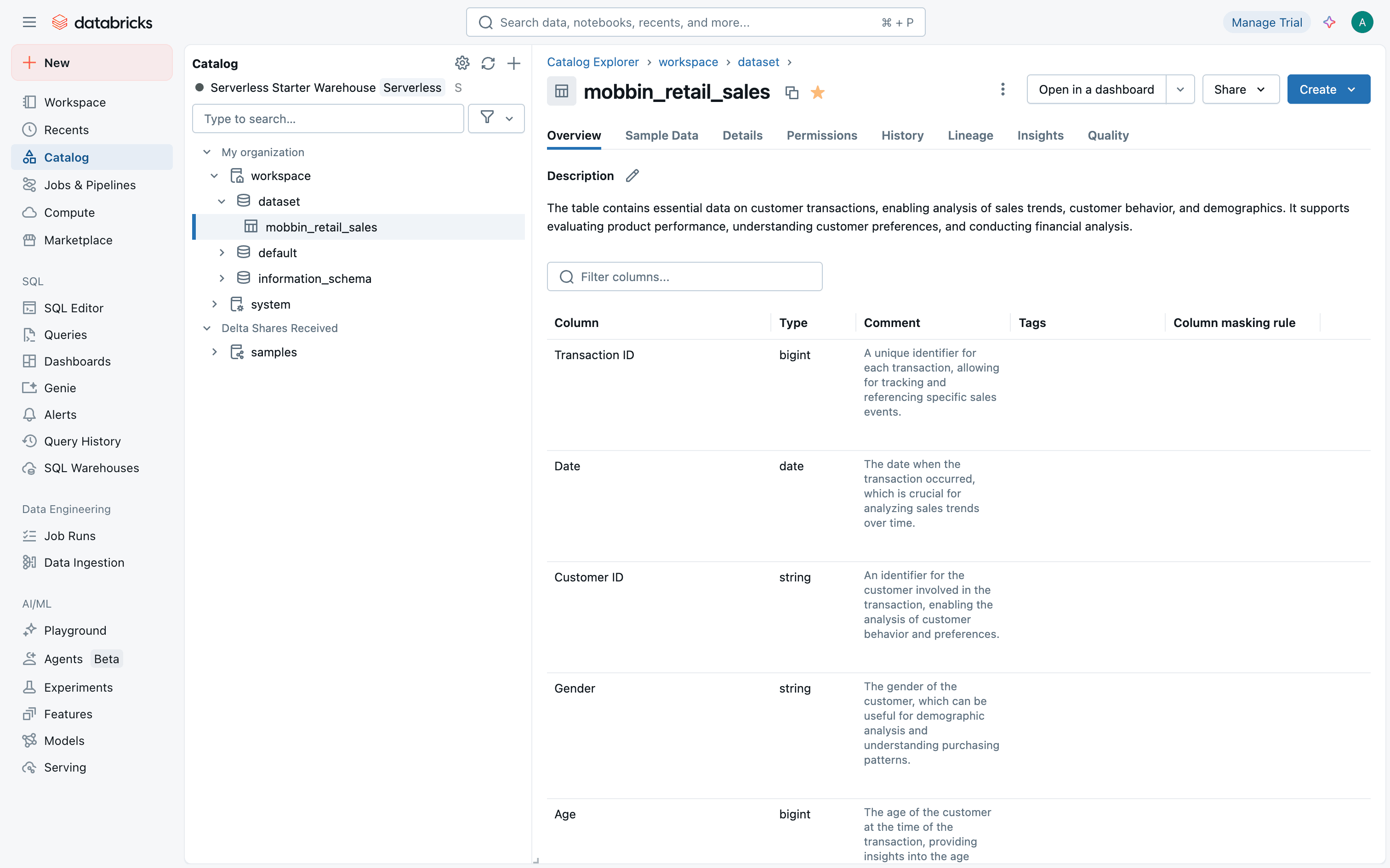 The user navigates to a data table and views its overview, then views the comments for each column. This allows the user to understand the table's structure and content.
