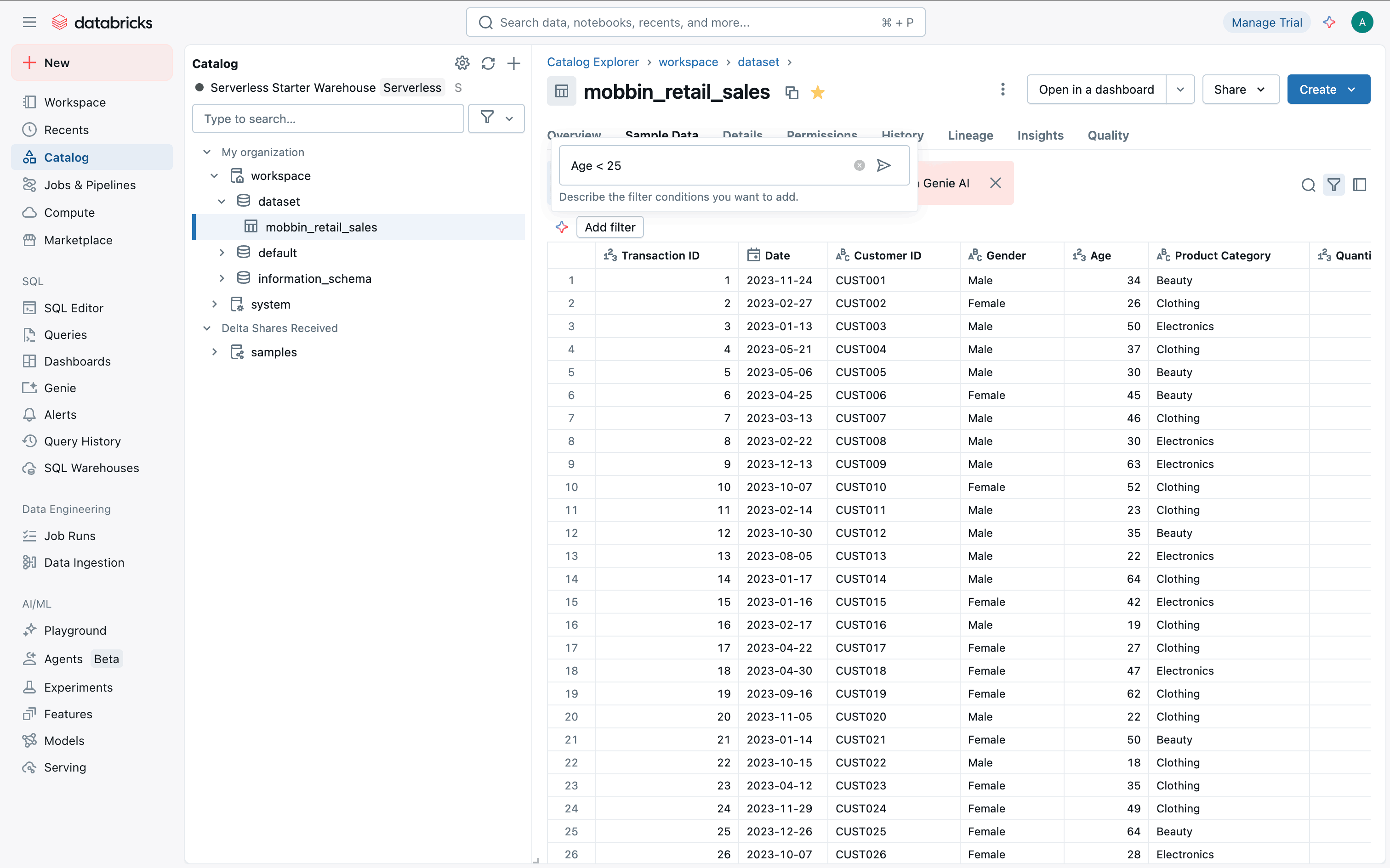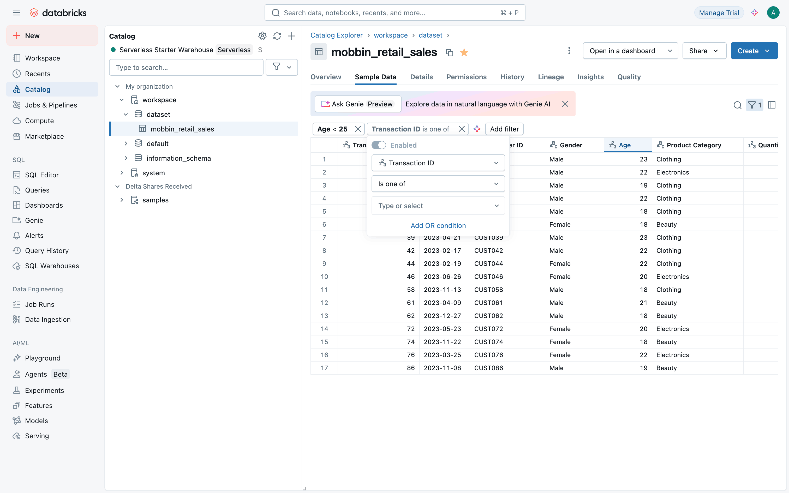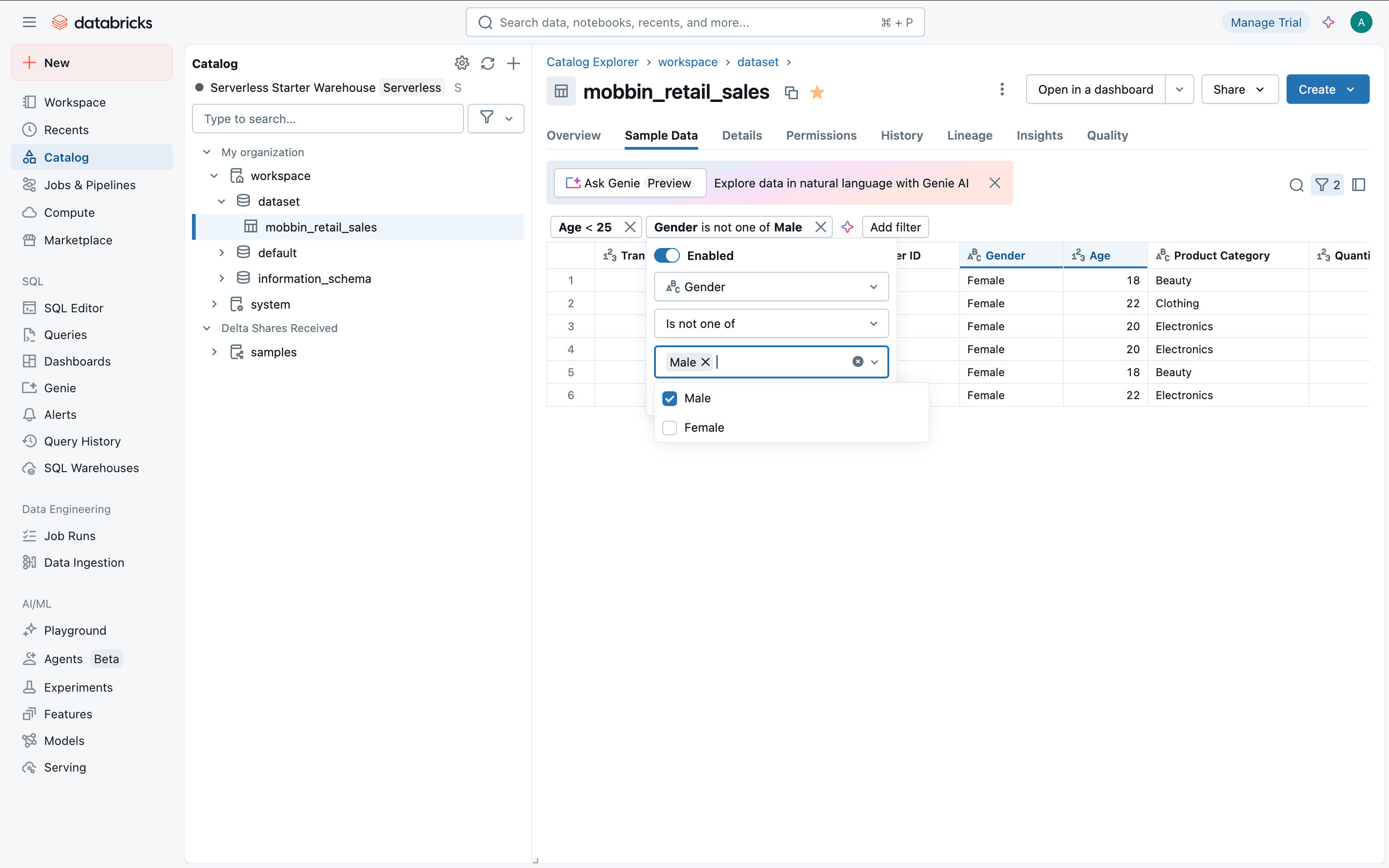 The user filters sample retail sales data by adding conditions for age and gender. The final table displays the data that matches both filter conditions.