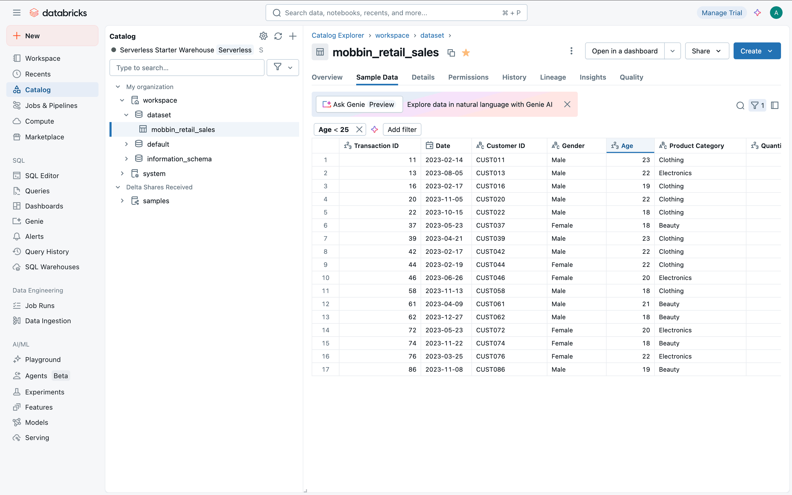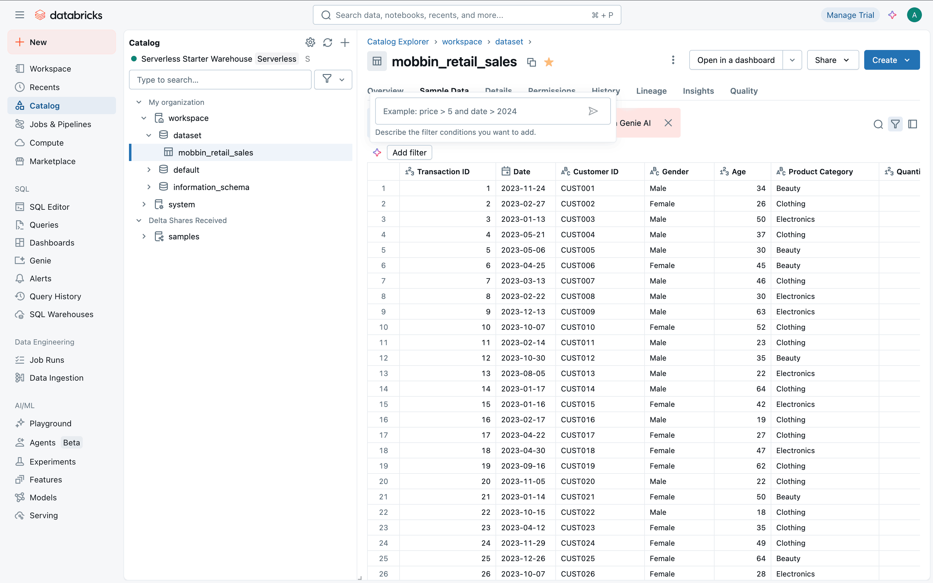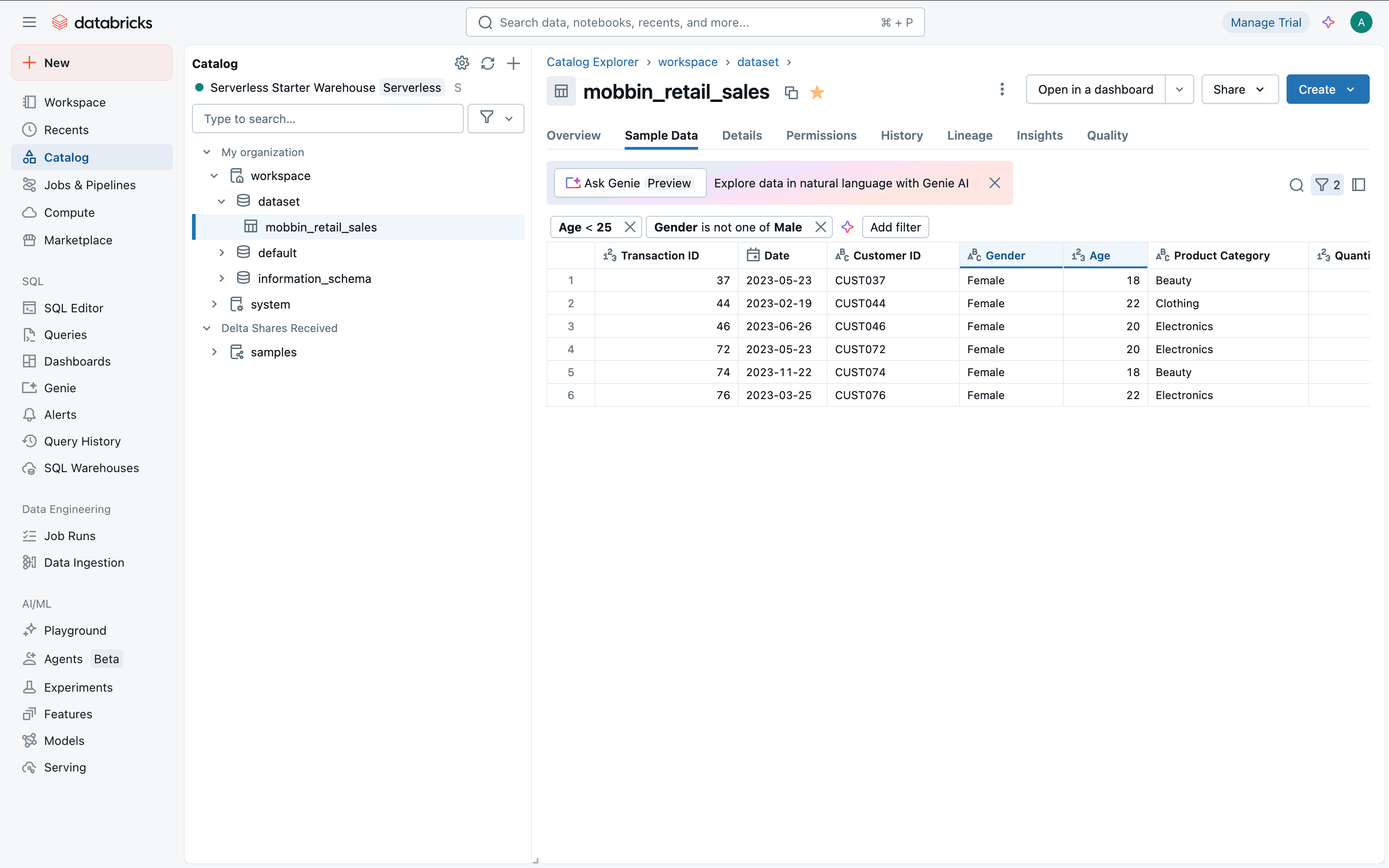 The user filters sample retail sales data by adding conditions for age and gender. The final table displays the data that matches both filter conditions.