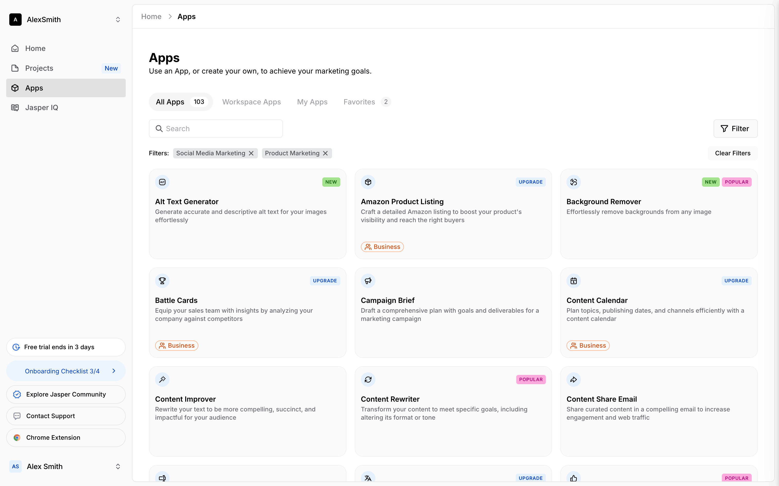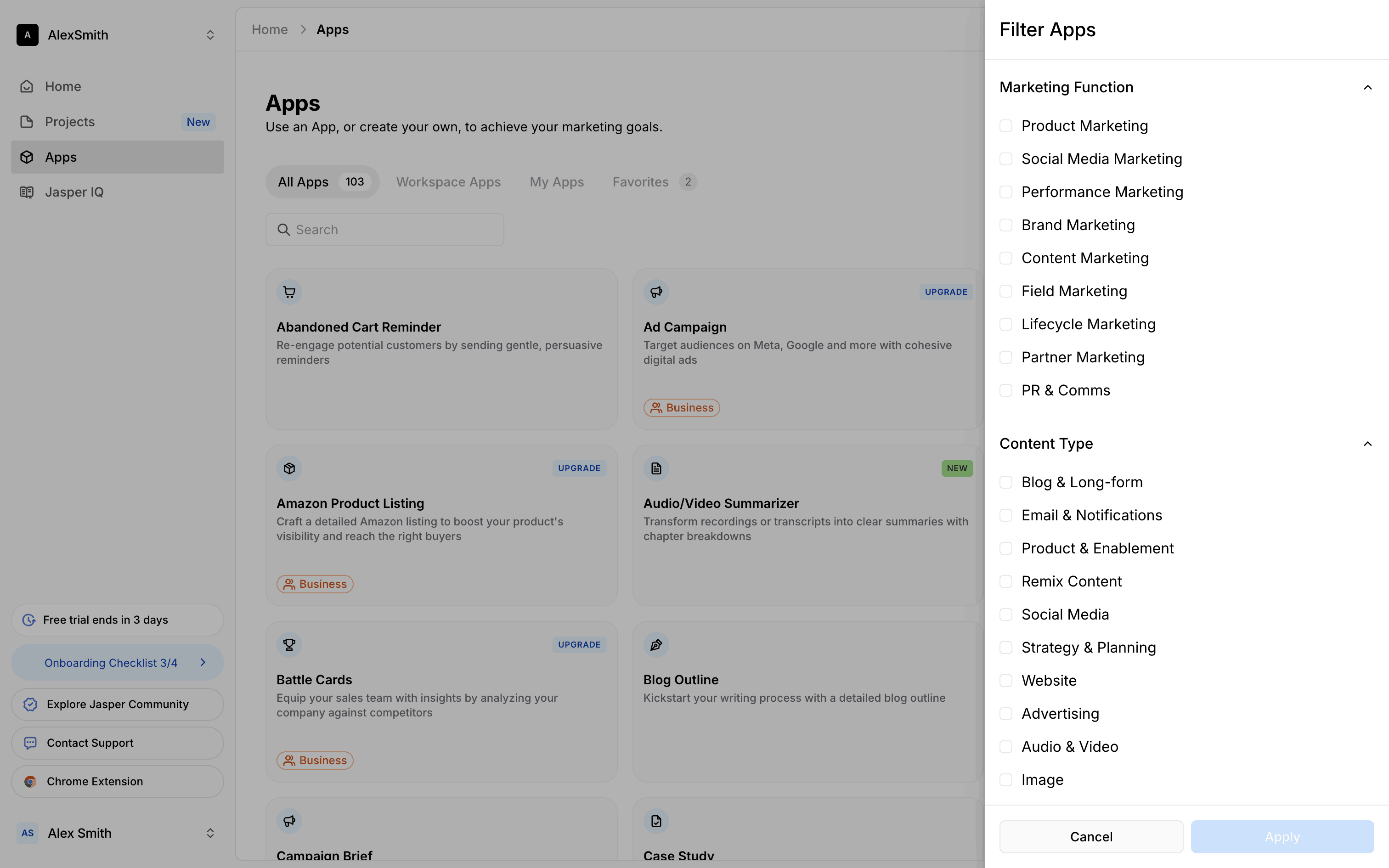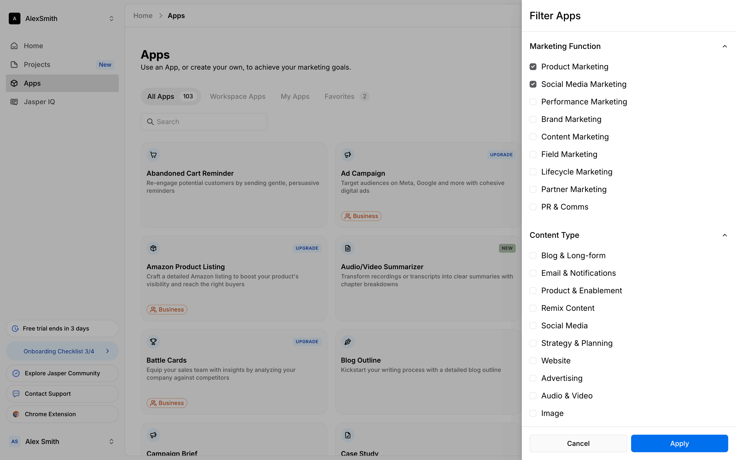 The user filters a list of apps by selecting filter options and applying them. The app directory then displays the filtered apps.